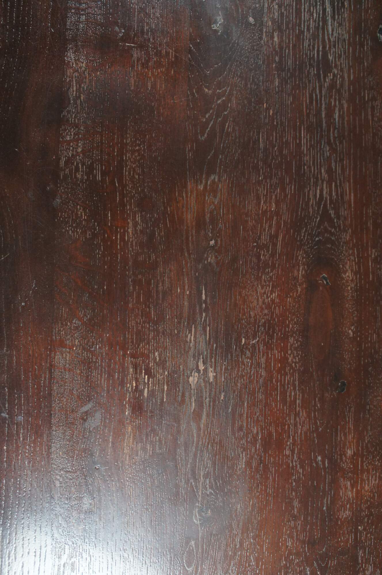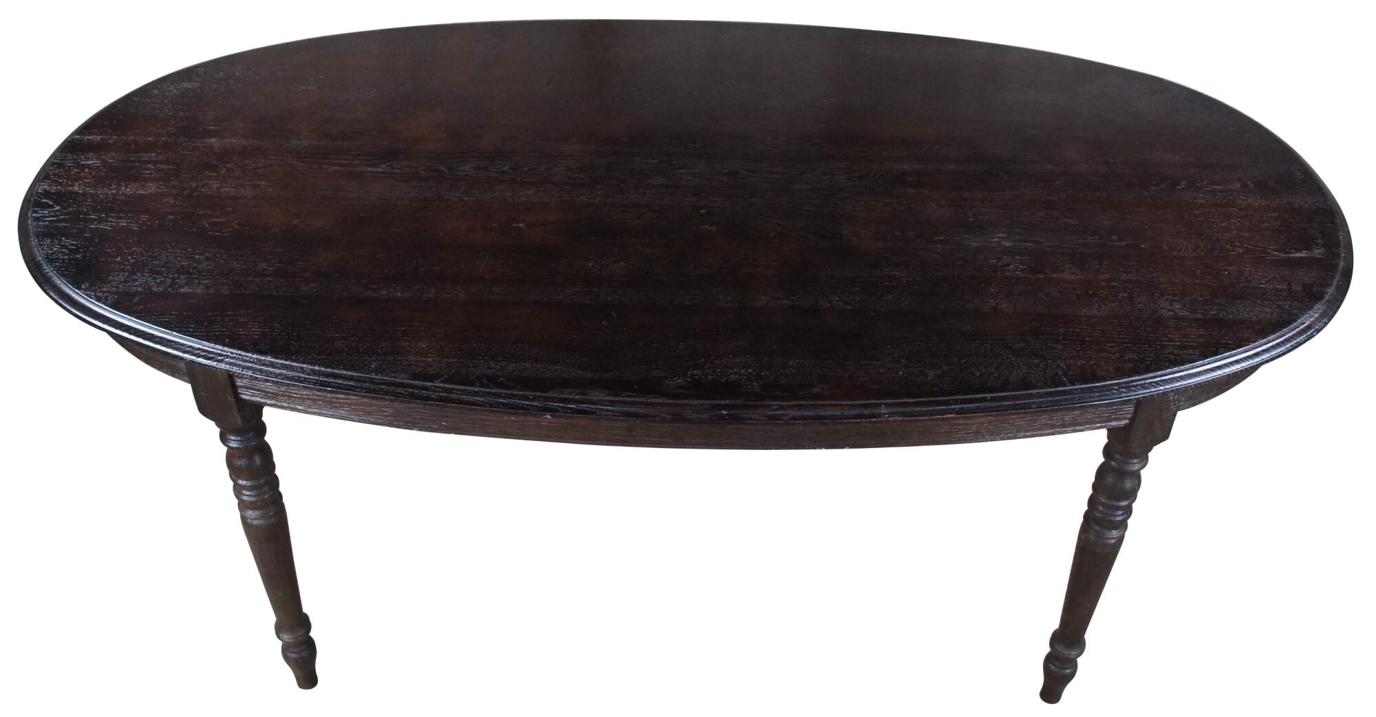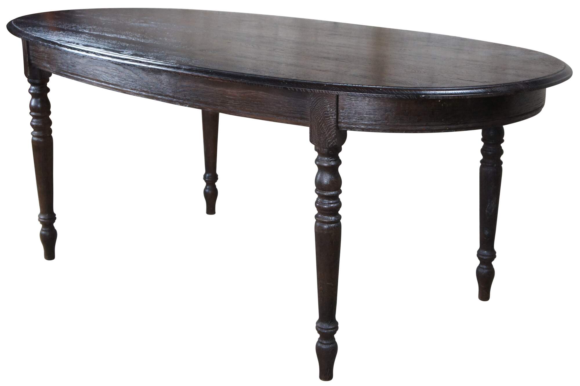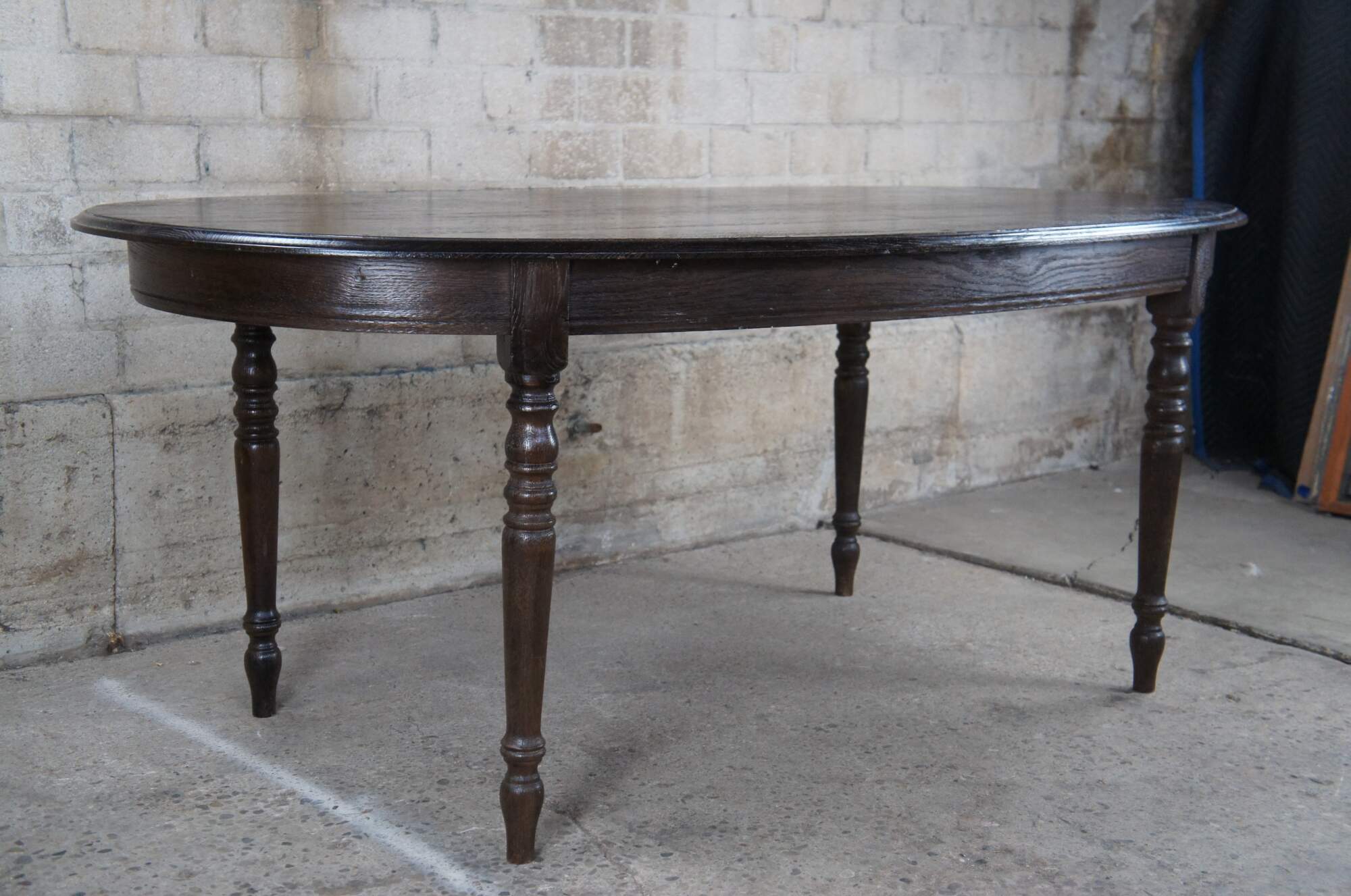 A simple yet beautiful European dining or library table. Made from oak with turned legs leading to turnip feet. Finished in a medium brown stain.