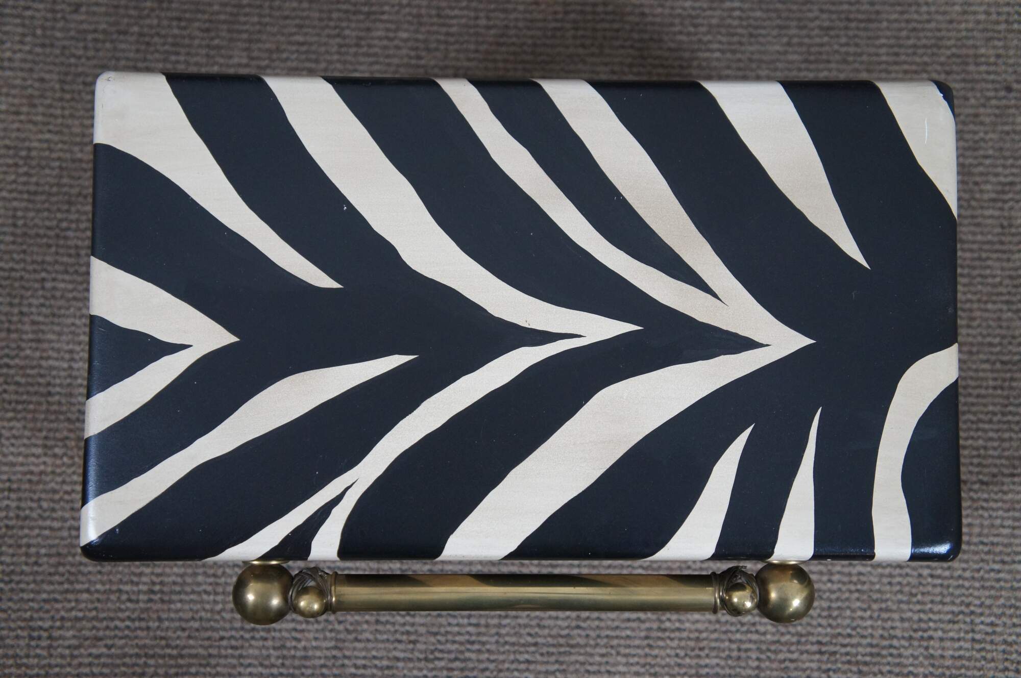 Vintage Hart Associates lidded keepsake storage box side or end table featuring a zebra patterned rectangular chest on stand with tubular brass bar along the front.