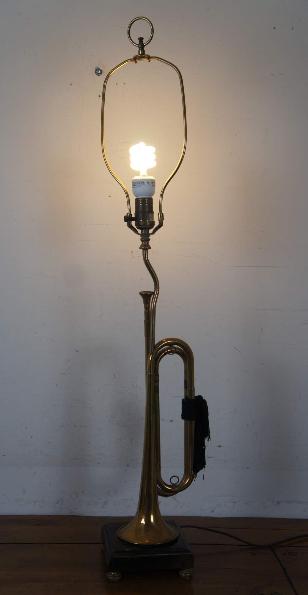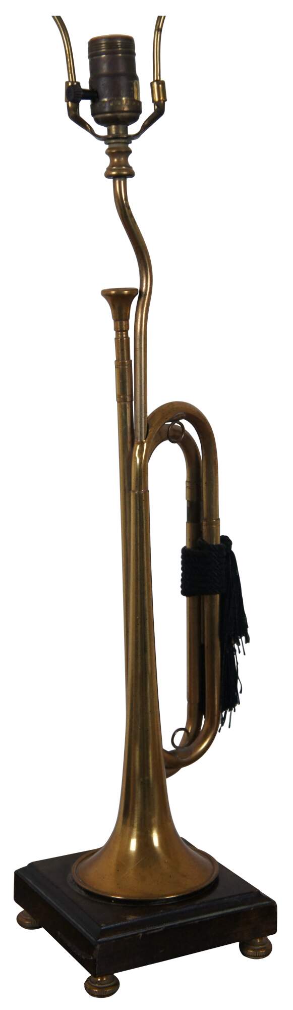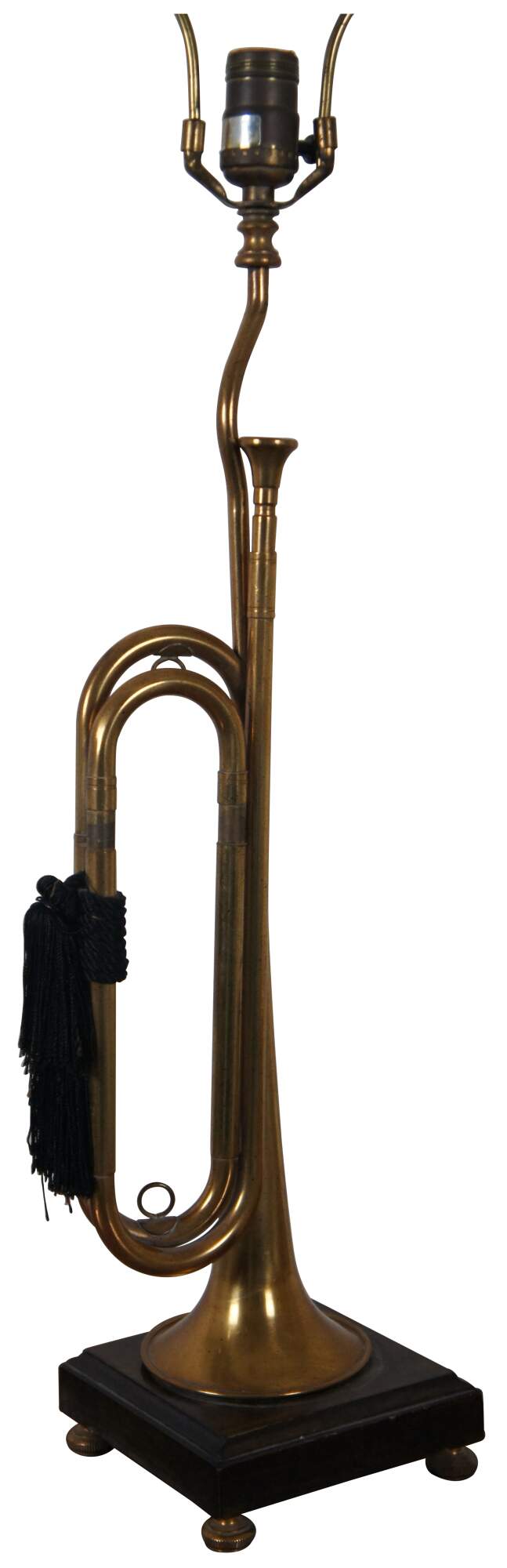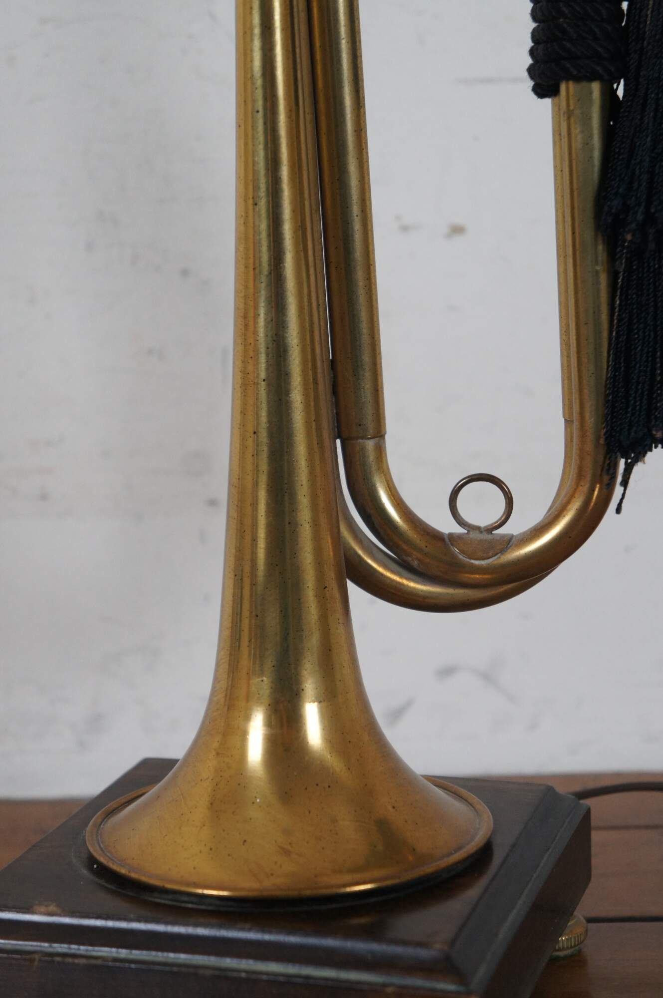 Vintage Frederick Cooper brass instrument table lamp in the shape of a bugle decorated with black tassels, standing on a dark wood base, with a ring shaped finial.