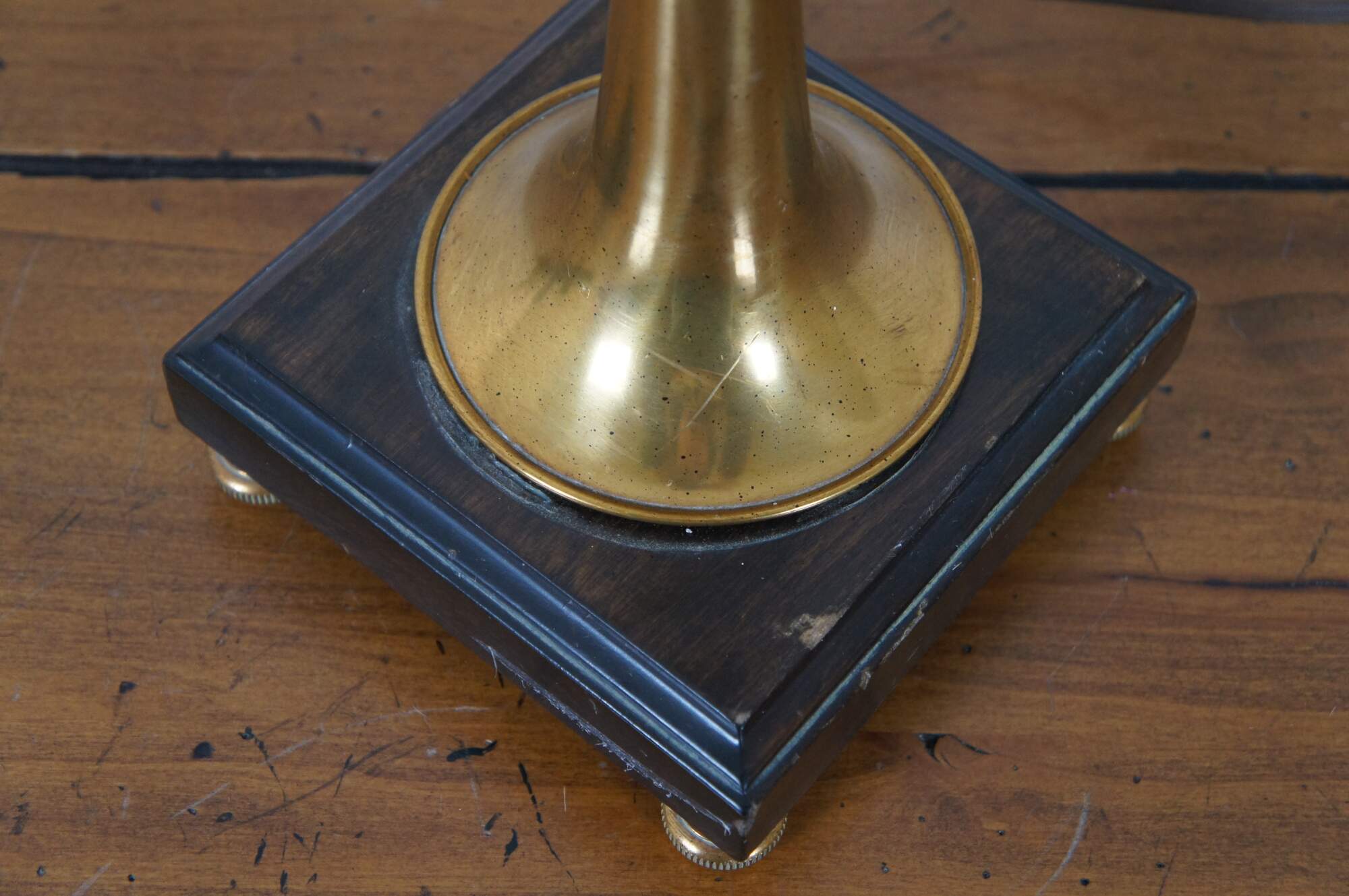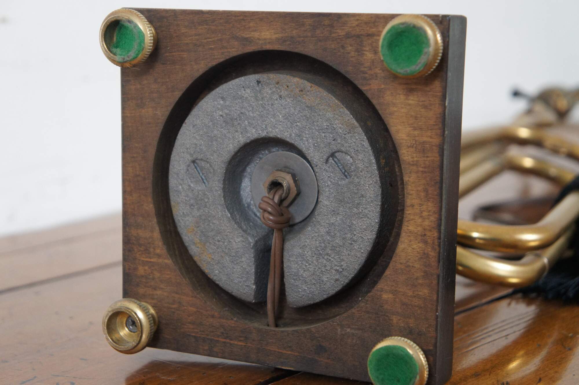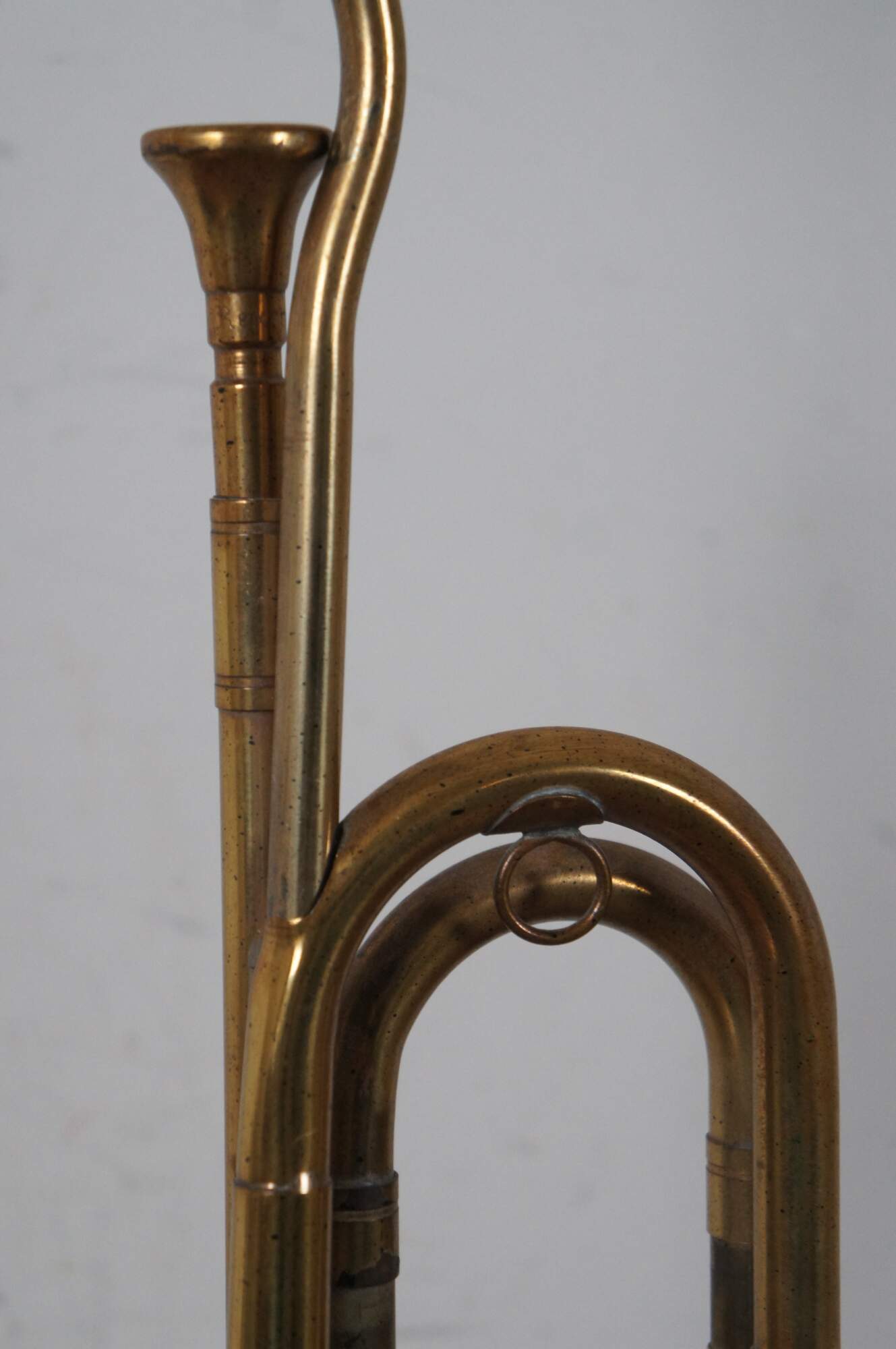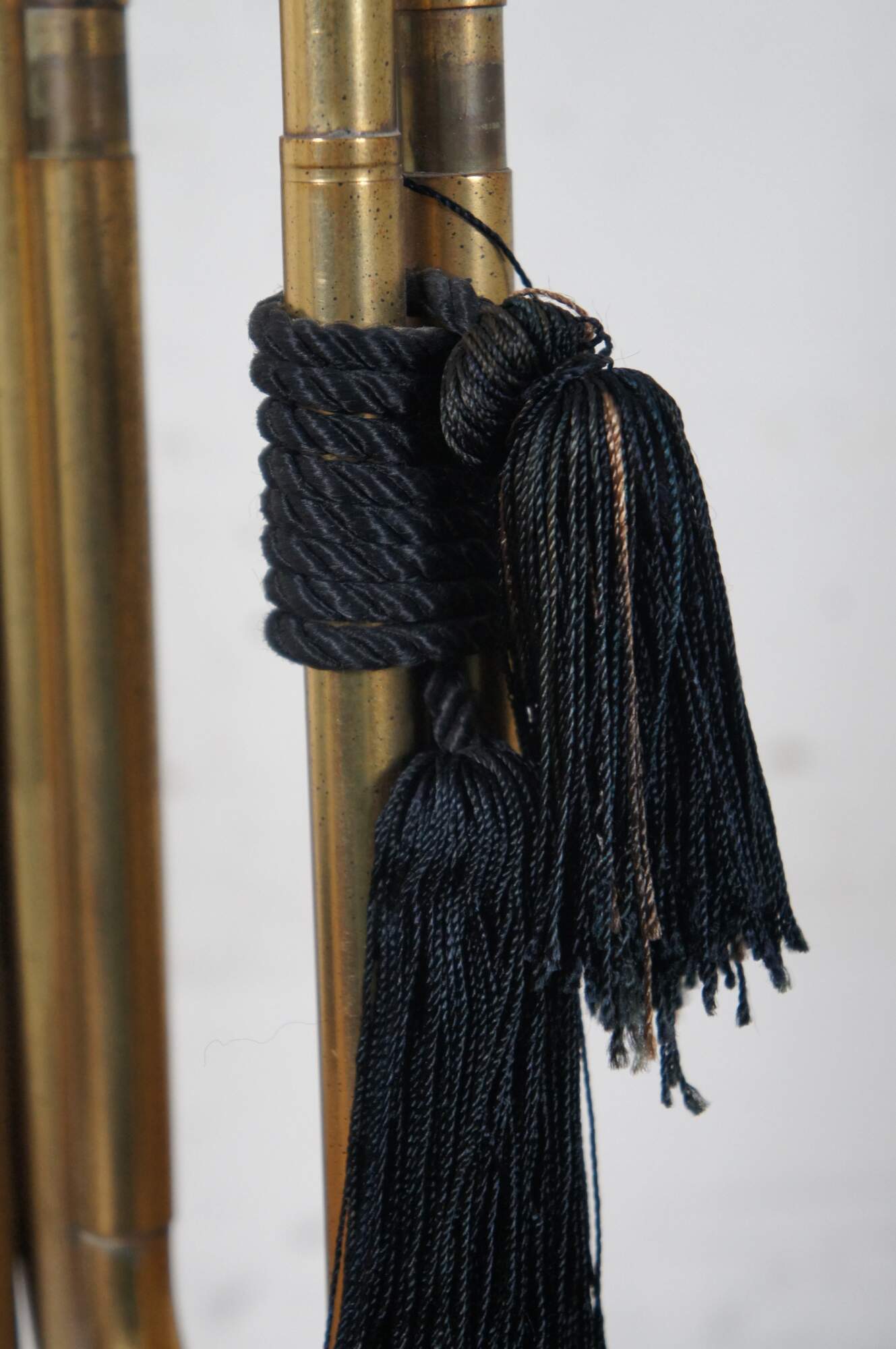 Vintage Frederick Cooper brass instrument table lamp in the shape of a bugle decorated with black tassels, standing on a dark wood base, with a ring shaped finial.