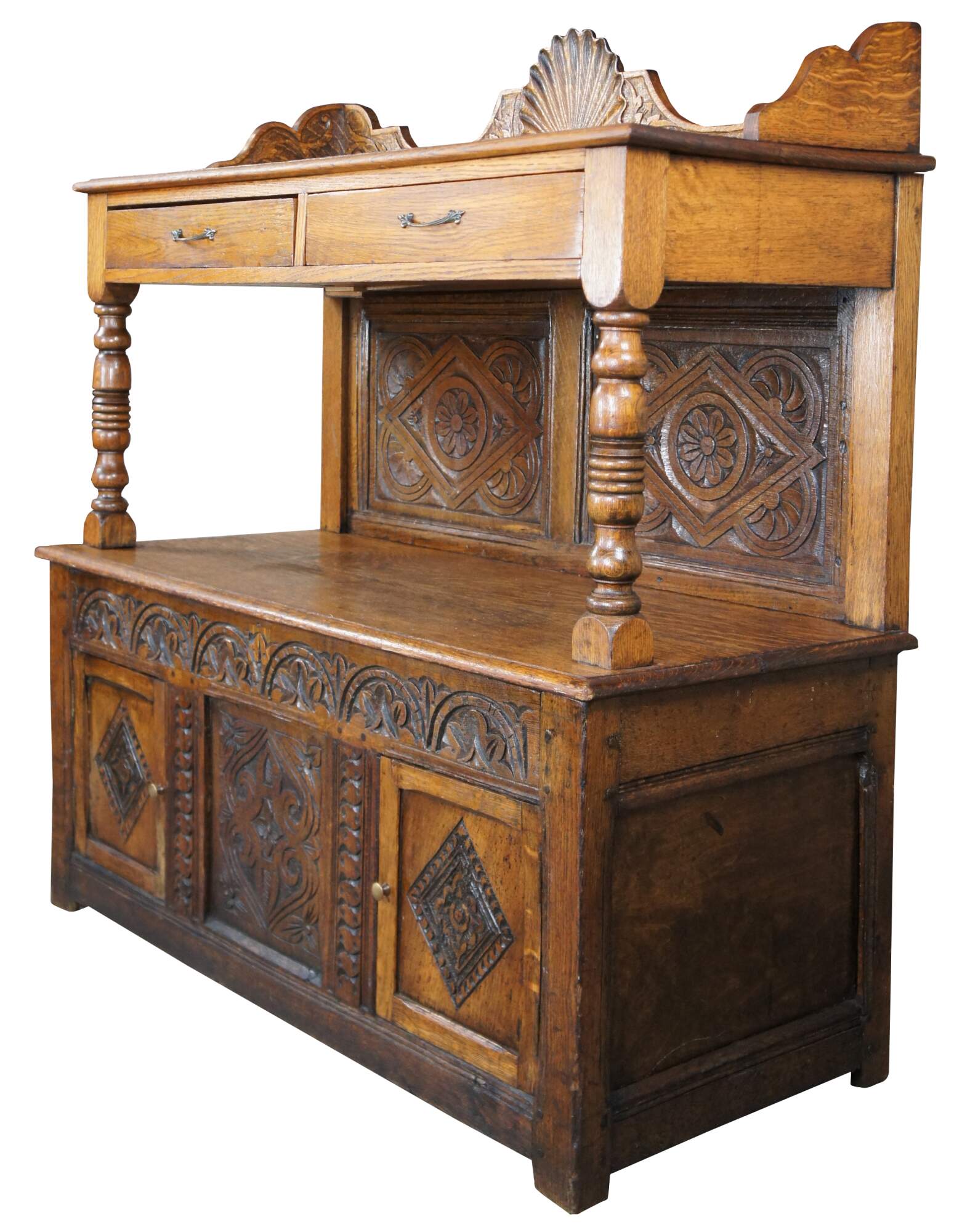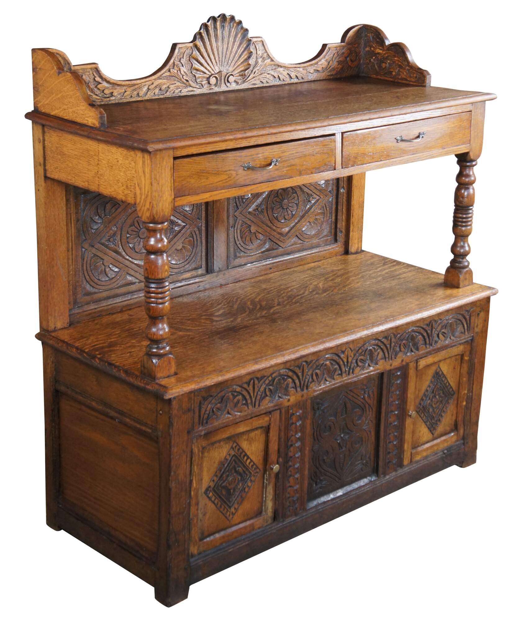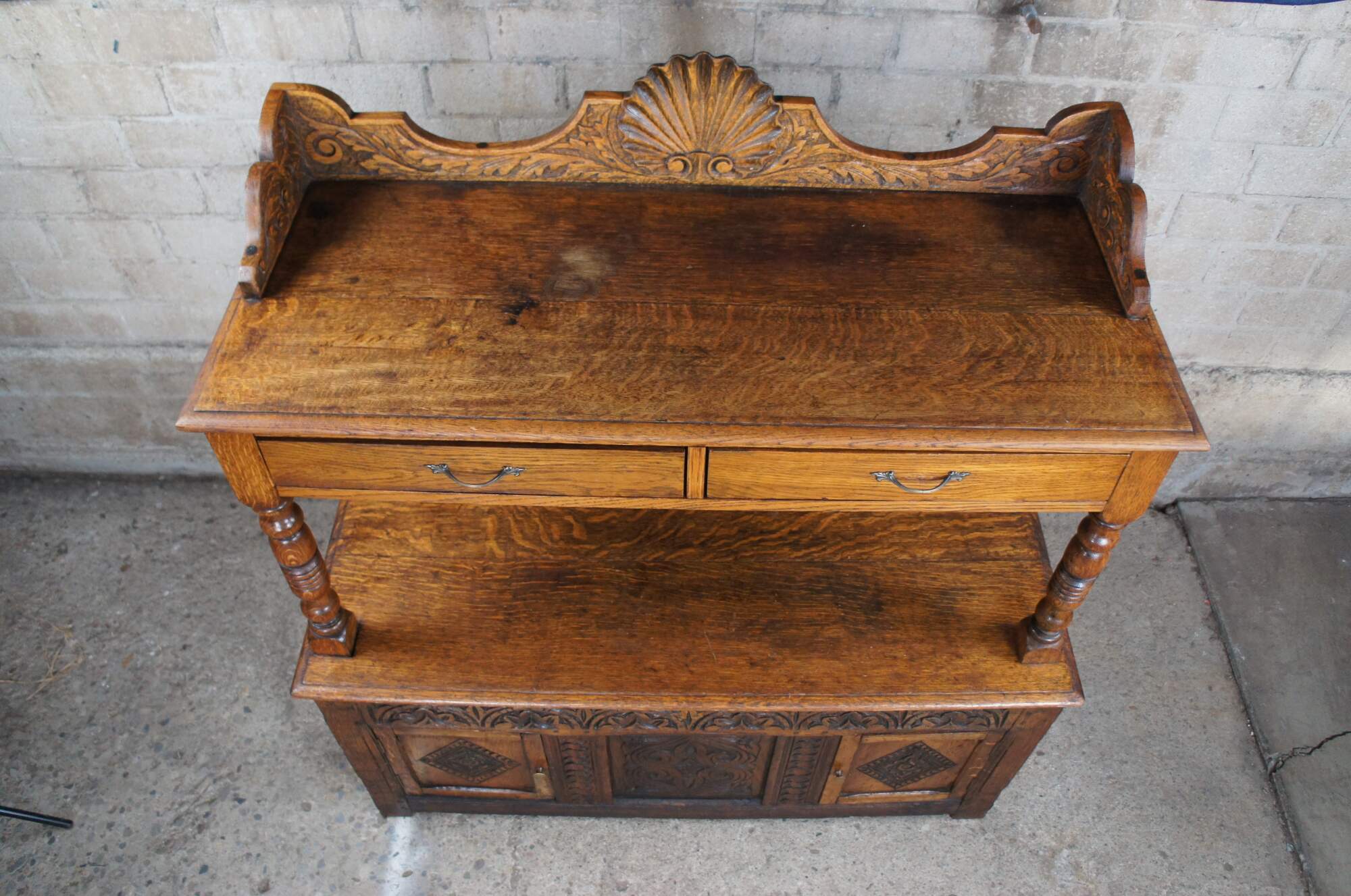 A beautiful English Charles II era sideboard or server, circa 1660s. Reminiscent of the Jacobean era Court Cupboard. Made from quartersawn oak with intricately carved details. Features a rectangular form with a large upper serving area over a frieze of two drawers with brass hardware. Top is supported by turned and ribbed columns along the front and an extradordinary paneled back carved with diamonds, flowers and fans. The cupboard area of the case houses 2 diamond paneled doors that open to the lower cabinet area. Central lower panel bares a crest flanked by S scrolls beneath an apron of egg and dart carving. The cabint is topped with an impressive backsplash, scalloped at the center and flanked by flowing acanthus leaves. It's versatile size allows for use as a hall console, credenza or barback.