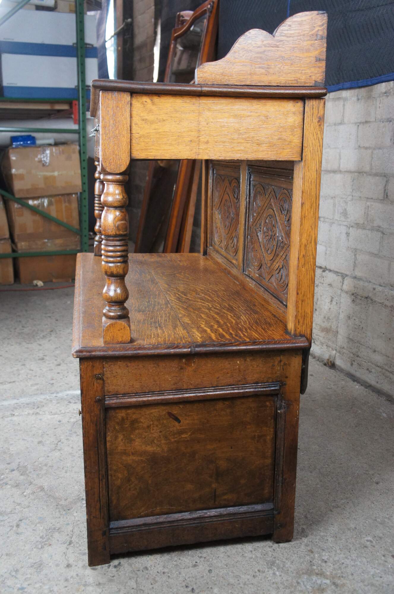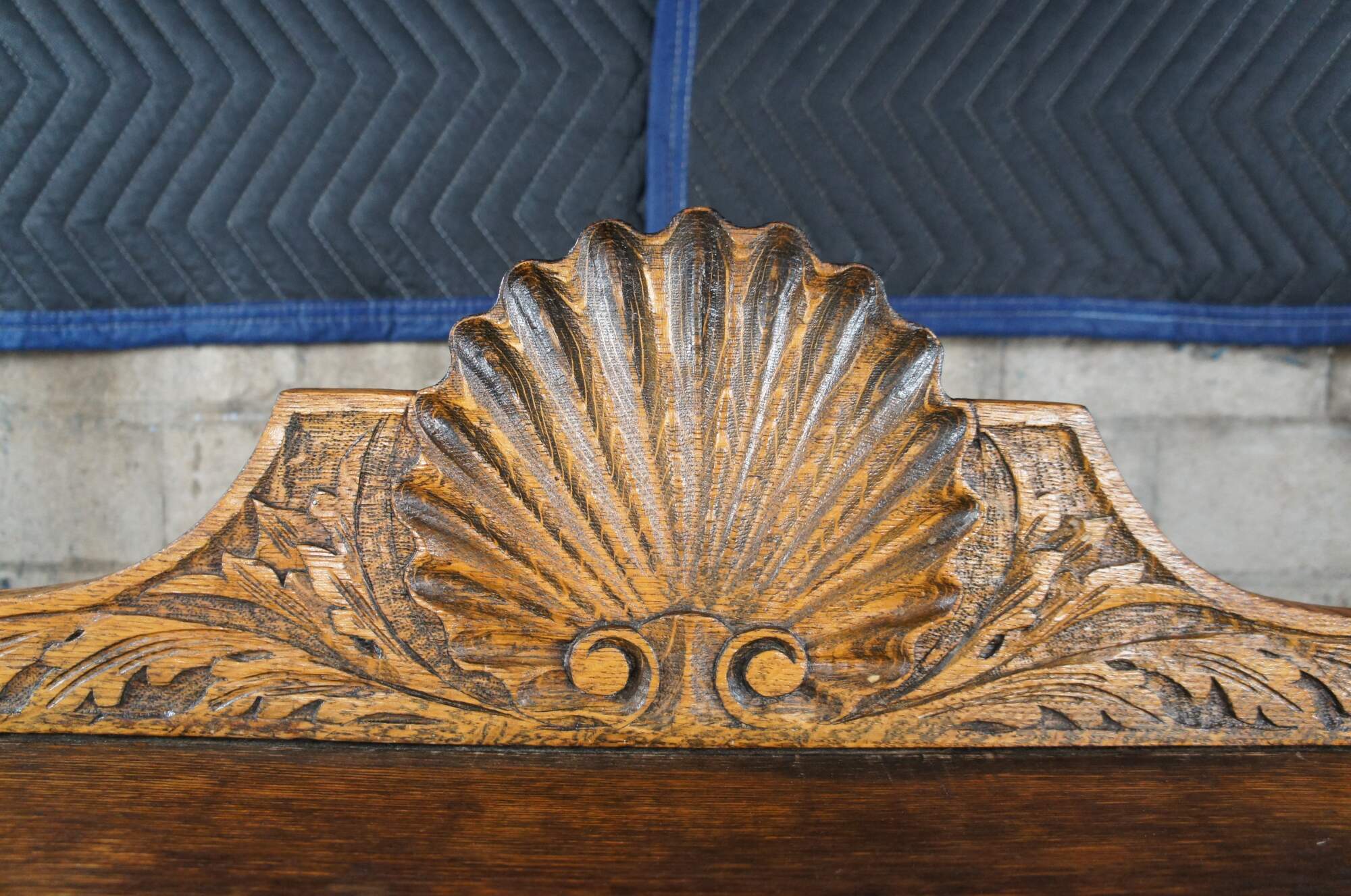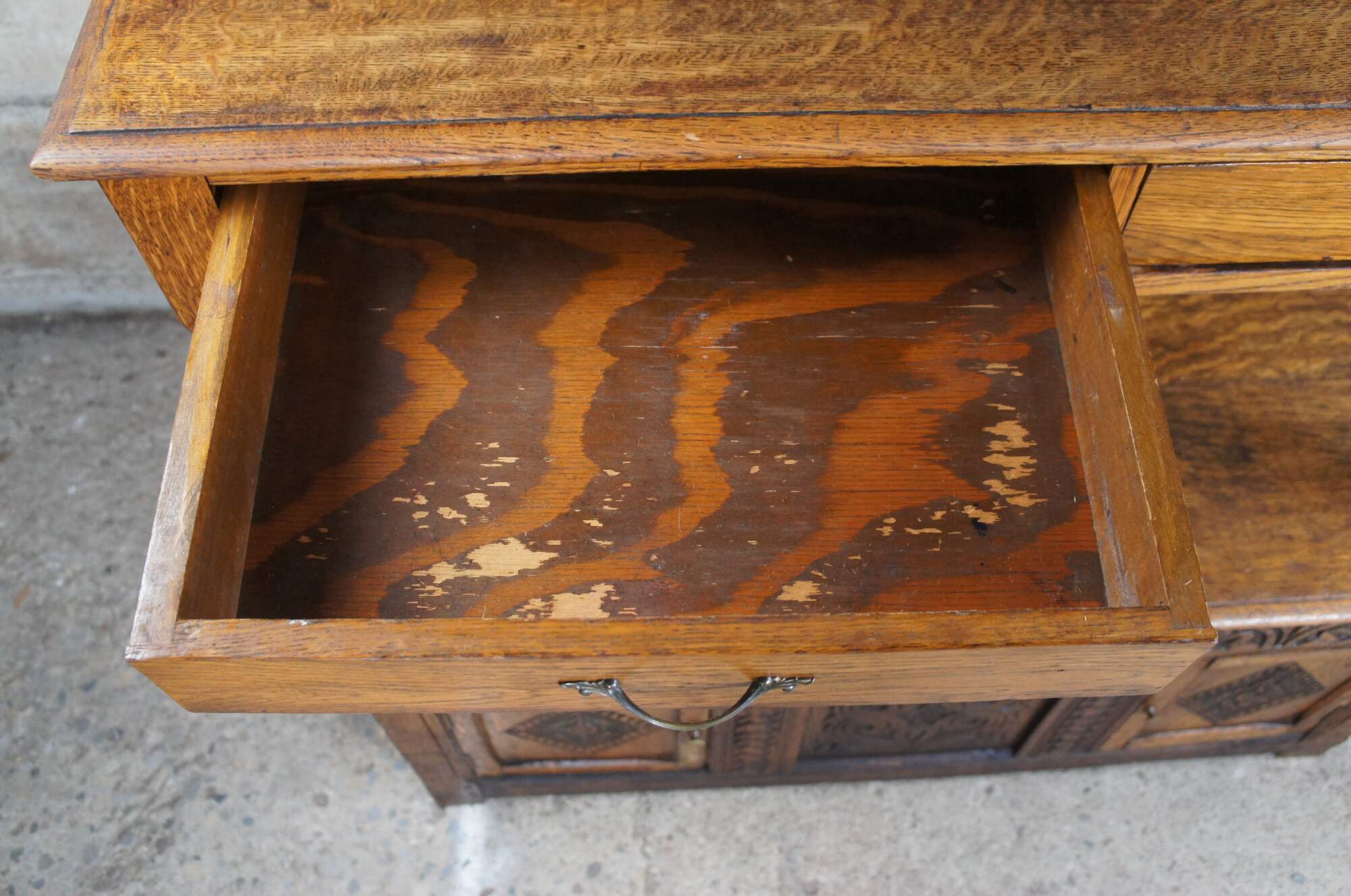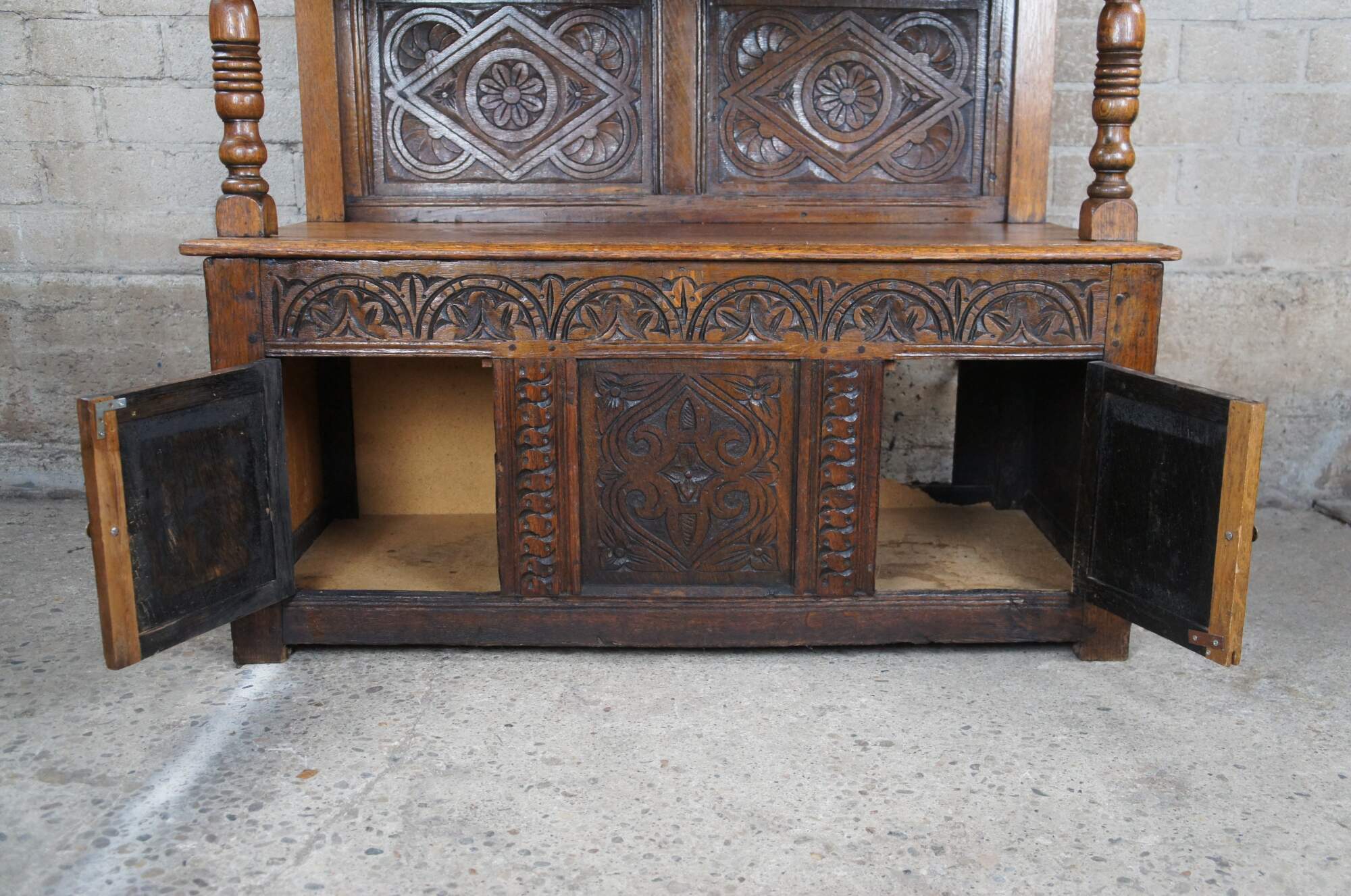 A beautiful English Charles II era sideboard or server, circa 1660s. Reminiscent of the Jacobean era Court Cupboard. Made from quartersawn oak with intricately carved details. Features a rectangular form with a large upper serving area over a frieze of two drawers with brass hardware. Top is supported by turned and ribbed columns along the front and an extradordinary paneled back carved with diamonds, flowers and fans. The cupboard area of the case houses 2 diamond paneled doors that open to the lower cabinet area. Central lower panel bares a crest flanked by S scrolls beneath an apron of egg and dart carving. The cabint is topped with an impressive backsplash, scalloped at the center and flanked by flowing acanthus leaves. It's versatile size allows for use as a hall console, credenza or barback.
