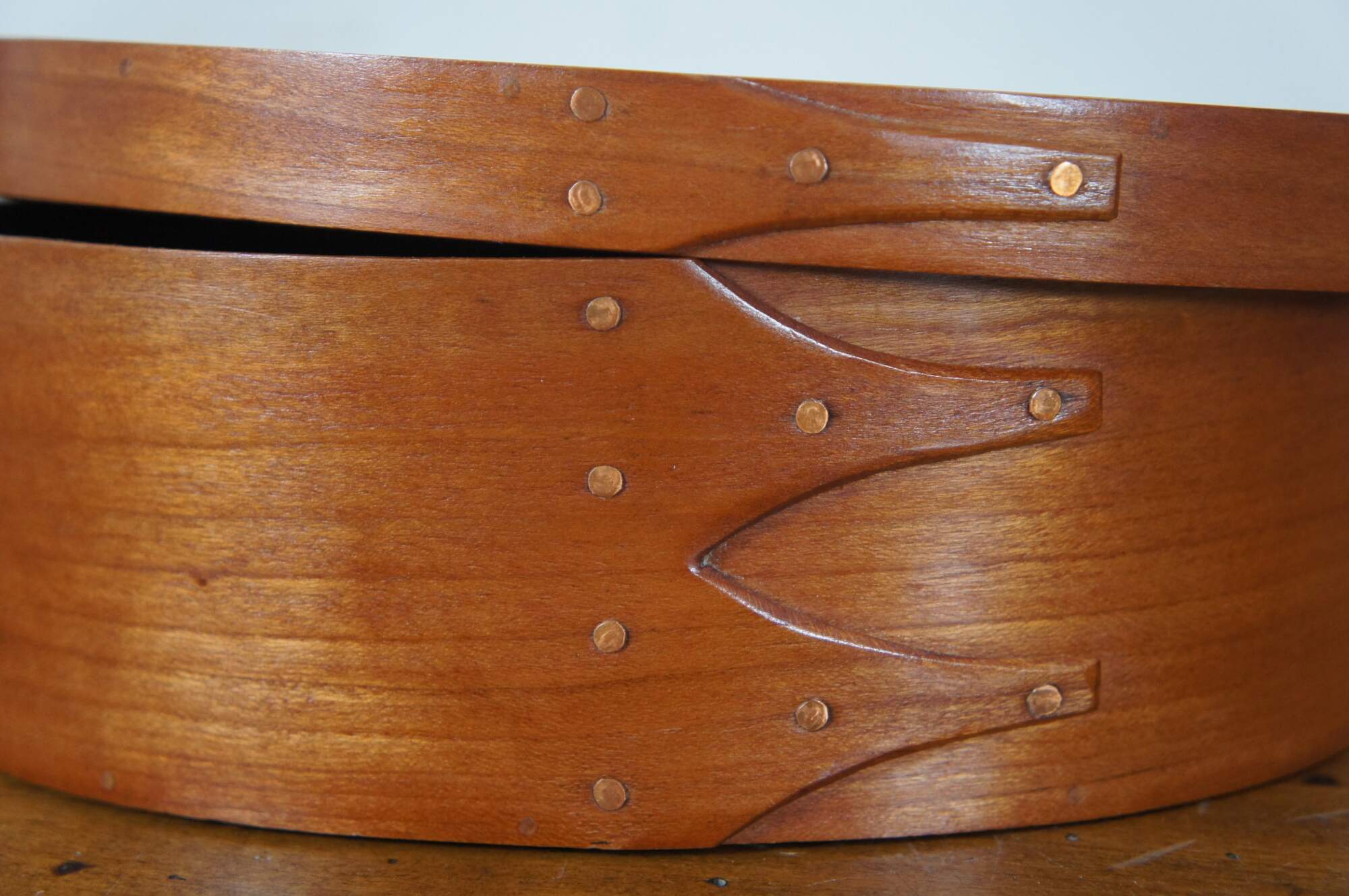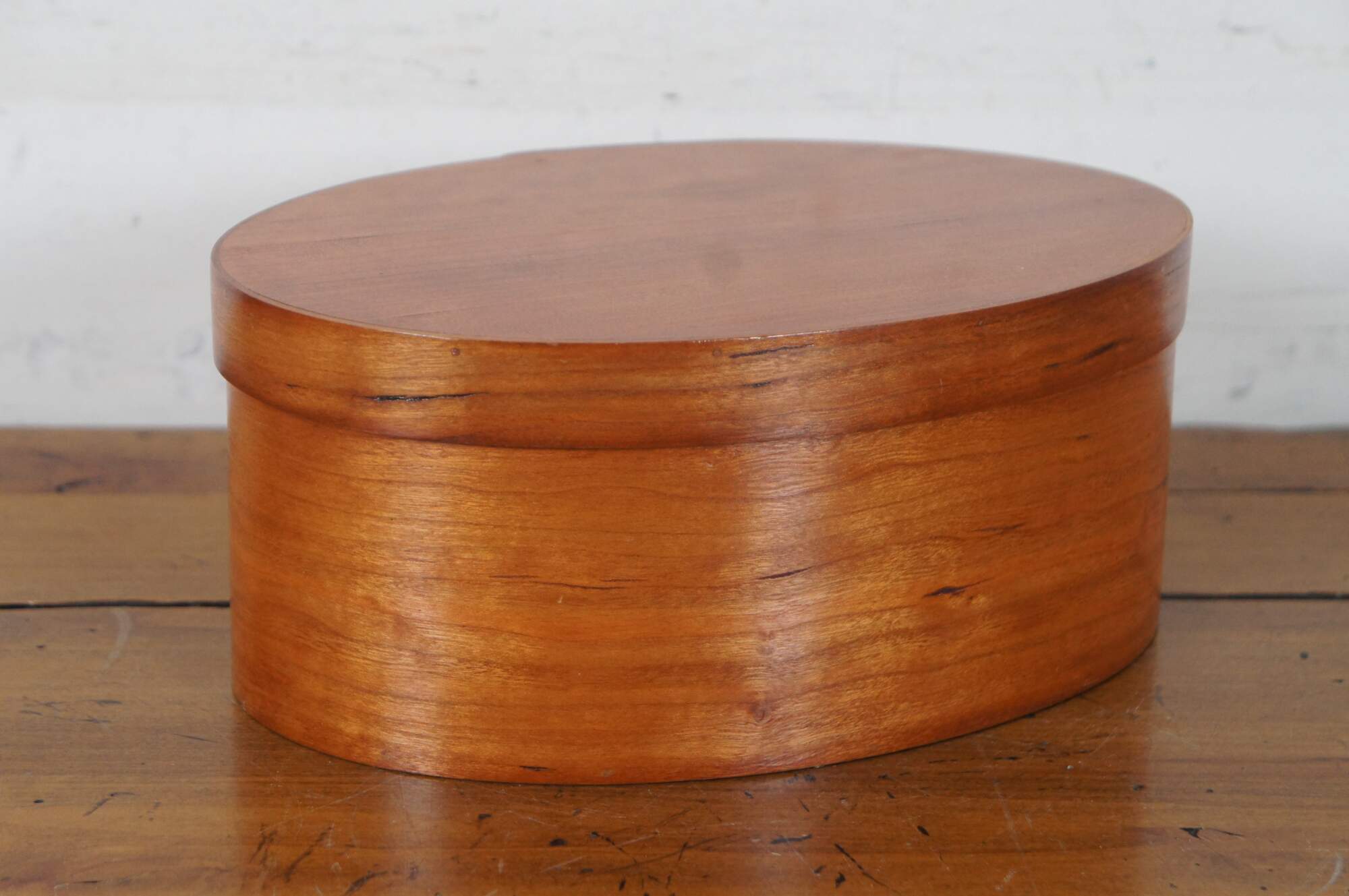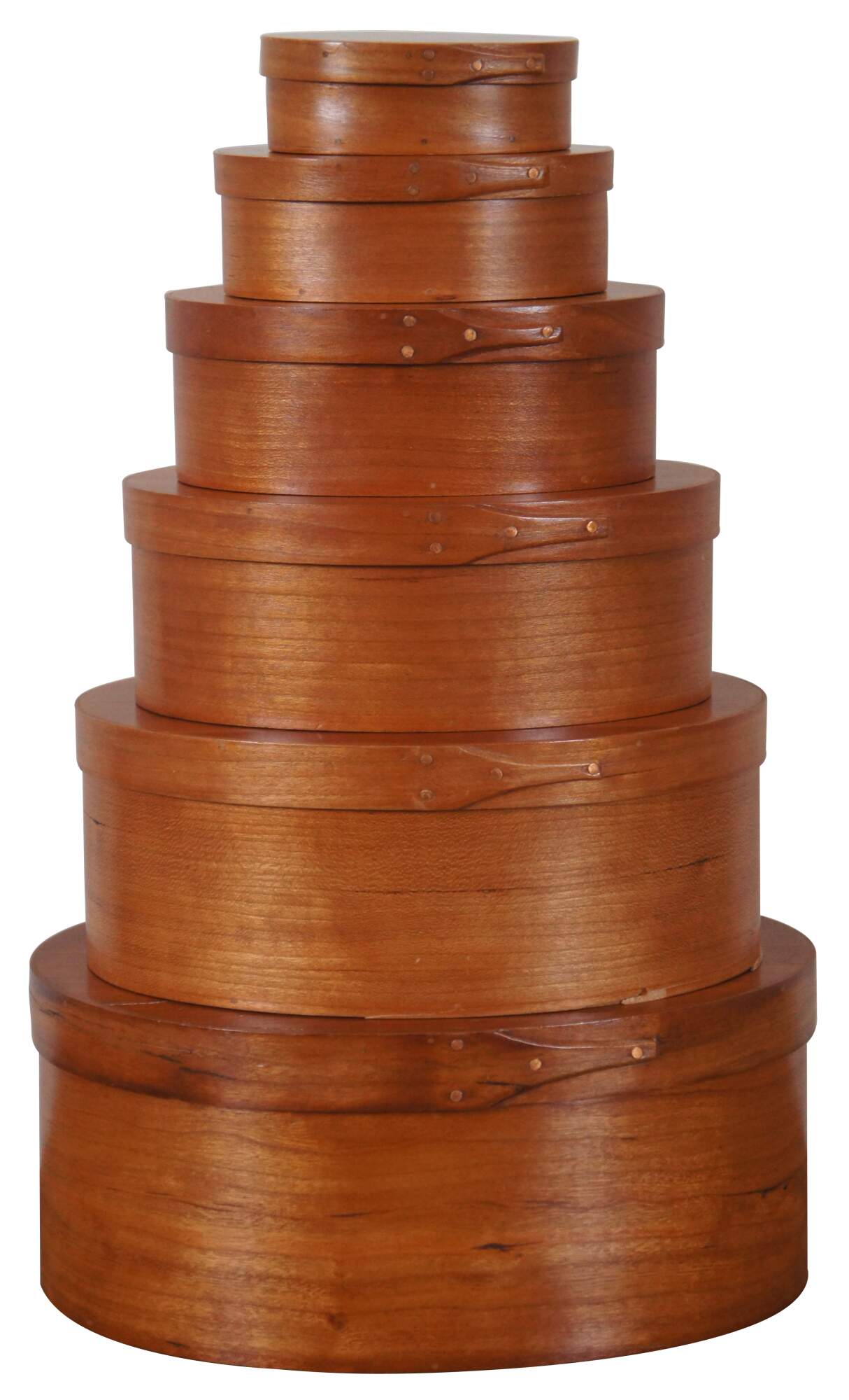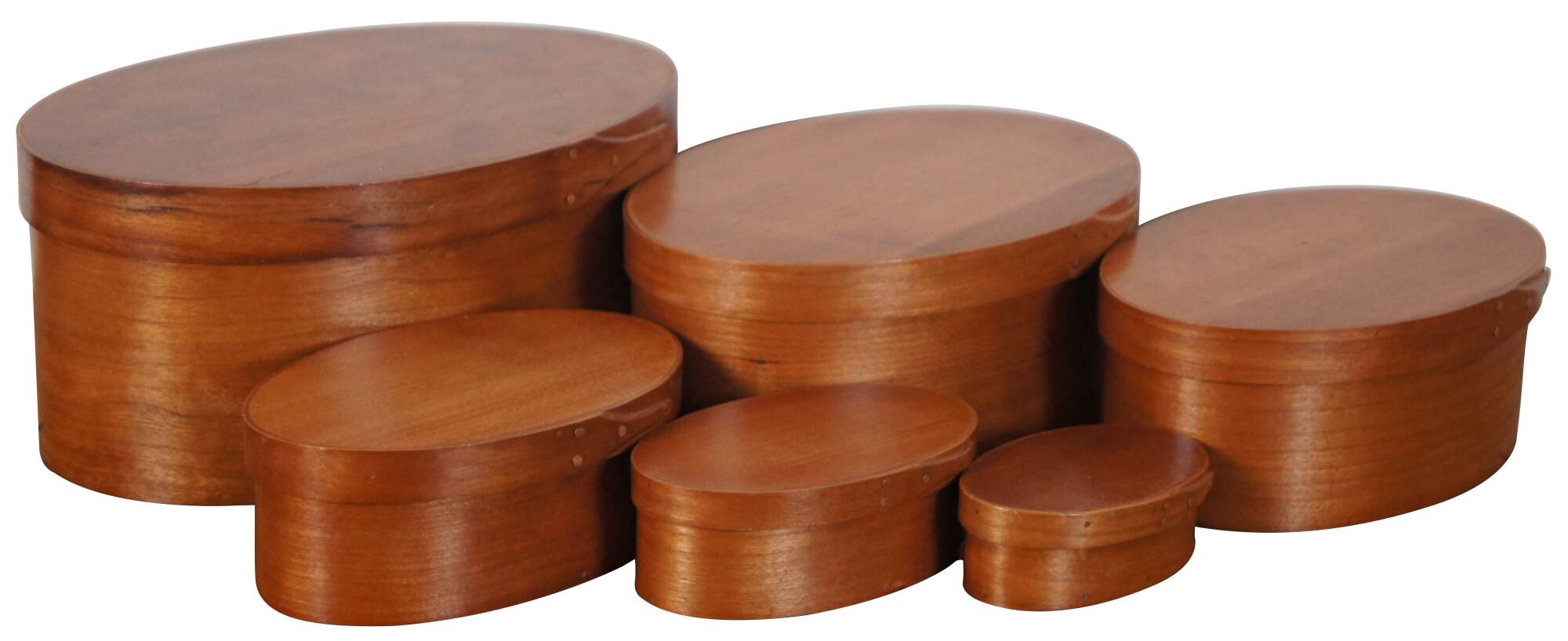 Set of 6 vintage oval, bentwood cedar Shaker / folk art style, nesting pantry boxes. Signed G. Loyd.