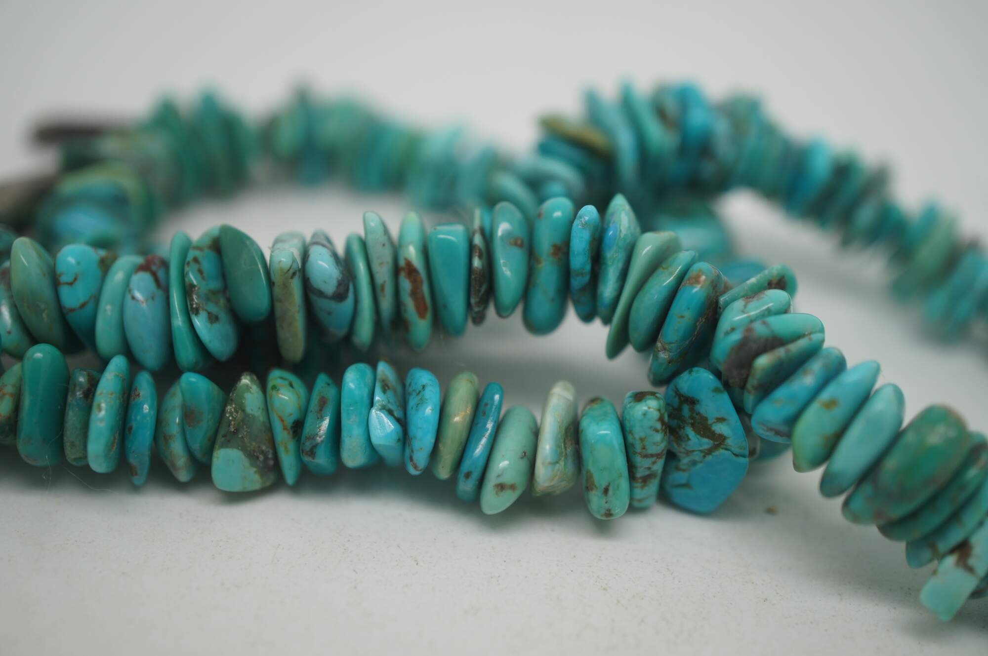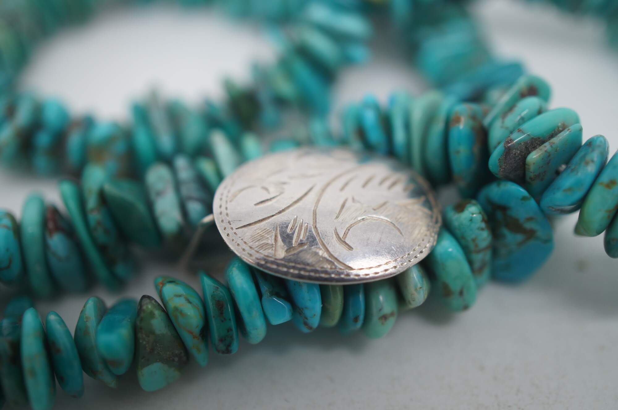 Vintage turquoise nugget beaded necklace with hook clasp and pair of silver plated earrings etched with southwestern designs and simple wire back.