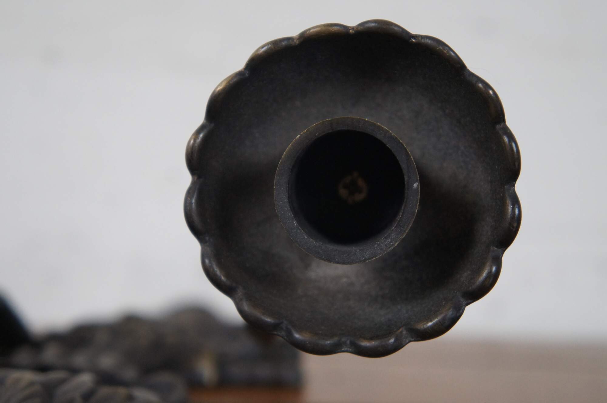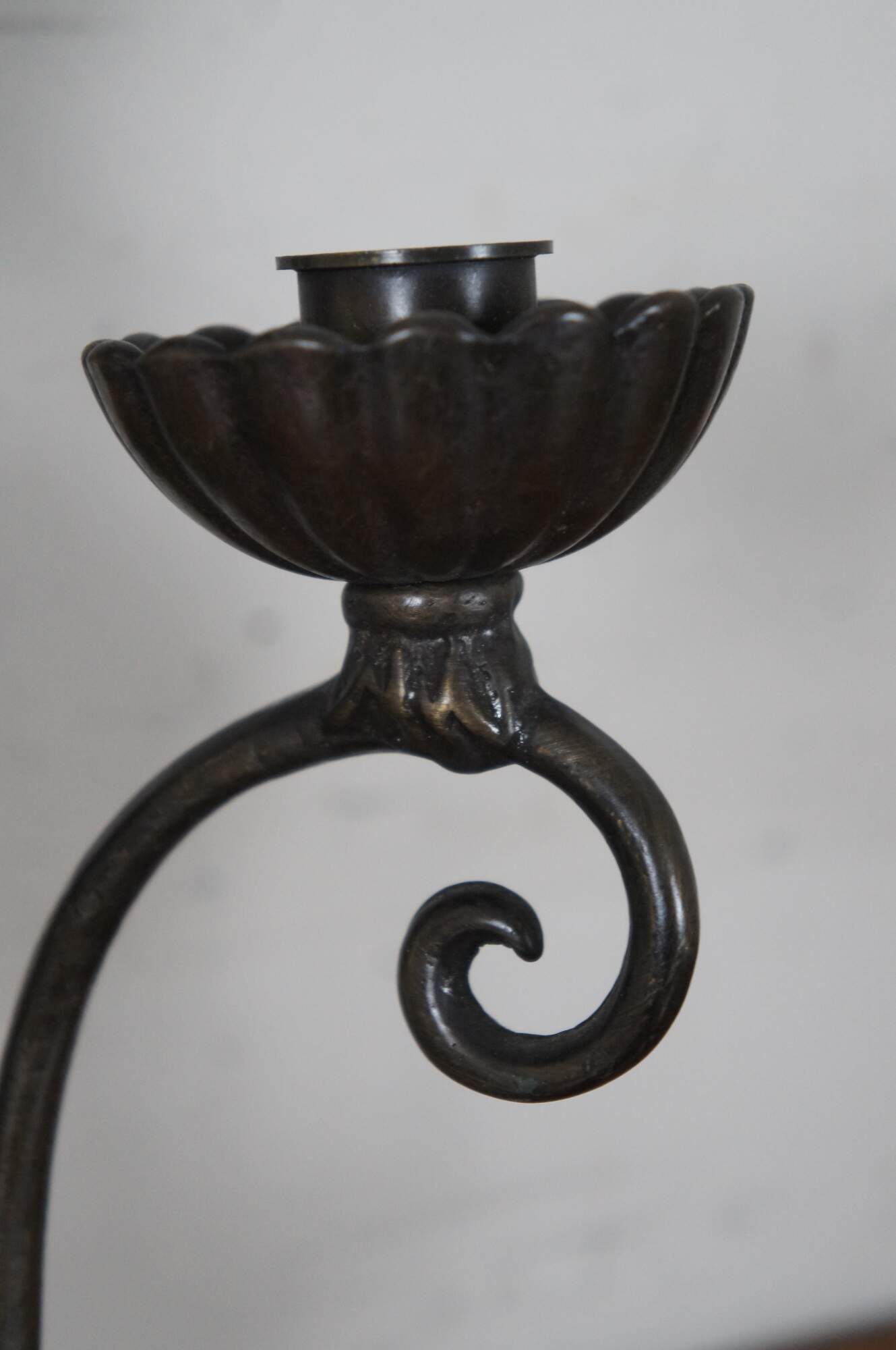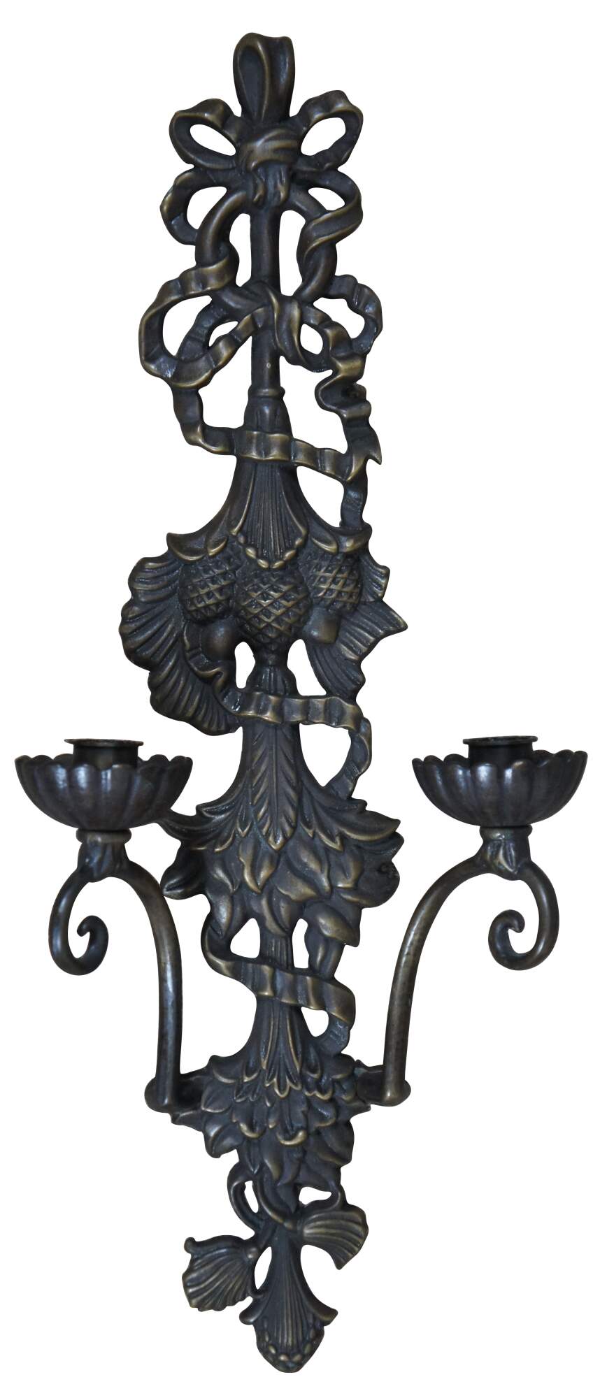 Pair of vintage bronze two light candle sconces featuring a Victorian design of ribbons, leaves and pine cones.