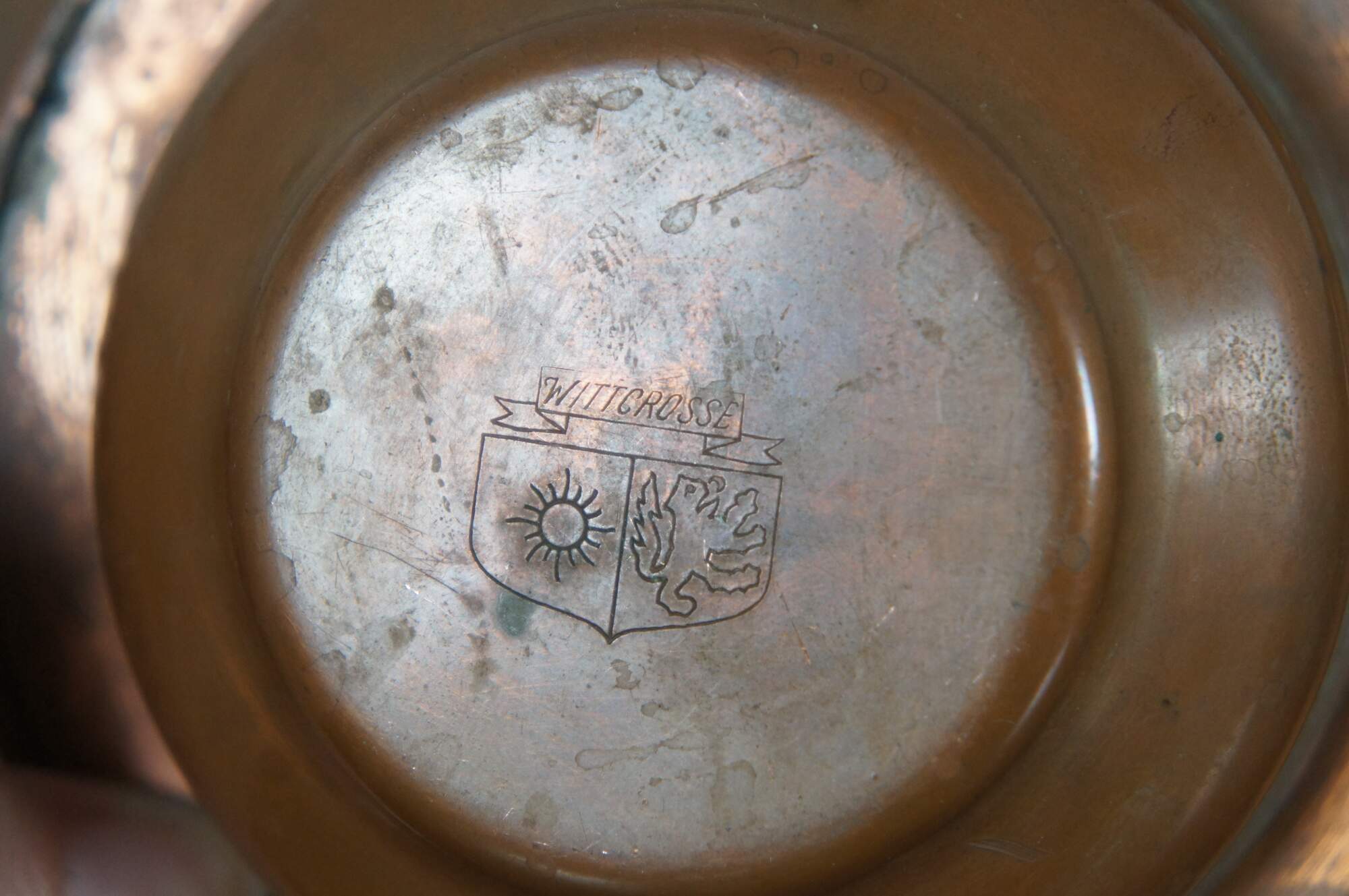 Vintage Wittcrosse chafing dish set including a brass stand, copper oil lamp / burner, and a two-part warming pan with lid.