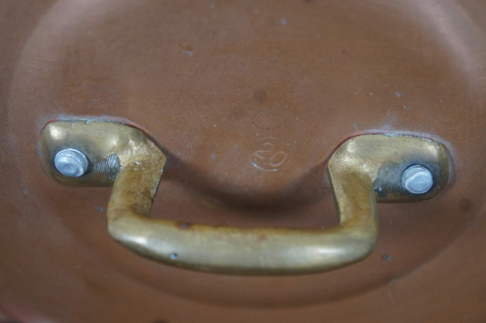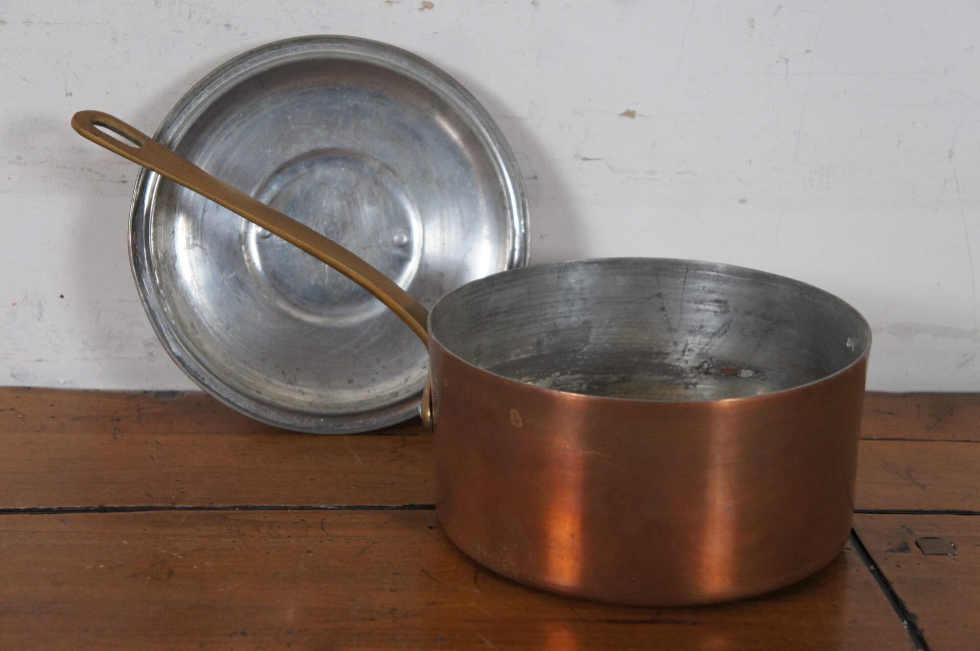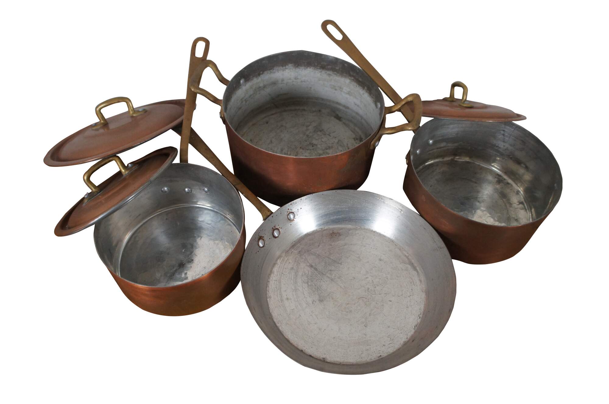 Set of 3 antique French Banon copper sauce pots / pans with lids plus one skillet / saute pan, all with hammered bottoms and brass handles.