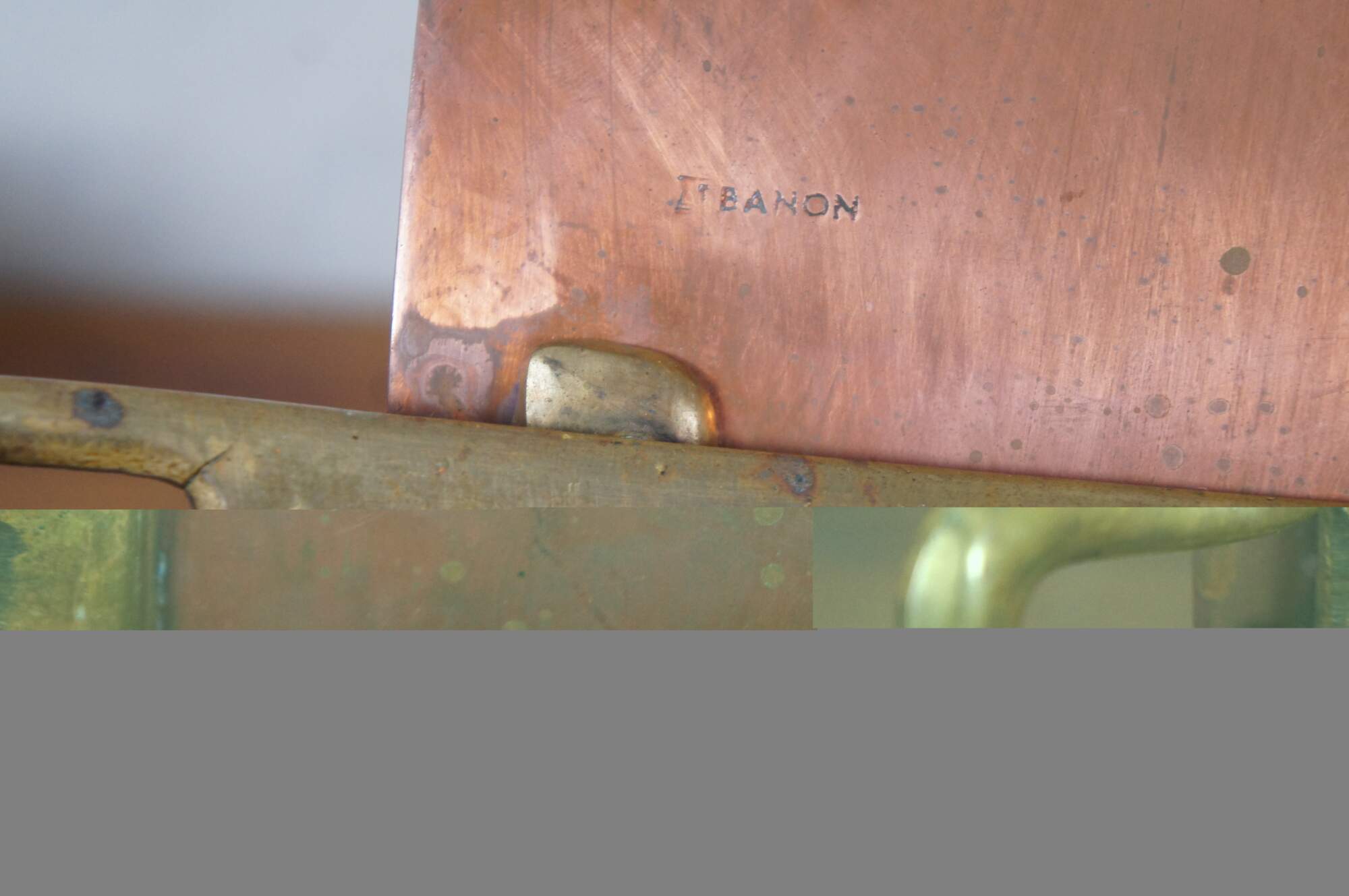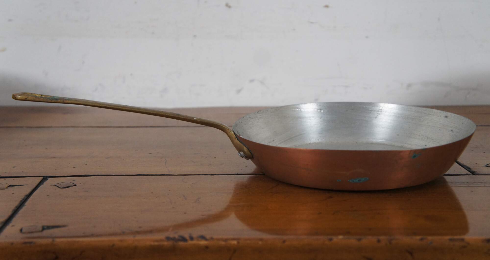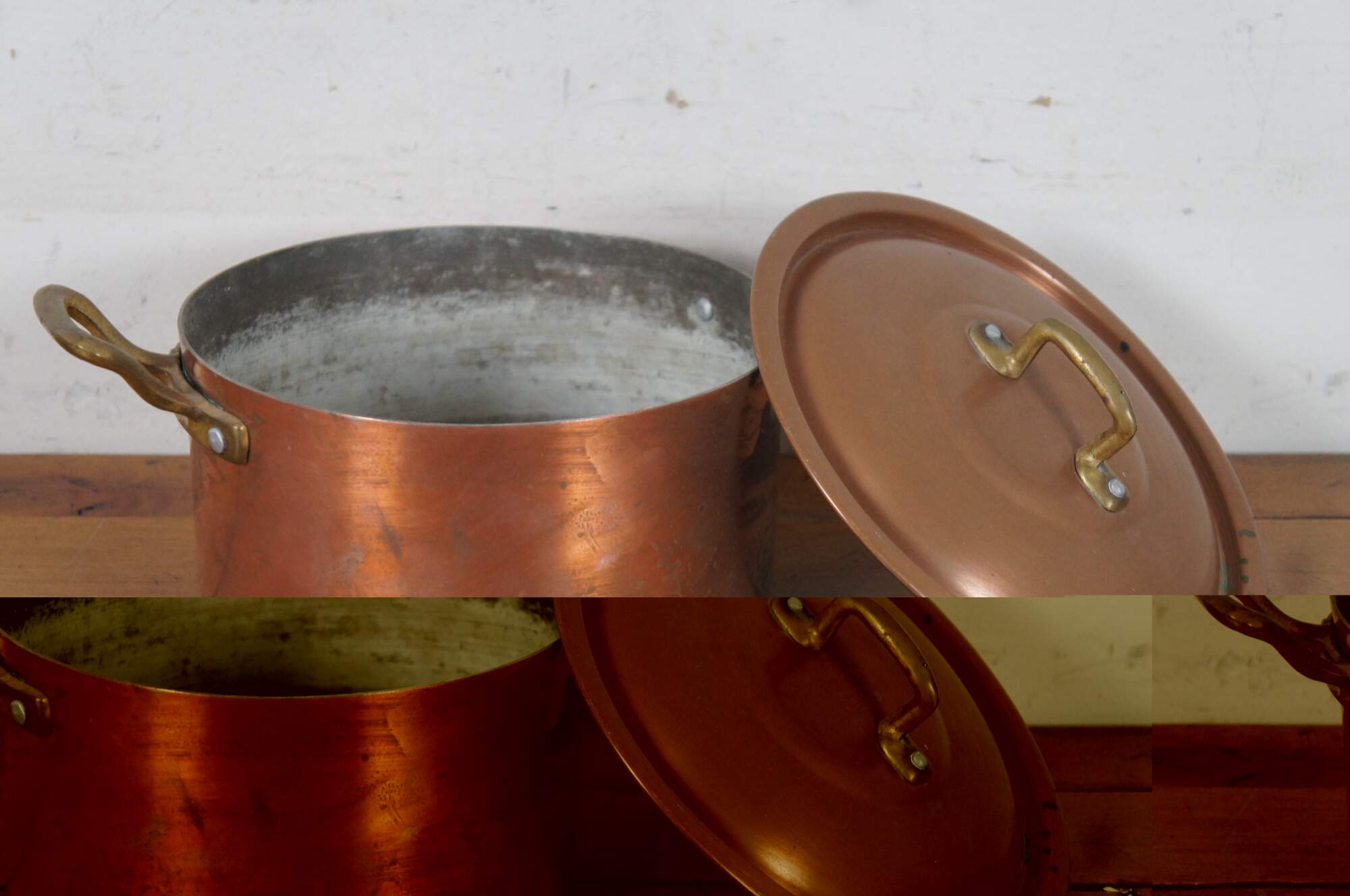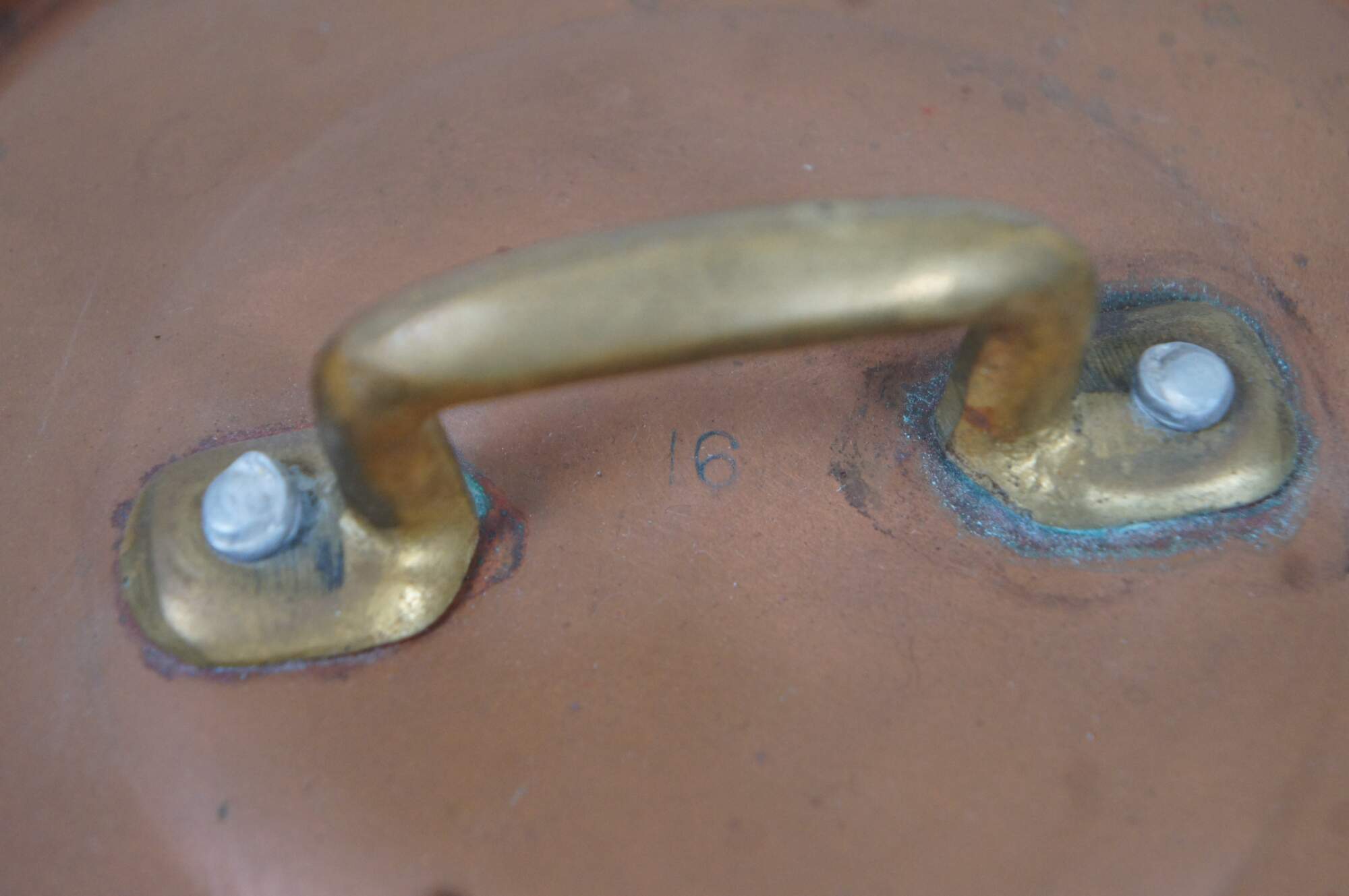 Set of 3 antique French Banon copper sauce pots / pans with lids plus one skillet / saute pan, all with hammered bottoms and brass handles.