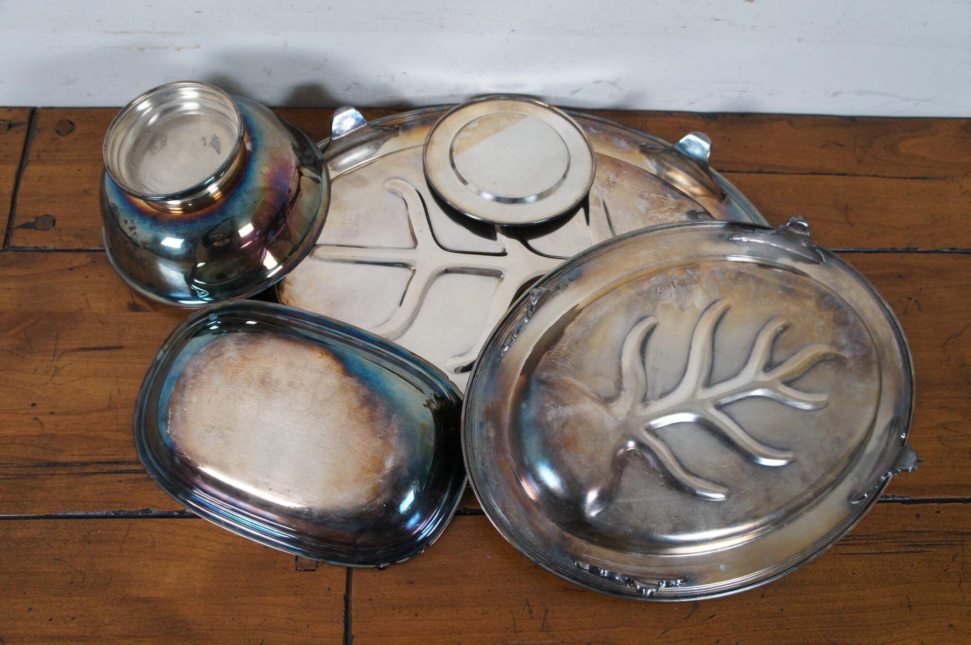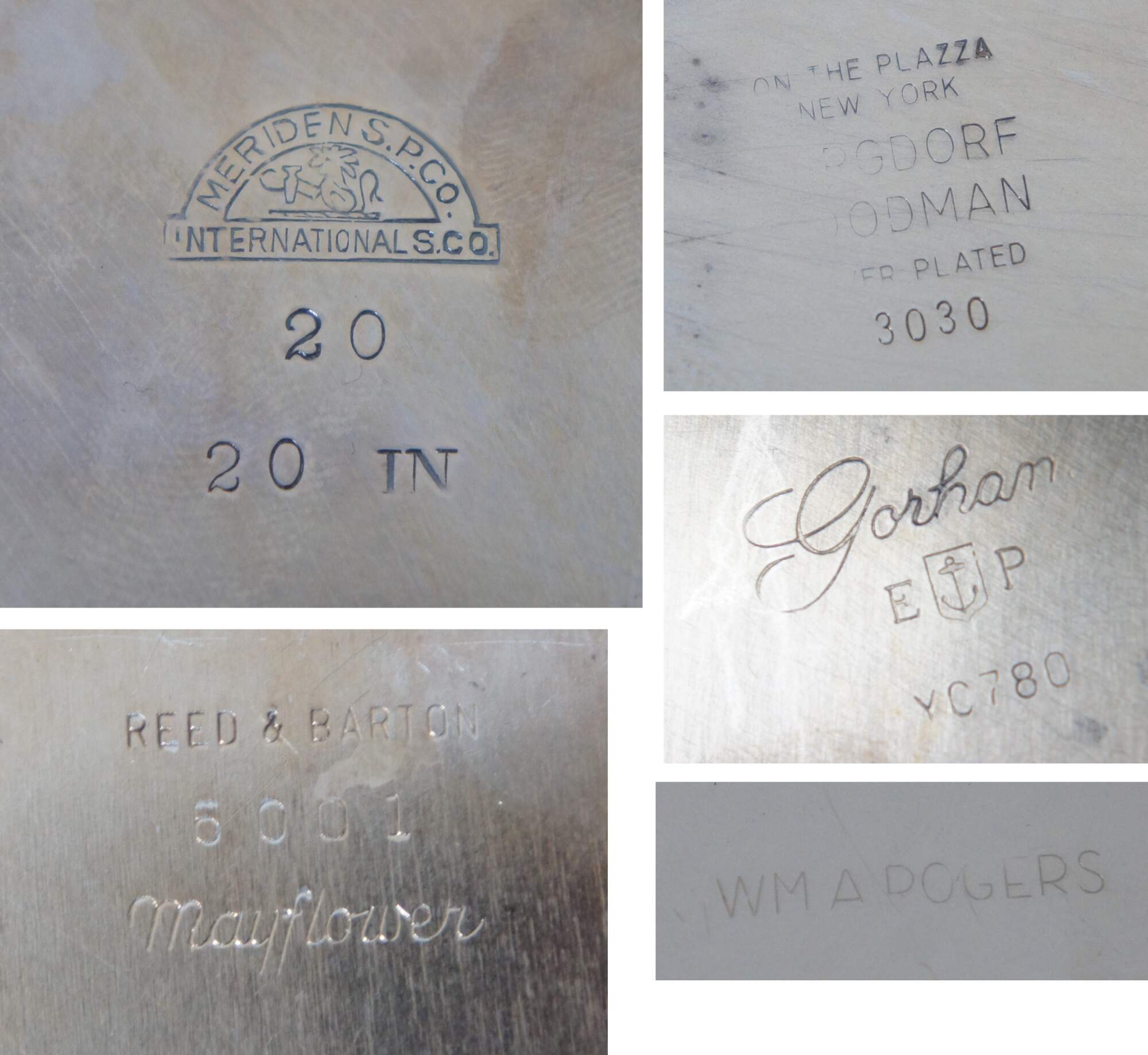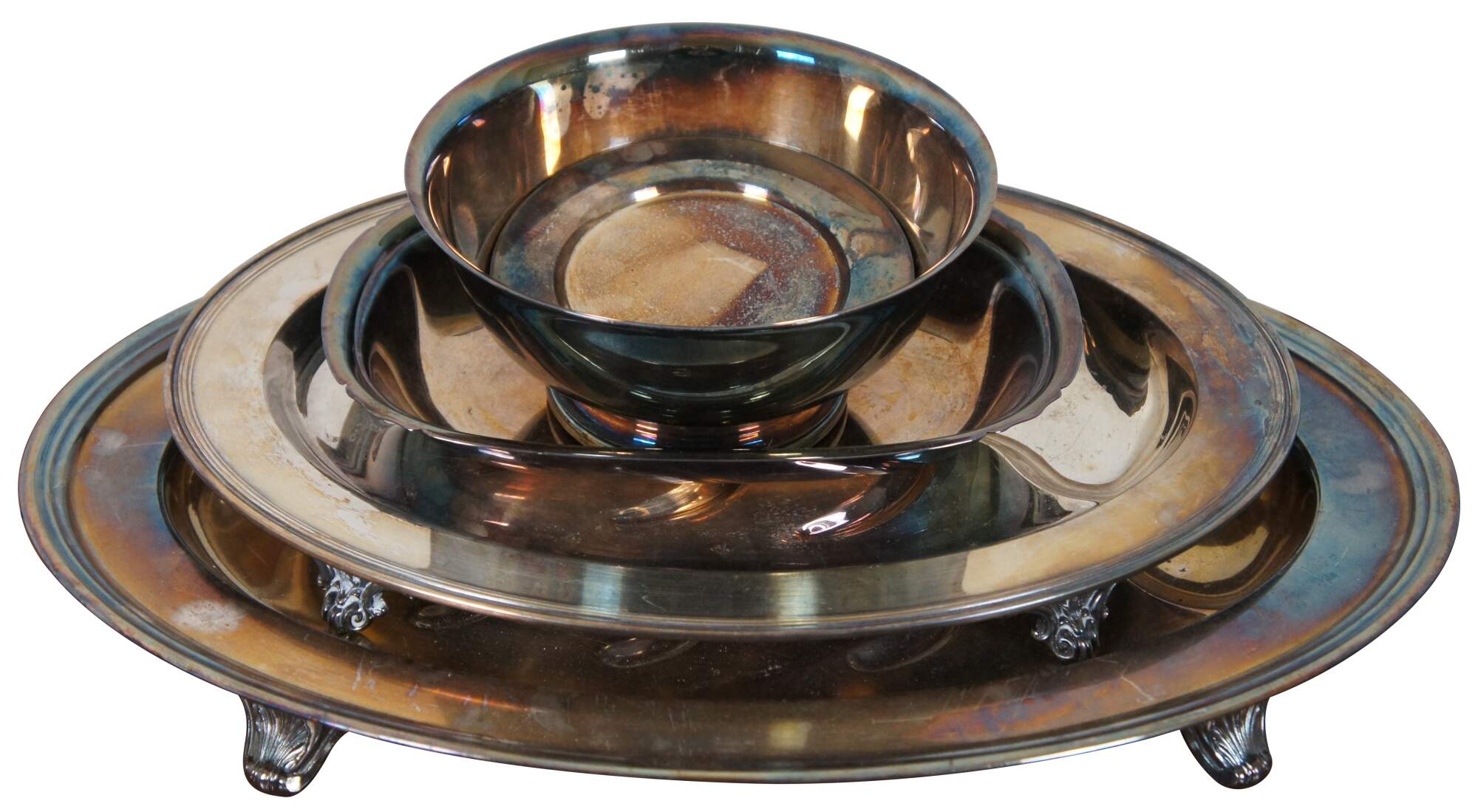 Vintage lot of five silver plate serving pieces including a Meriden Silver Plate / International Silver Company large, footed, oval meat tray; a smaller footed meat tray from Bergdorf Goodman, pattern number 3030; a Reed & Barton, number 5001, Mayflower pattern rectangular serving dish; Gorham number YC780 round, footed serving bowl / compote; and a small round plate by WMA Rogers.