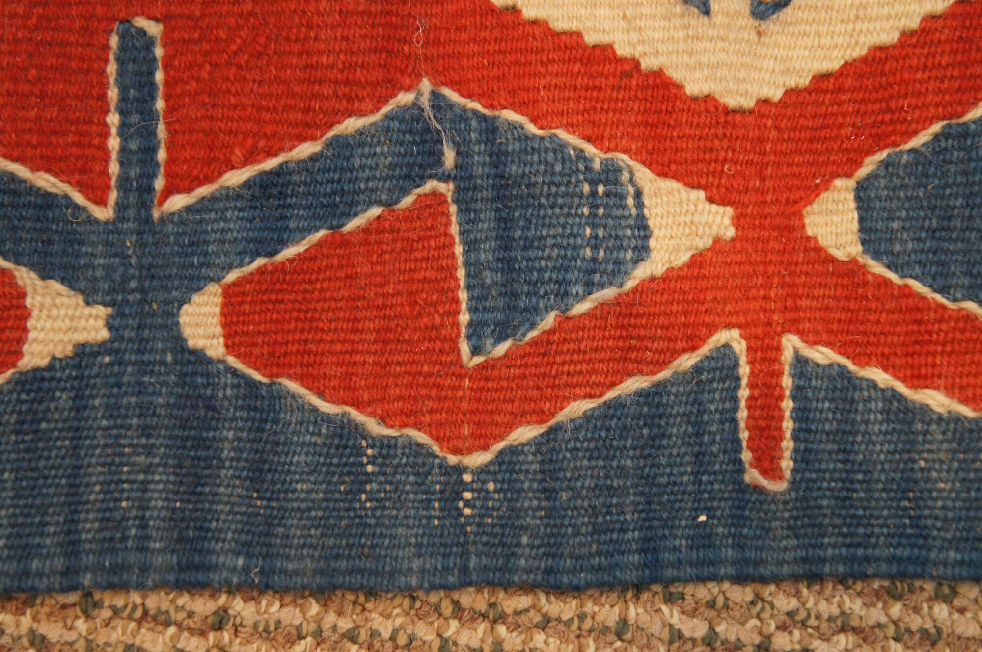 Weavers pack the weft tightly to completely cover the warp and often favor diagonal patterns so as to avoid weakening the structure of the rug with vertical slits. It produces bold, sharp patterns that weavers enjoy creating with more freedom allowed than a plainweave. This is also why kilims are so closely associated with geometrical designs even though there are are kilims with floral designs as well. This is the most common weaving technique used to create geometric and diagonal patterned kilims. The slit refers to the gap left between two blocks of color. It is created by returning the weft around the last warp in a color area, and the weft of the adjacent color is later returned around the adjacent warp. Weavers pack the weft tightly to completely cover the warp and often favor diagonal patterns so as to avoid weakening the structure of the rug with vertical slits. They work on one color block before moving onto the next. It produces bold, sharp patterns that weavers enjoy creating with more freedom allowed than a plainweave. It also results in a smooth kilim that is reversible with the same pattern on both sides in most cases.”