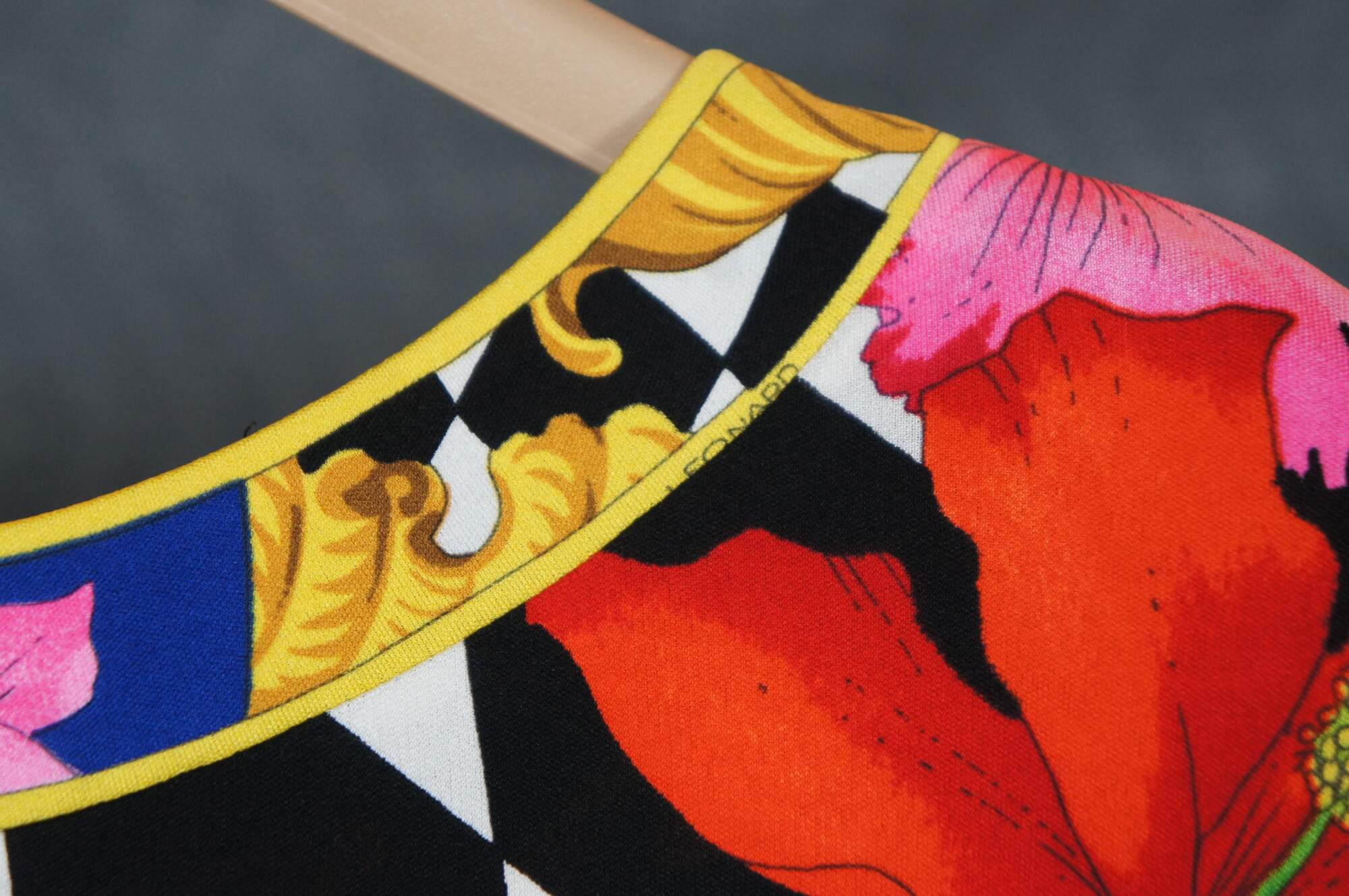 Vintage 1980s Leonard Paris Jersey Mikado silk long sleeve dress featuring a floral design of exotic flowers / foliage, checkerboard and golden foilate. Partial zip closure at back.