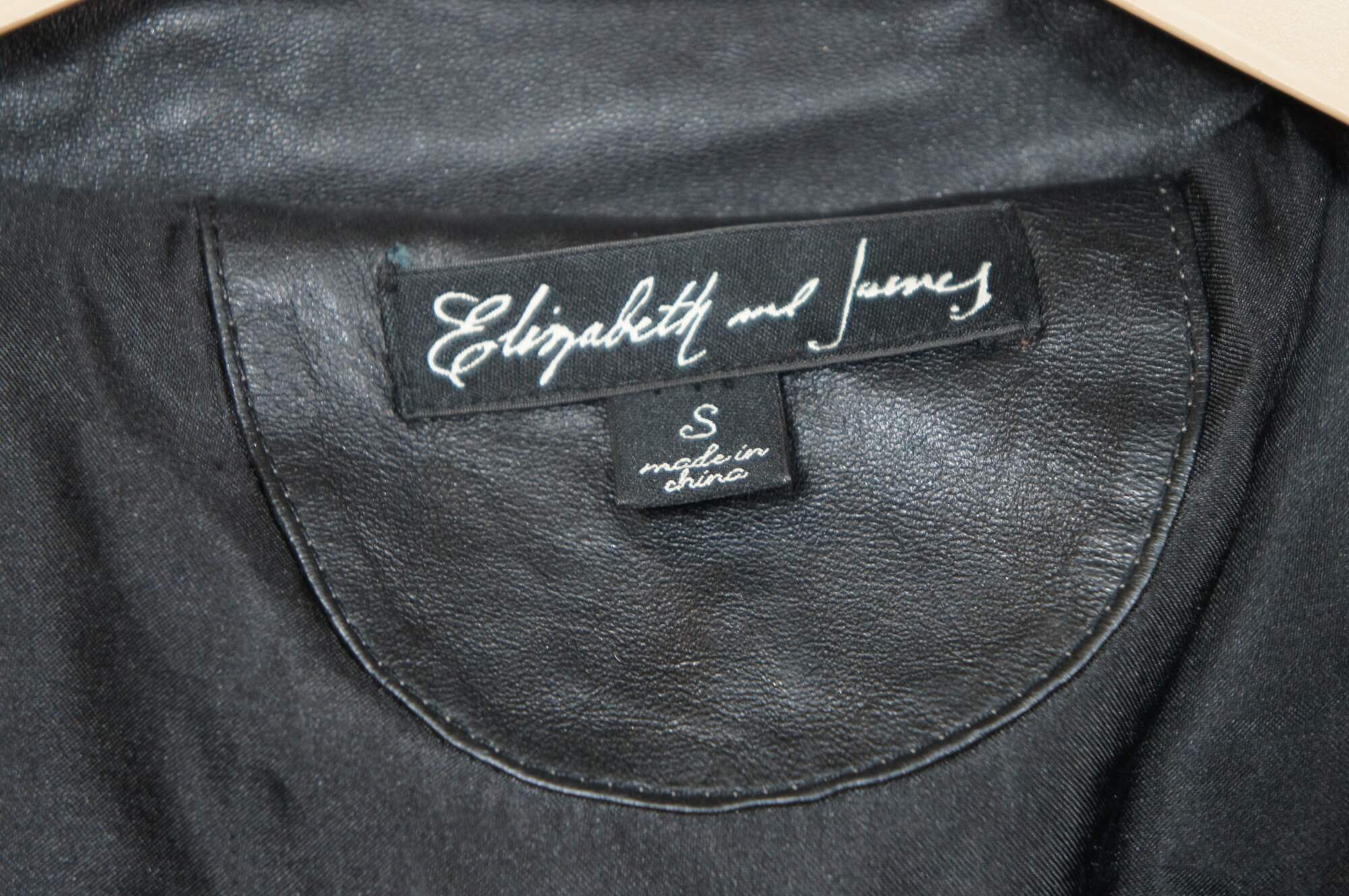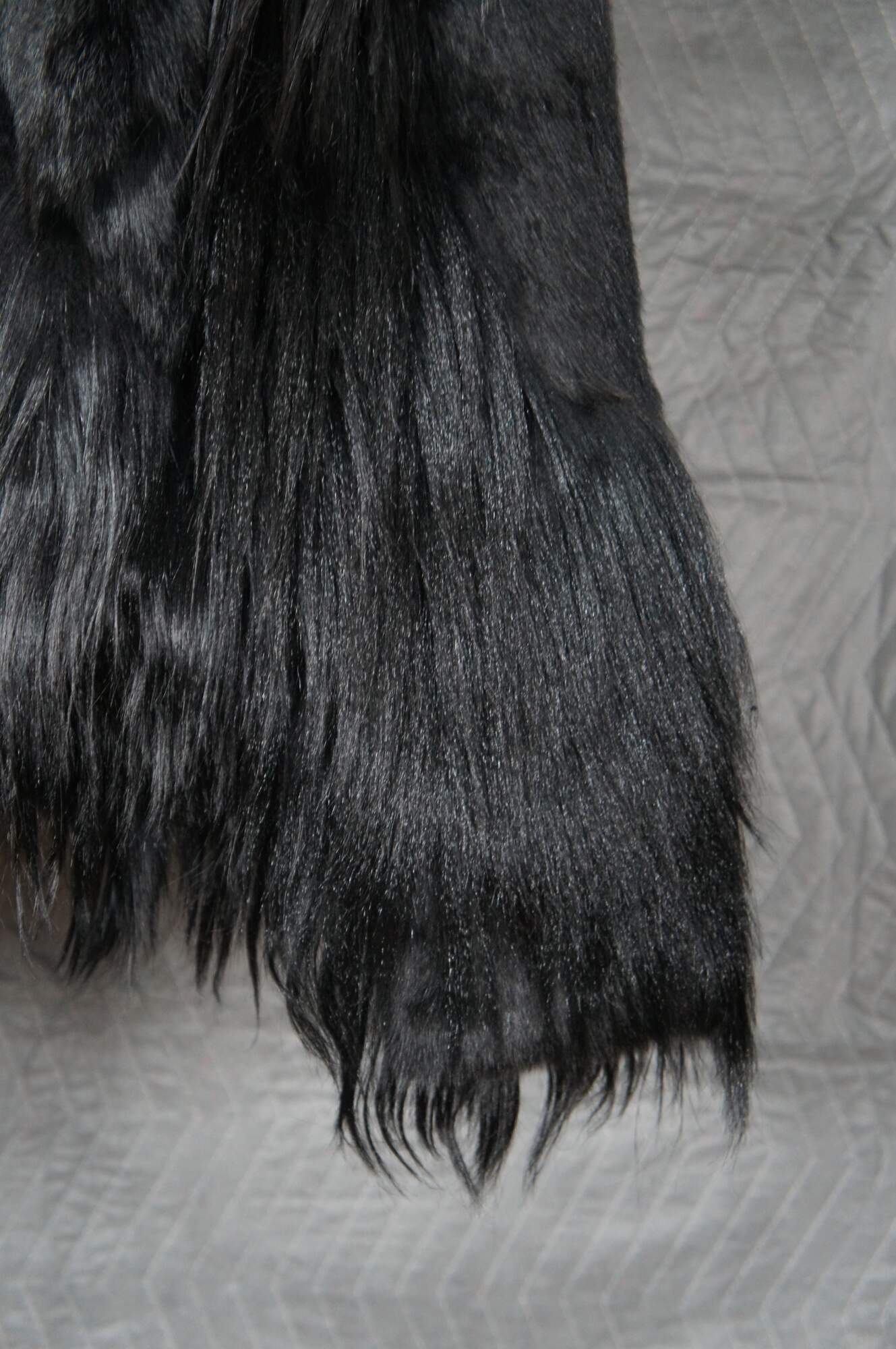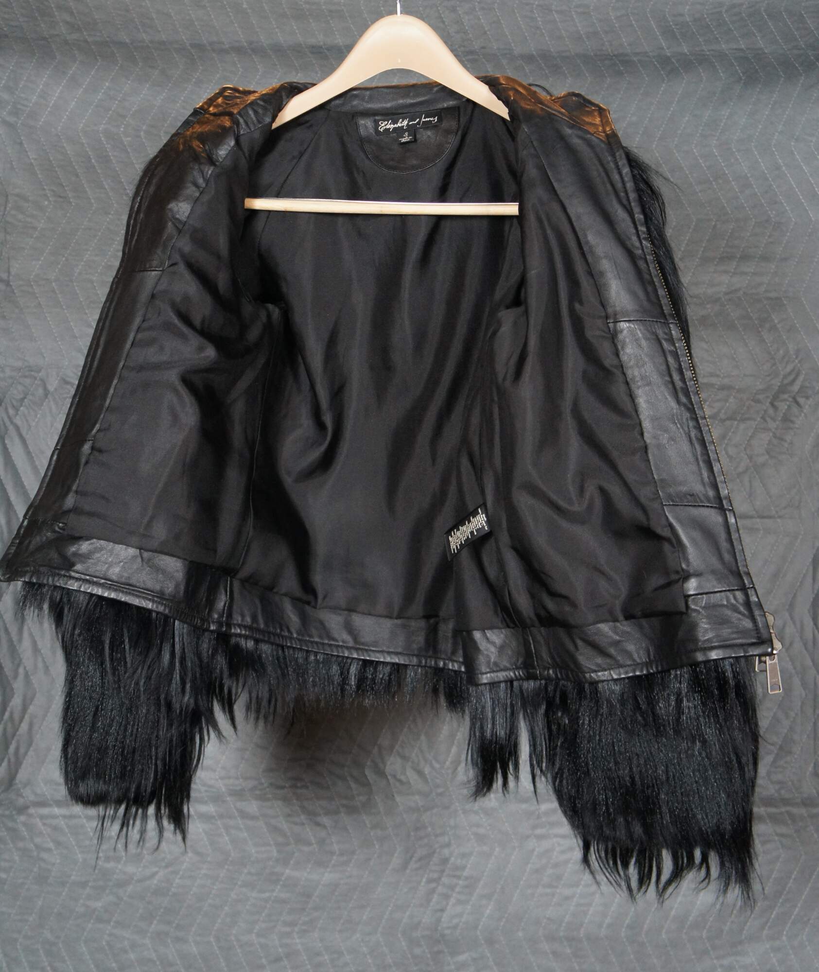 Stunning Elizabeth and James women’s black fur and leather jacket featuring alternating sections of genuine long haired goat fur, rabbit fur and lamb leather. Full zip closure.