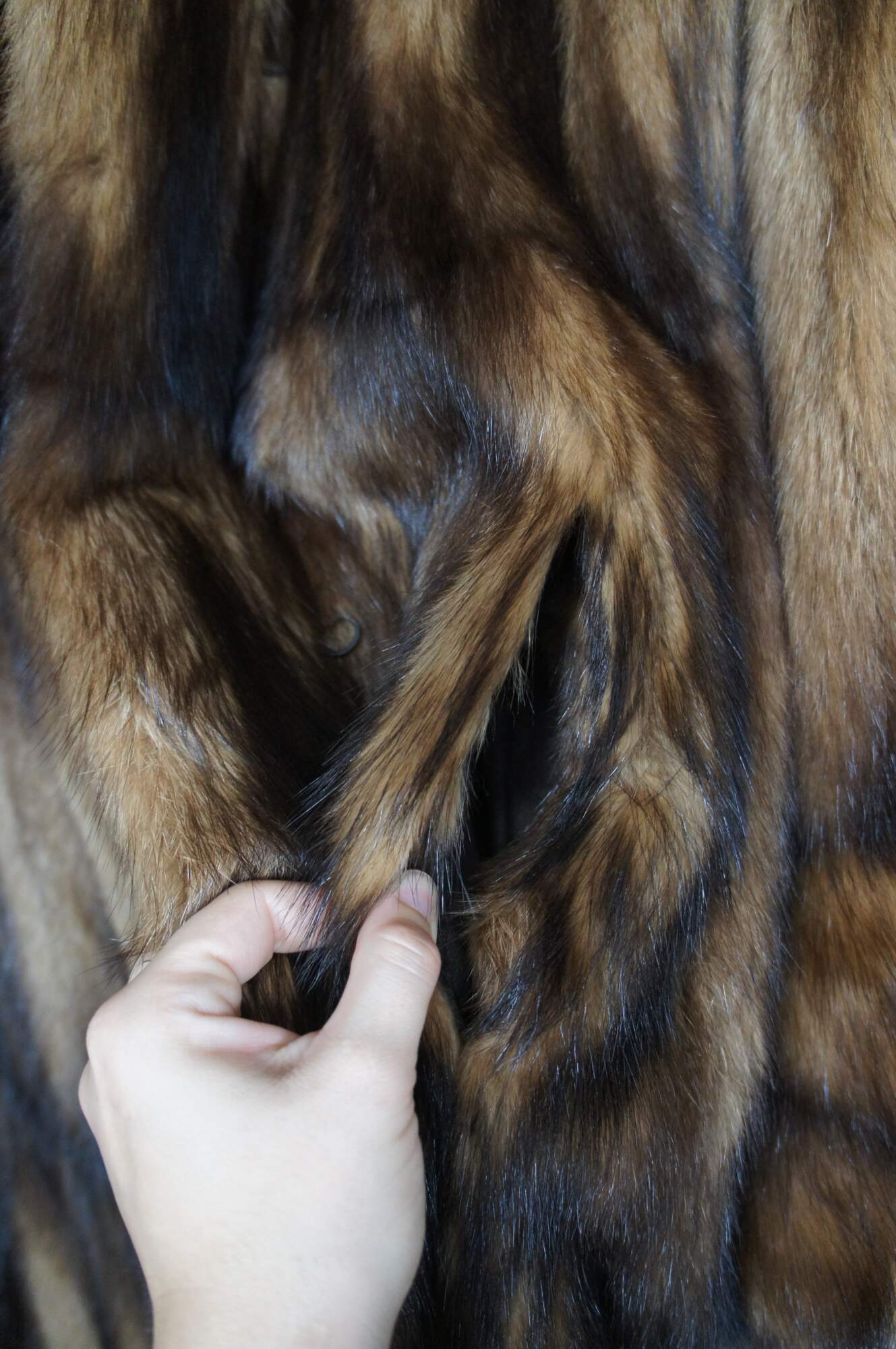 Vintage two tone brown mink fur coat, full length with swivel hook and loop closure and two side pockets. Owner of this coat is approx. 5'2'', 110lbs.