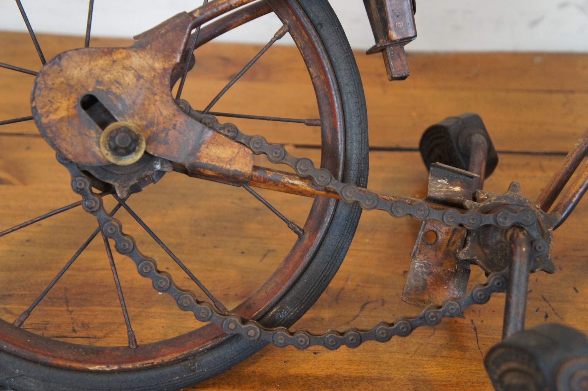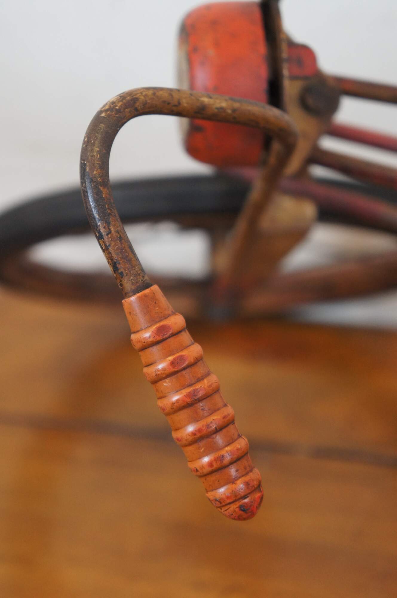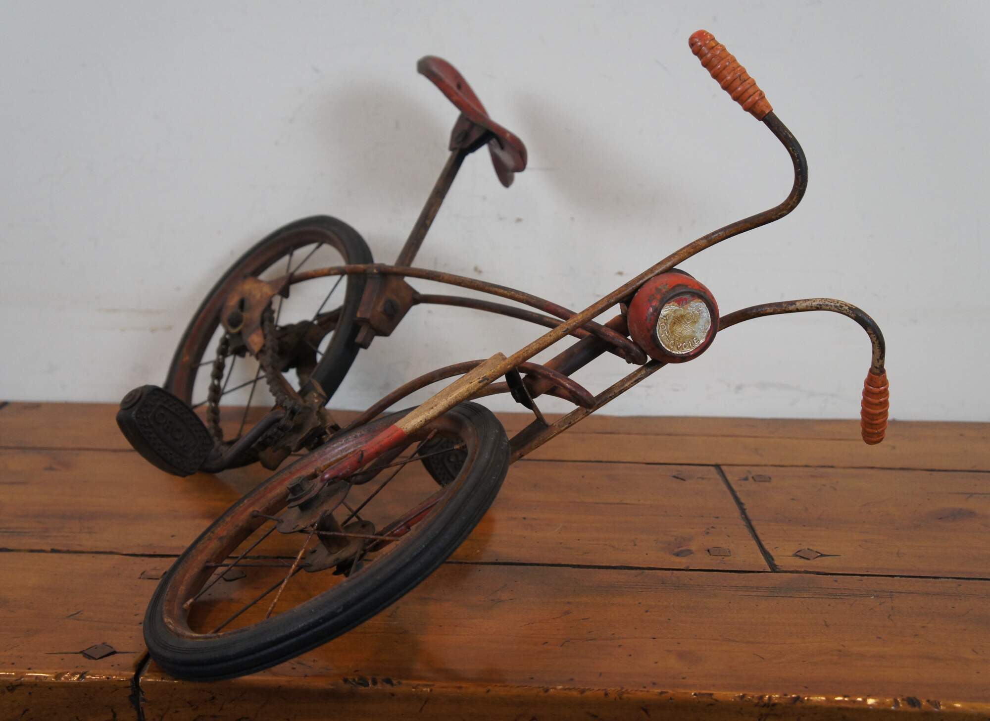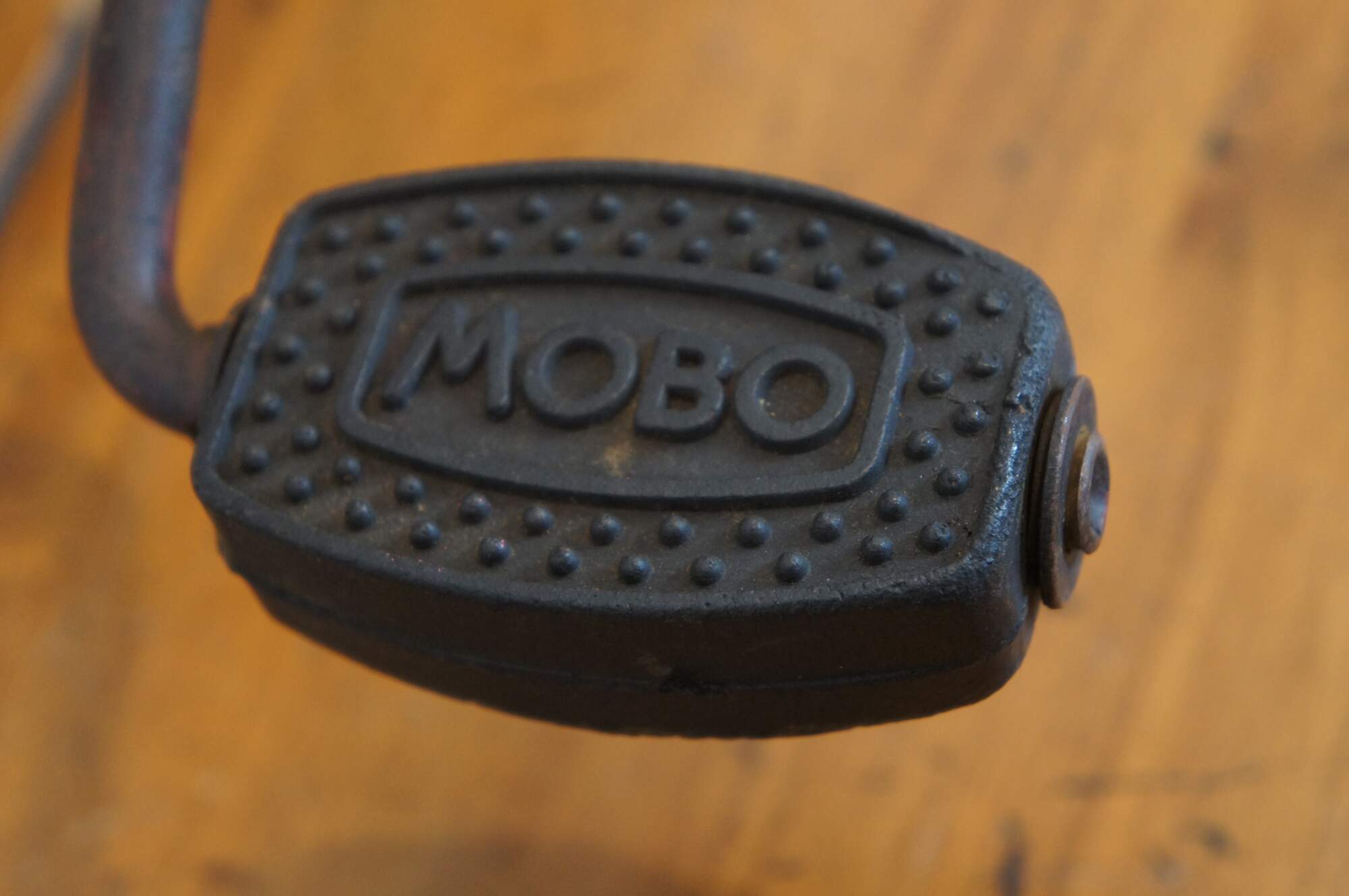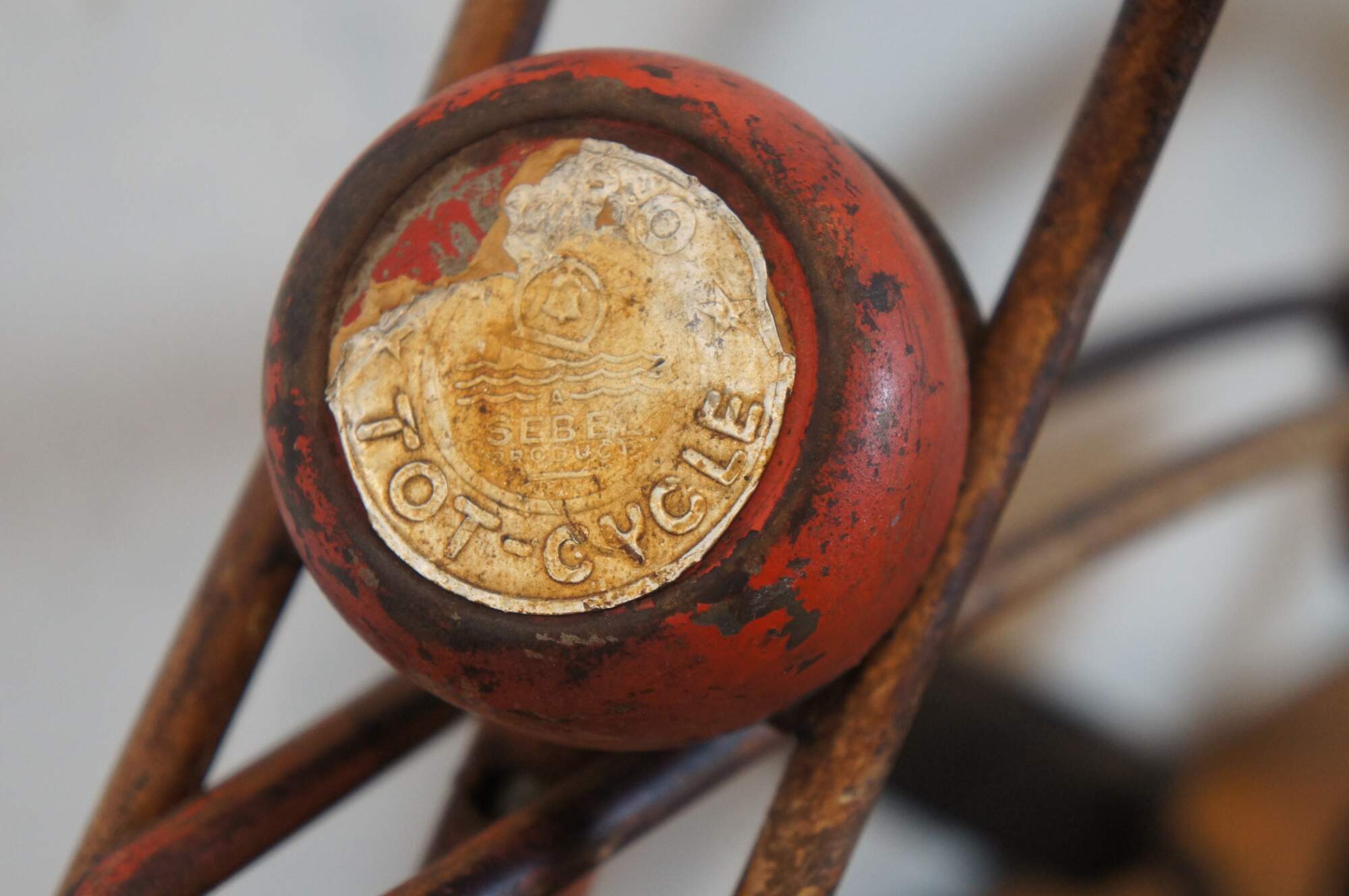 Antique child’s bicycle, the Mobo Tot-Cycle by Sebel Products of England. Features a well worn steel frame with red and white paint job, rubber tires and foot pedals, textured hand grips and metal saddle seat. Circa 1926.