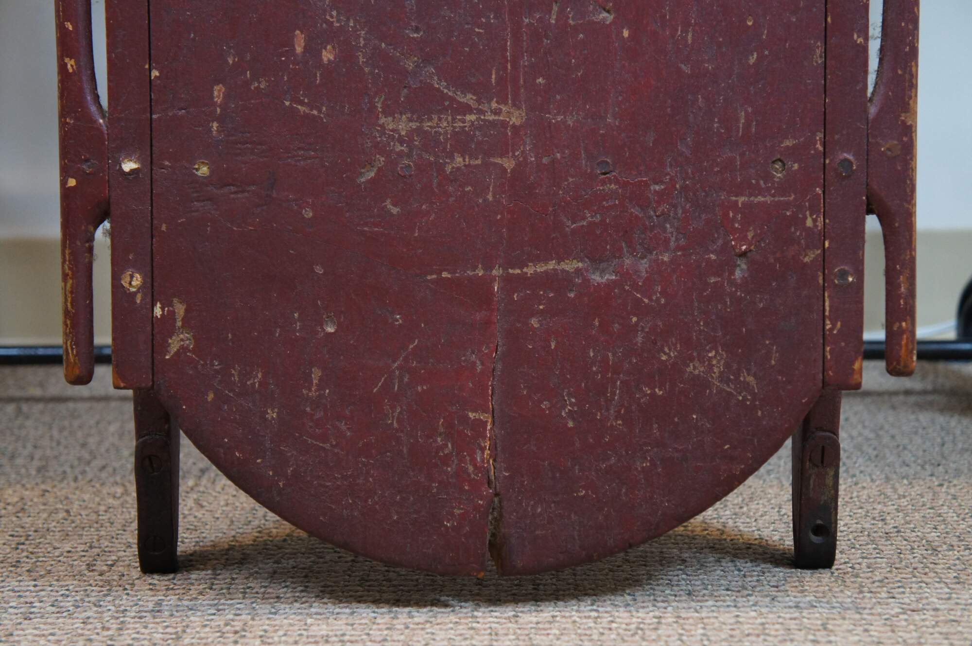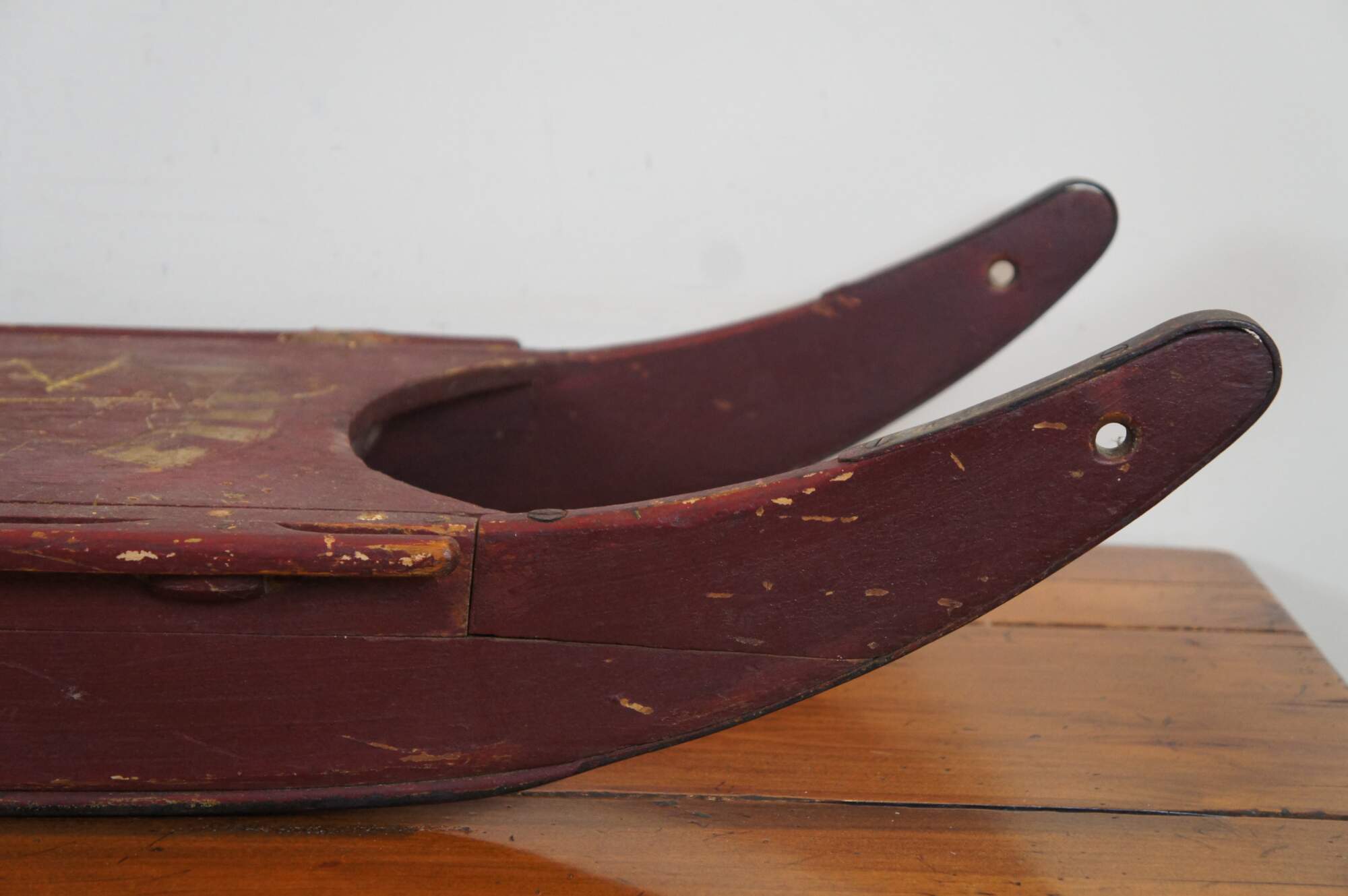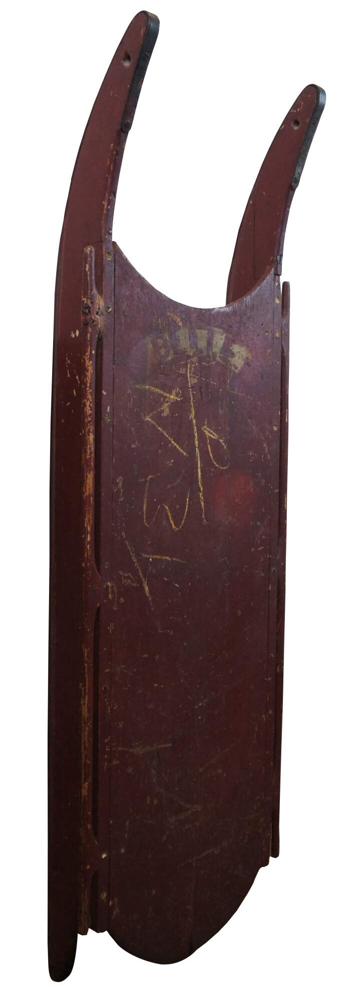 Antique Victorian wooden children’s sled with iron wrapped runners, painted dark red with the word “Belle” picked out in gold.