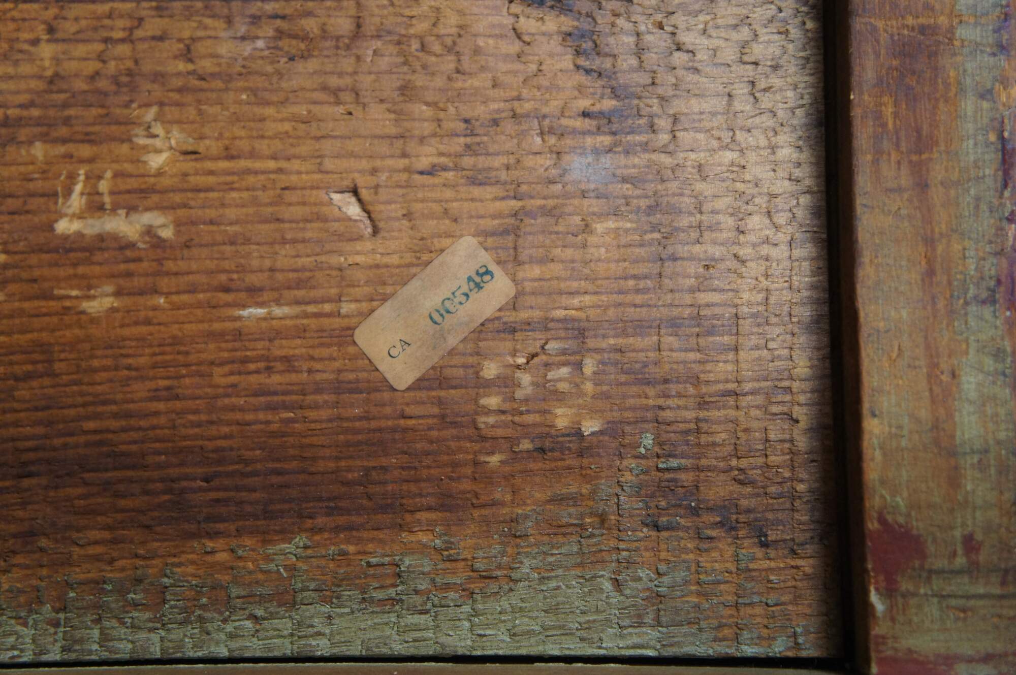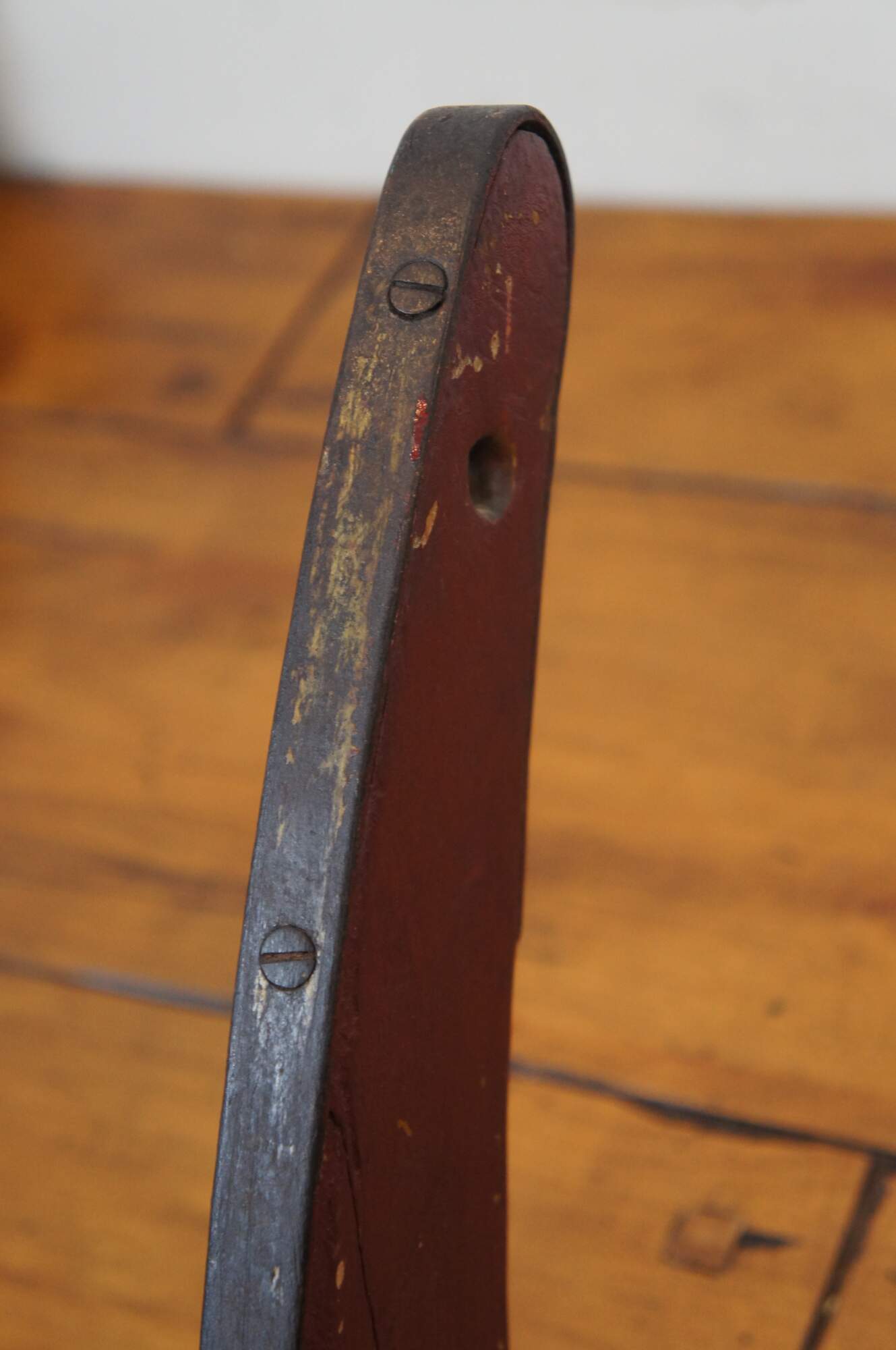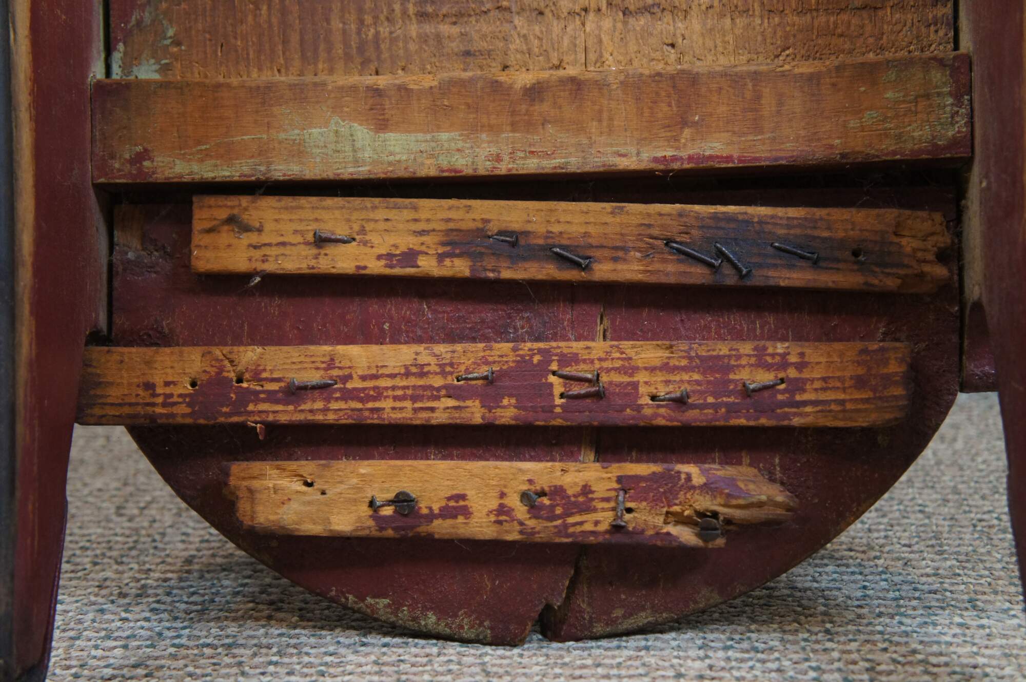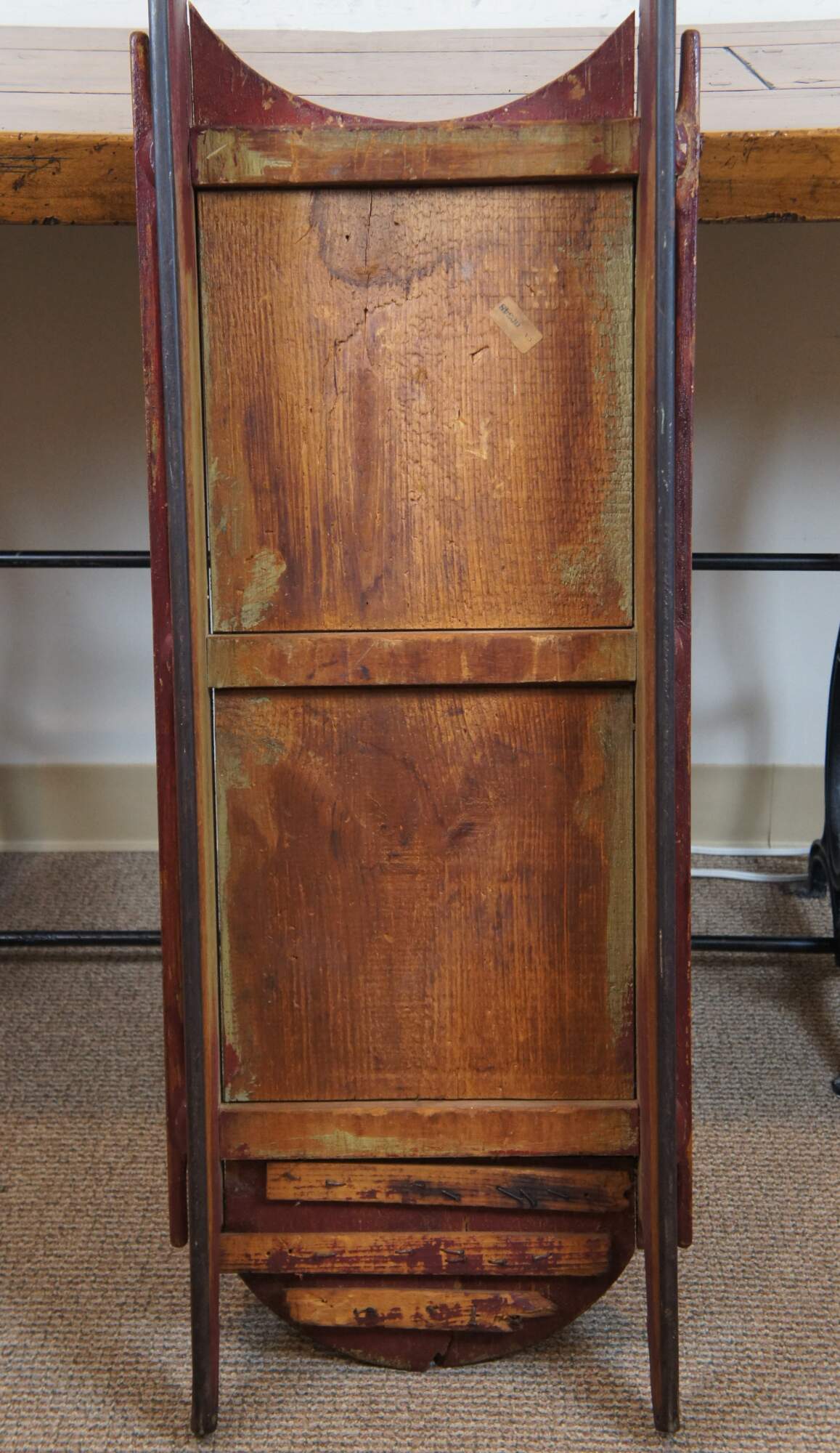 Antique Victorian wooden children’s sled with iron wrapped runners, painted dark red with the word “Belle” picked out in gold.
