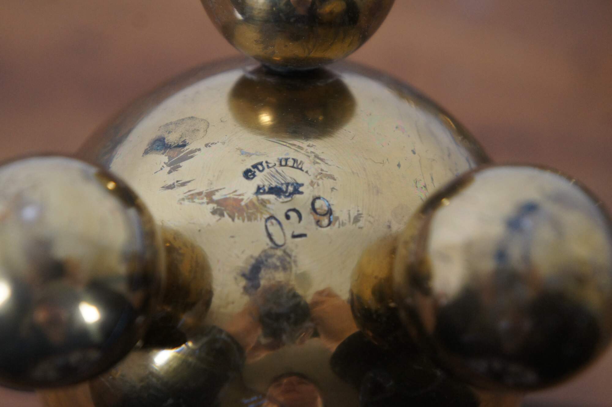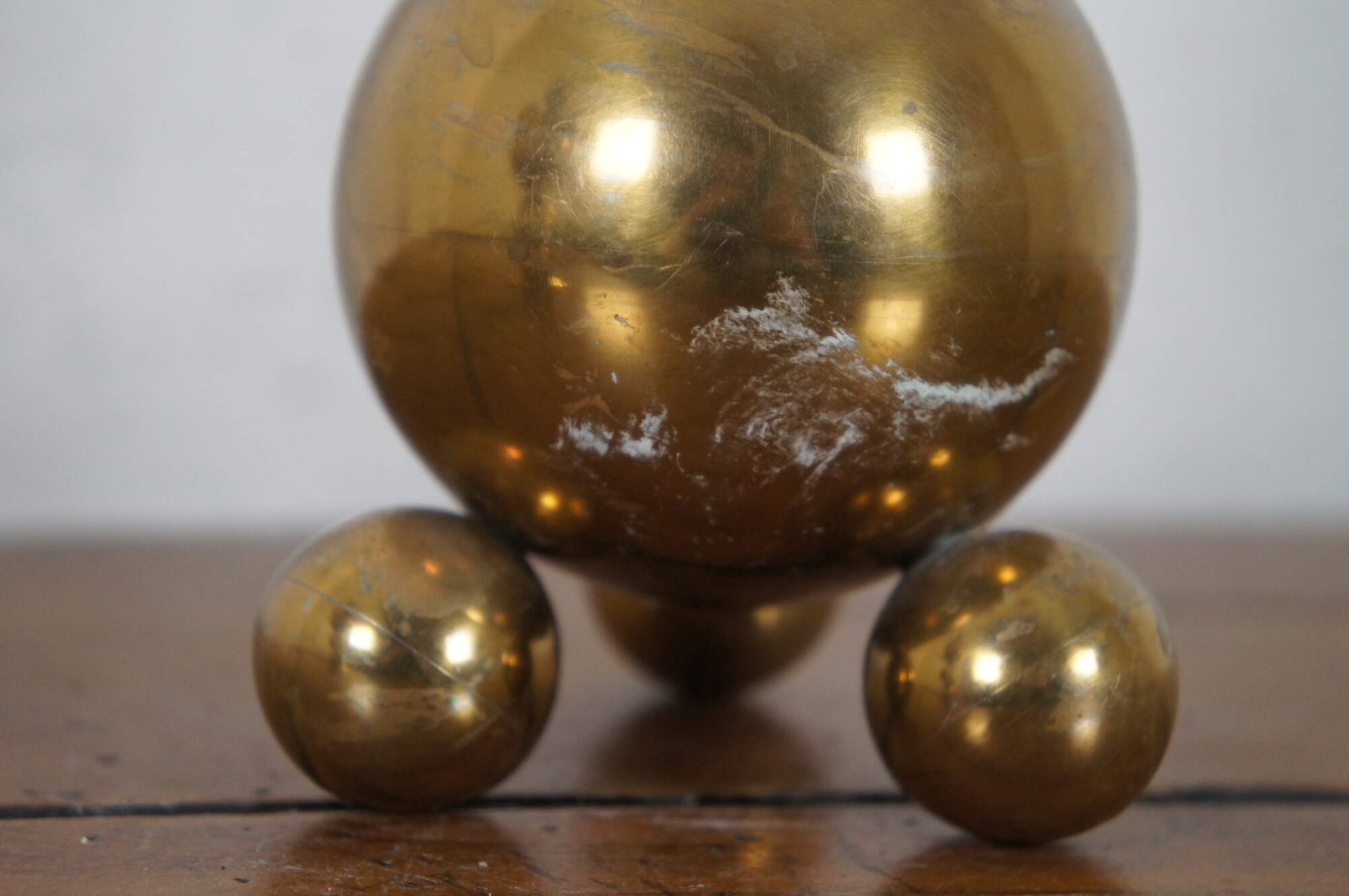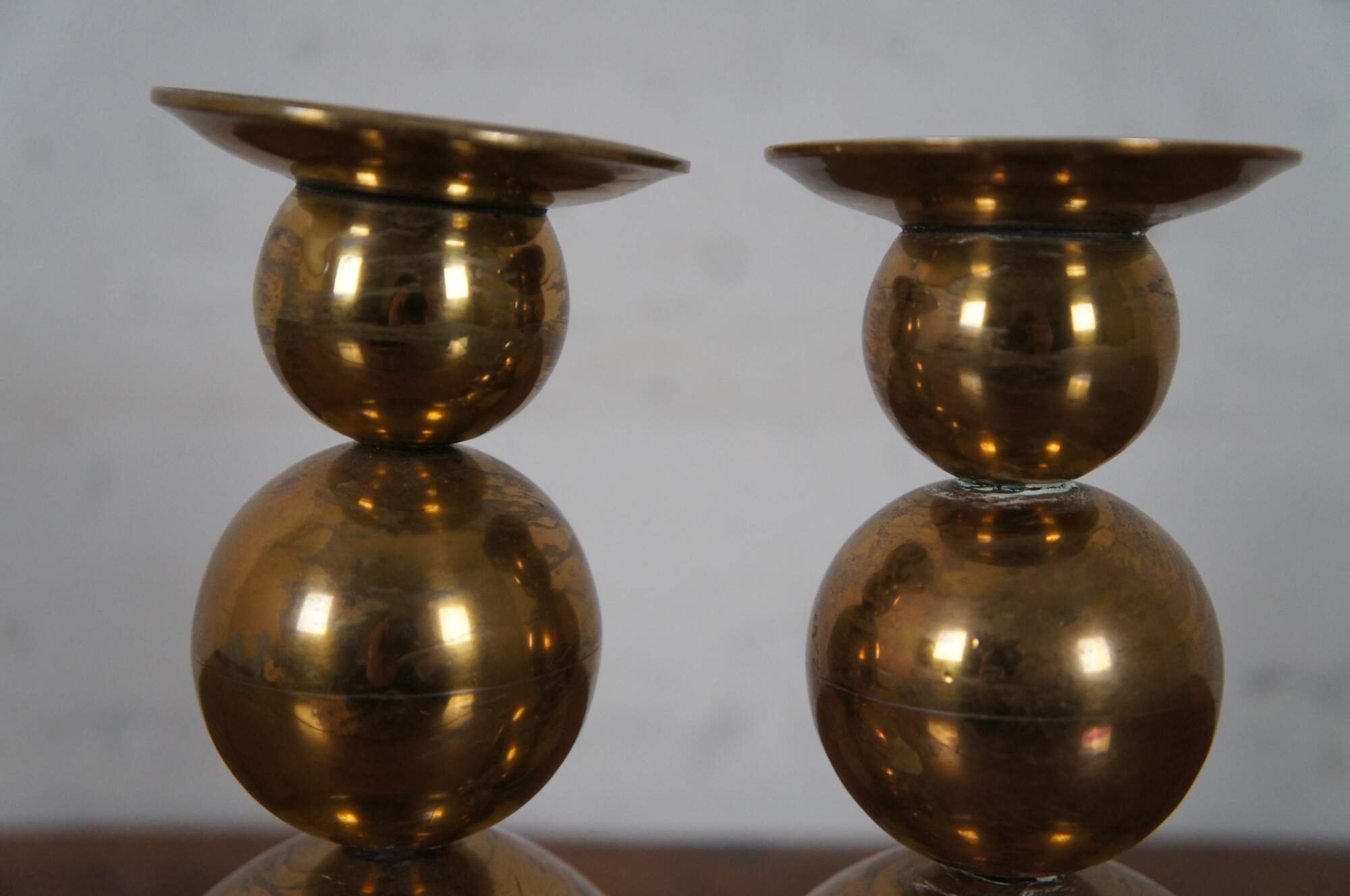 Vintage Modern Swedish Gusums Bruk 029 brass candlesticks, fashioned from three graduated balls stacked on each other, supported by three ball feet. Circa 1980s.