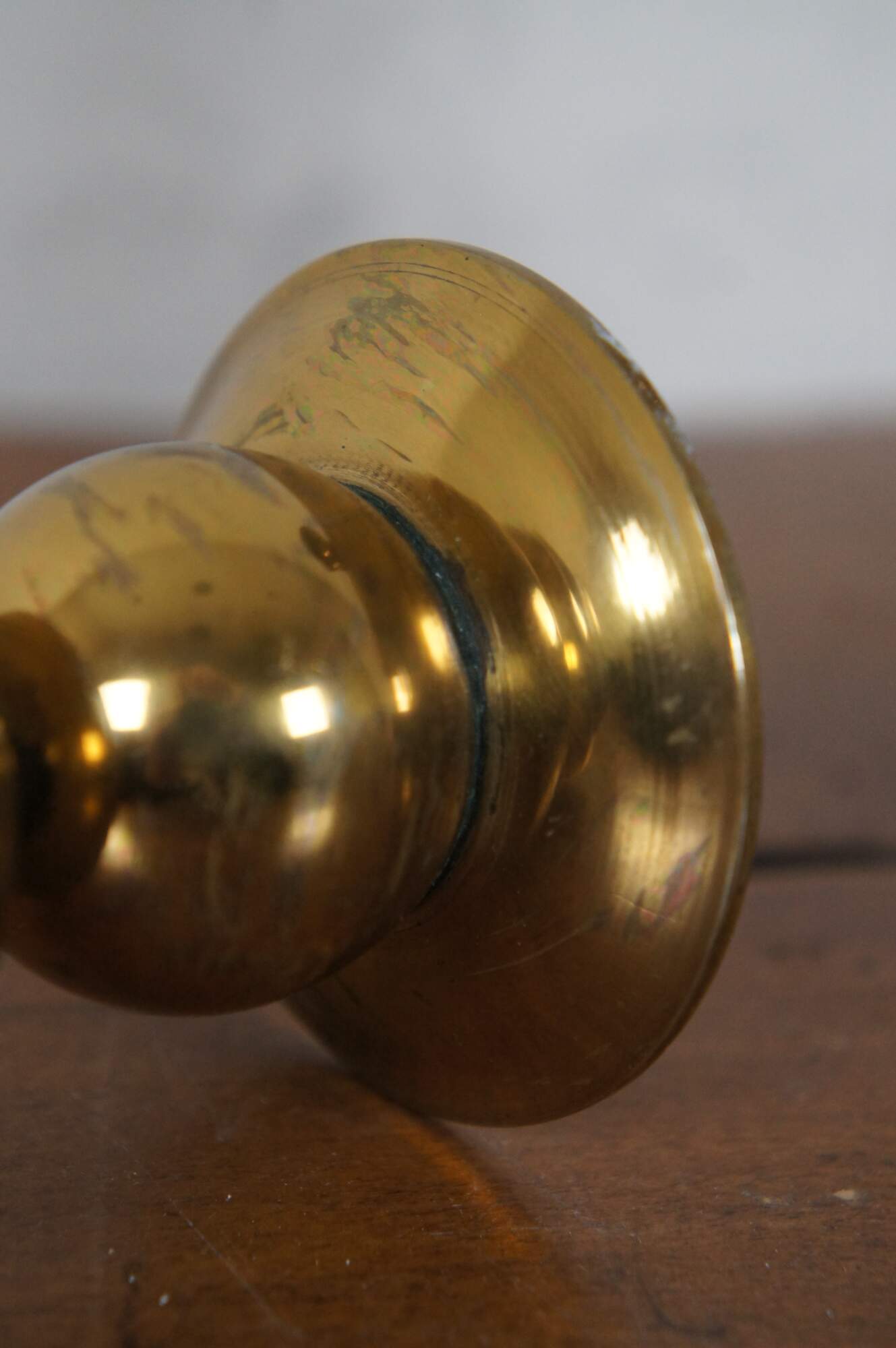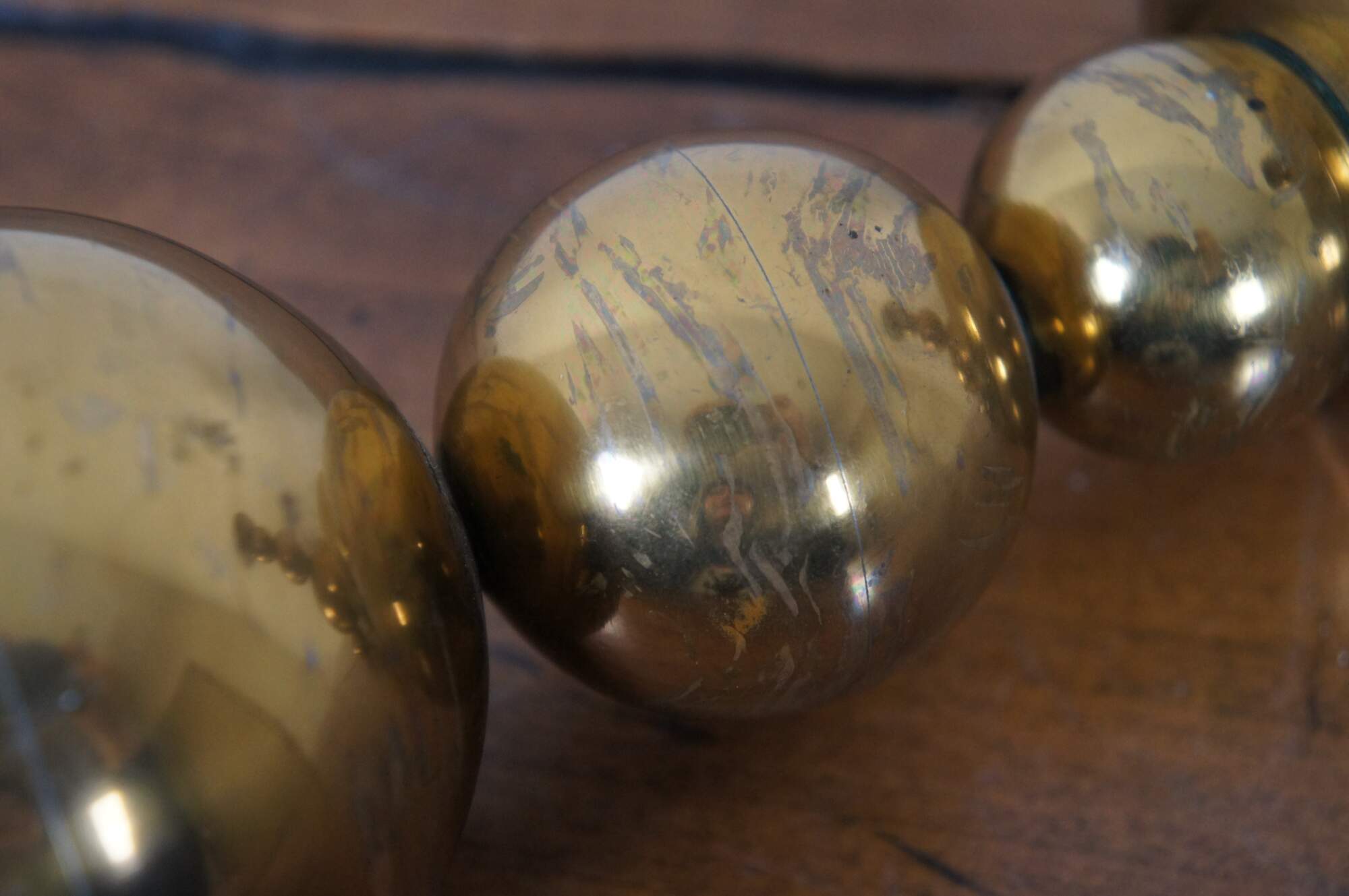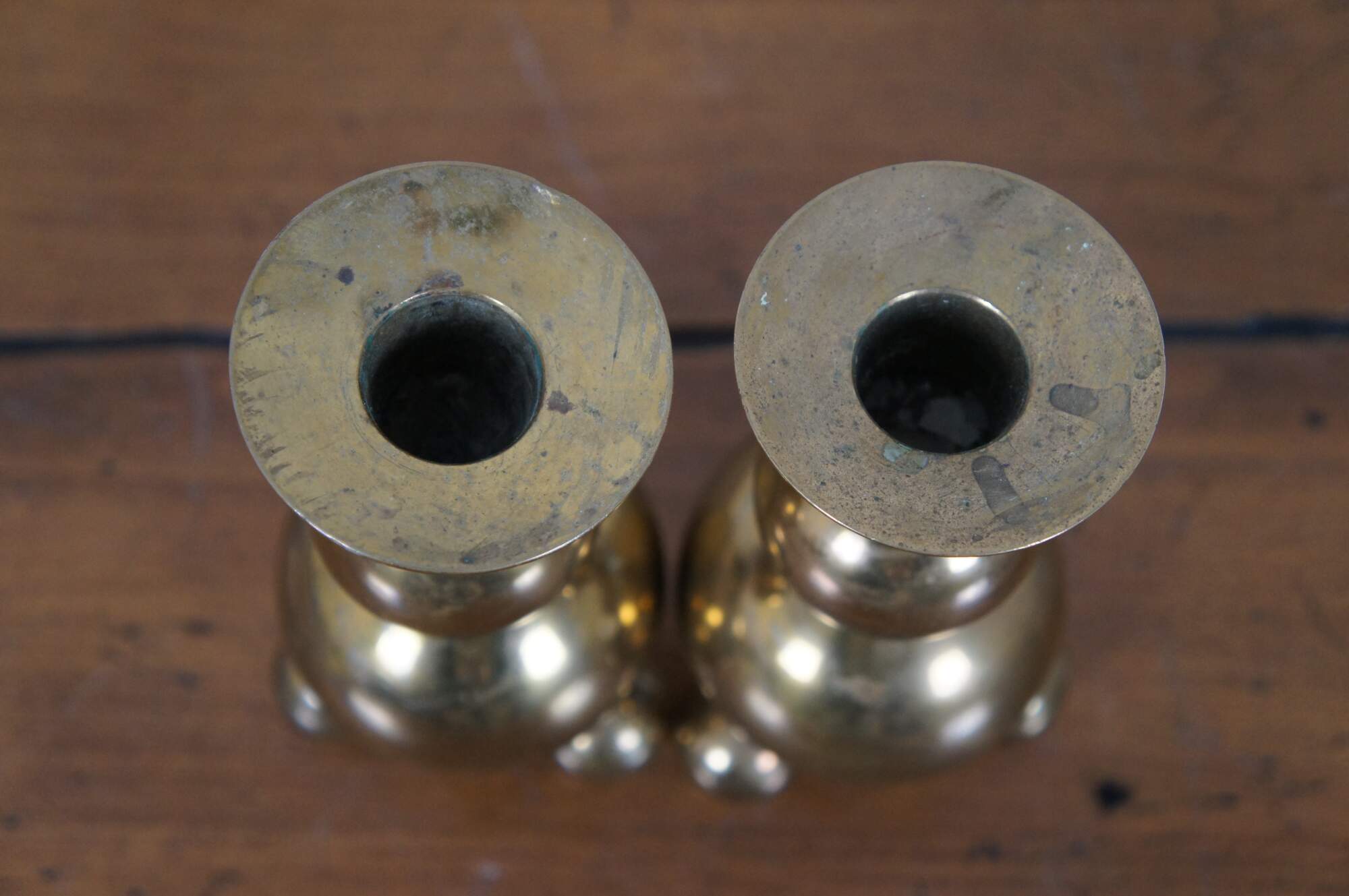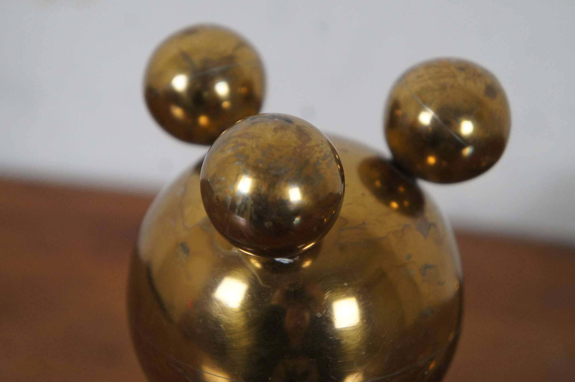 Vintage Modern Swedish Gusums Bruk 029 brass candlesticks, fashioned from three graduated balls stacked on each other, supported by three ball feet. Circa 1980s.