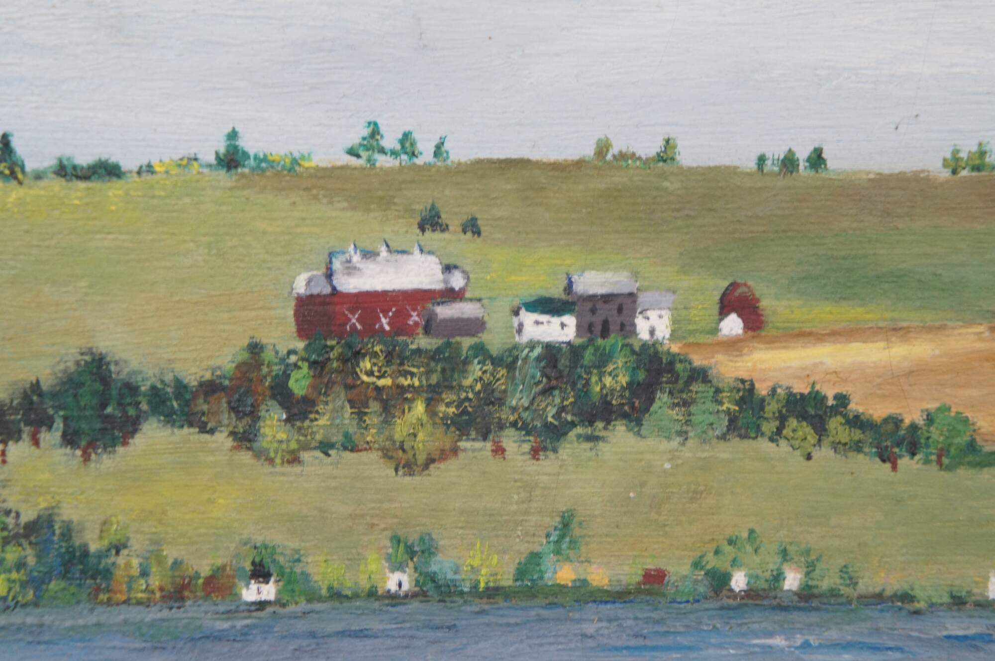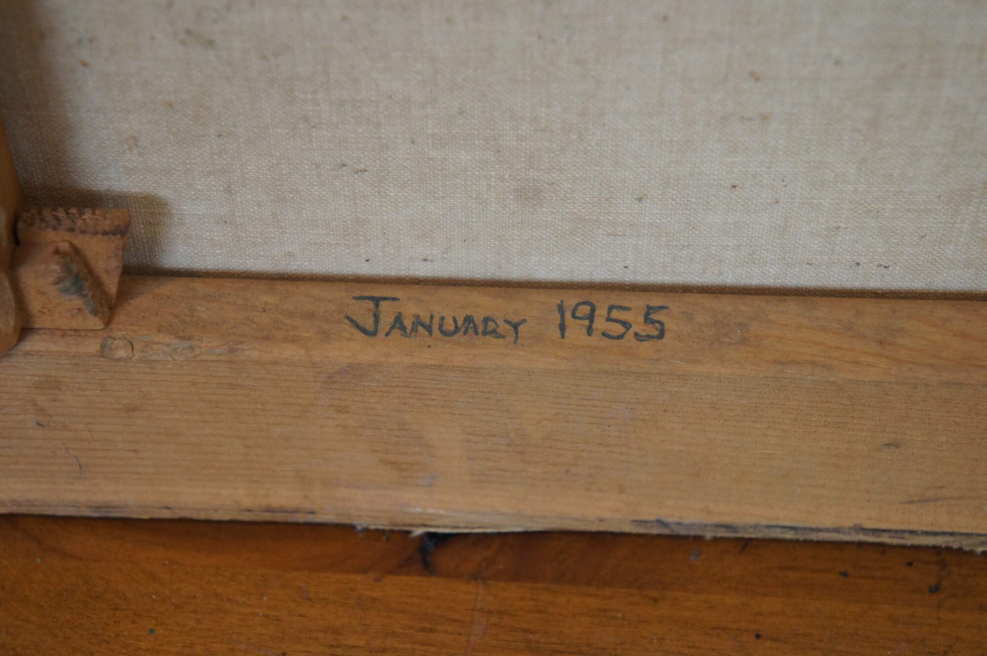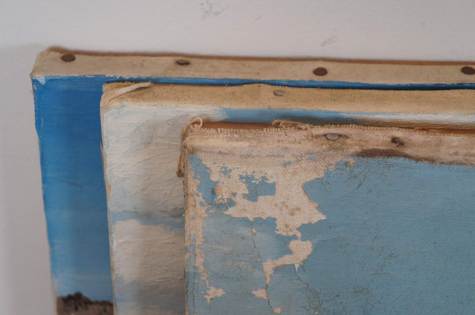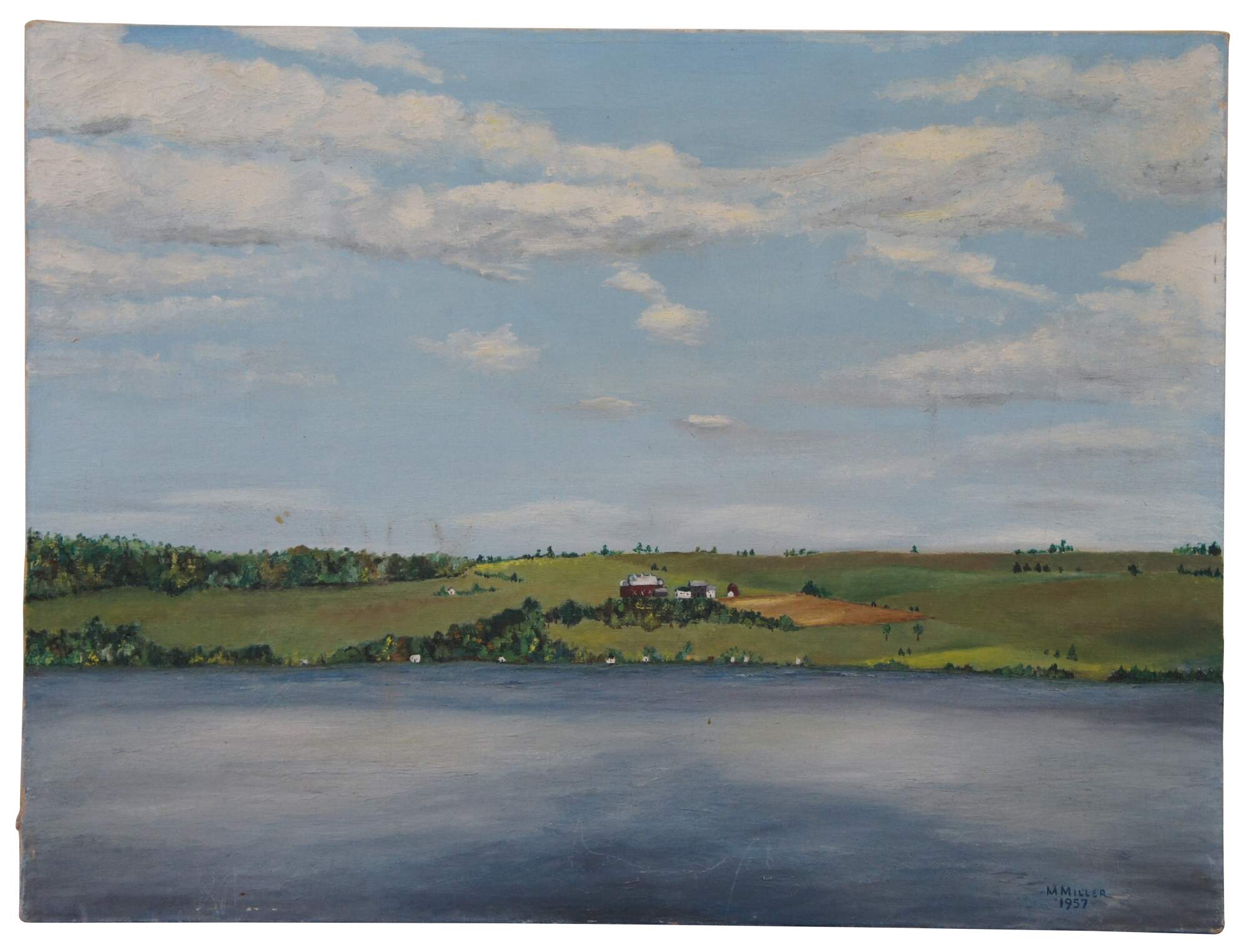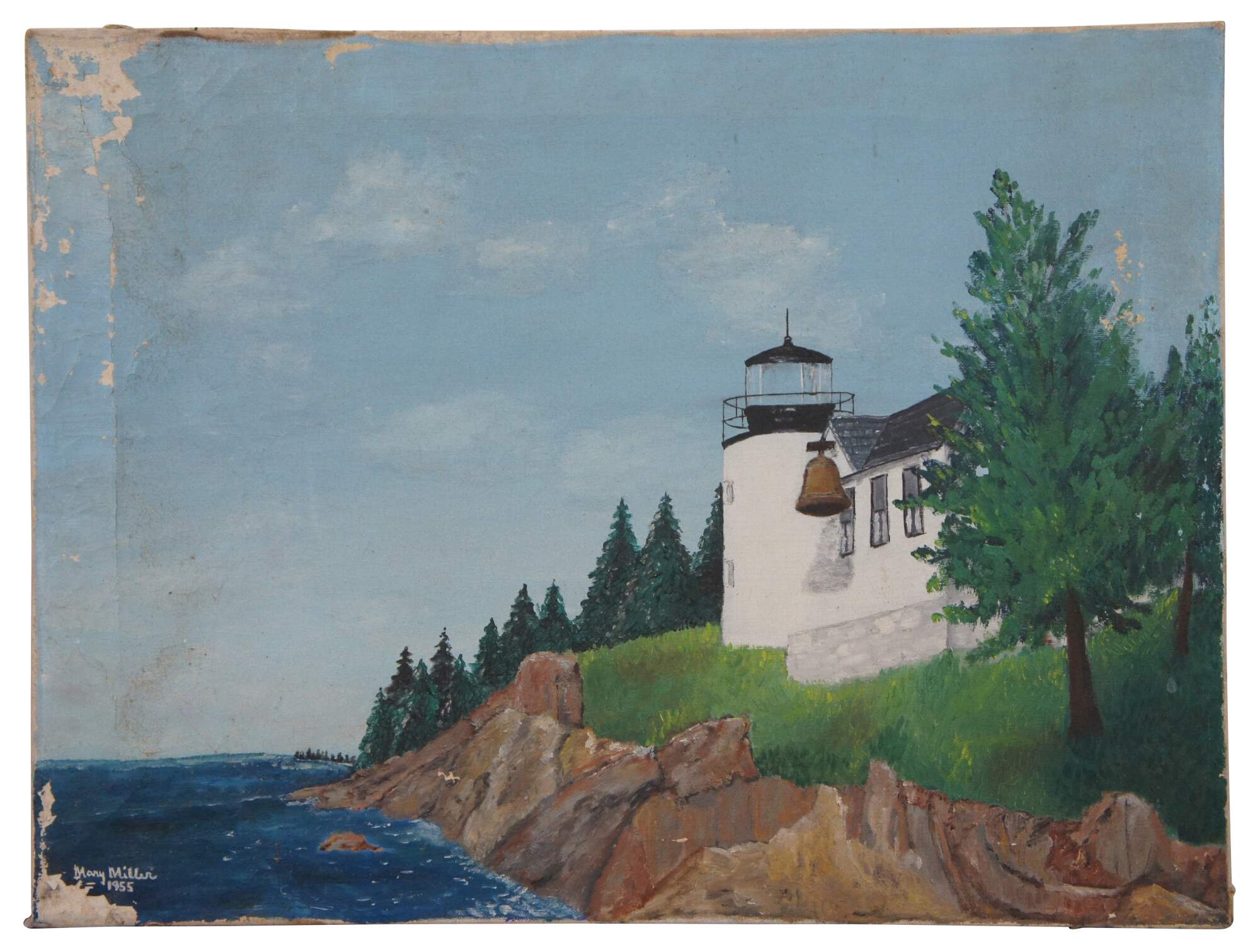 Set of three 1950’s unframed landscape paintings on canvas by Mary Miller featuring landscapes with trees, snowy mountains, cloudy skys, farms / barns, ocean / lakes, and a lighthouse. Dated 1955 and 1957.