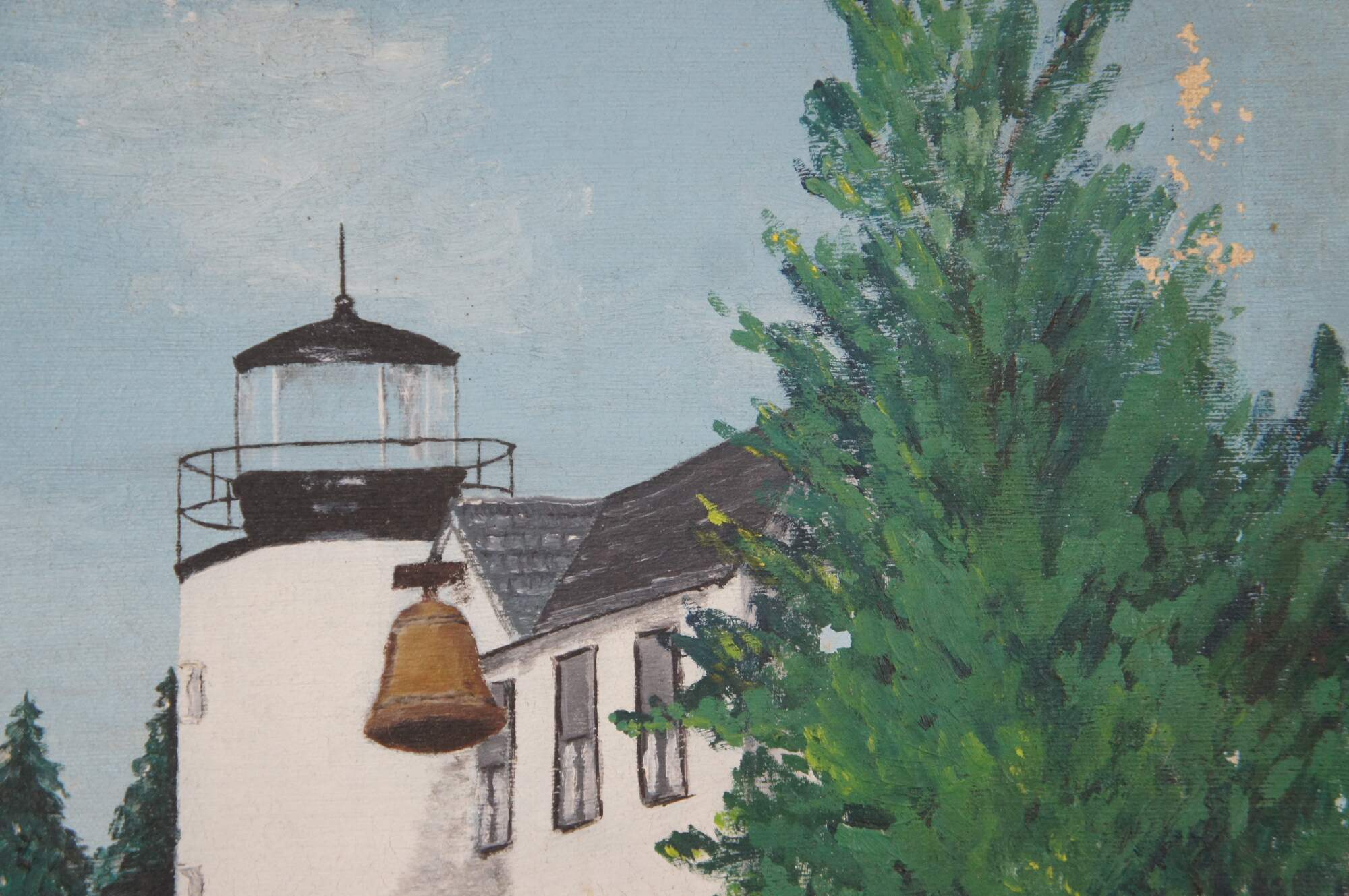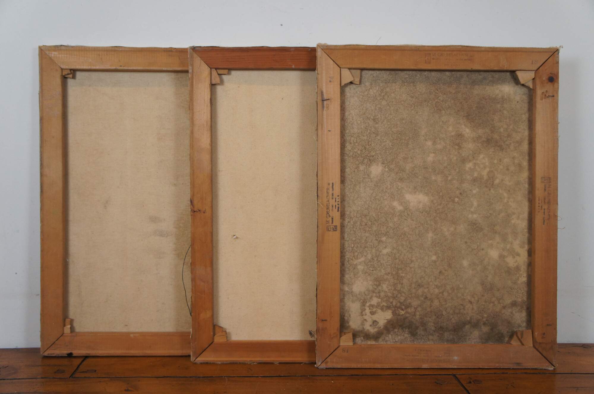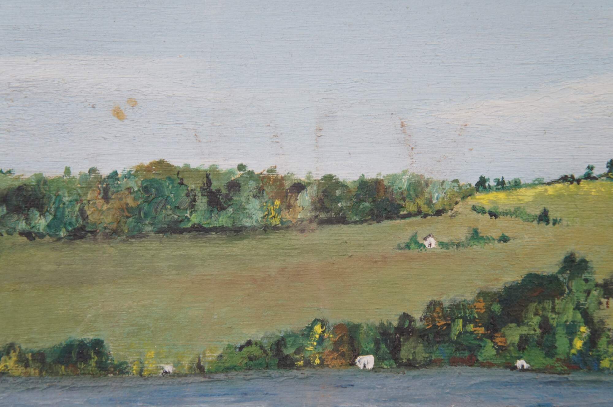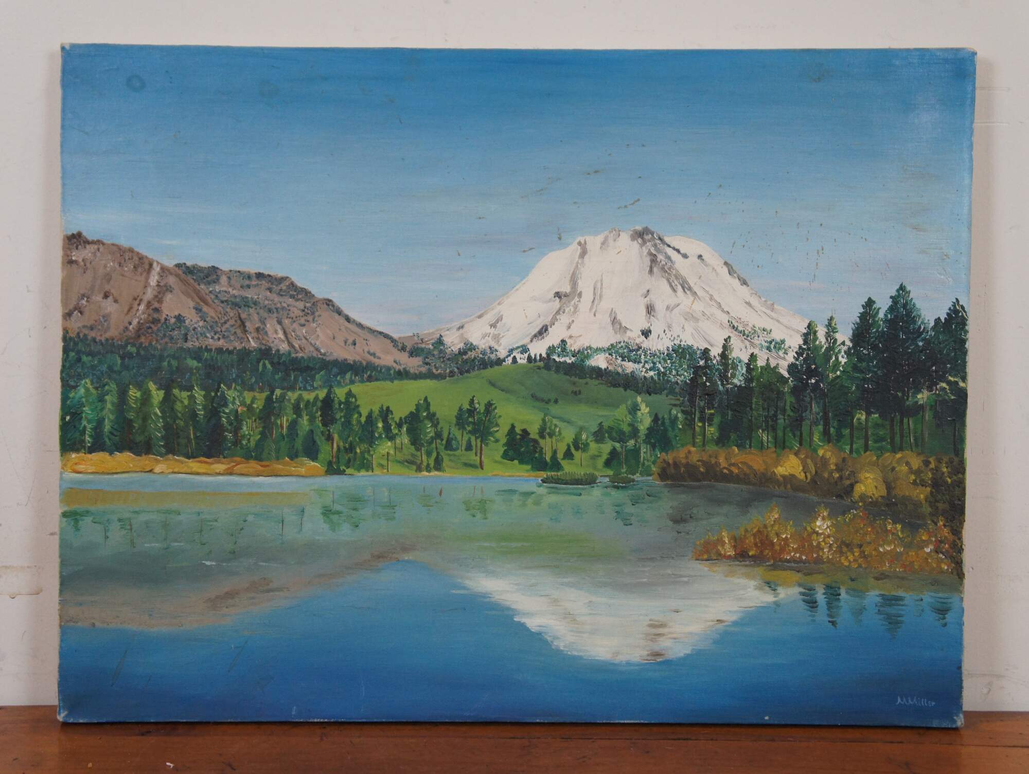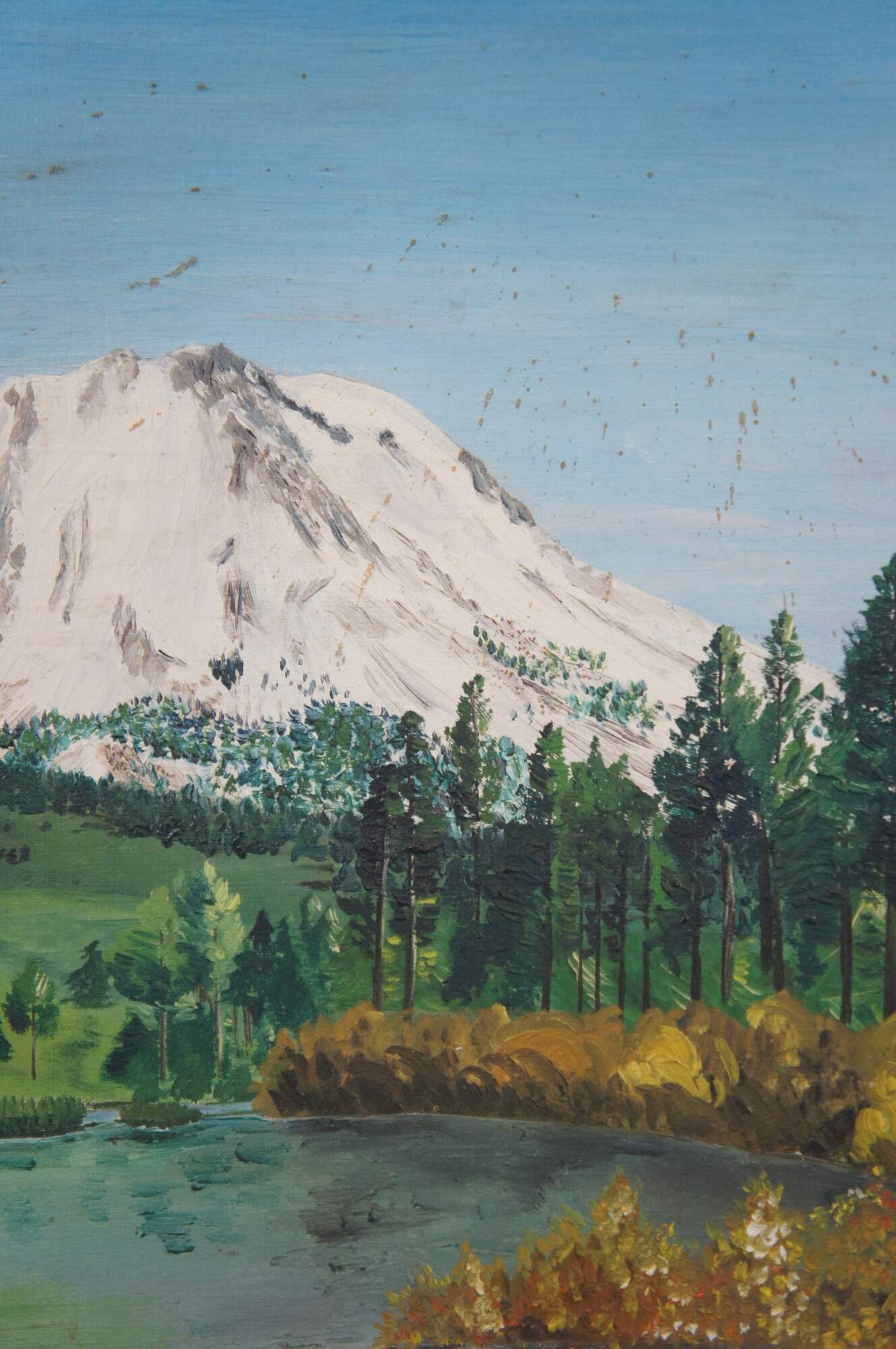 Set of three 1950’s unframed landscape paintings on canvas by Mary Miller featuring landscapes with trees, snowy mountains, cloudy skys, farms / barns, ocean / lakes, and a lighthouse. Dated 1955 and 1957.
