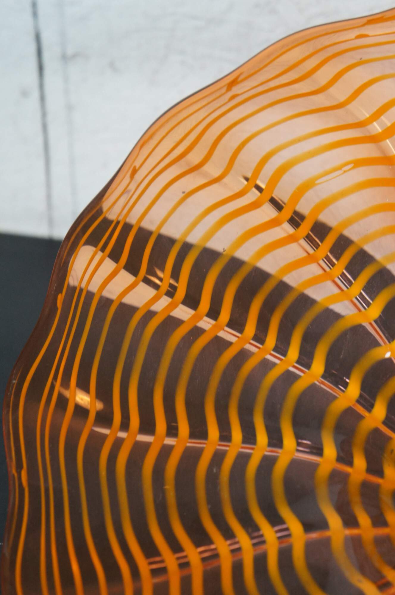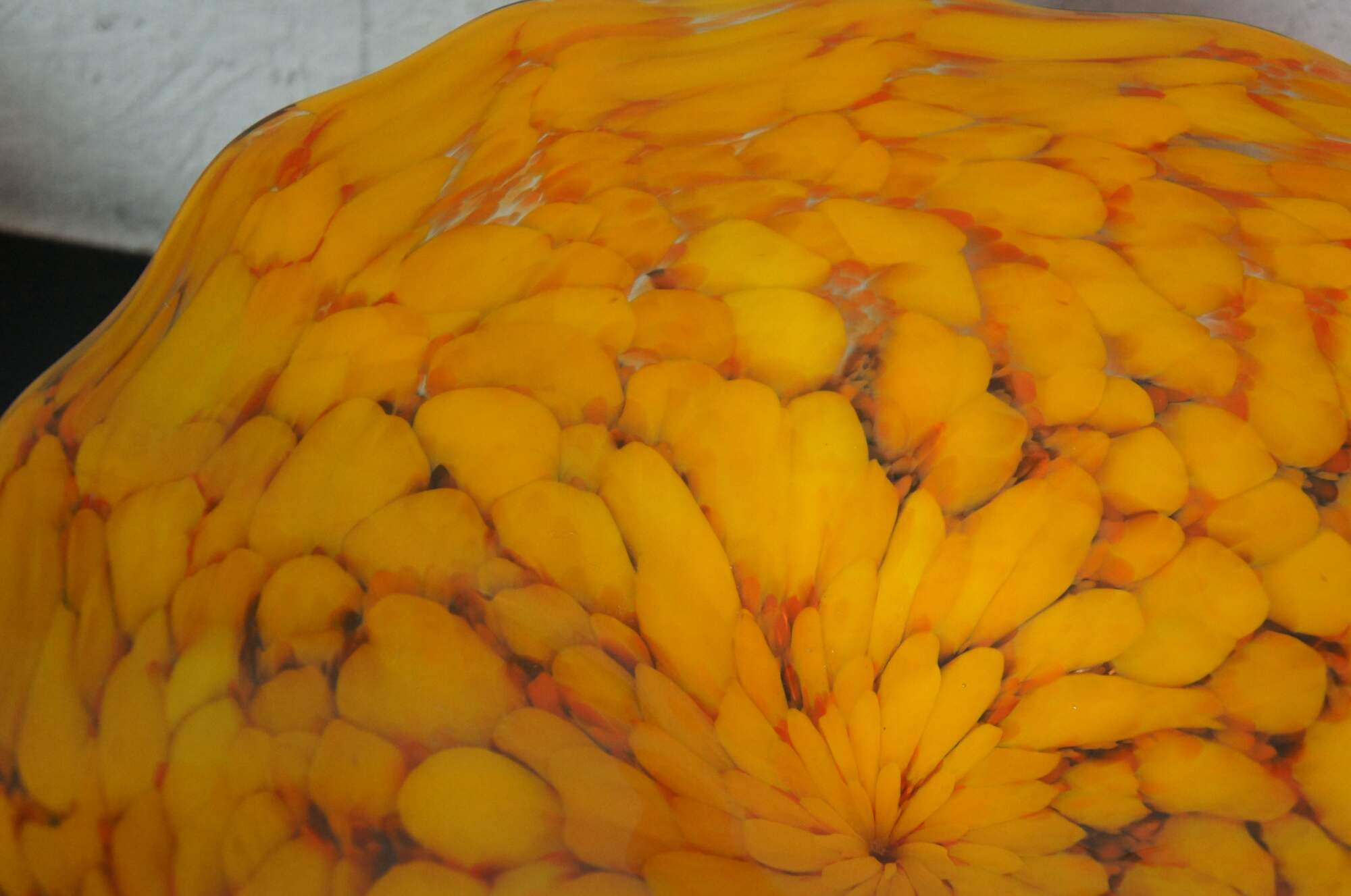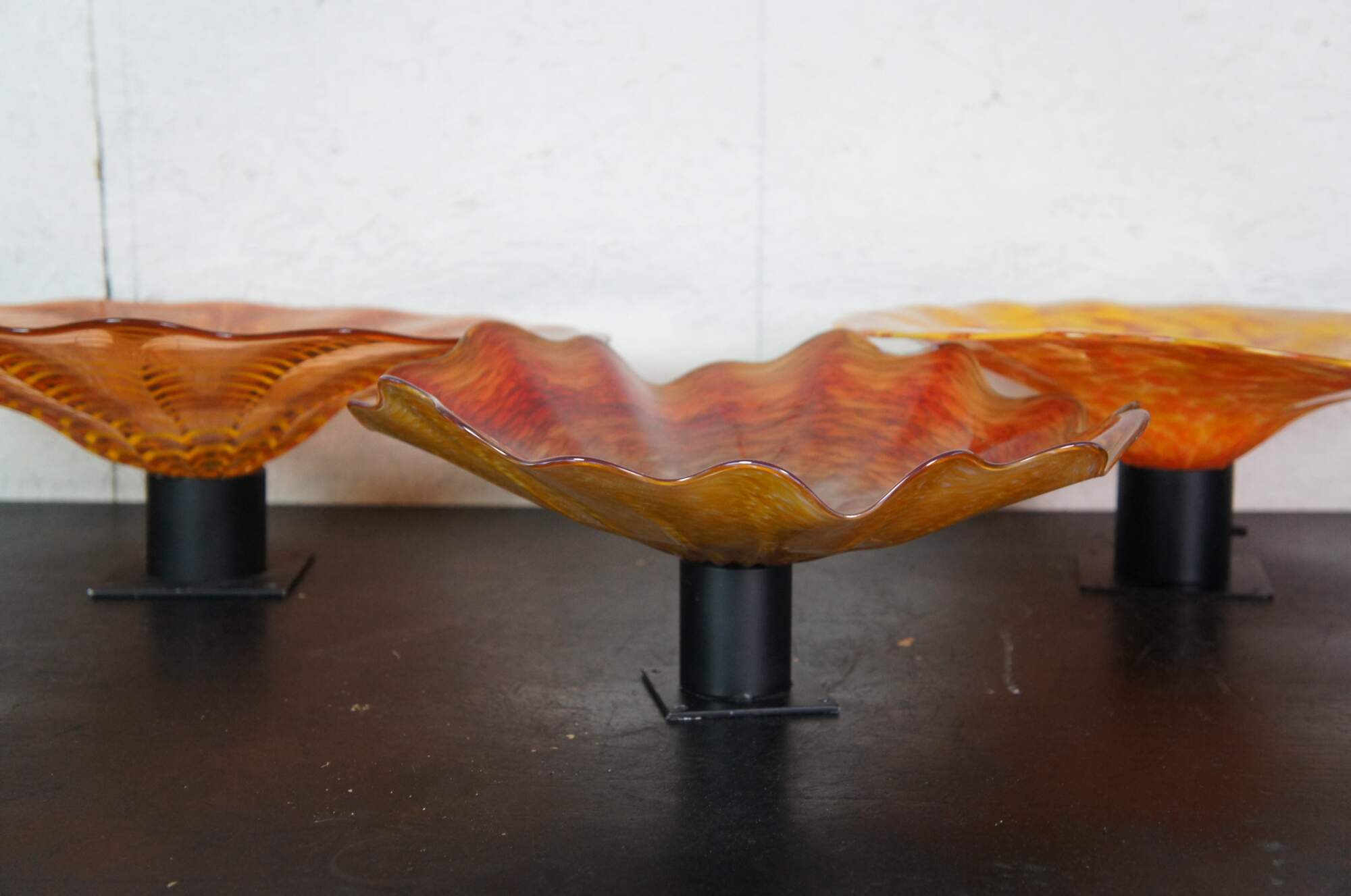 Trio of beautiful hand blown Studio art glass wall hanging plates by Dayton, OH artist Jim DeLange. This trio of ruffle edged sunburst / starburst shaped medallions featuring Chihuly style harmonizing shades of yellow, orange and red in stripes, spots, and swirling ombre. Signed along back edges. Supported for wall hanging by black metal mounting brackets (included).