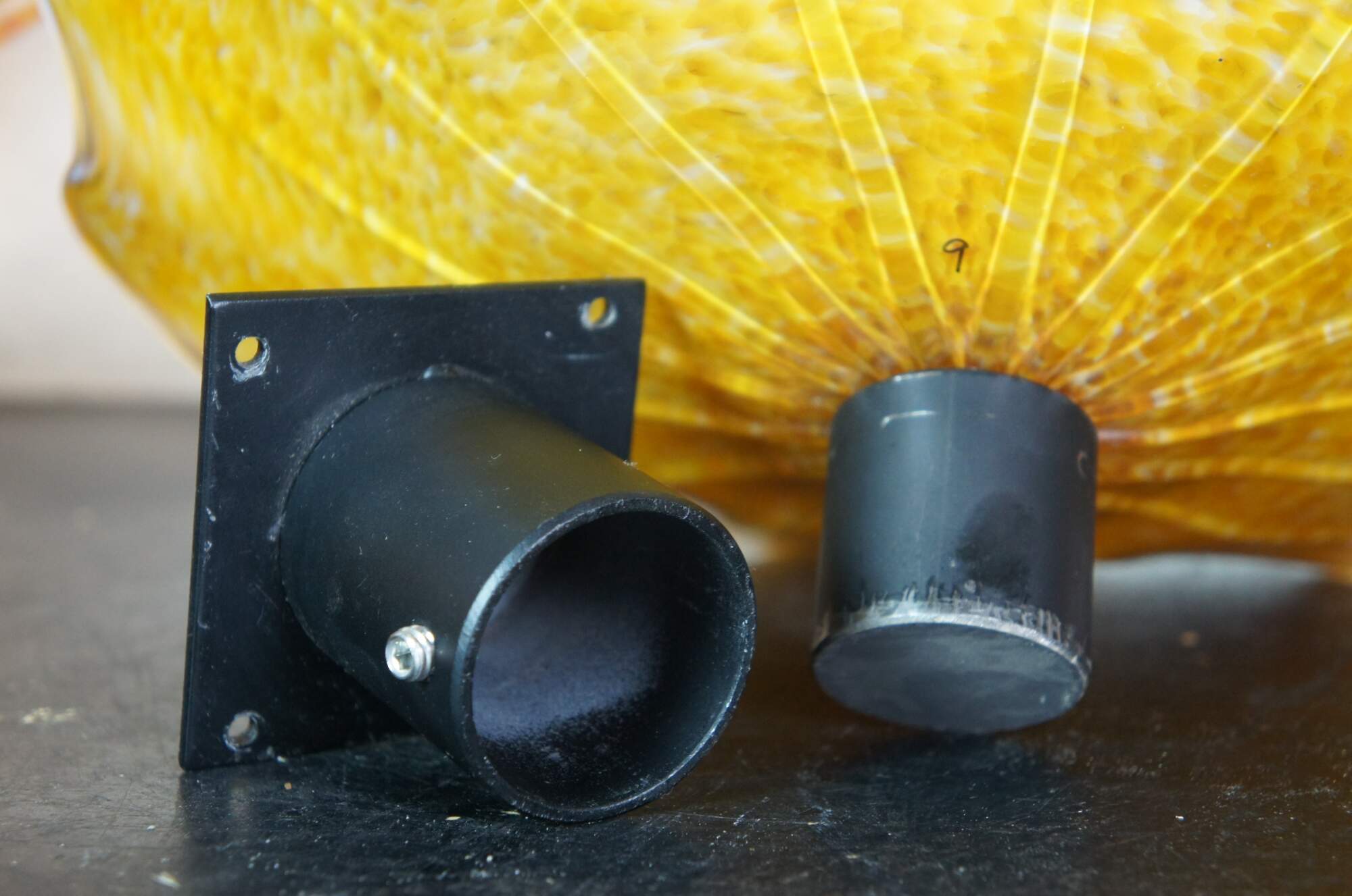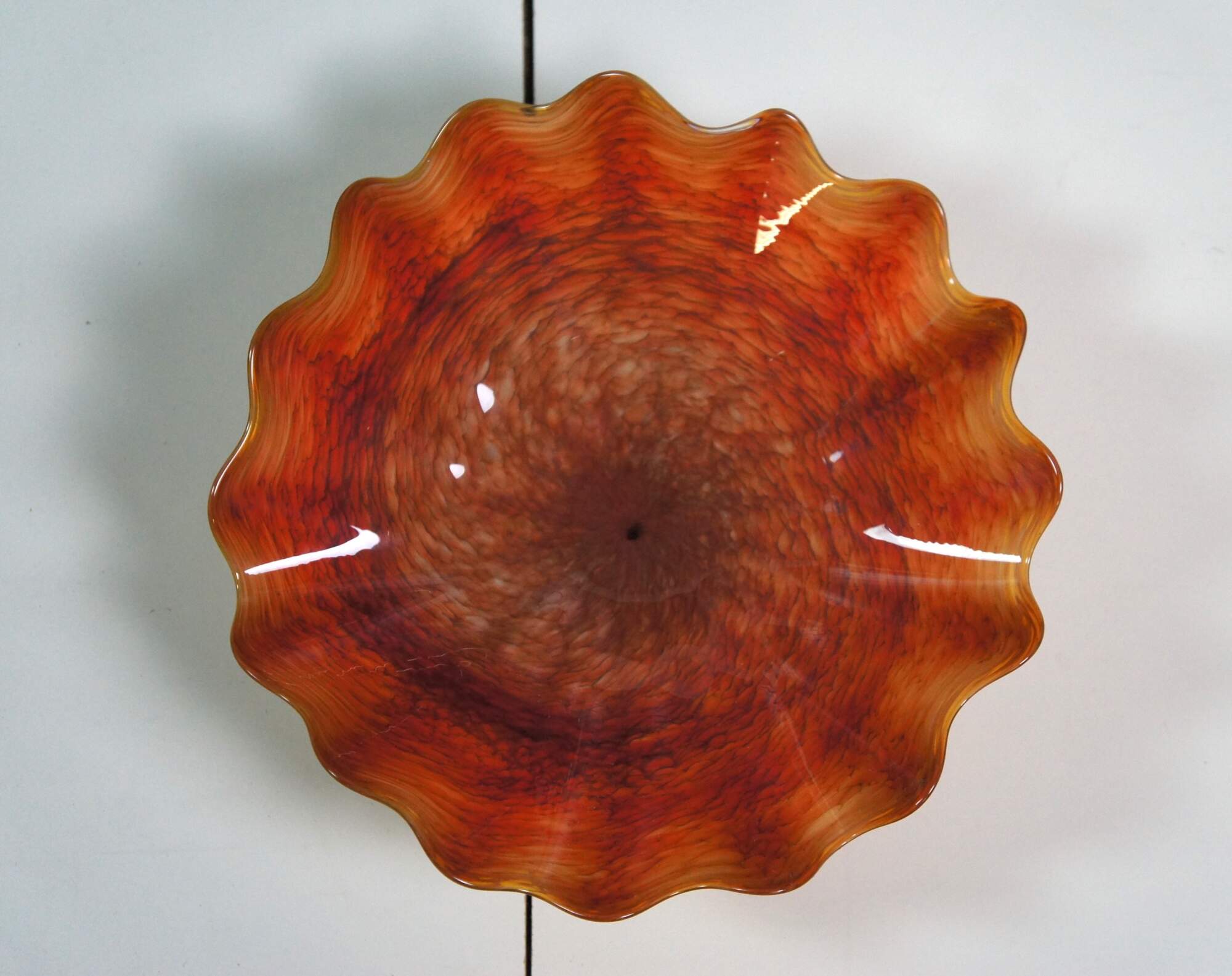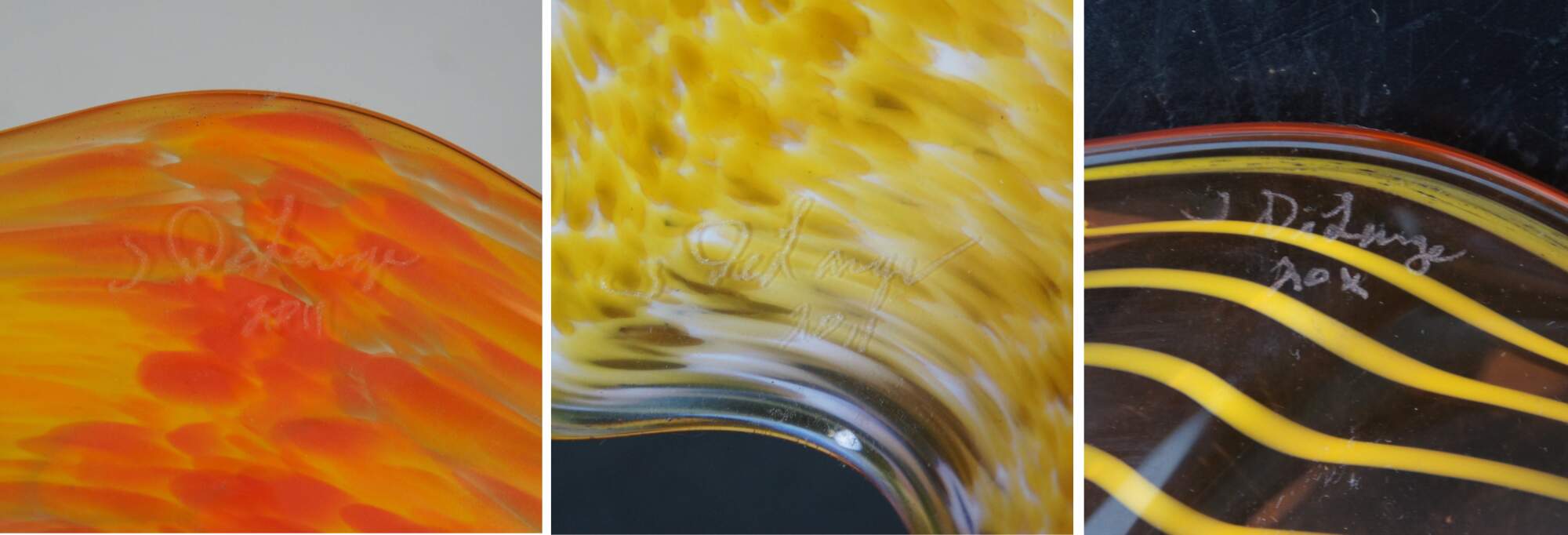 Trio of beautiful hand blown Studio art glass wall hanging plates by Dayton, OH artist Jim DeLange. This trio of ruffle edged sunburst / starburst shaped medallions featuring Chihuly style harmonizing shades of yellow, orange and red in stripes, spots, and swirling ombre. Signed along back edges. Supported for wall hanging by black metal mounting brackets (included).