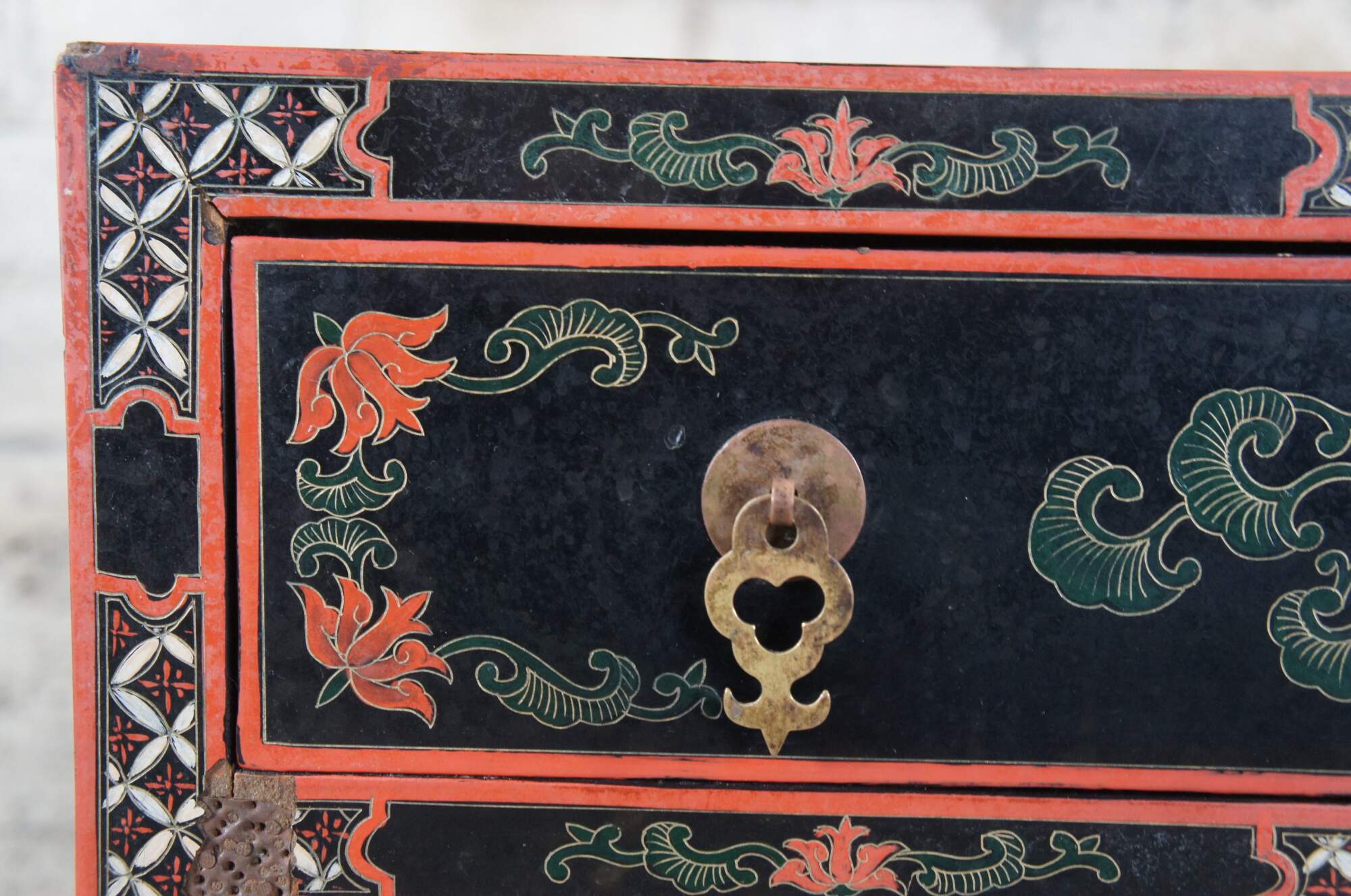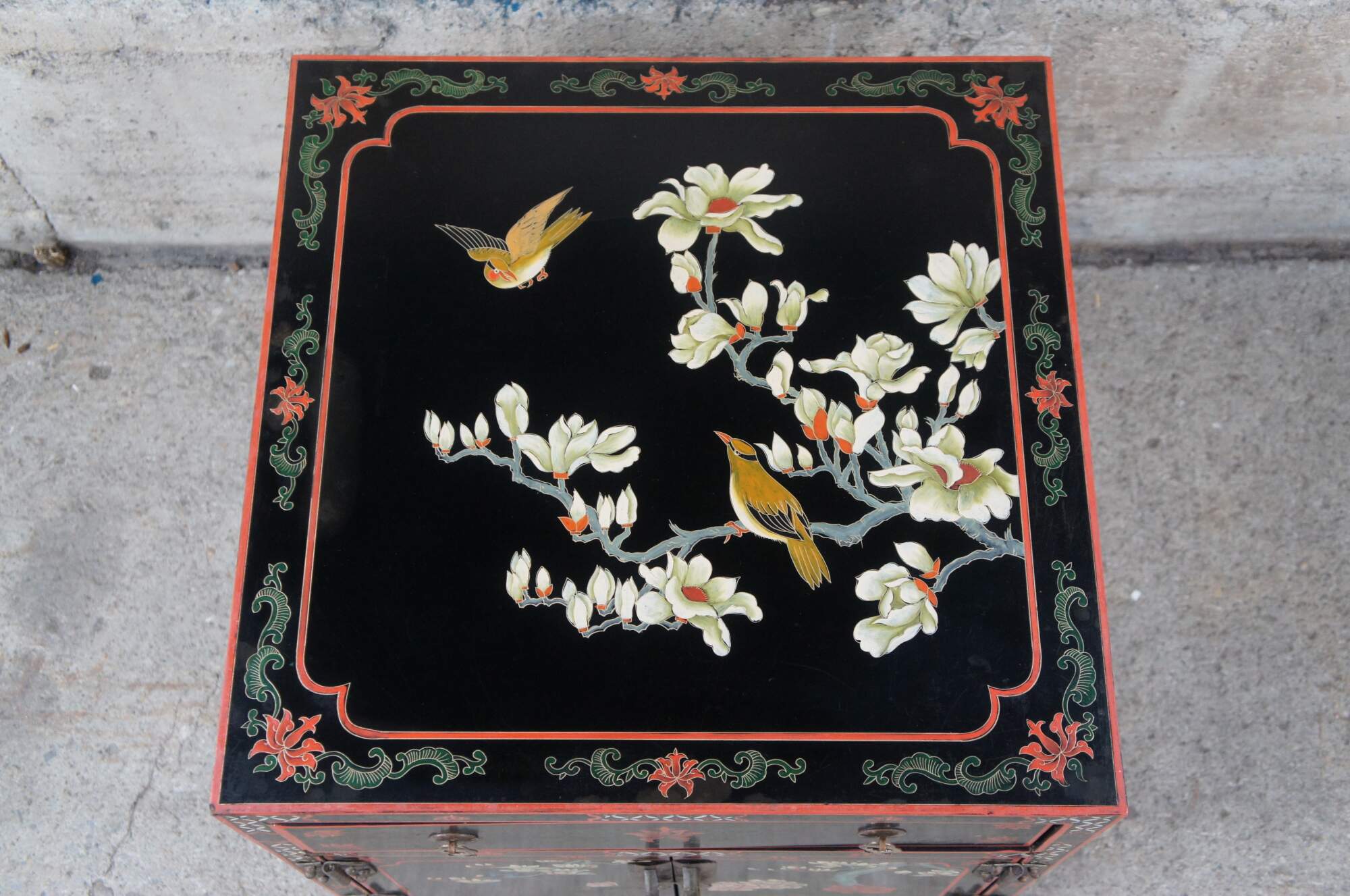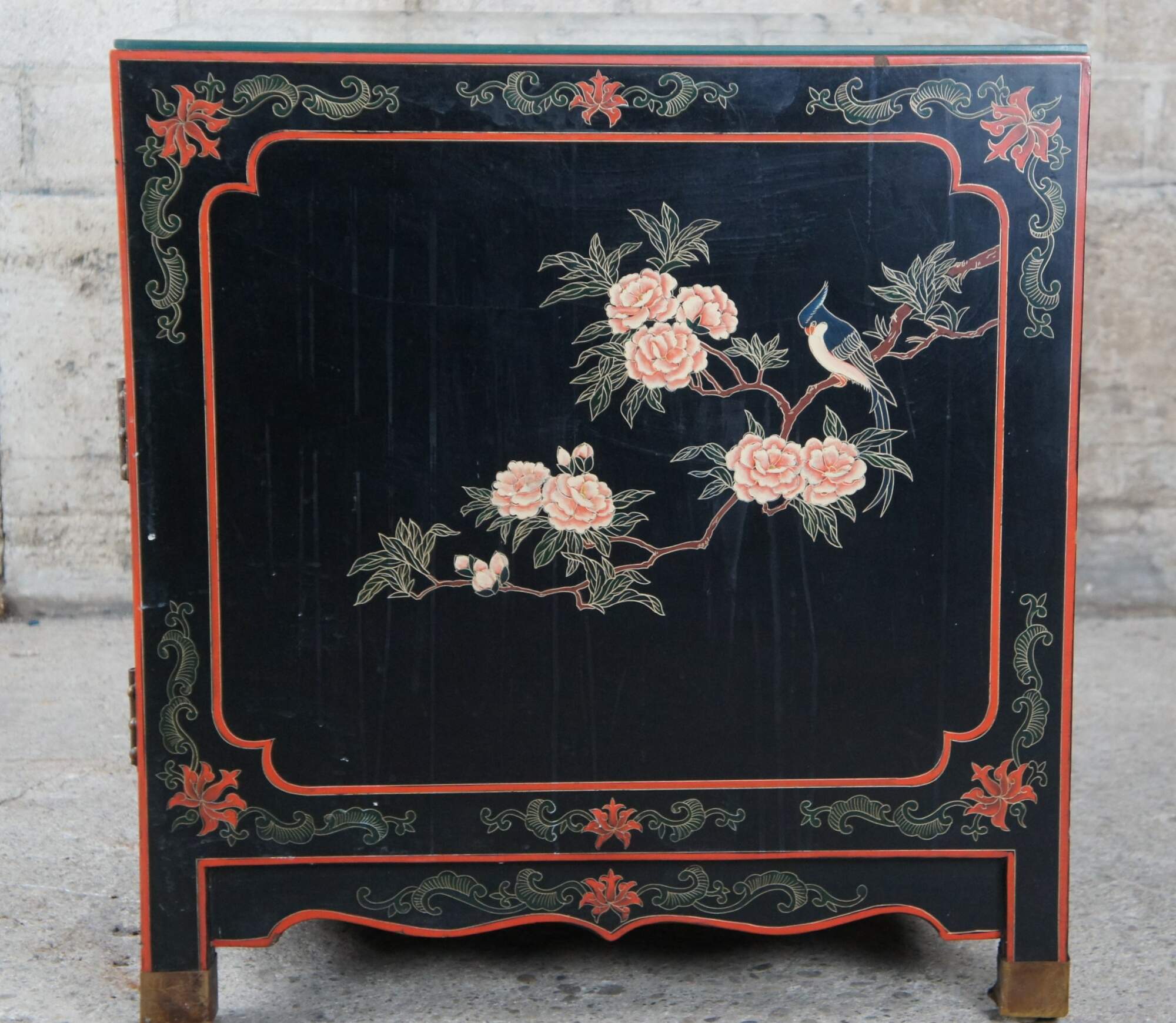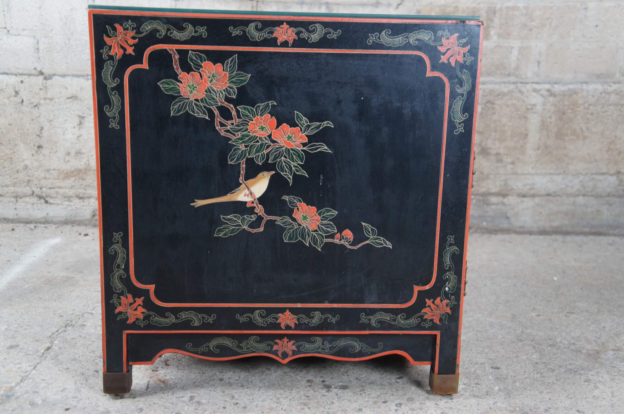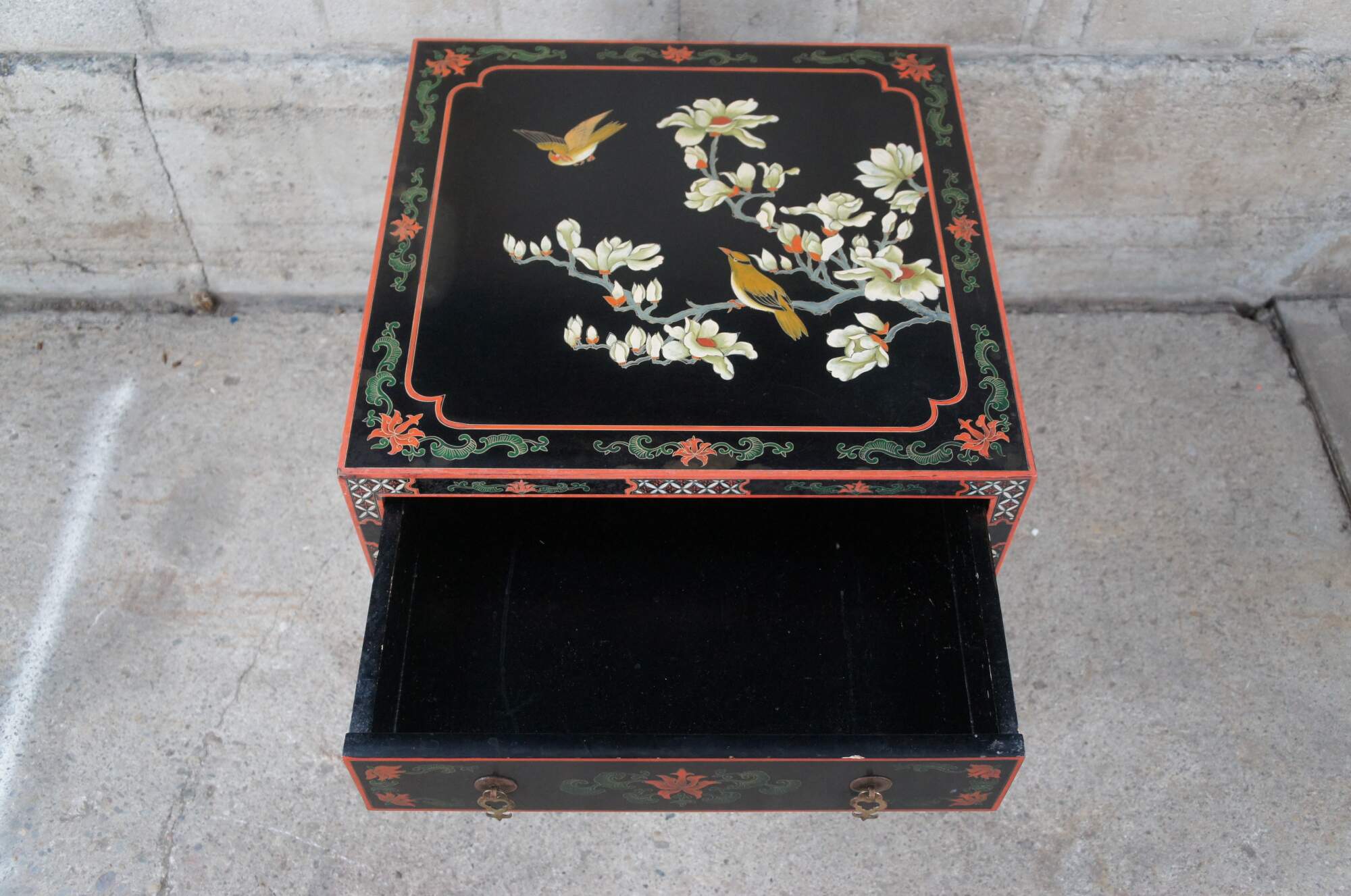 Vintage Chinese black lacquered cabinet side table featuring square form with upper drawer, lower cabinet and a floral bird landscape motif with brass capped feet..