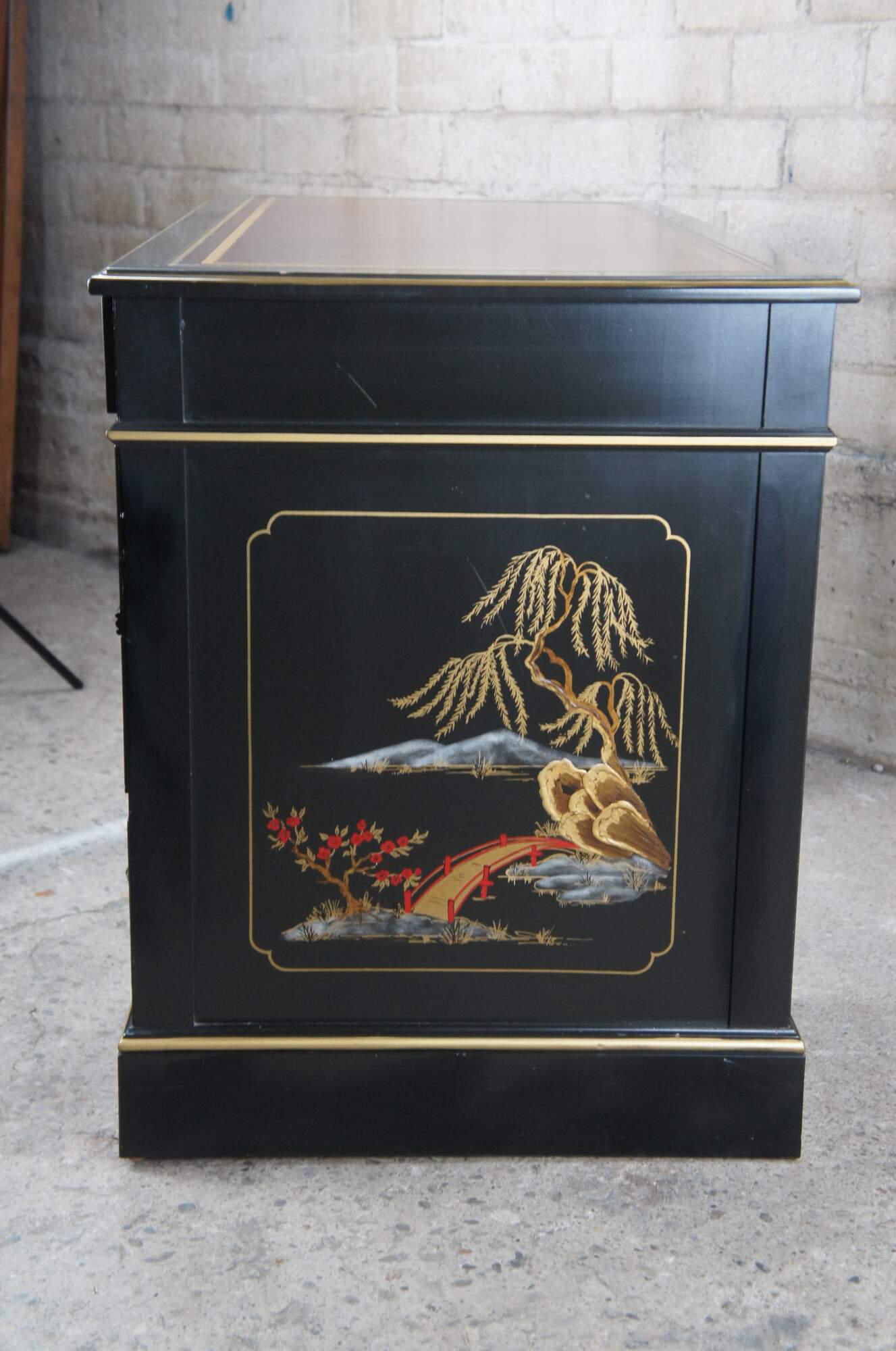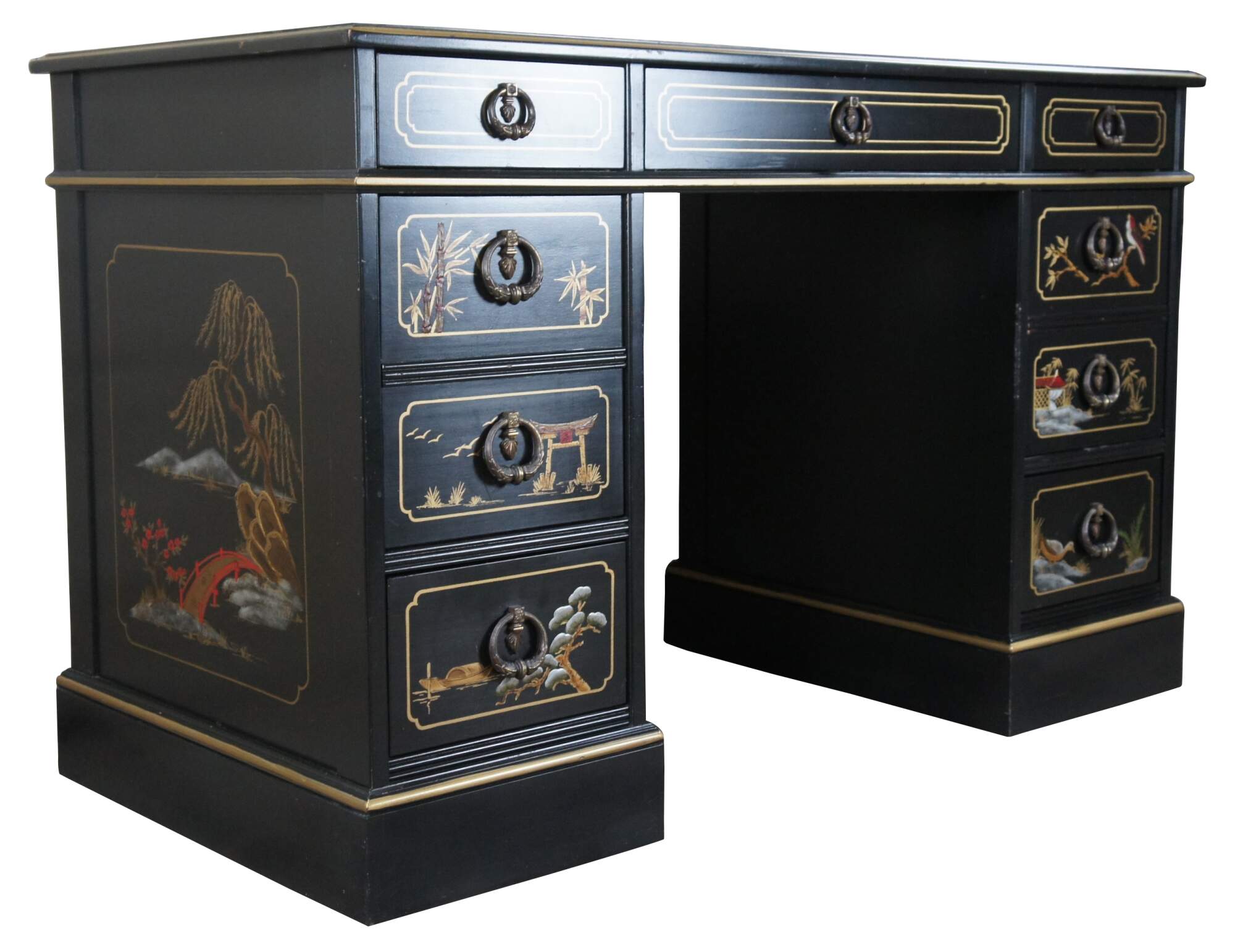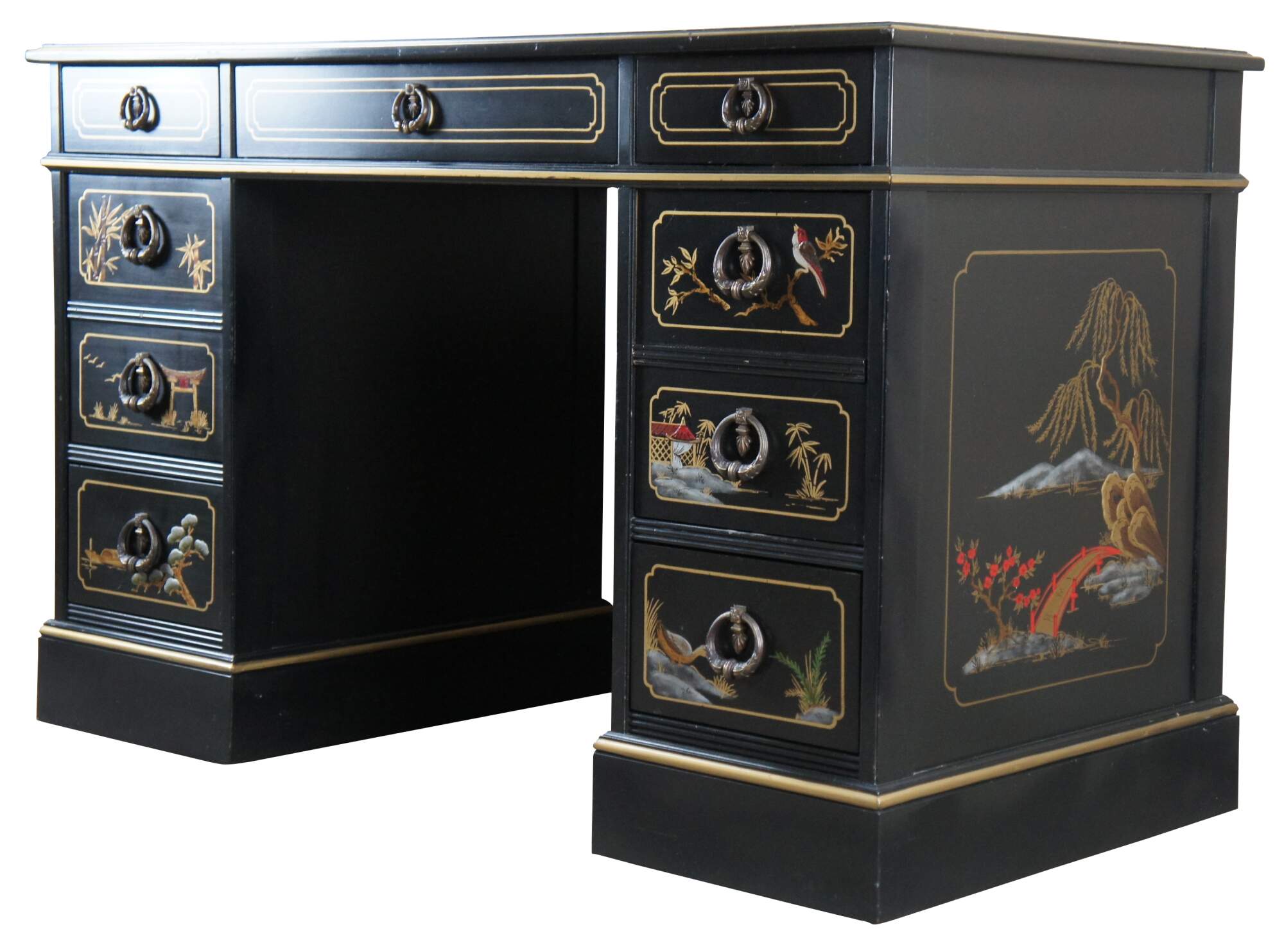Vintage Sligh Furniture black lacquered knee hole writing desk featuring Chinoiserie styling with seven drawers, a tooled red leather top, and floral landscape motif that features birds, bridges, boats, pagodas and bamboo.