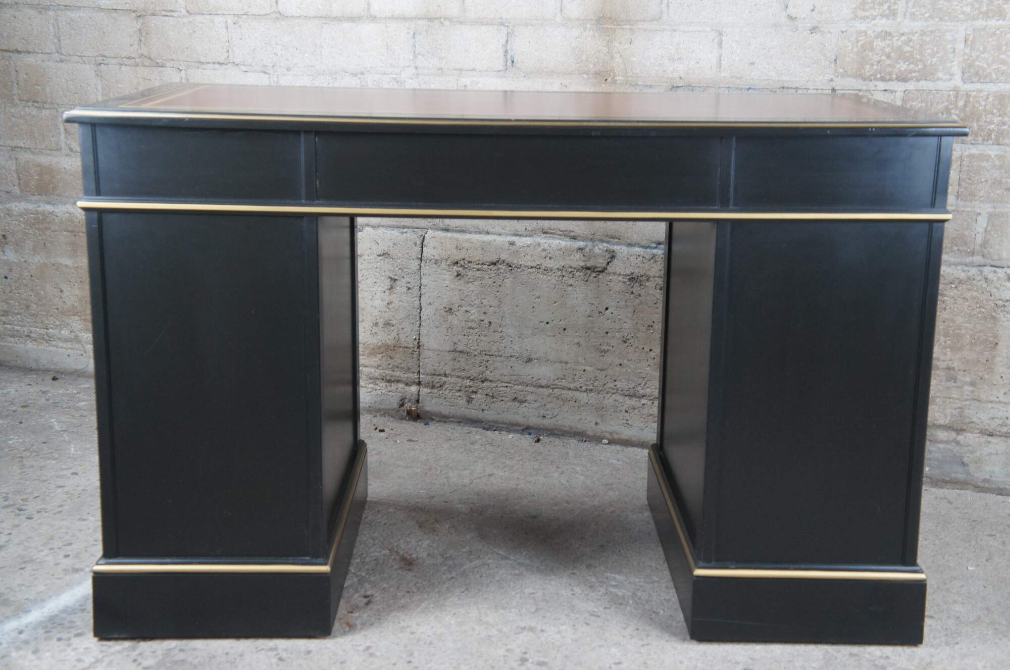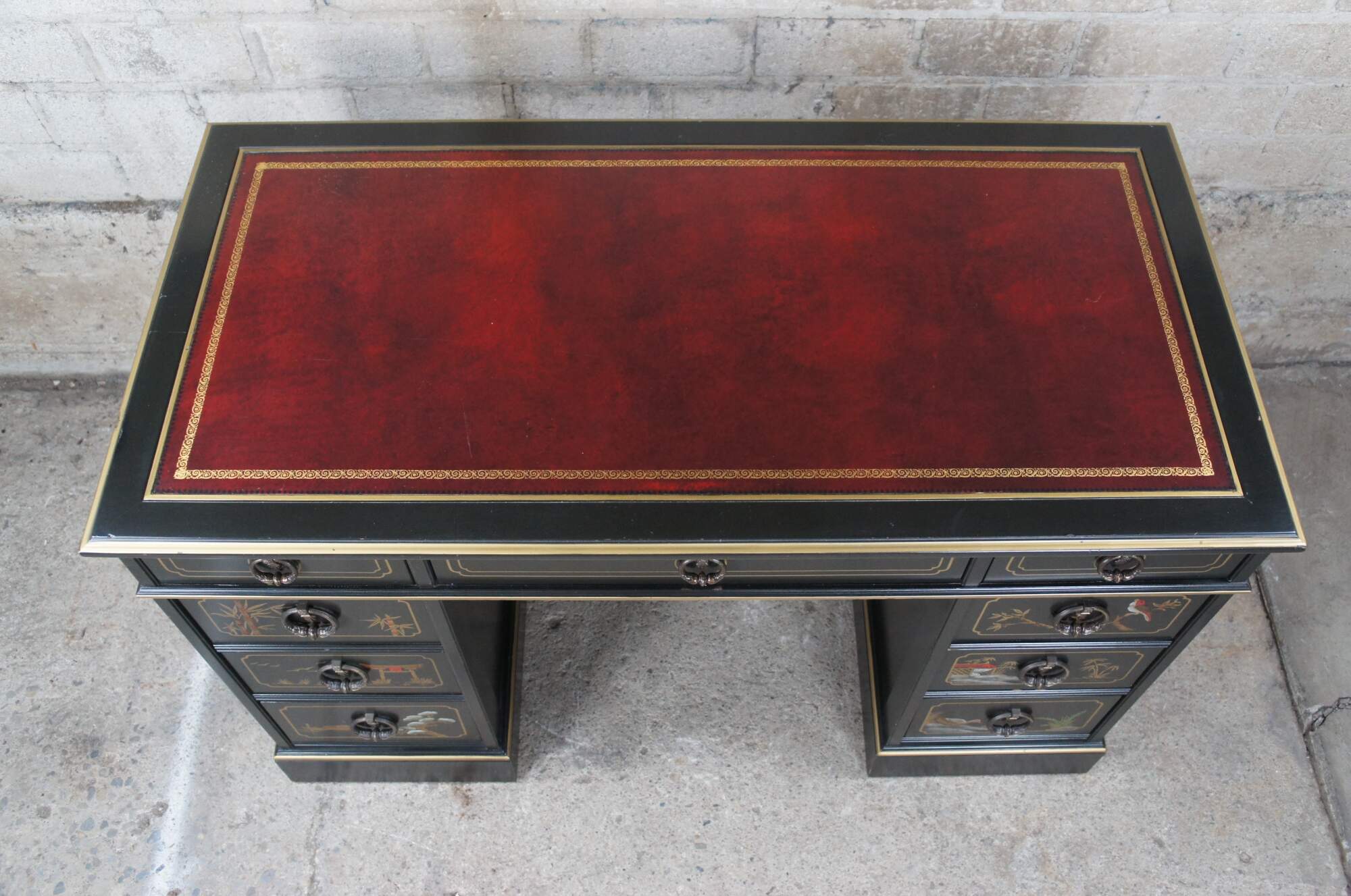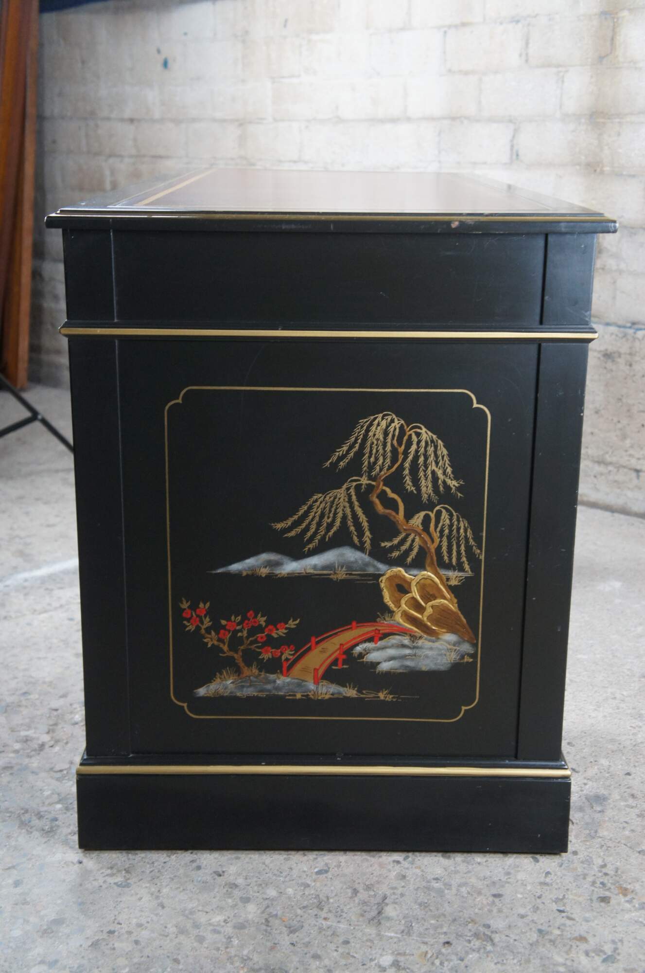 Vintage Sligh Furniture black lacquered knee hole writing desk featuring Chinoiserie styling with seven drawers, a tooled red leather top, and floral landscape motif that features birds, bridges, boats, pagodas and bamboo.