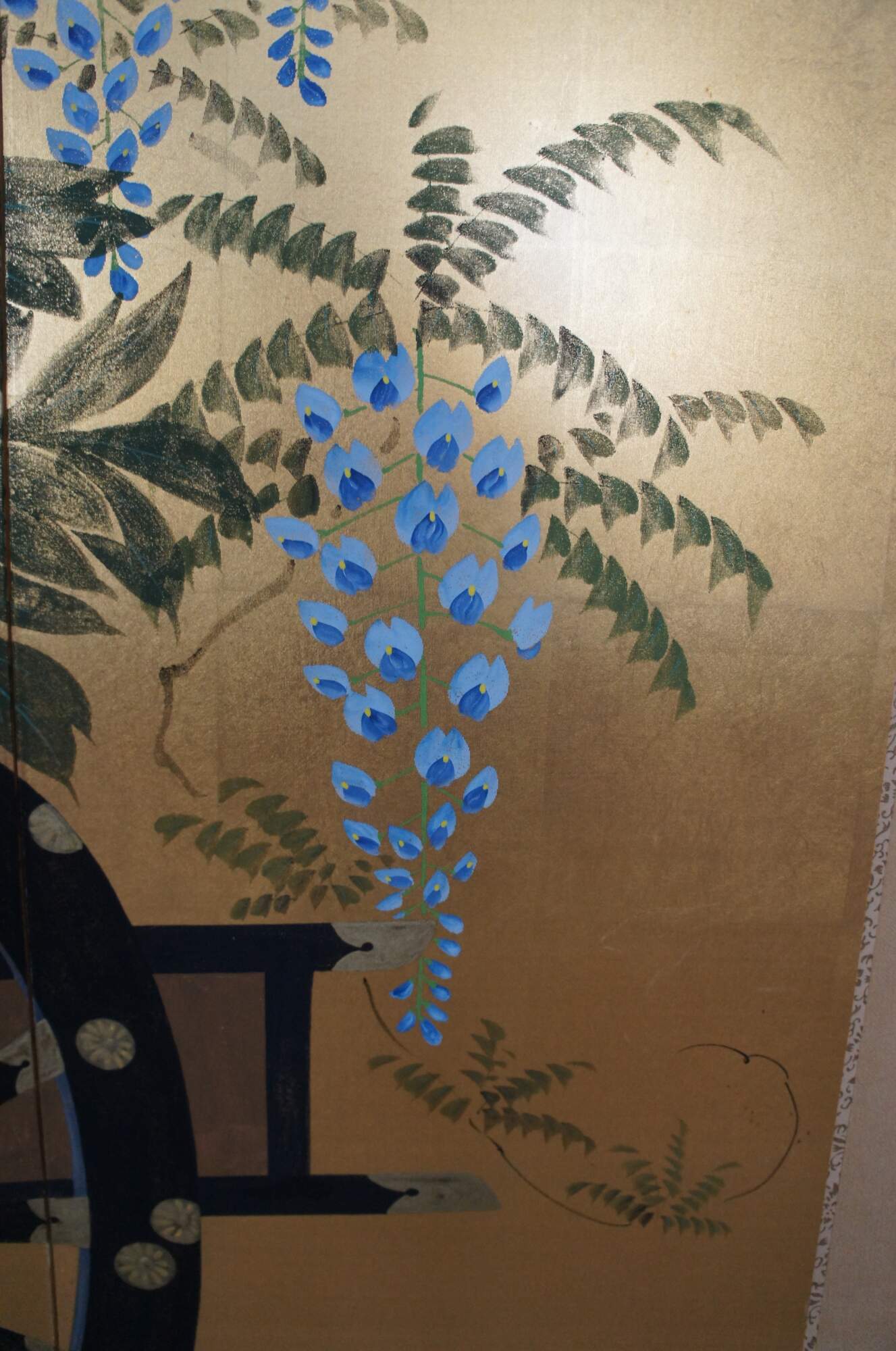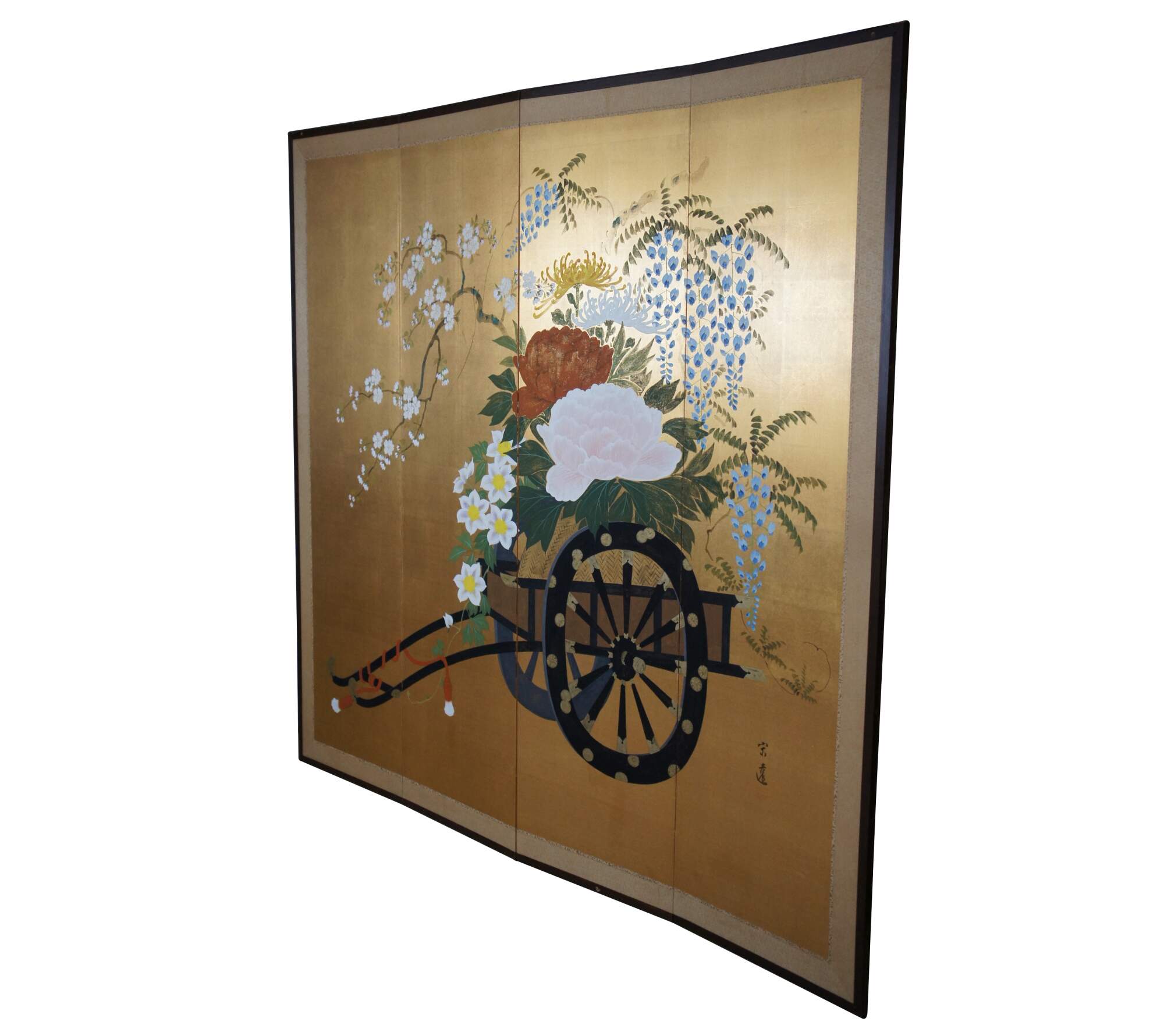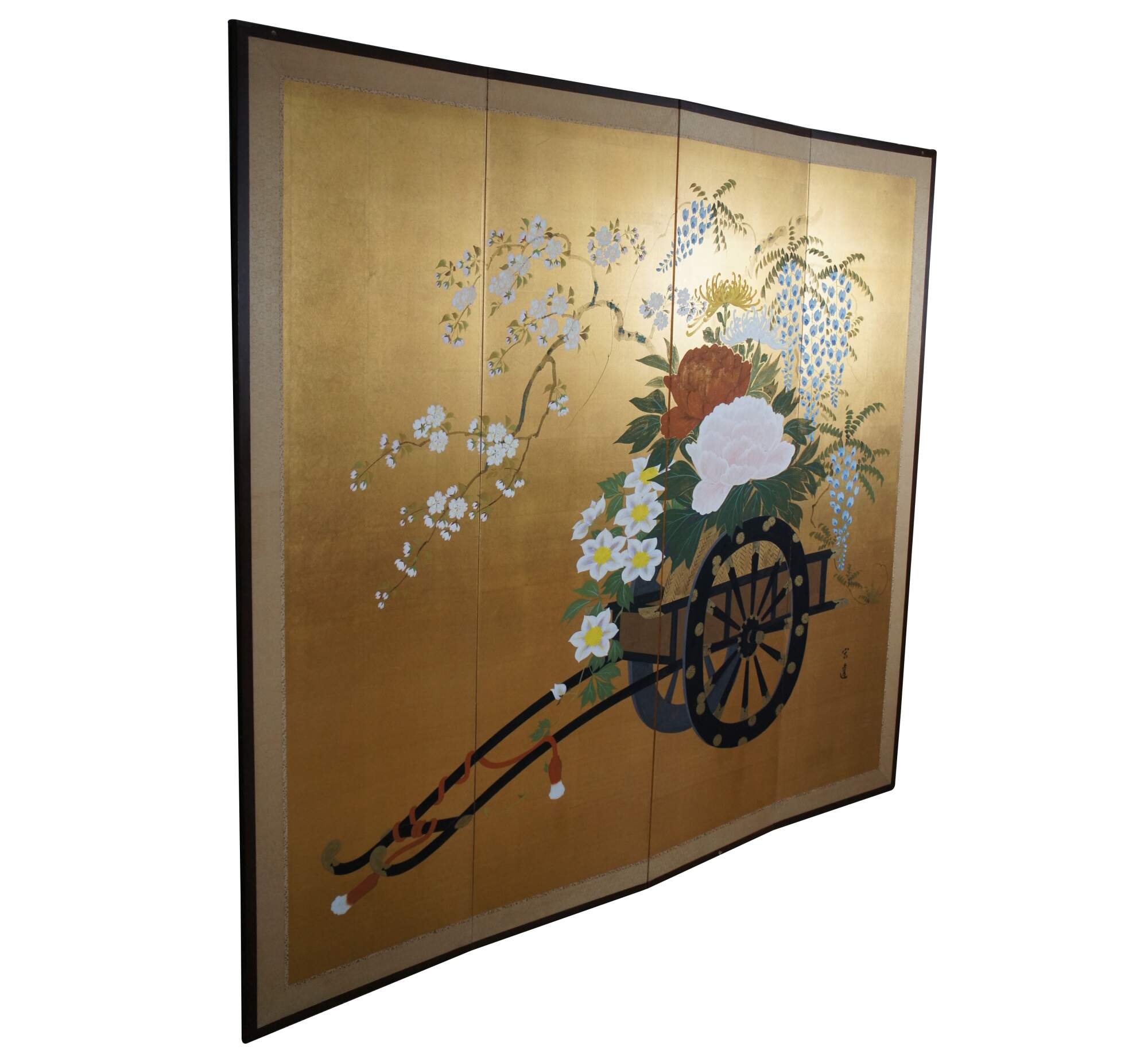 Mid 20th century Japanese four panel Byobu folding screen. Features a vibrant and flower cart with flowing botanicals painted over squares of gold leaf. Set in an ebonized wood frame with a traditional brocade silk border in gold.Set in an ebonized wood frame with a traditional brocade silk border in gold.