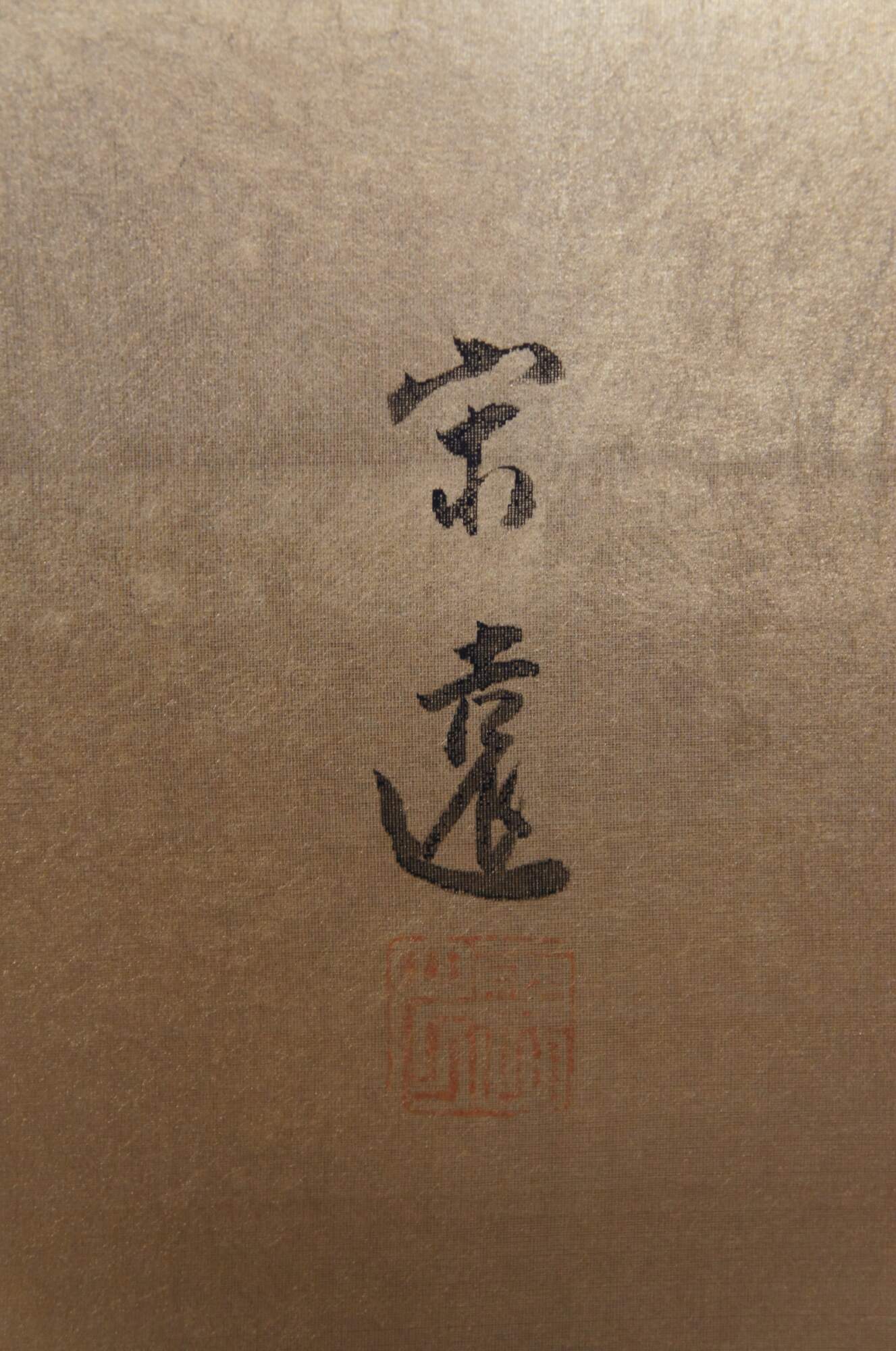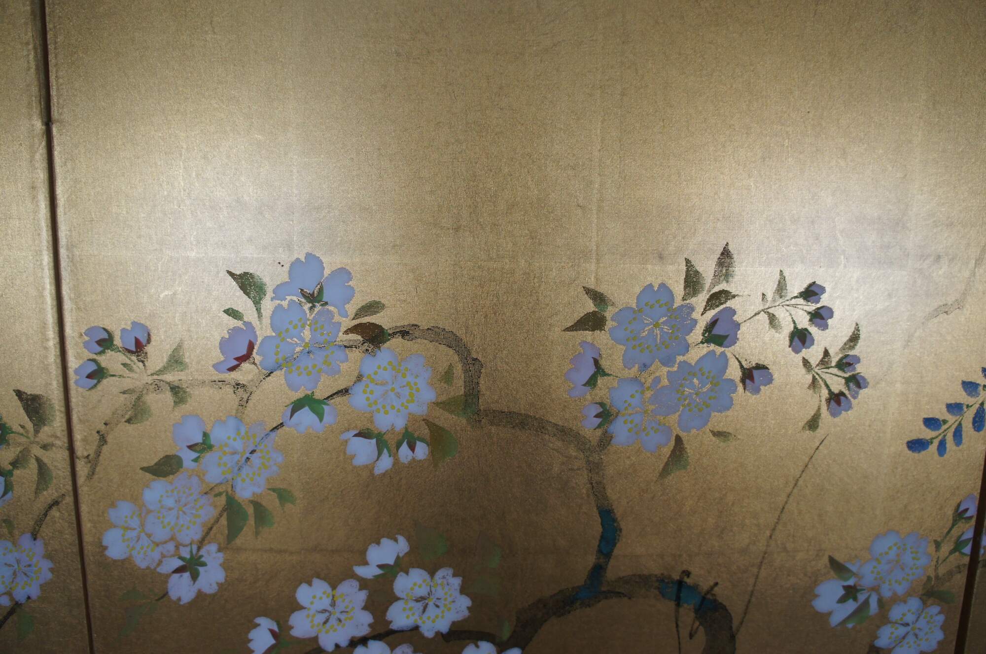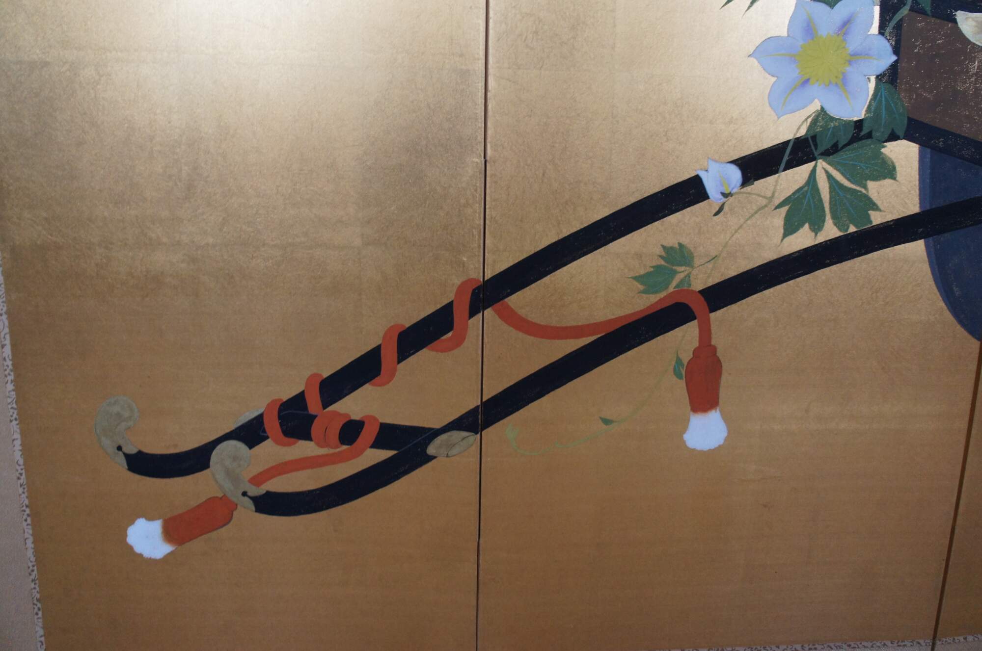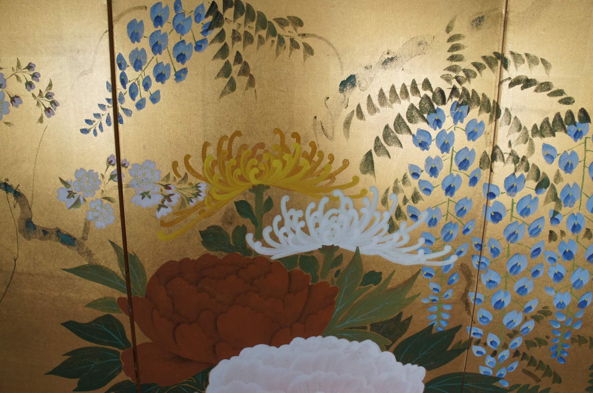Mid 20th century Japanese four panel Byobu folding screen. Features a vibrant and flower cart with flowing botanicals painted over squares of gold leaf. Set in an ebonized wood frame with a traditional brocade silk border in gold.Set in an ebonized wood frame with a traditional brocade silk border in gold.