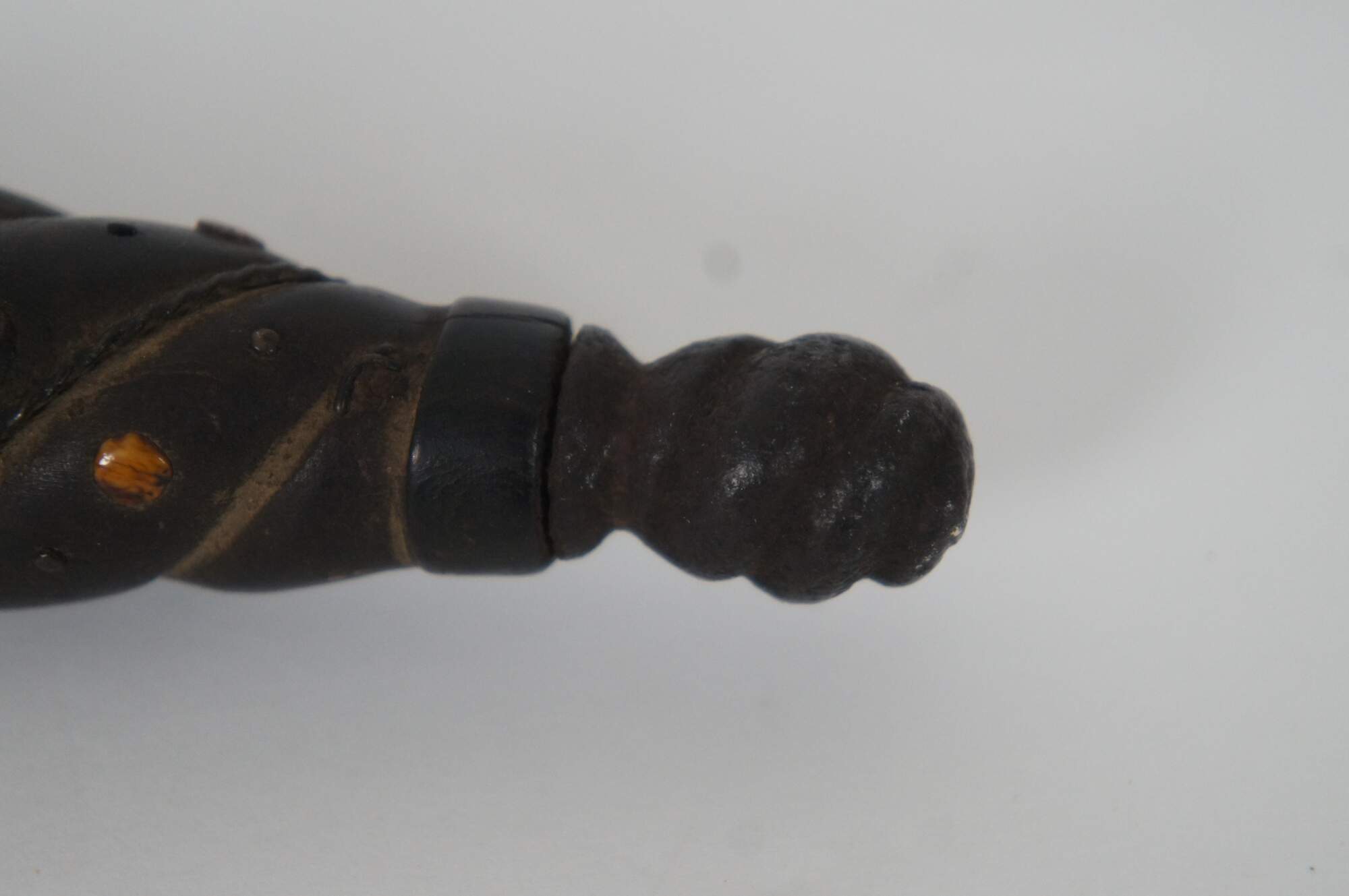 Antique 17th century Italian gunner’s stiletto featuring a triangular blade marked with incremented markings for measuring cannon bores / powder levels. Turned iron pommel, bolster, and cross guard, flanking a wooden grips, decorated with grooves once sporting wire inlays and accented with round amber beads.