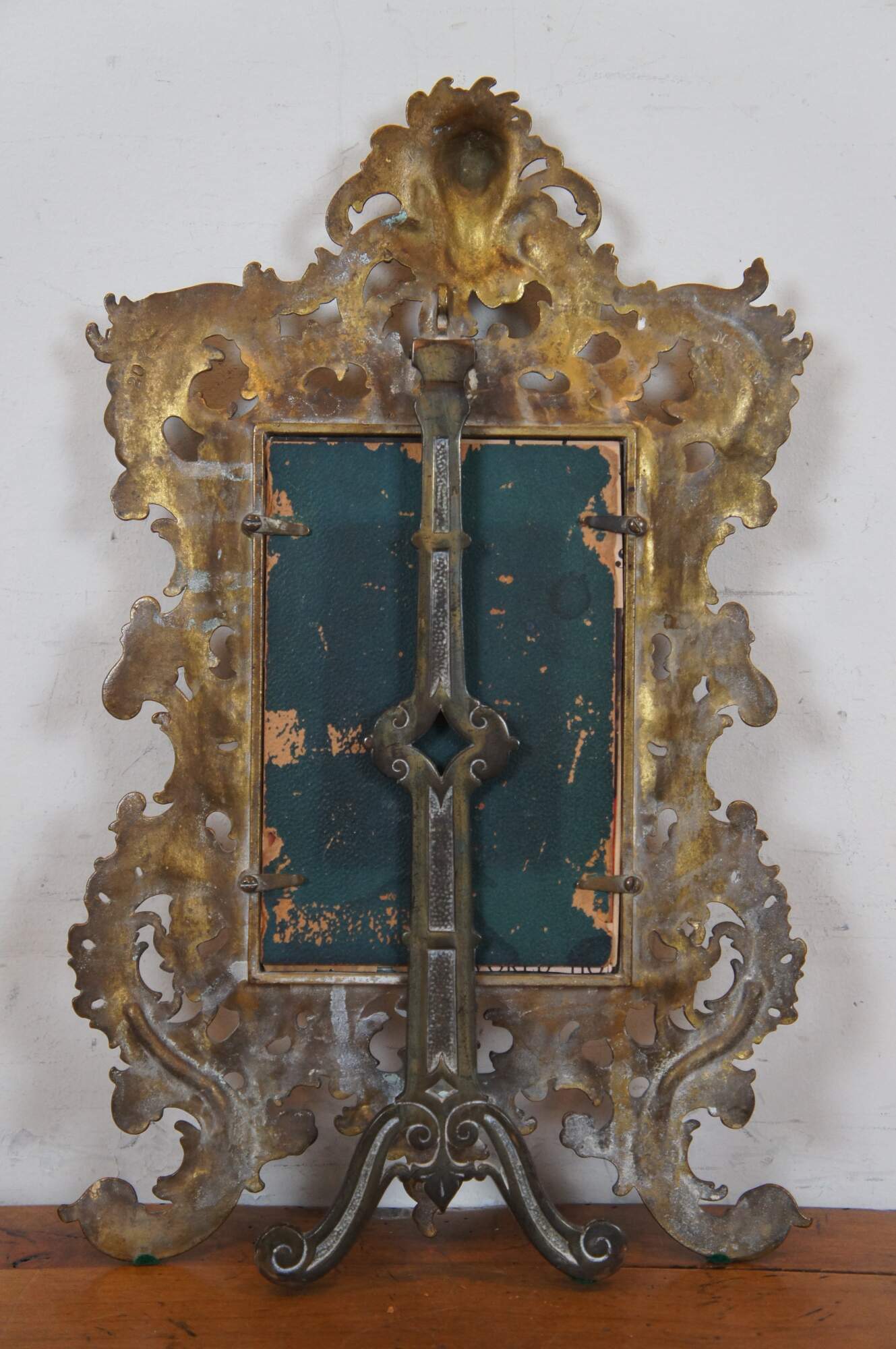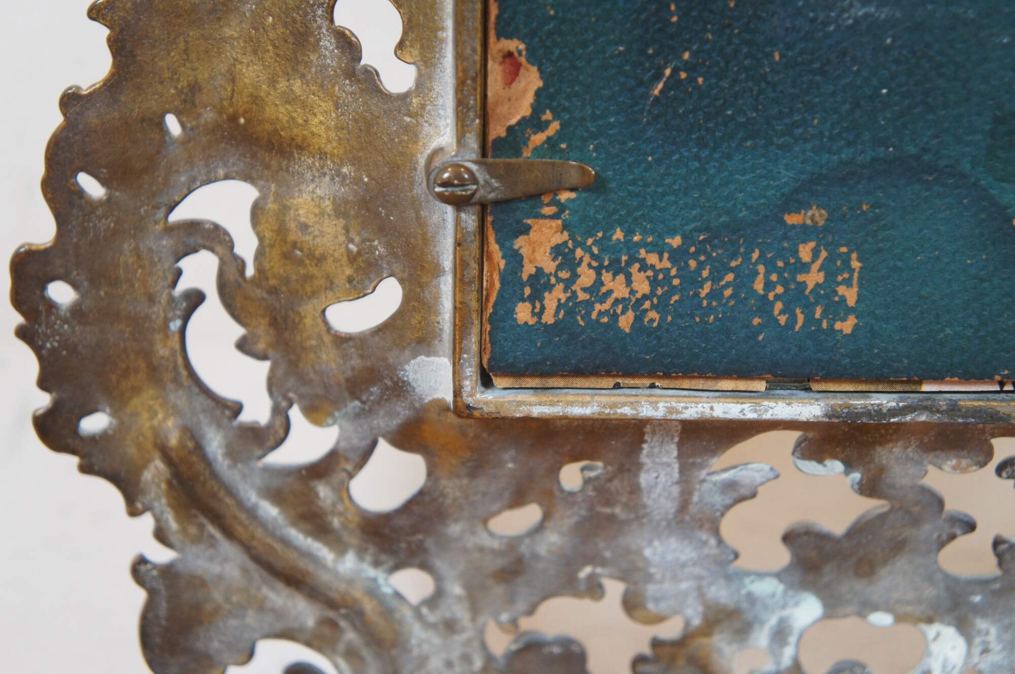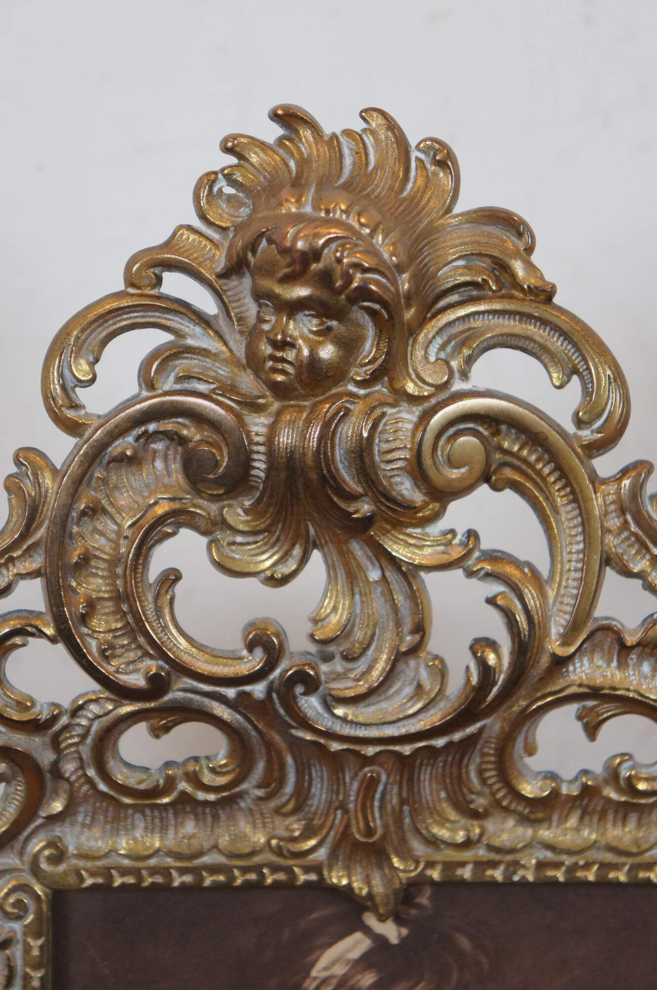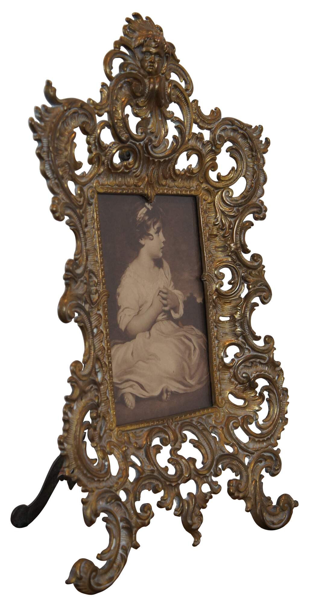 Antique late 19th century reticulated brass easel style picture vanity frame by The National Brass & Iron Works Company (NB & IW) number 2071, featuring a swirling foliate art nouveau design topped with a cherub face. Currently contains a black and white postcard sized print of “Age of Innocence” by Sir Joshua Reynolds, which shows a young girl seated in a landscape.