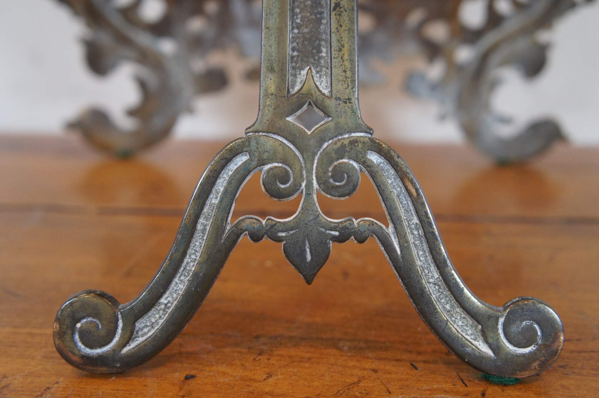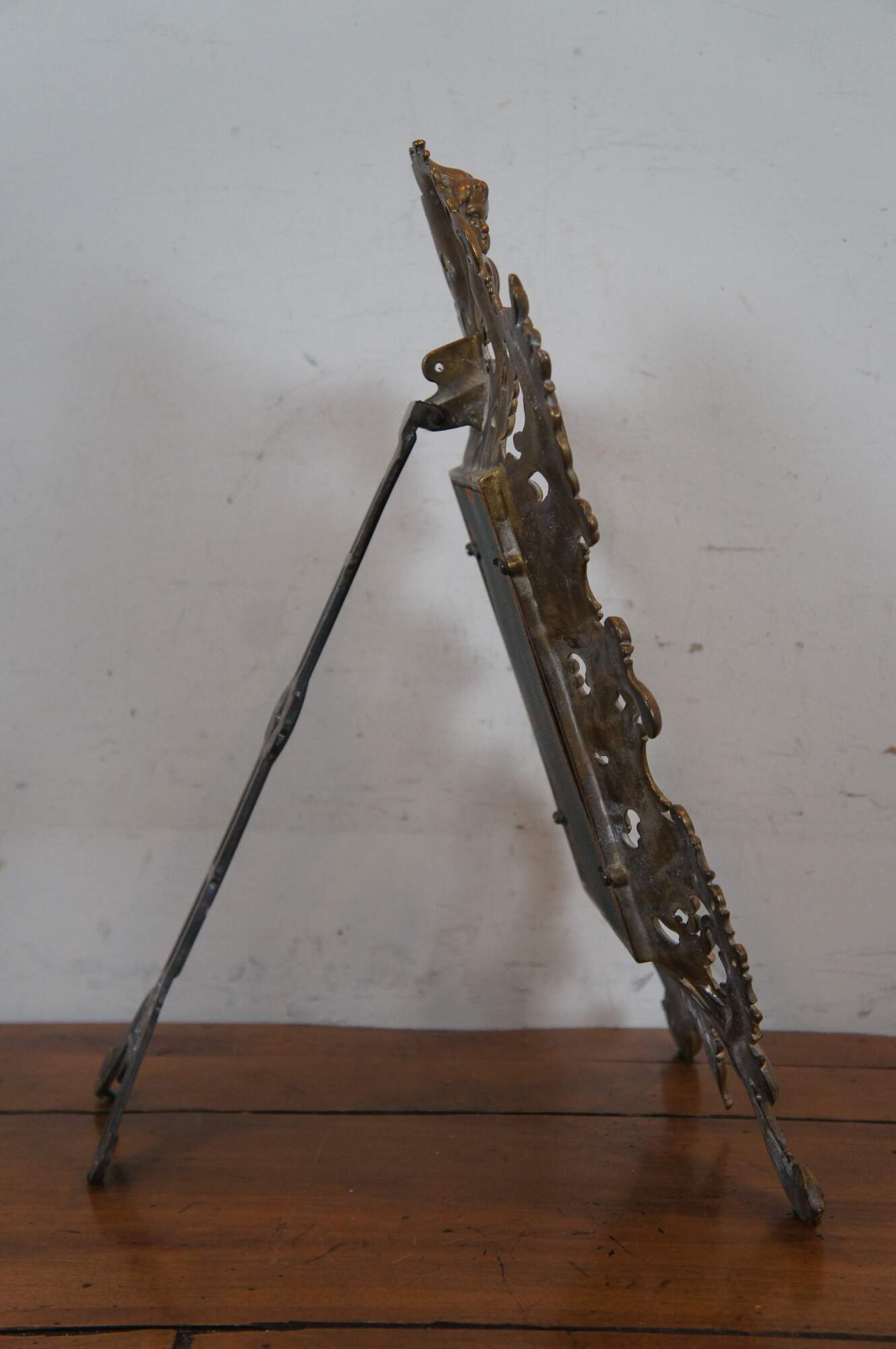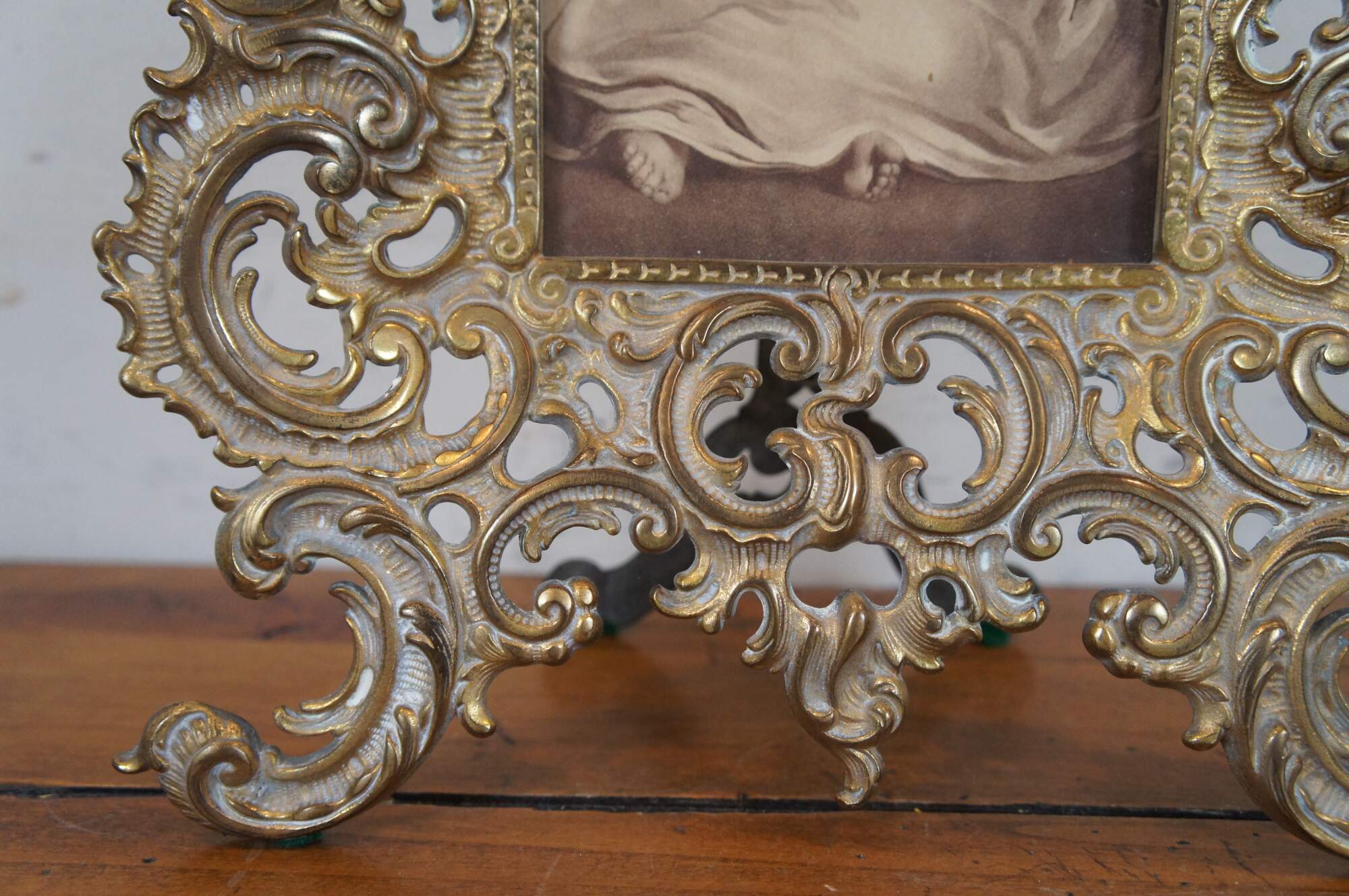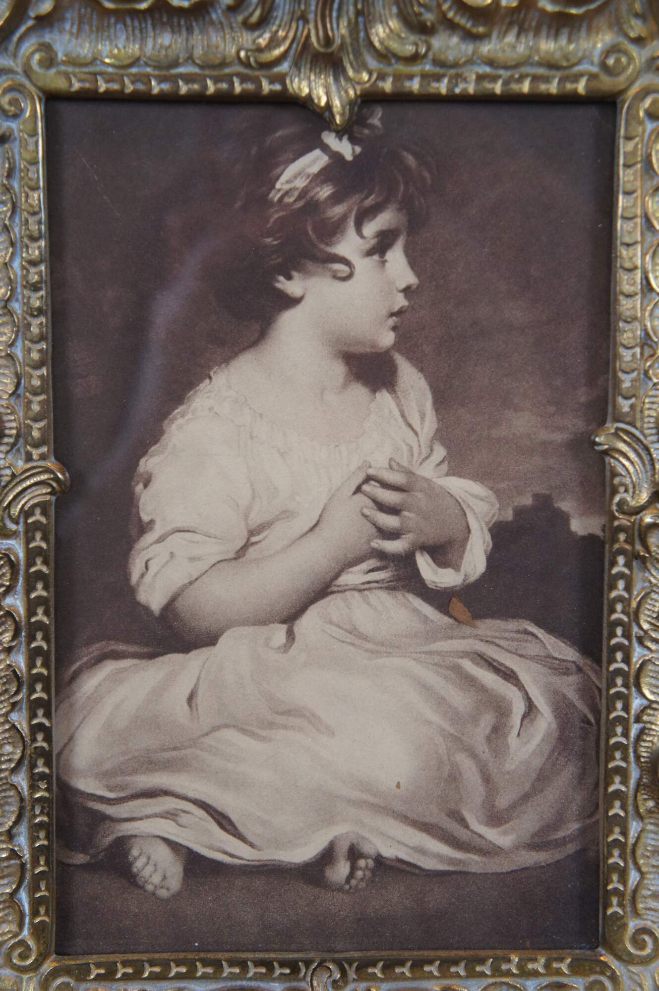 Antique late 19th century reticulated brass easel style picture vanity frame by The National Brass & Iron Works Company (NB & IW) number 2071, featuring a swirling foliate art nouveau design topped with a cherub face. Currently contains a black and white postcard sized print of “Age of Innocence” by Sir Joshua Reynolds, which shows a young girl seated in a landscape.