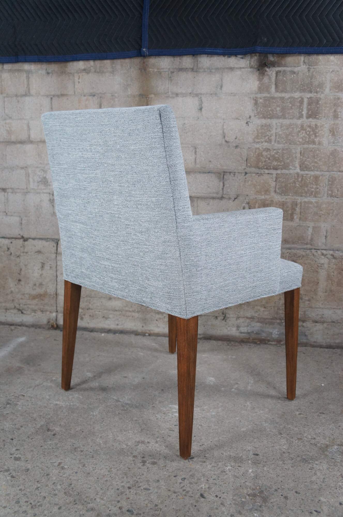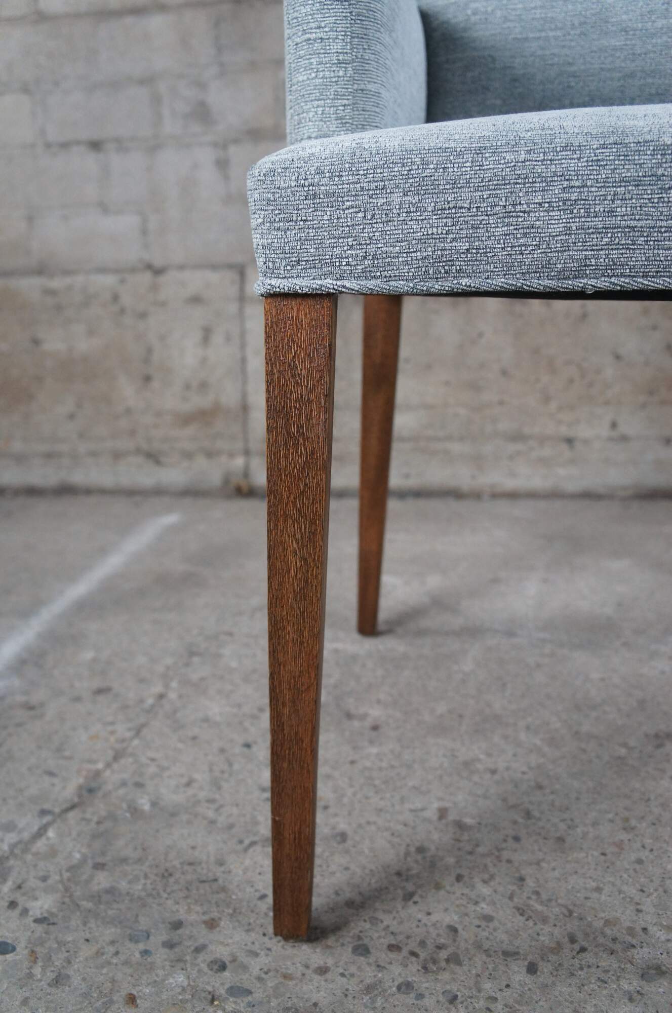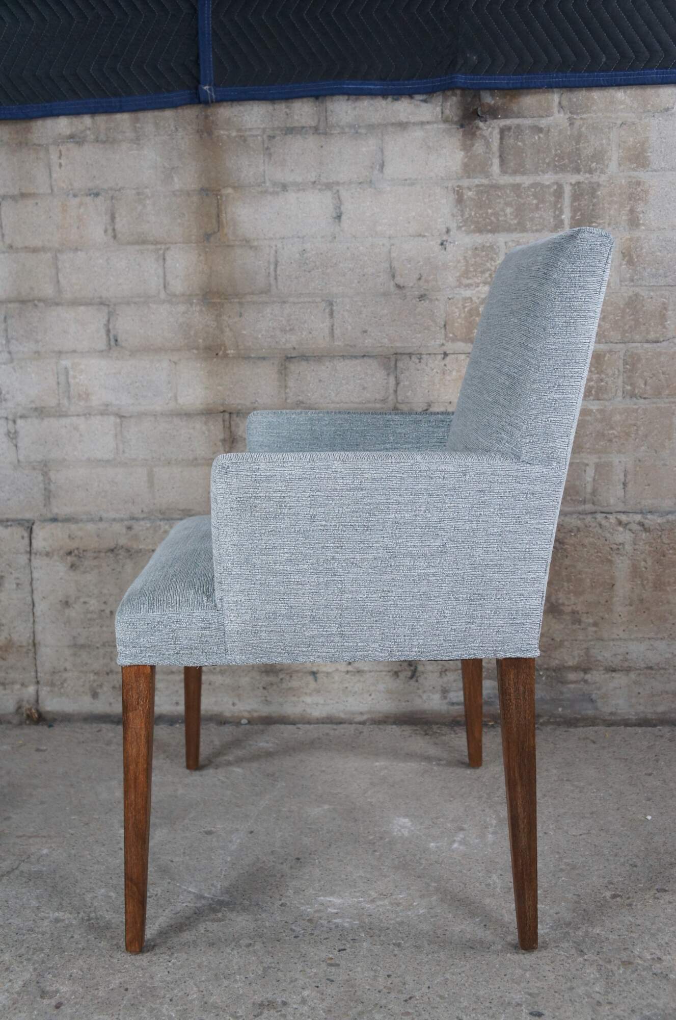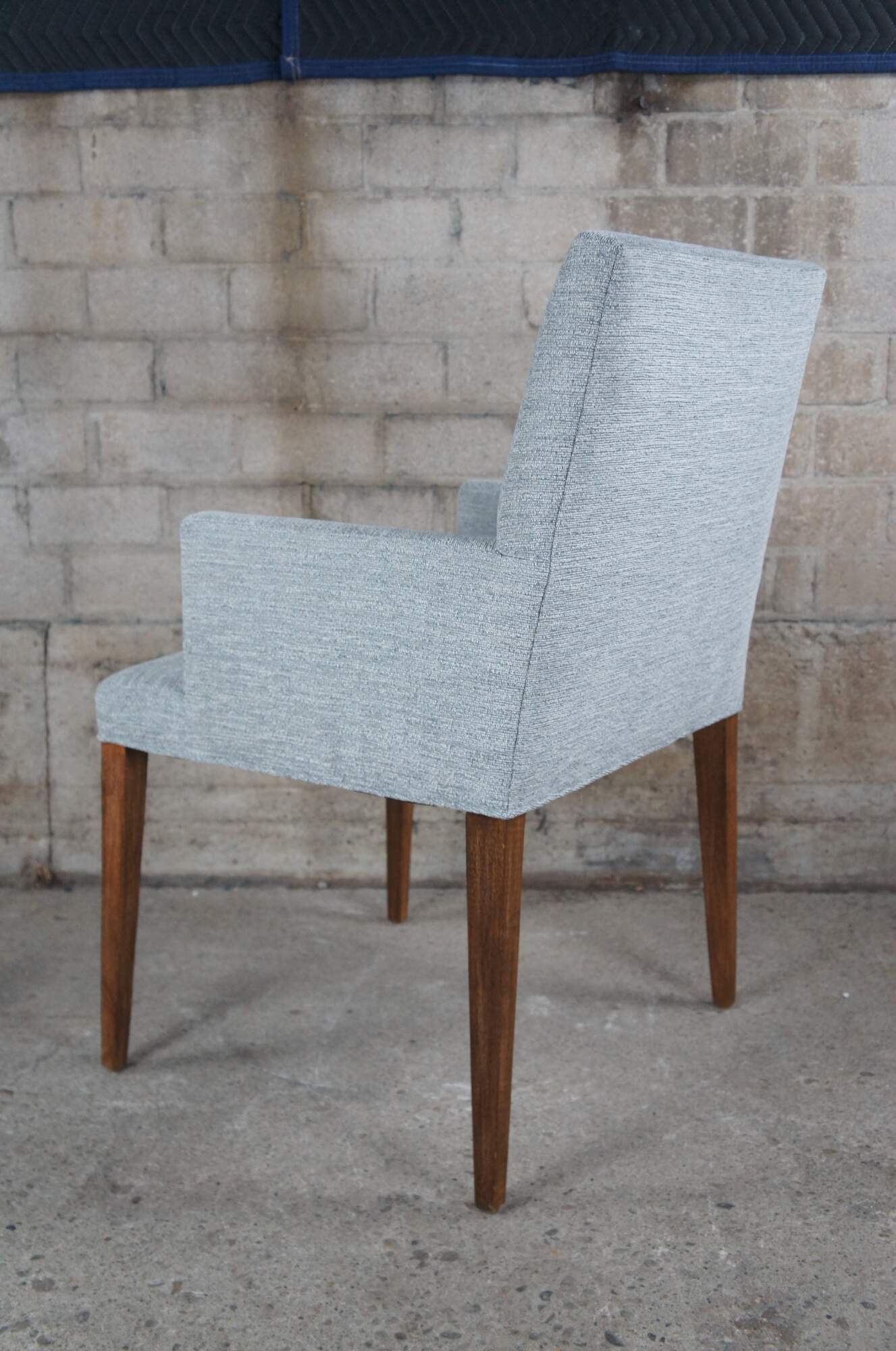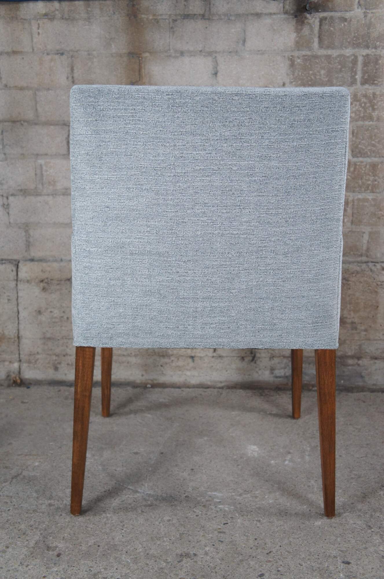 Six vintage dining armchairs featuring modern styling gray upholstery and tapered walnut finished legs