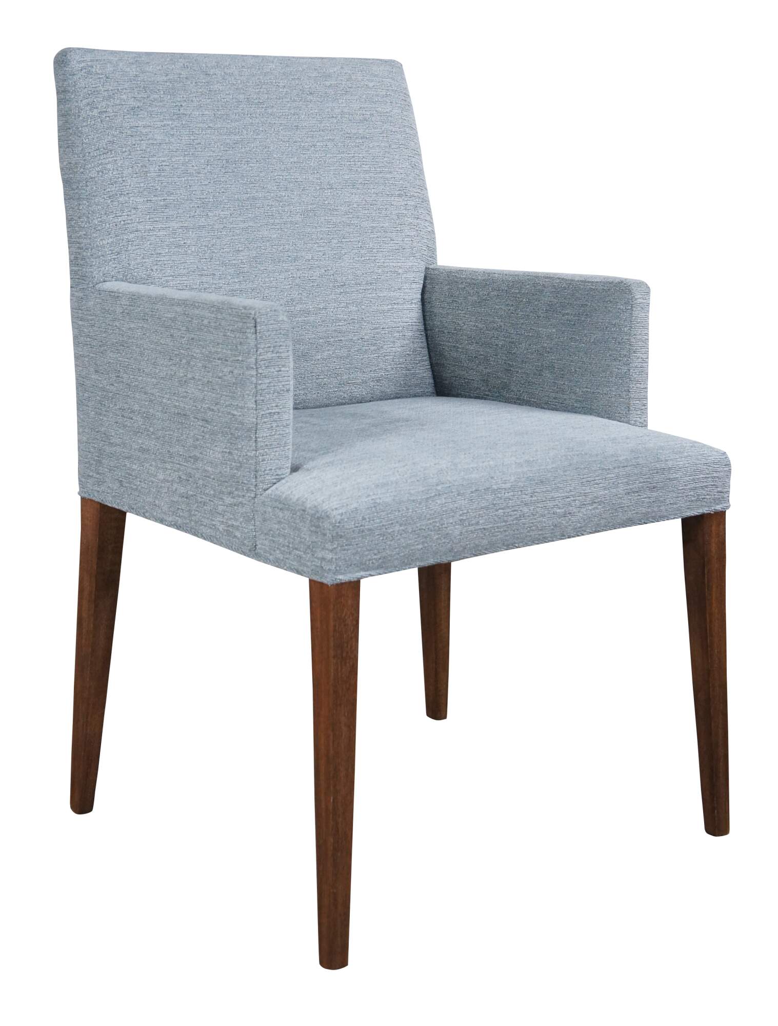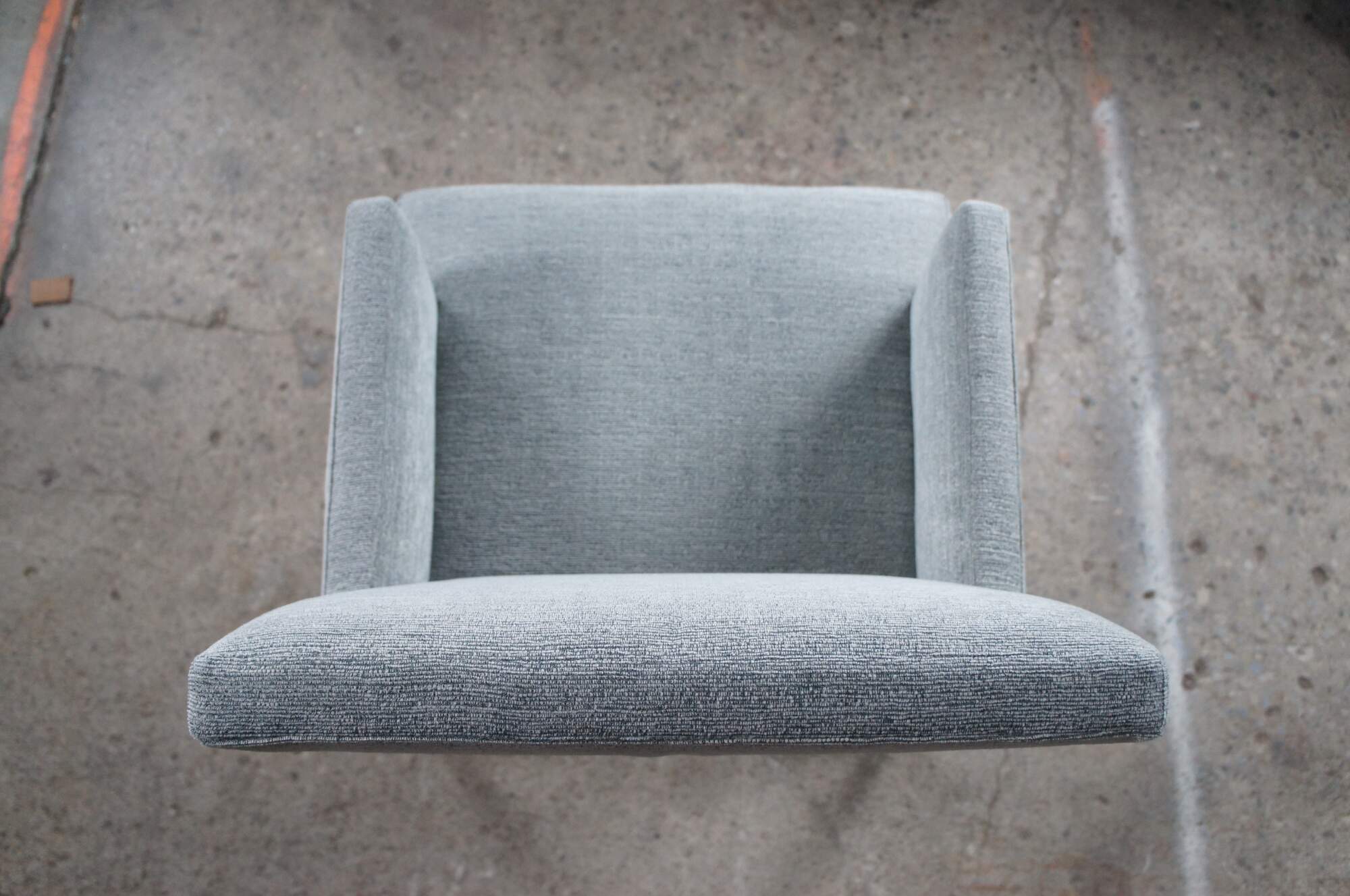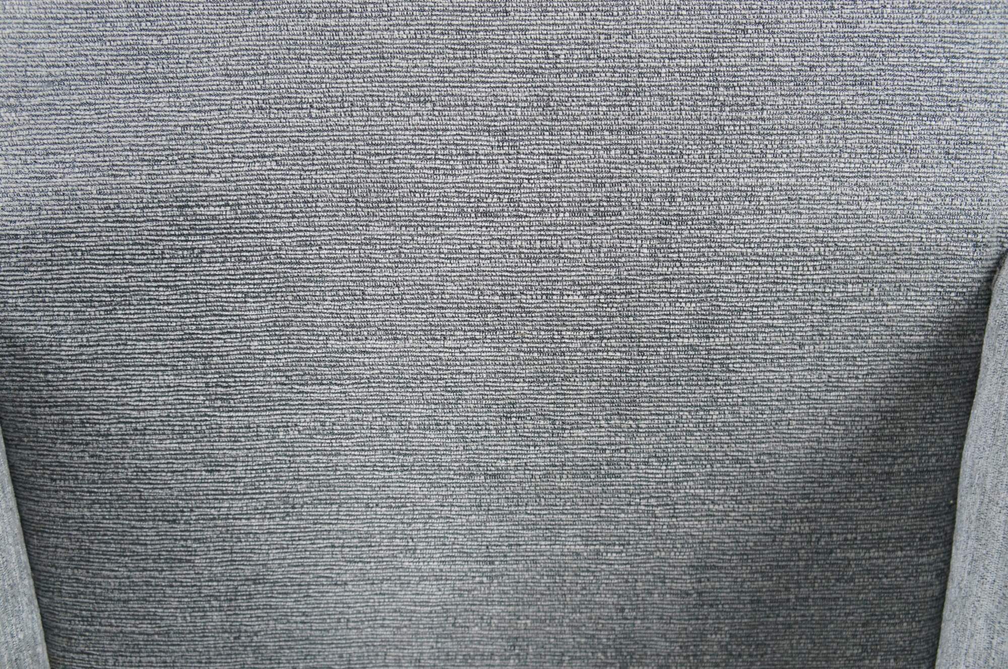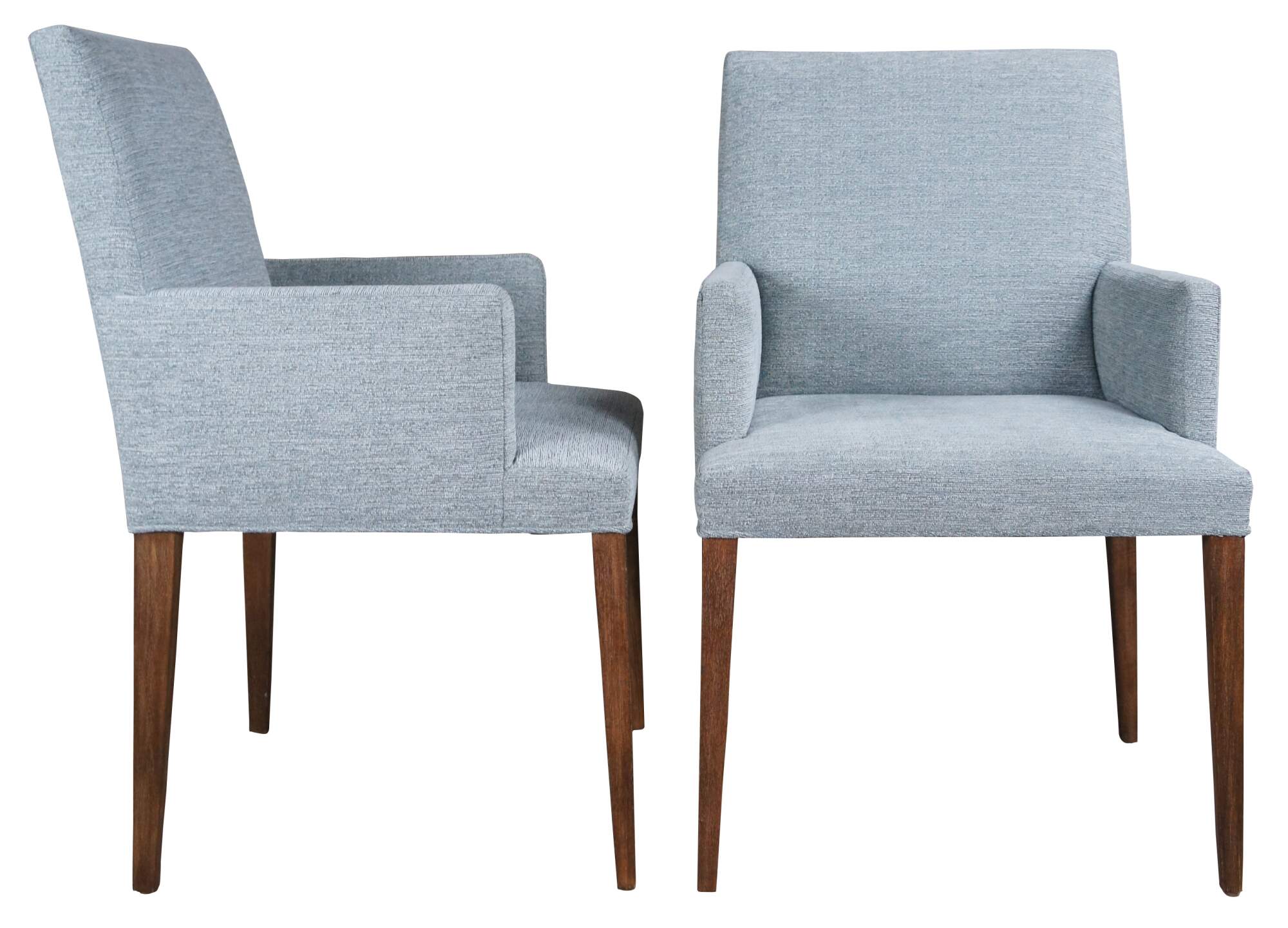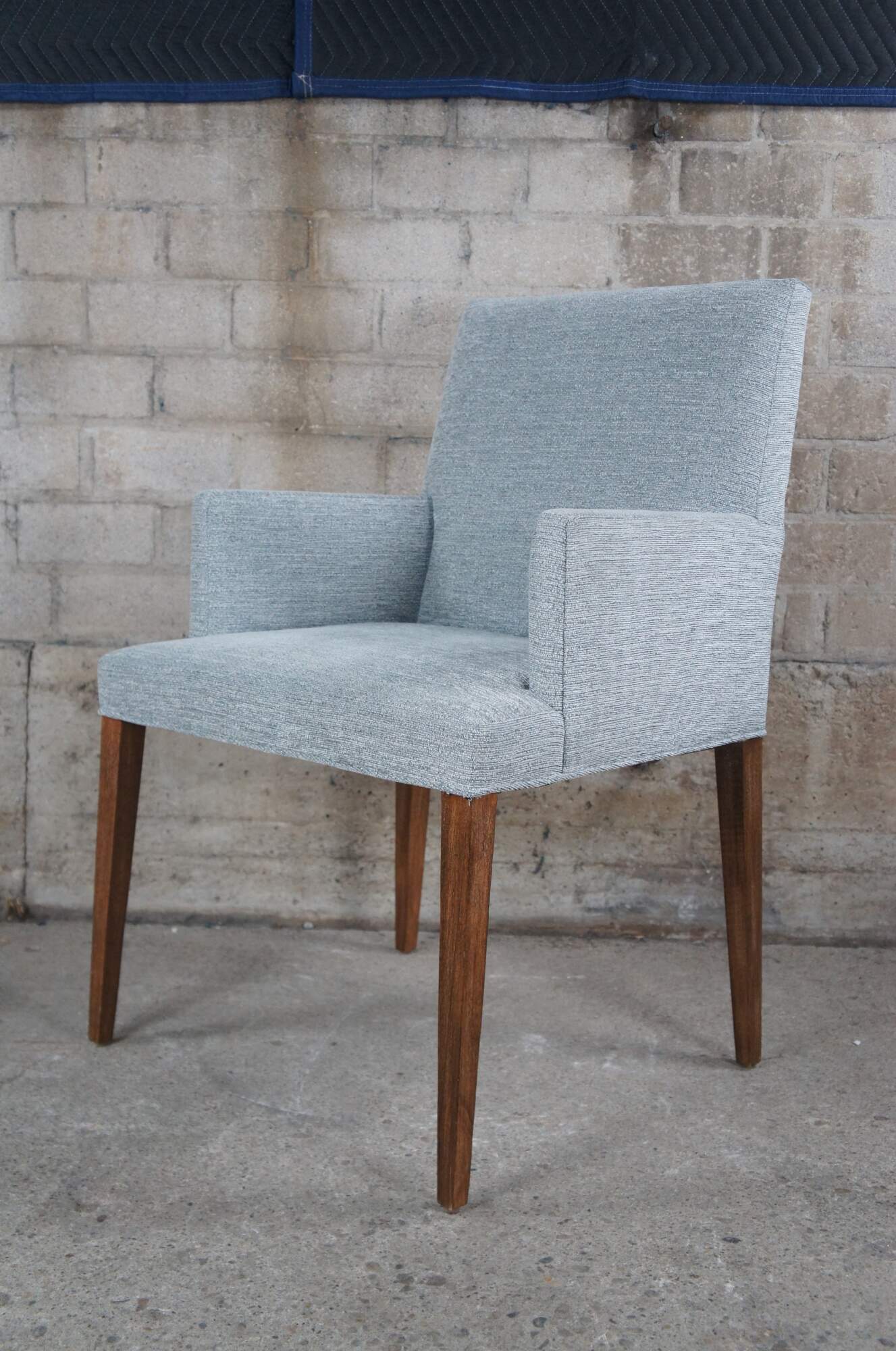 Six vintage dining armchairs featuring modern styling gray upholstery and tapered walnut finished legs