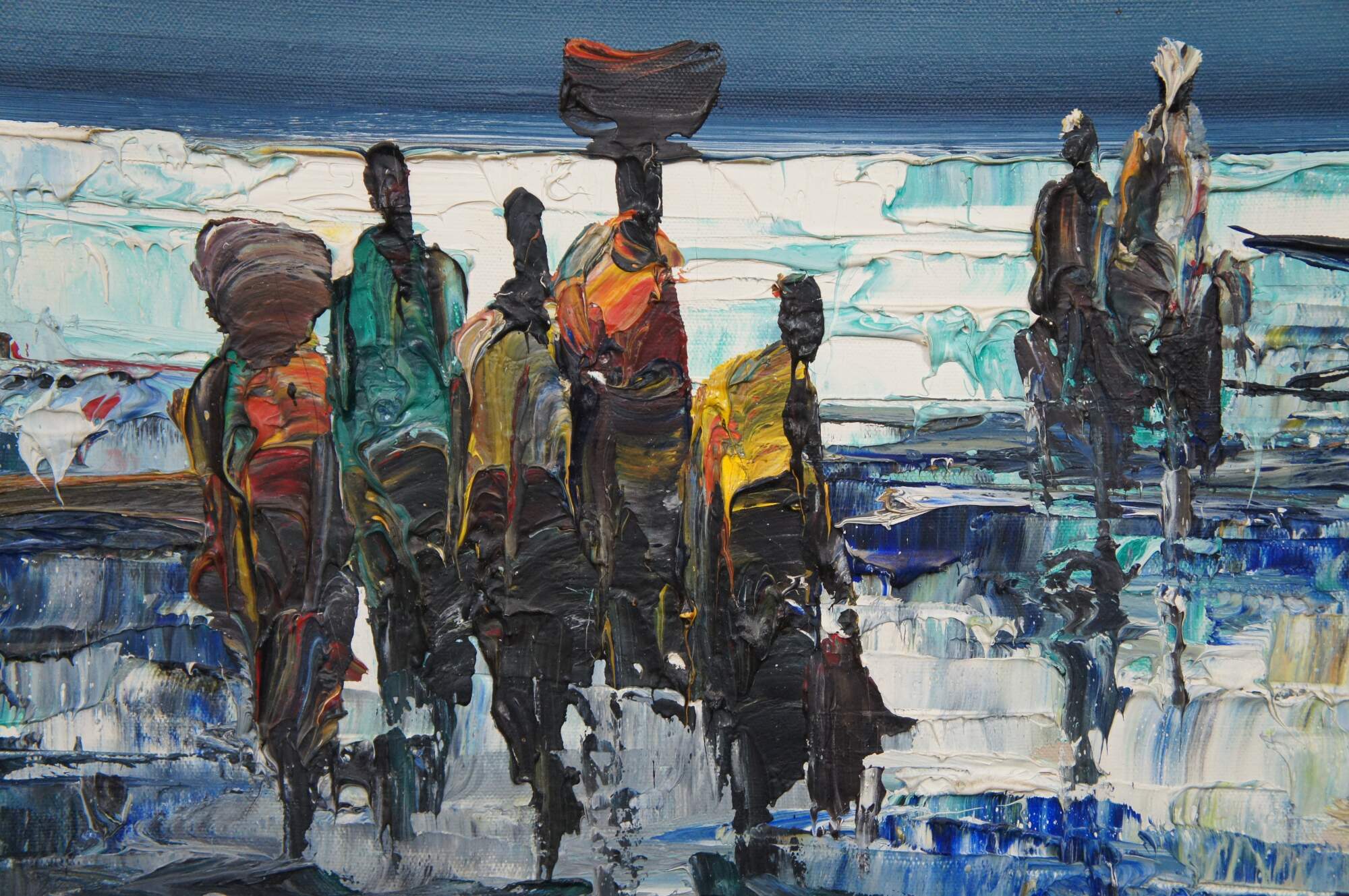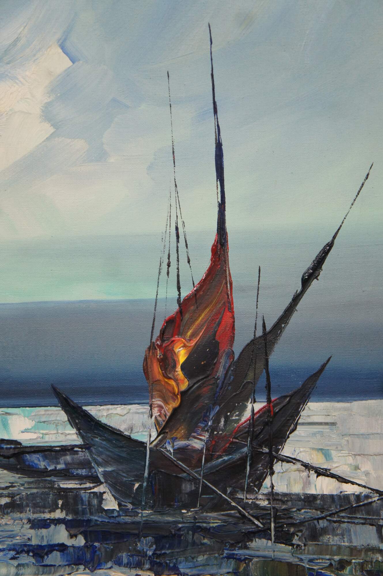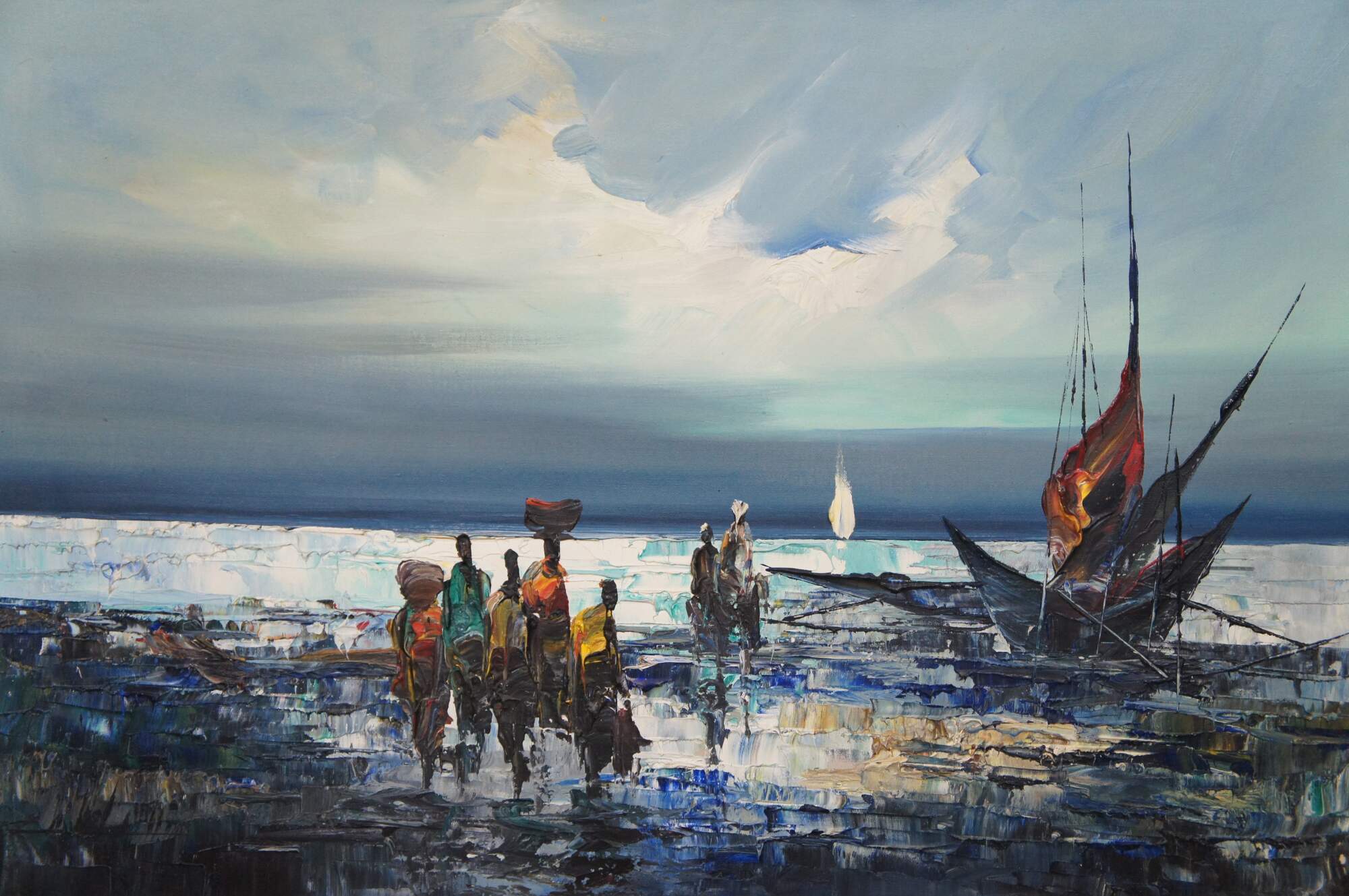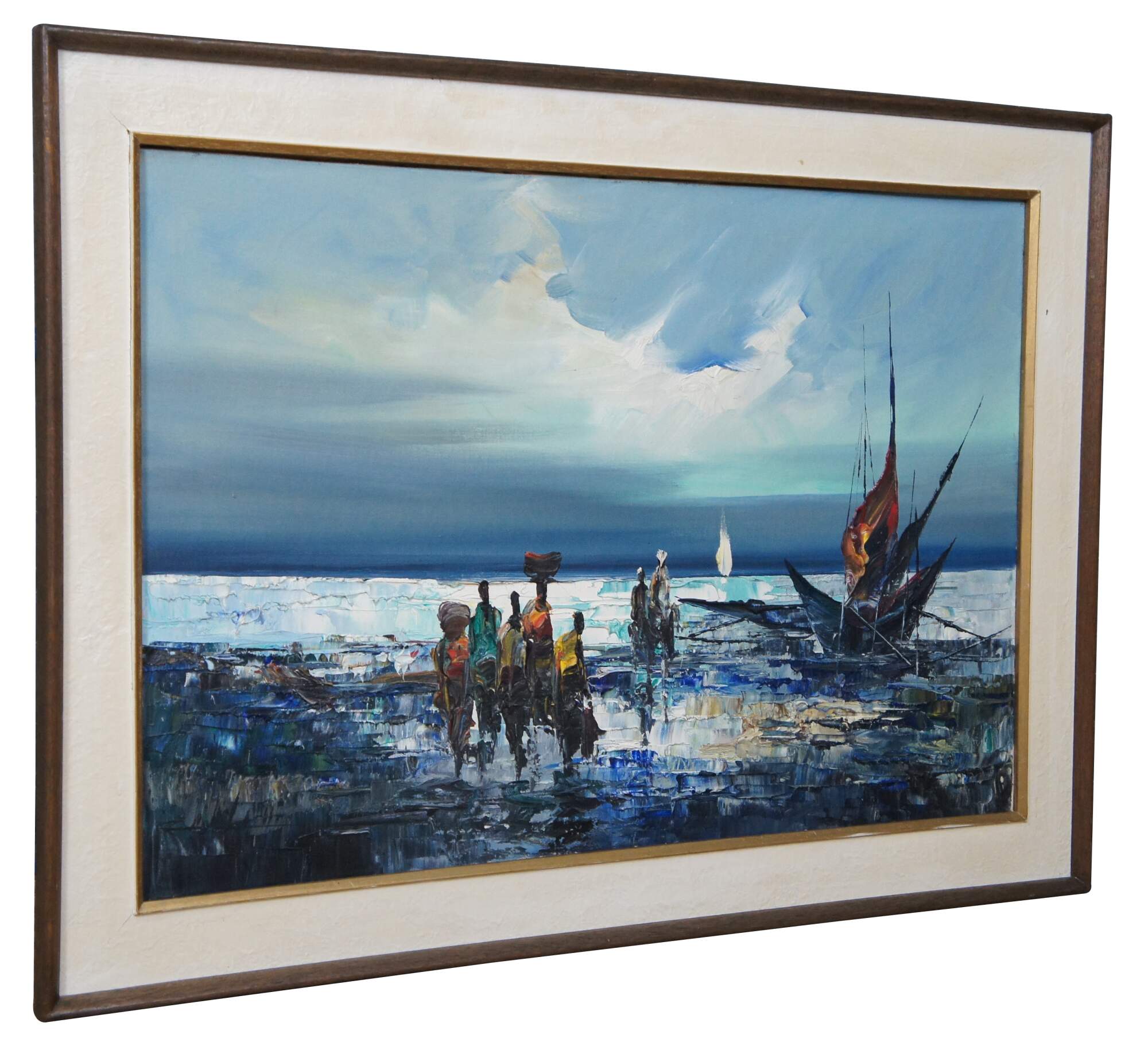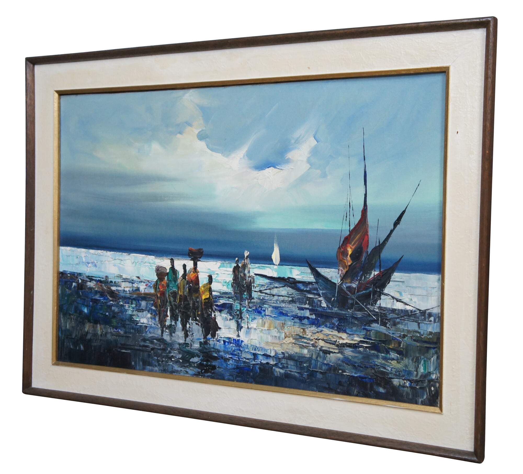 Vintage impressionist nautical / maritime / seascape oil painting on canvas showing African figures in bright clothing, with bundles on their heads, walking through the waves from a small sailboat / boat. Signed lower right.