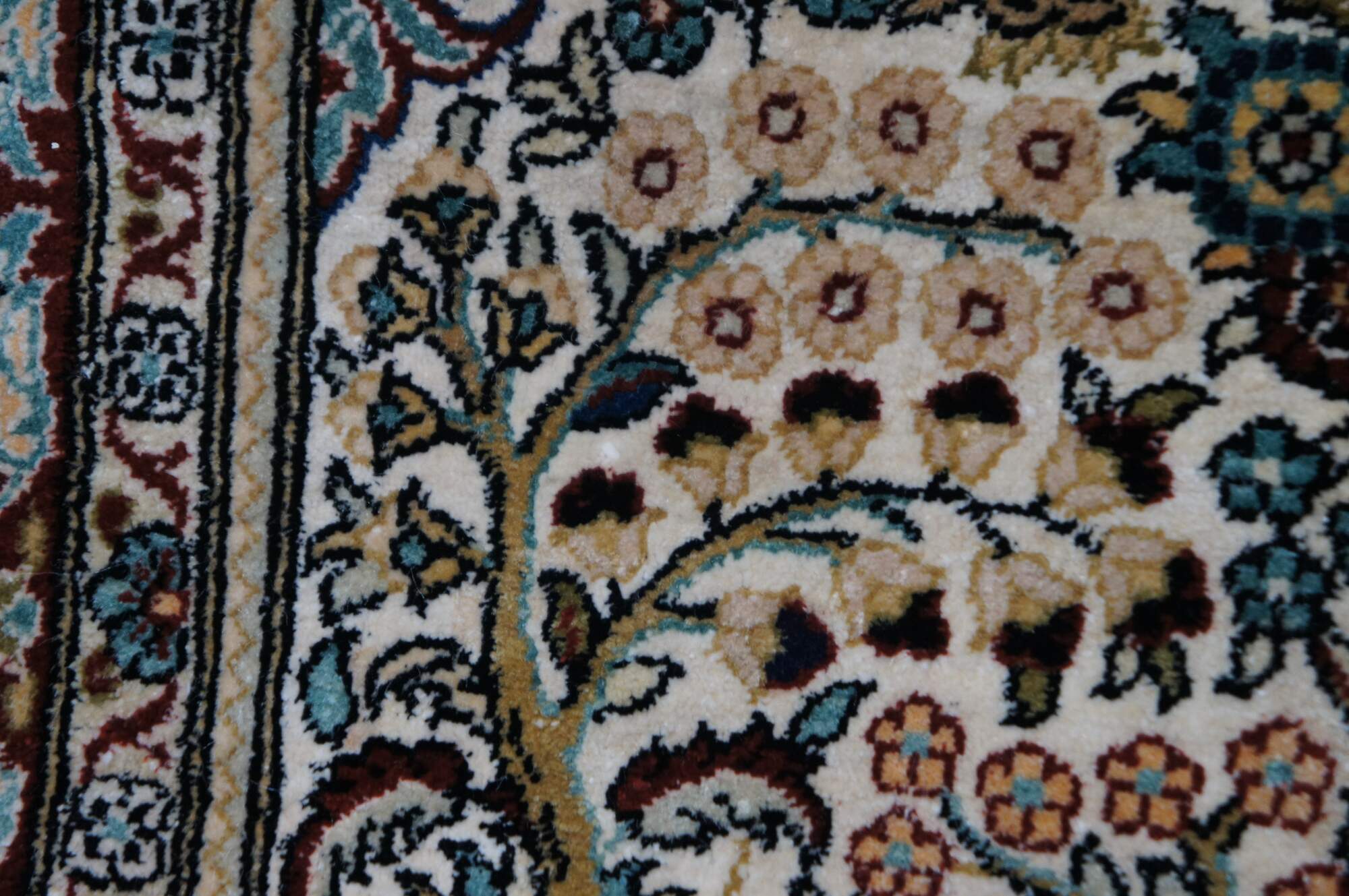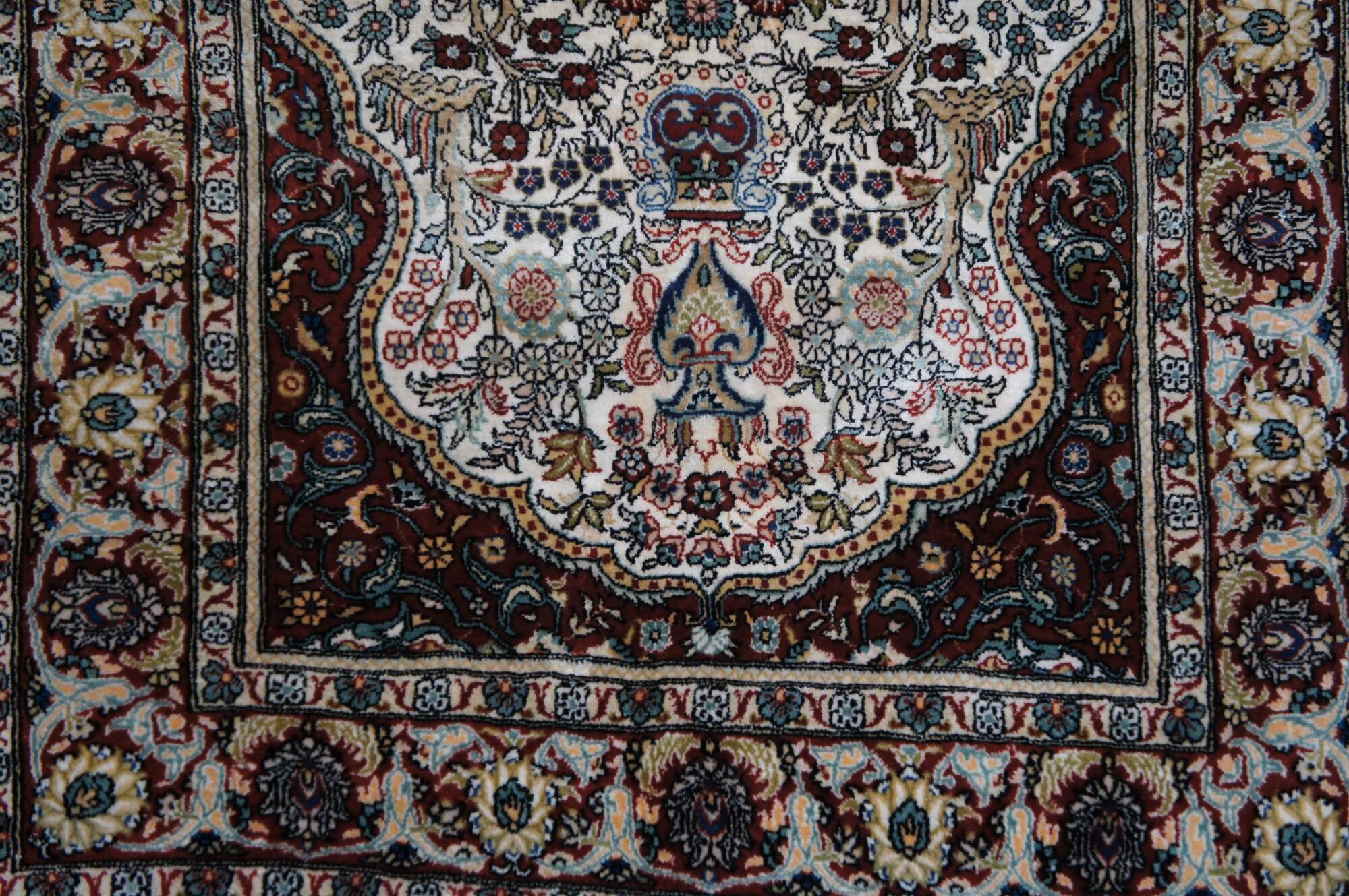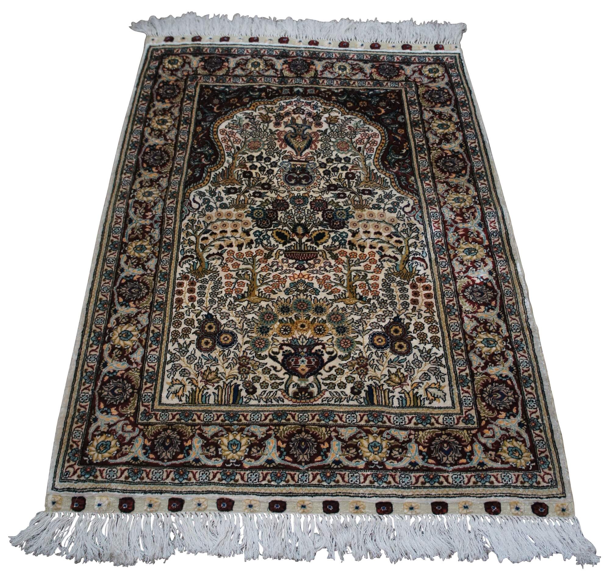 Hand knotted 100% silk prayer rug with fringe, featuring a Tree of Life design formed of vases and bouquets of flowers in burgundy, yellow, and turquoise.