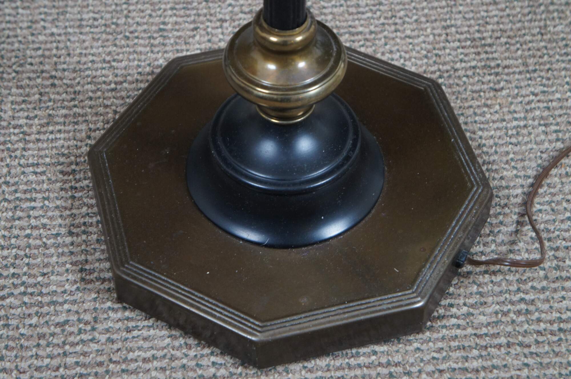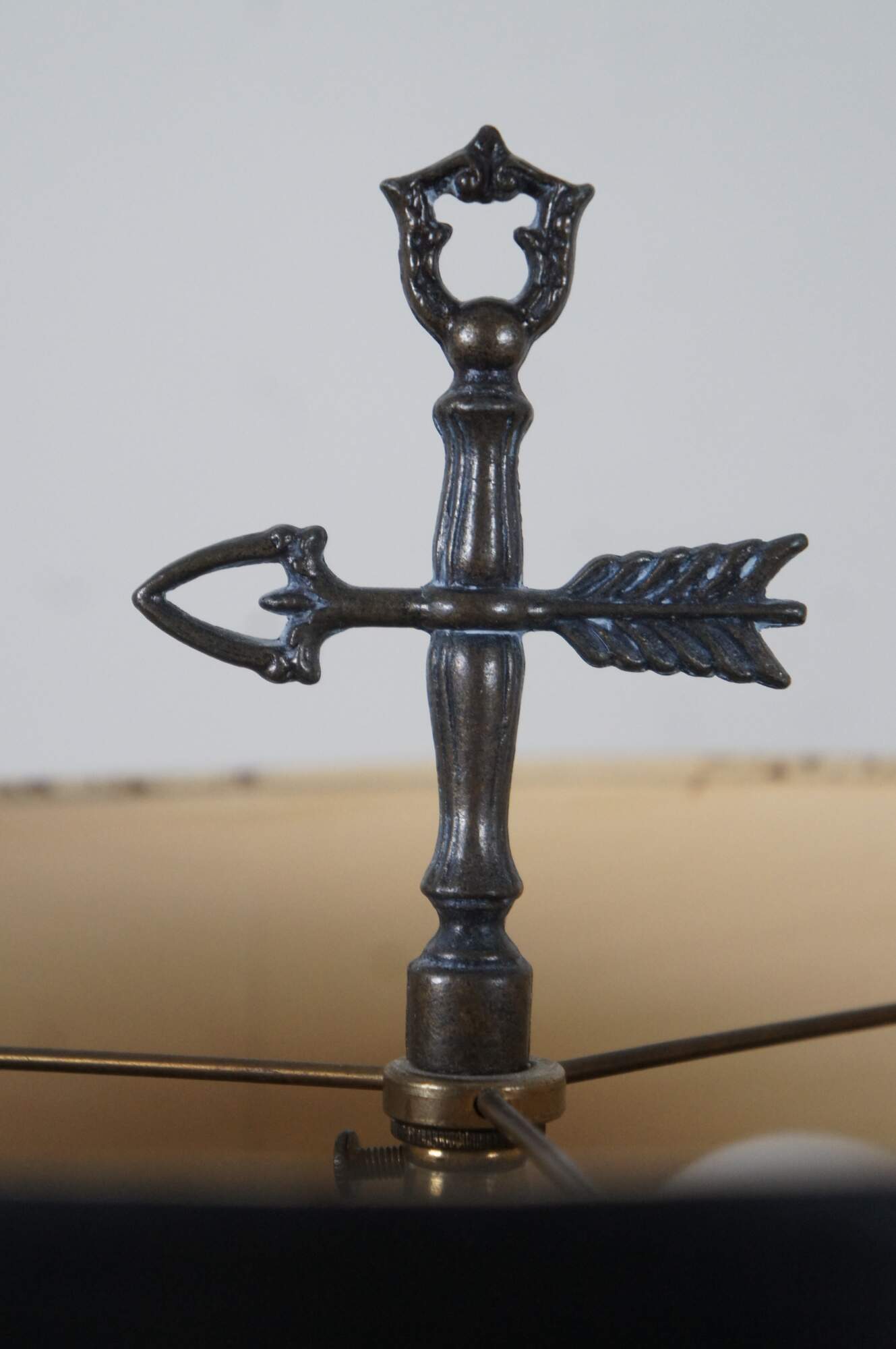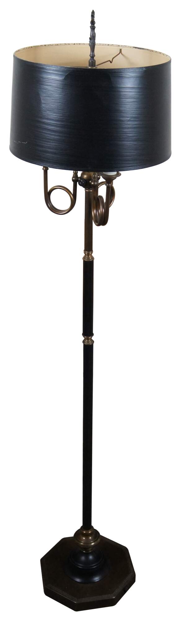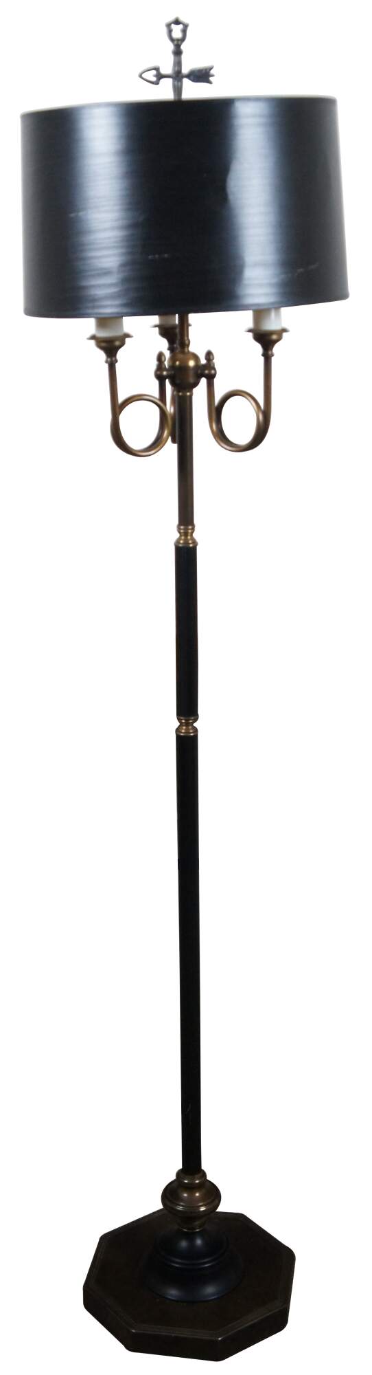 Vintage brass bouillotte style floor lamp with black accents, three French Horn shaped candlestick lights topped with an arrow shaped / weather vane finial.
