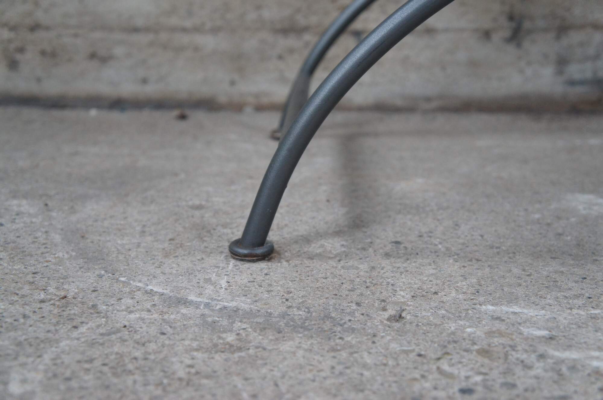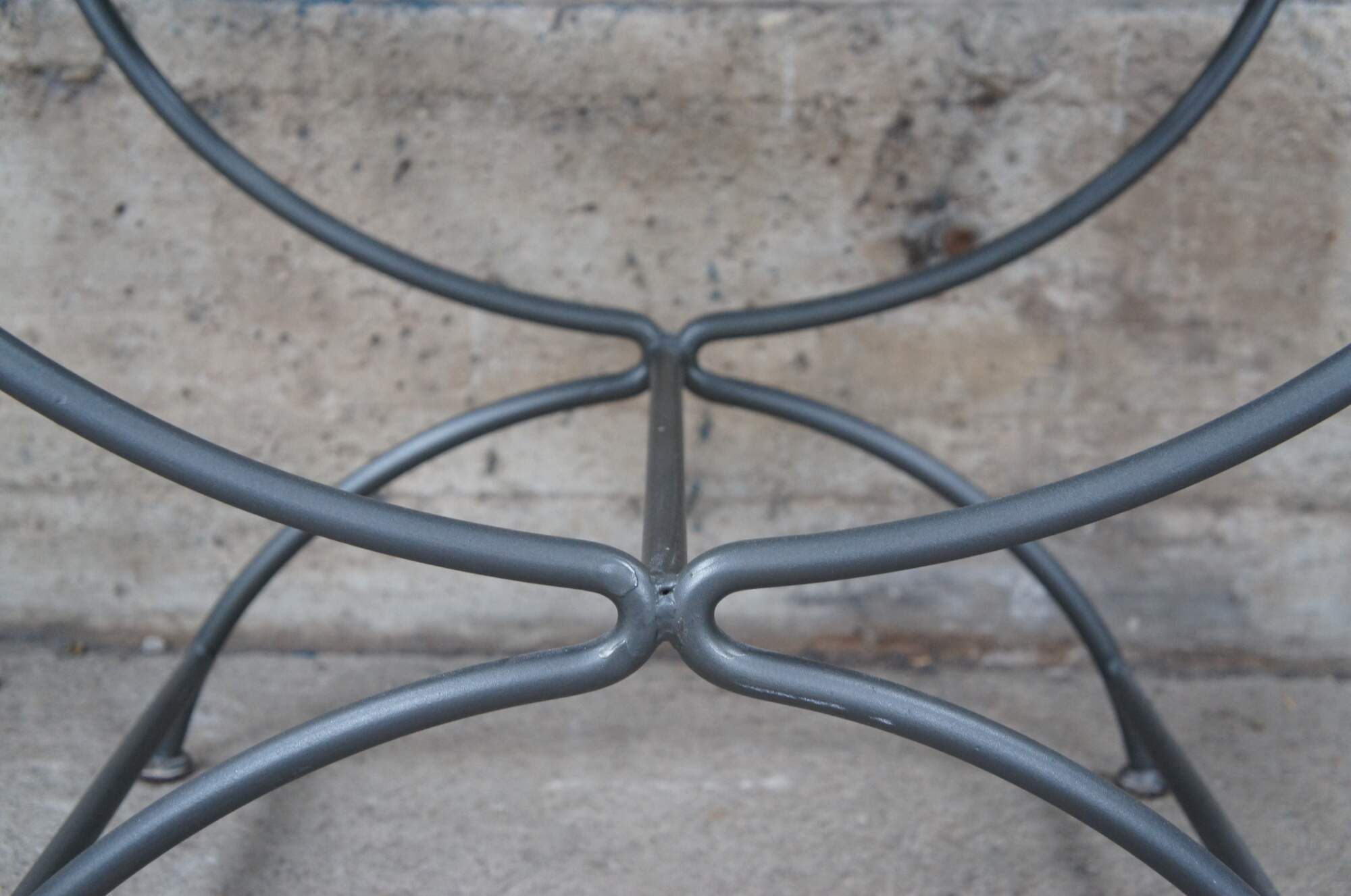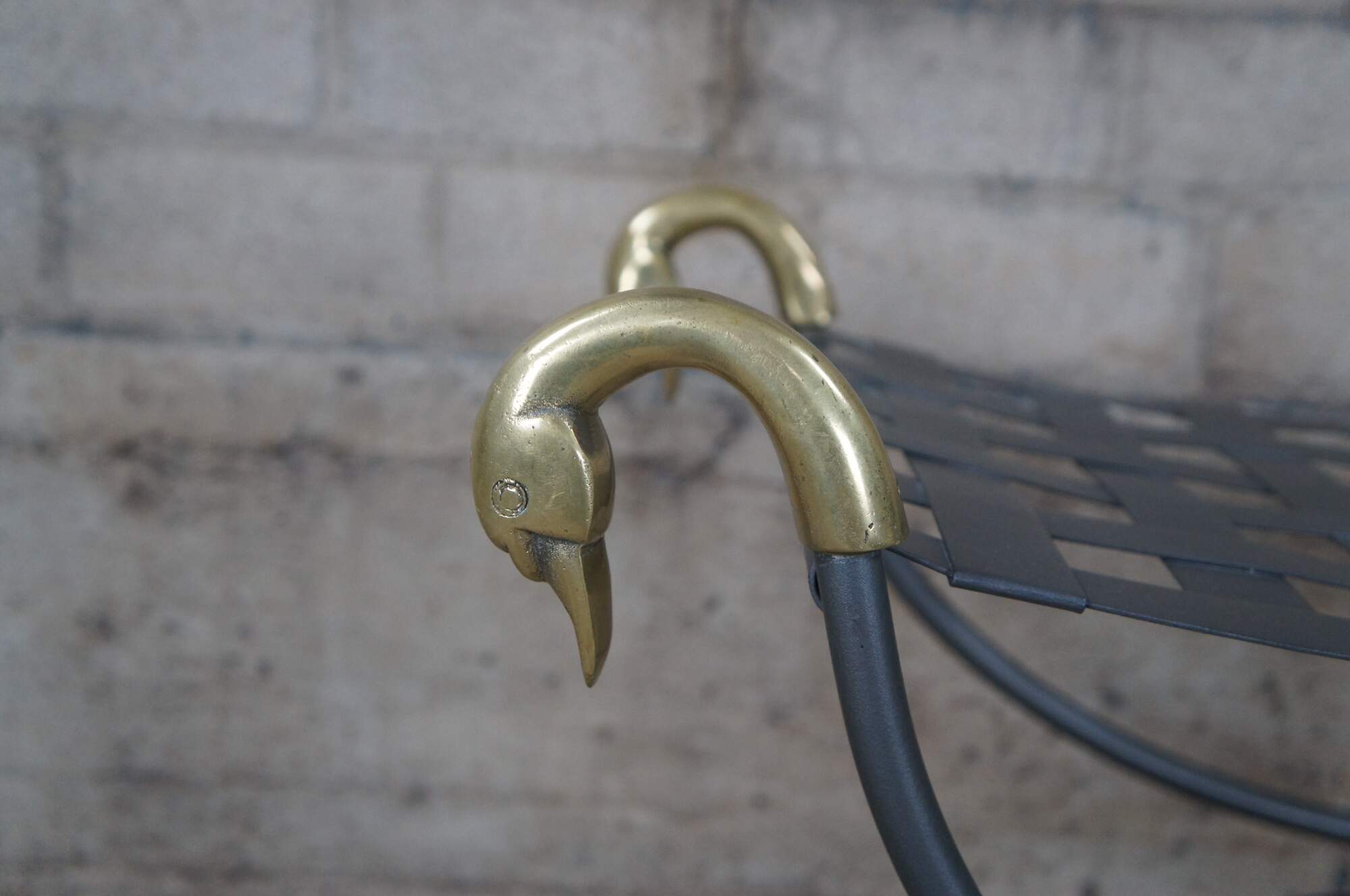 A beautiful iron curule bench stylized after Maison Jansen, circa 1970s. Features a woven metal seat and figural brass swan heads.