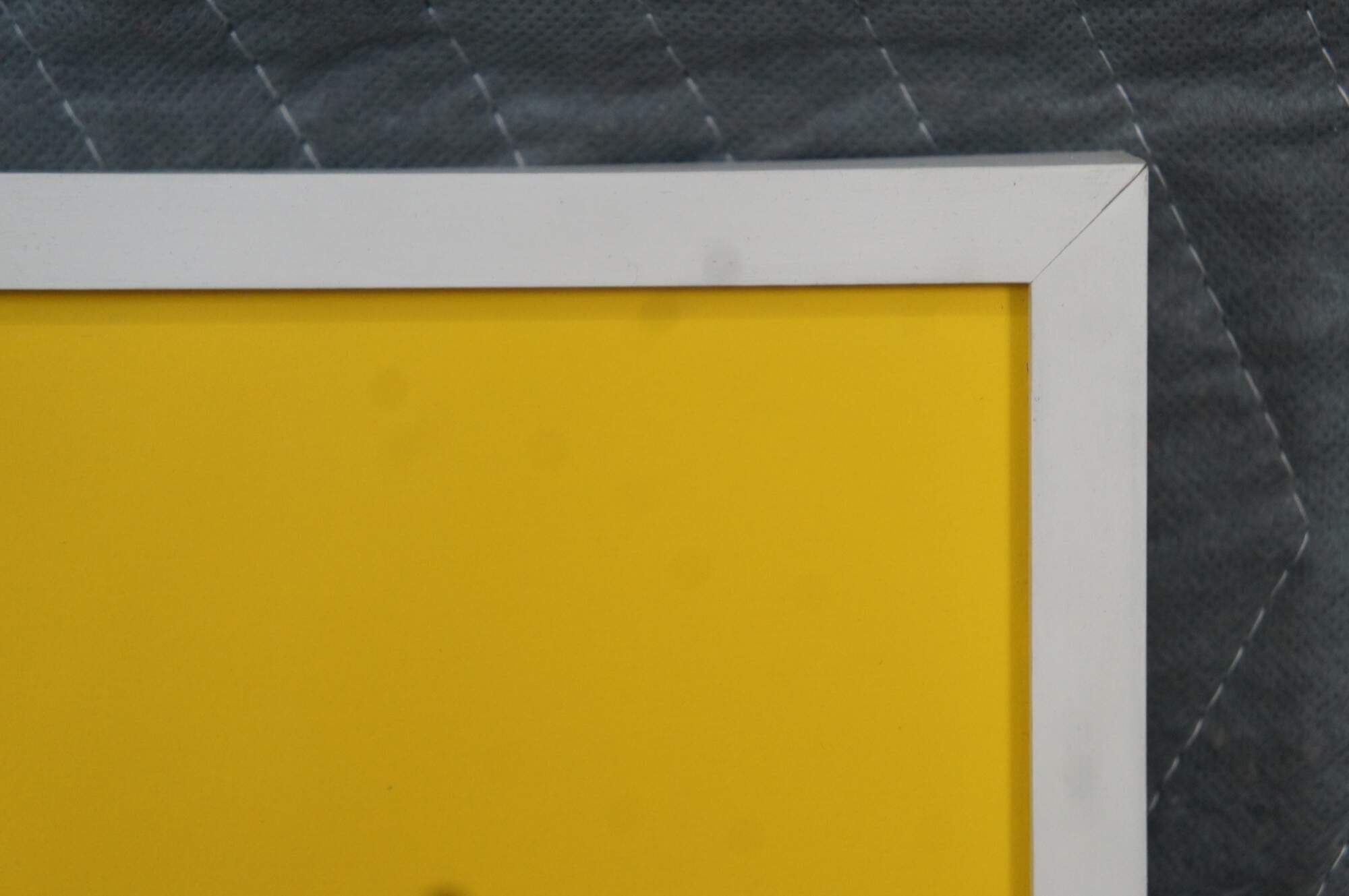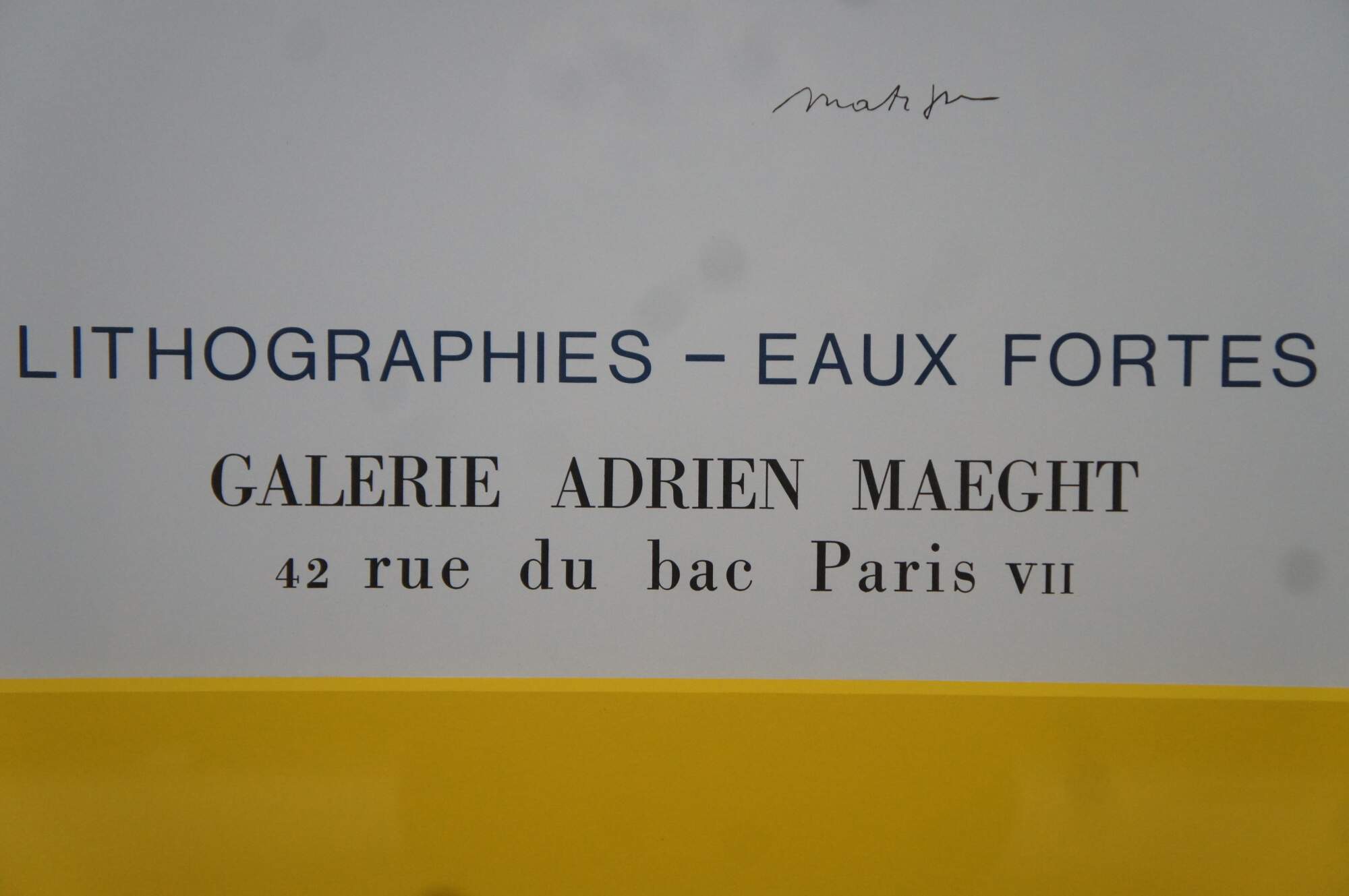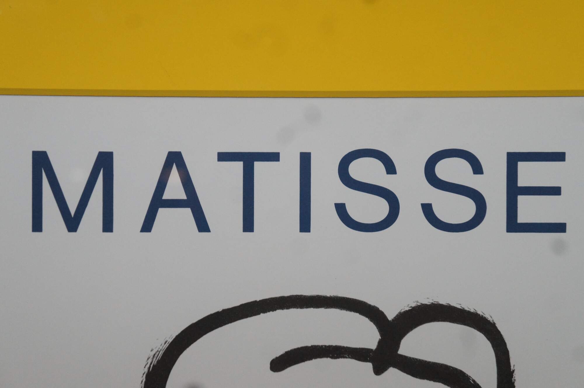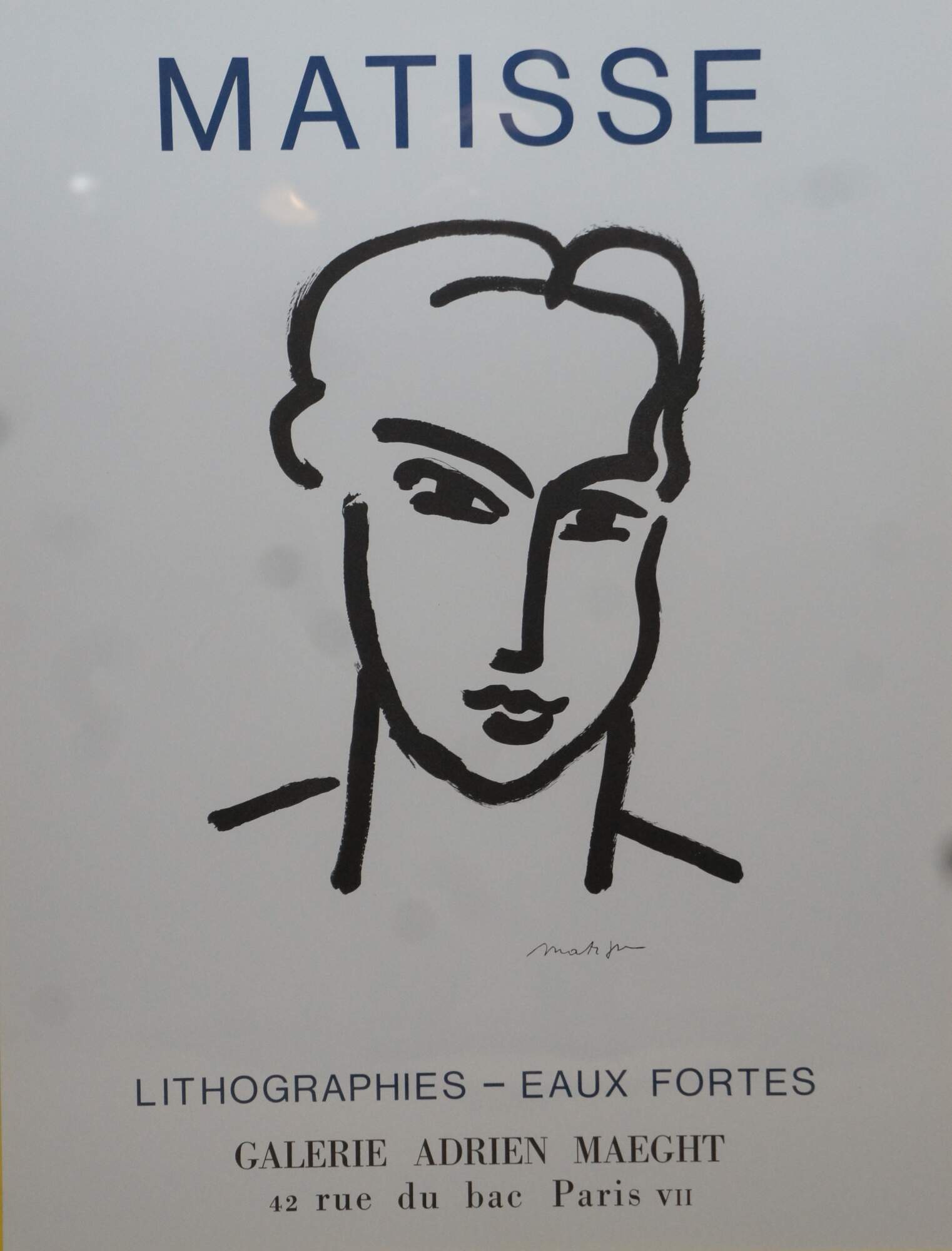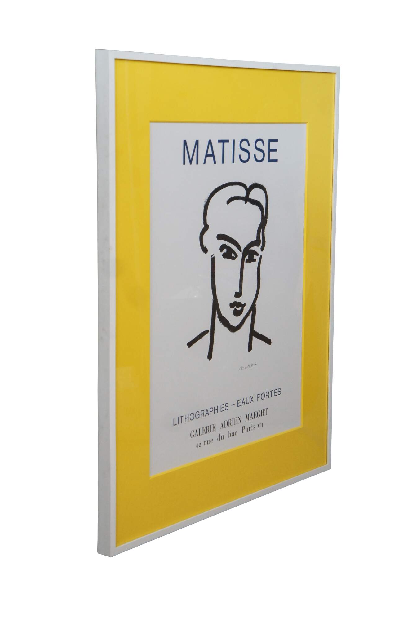 Framed poster print advertising the 1964 exhibition of Matisse – Lithographies – Eux Fortes at the Galerie Adrien Maeght, featuring Grande Tete de Katia. Framed in white with bright yellow mat.