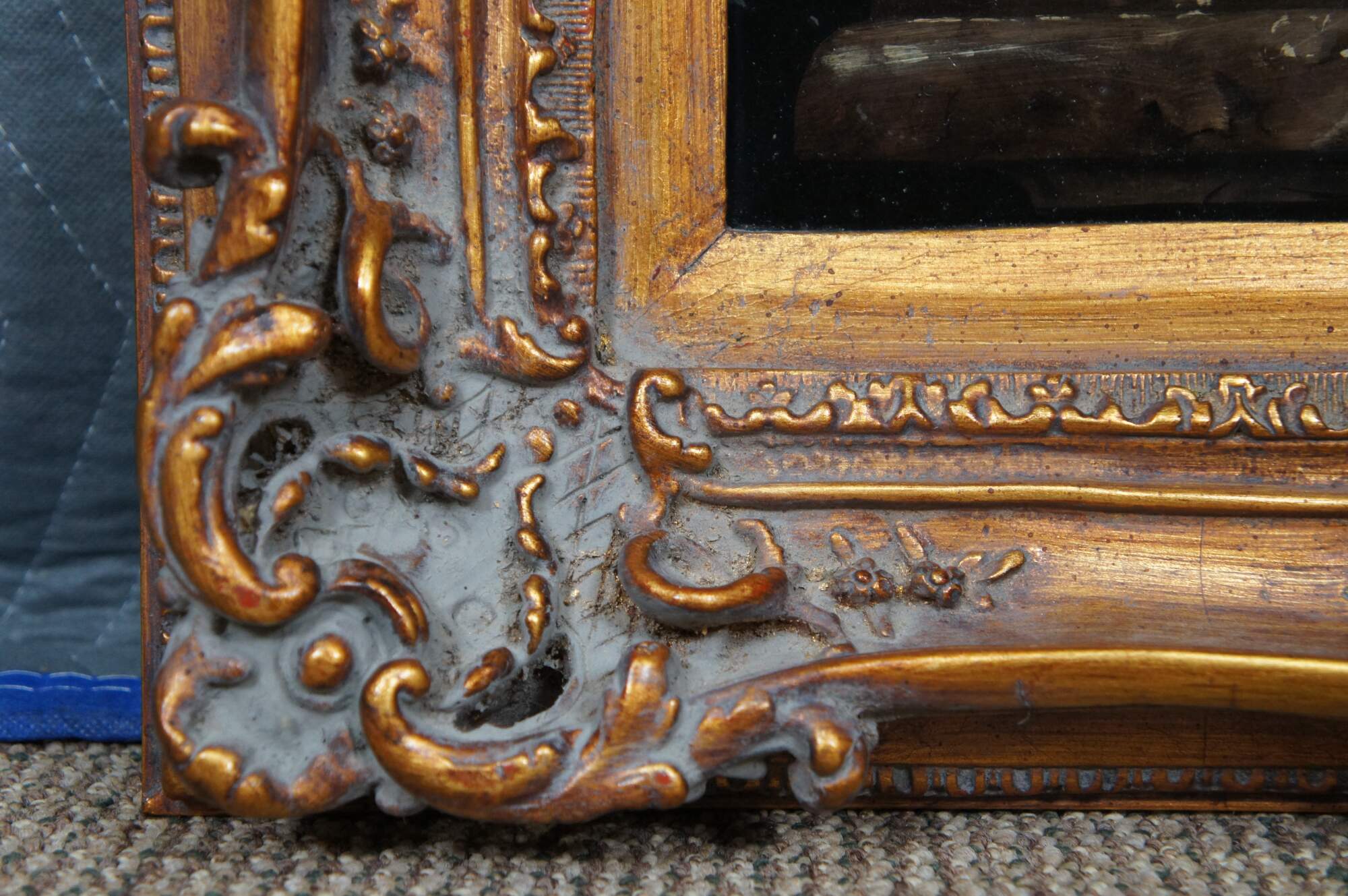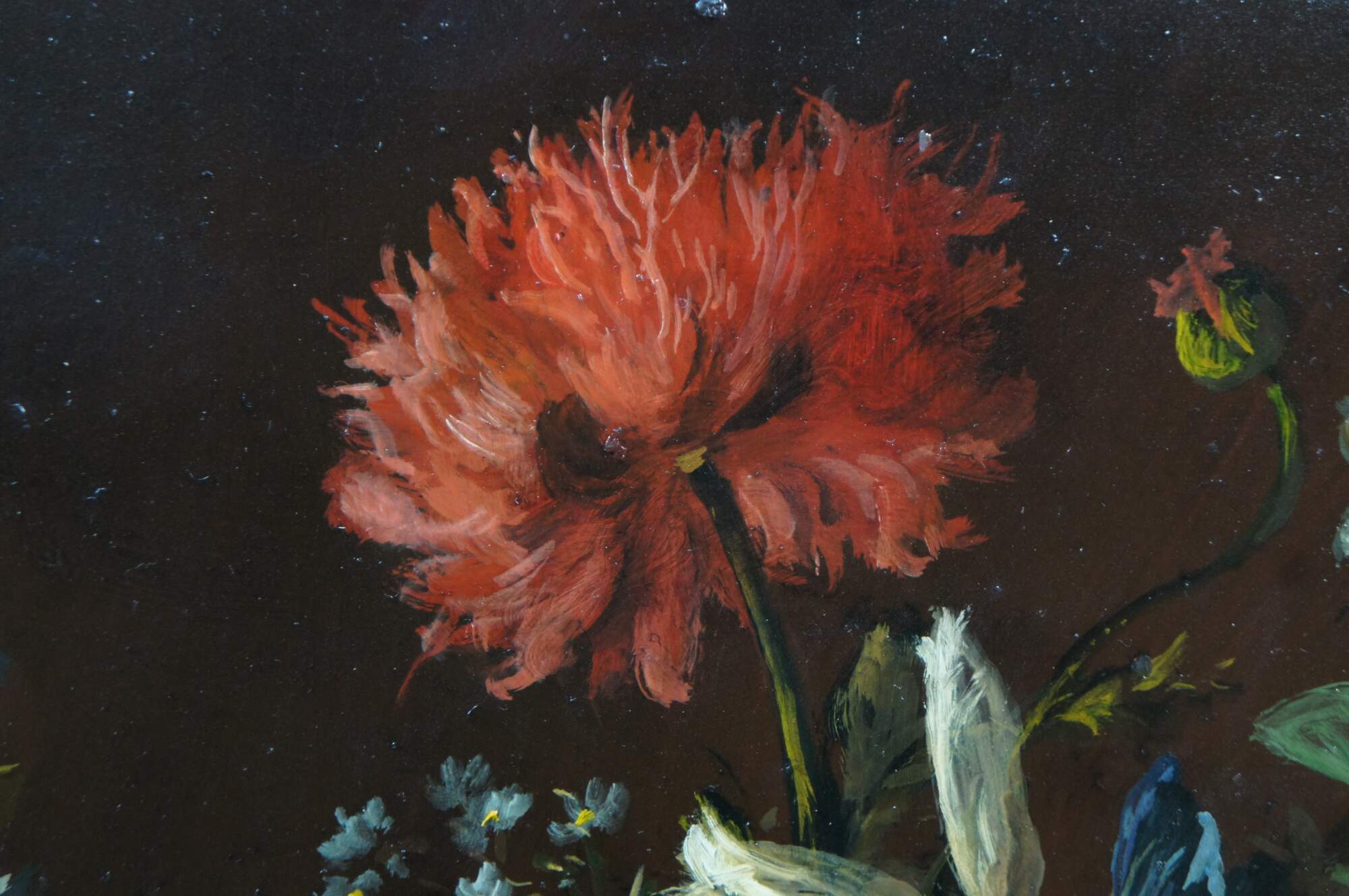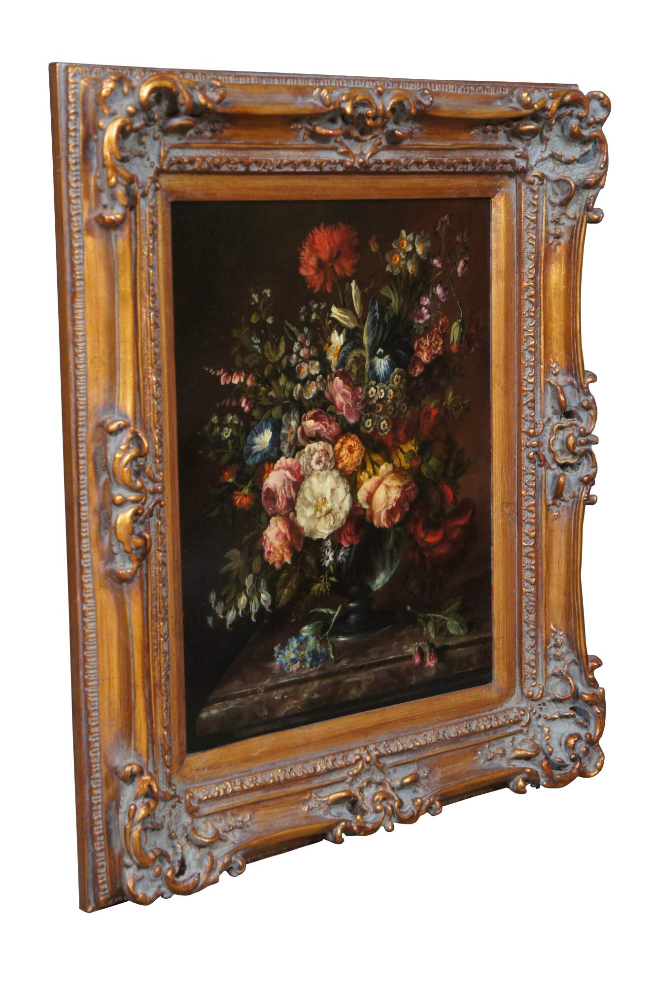 Vintage L. Szabó oil on board still life painting of an extravagant bouquet of flowers in a vase.