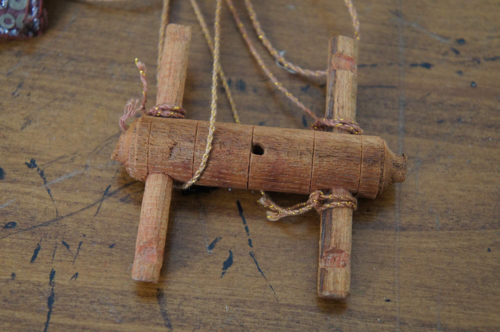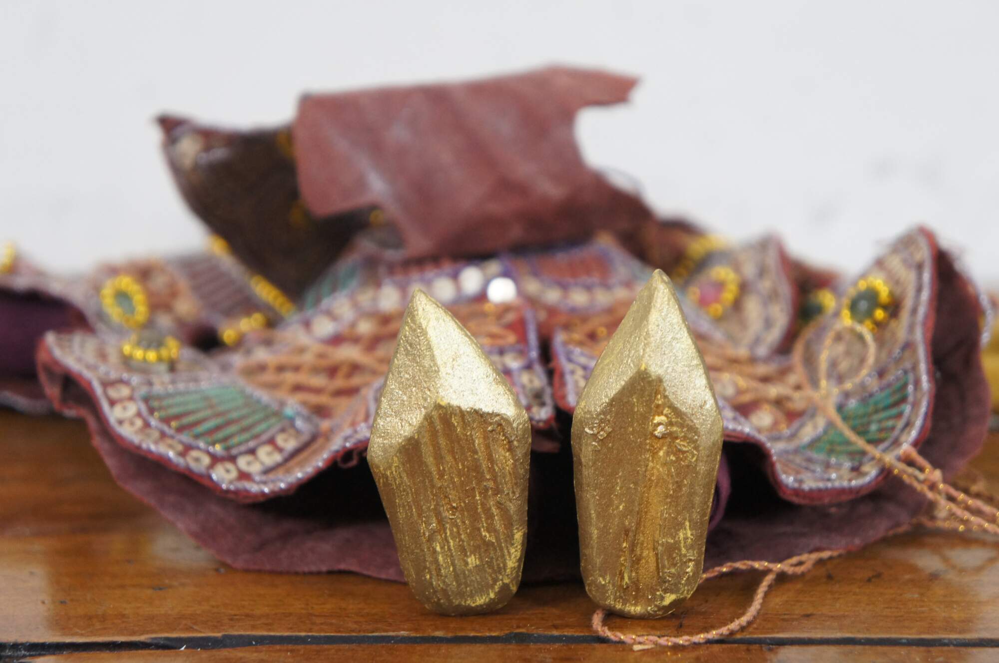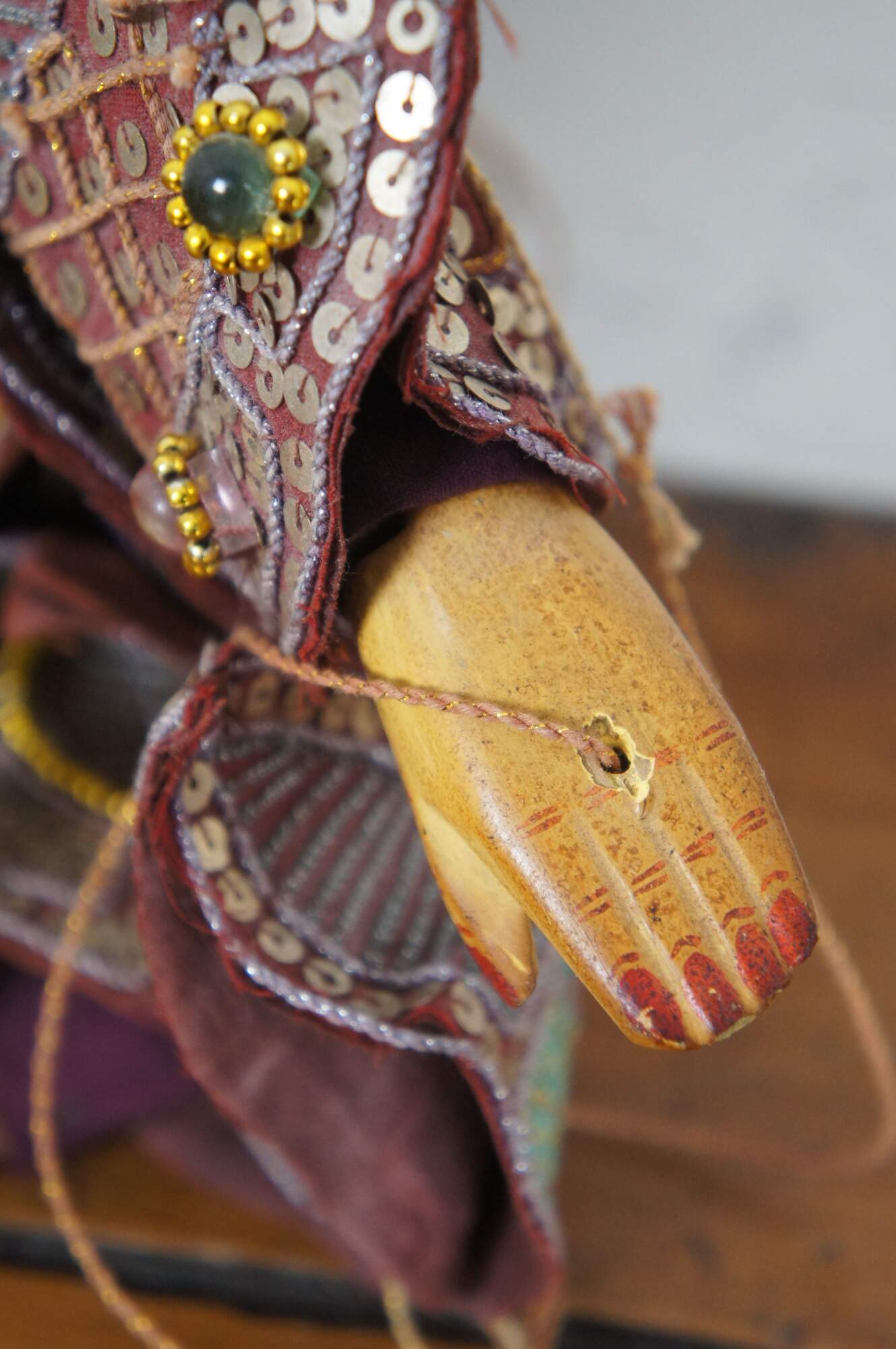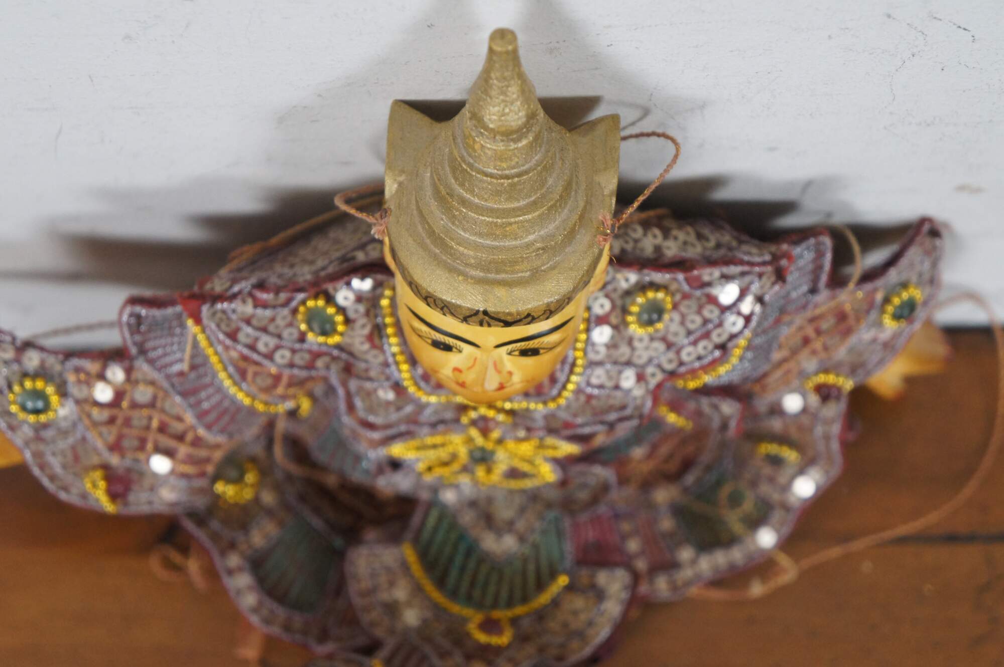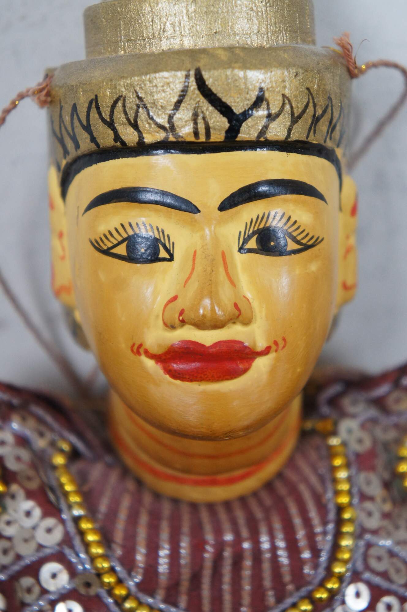 Vintage hand crafted, painted wooden marionette style puppet depicting Tha Gyar Min, King of the Celestial Beings of Myanmar / Burmese theater, fashioned with golden features and an intricately sequined outfit.