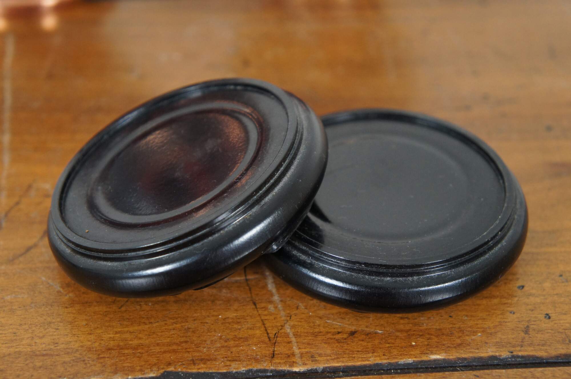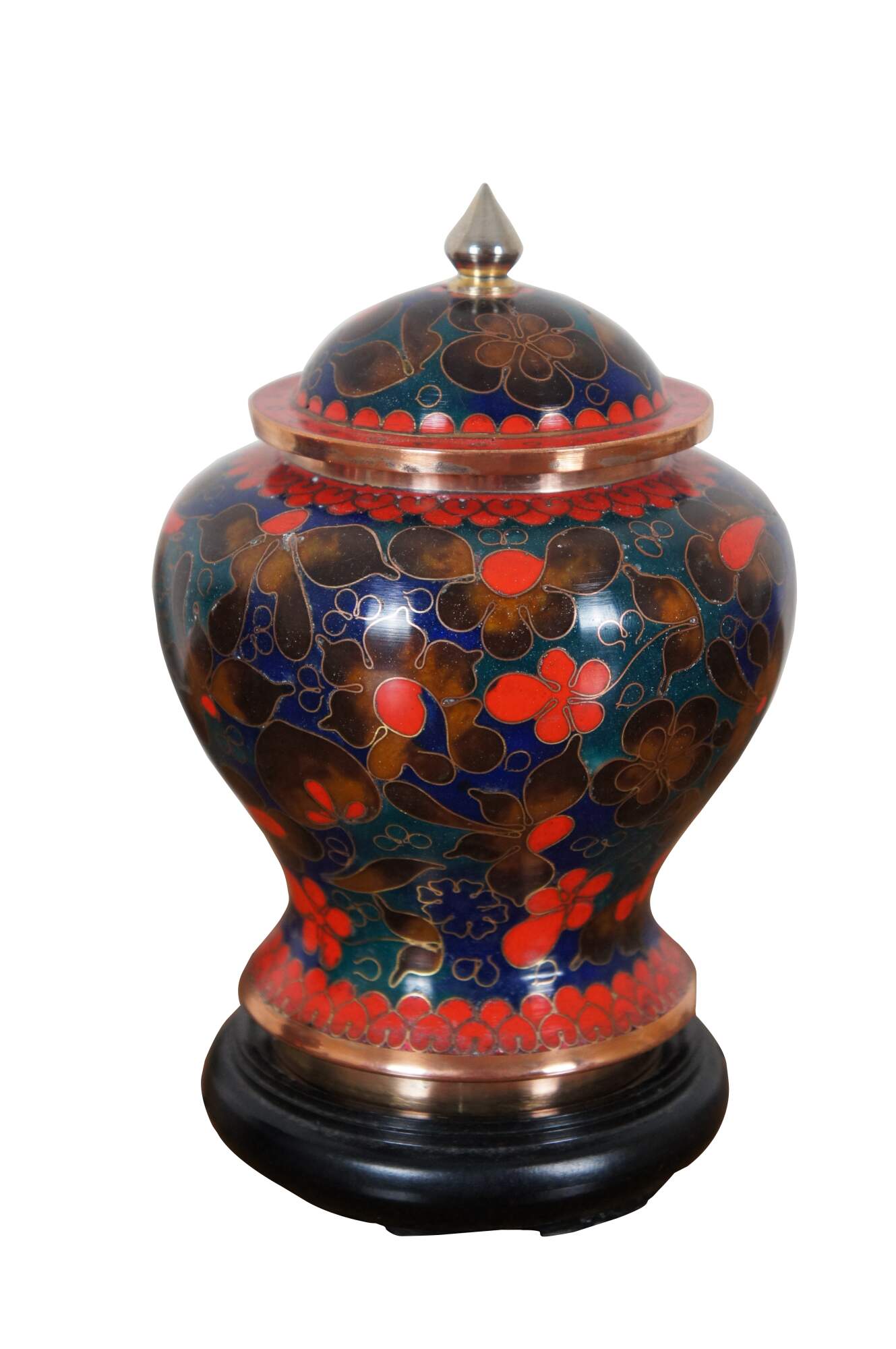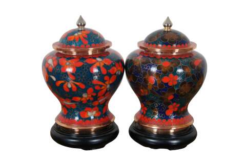 Two vintage Robert Kuo's cloisonne enameled jars or urns featuring a field of blue (cobalt / teal) with red / orange florals and heart border. KUO's China Cloison. Bases / stands included.