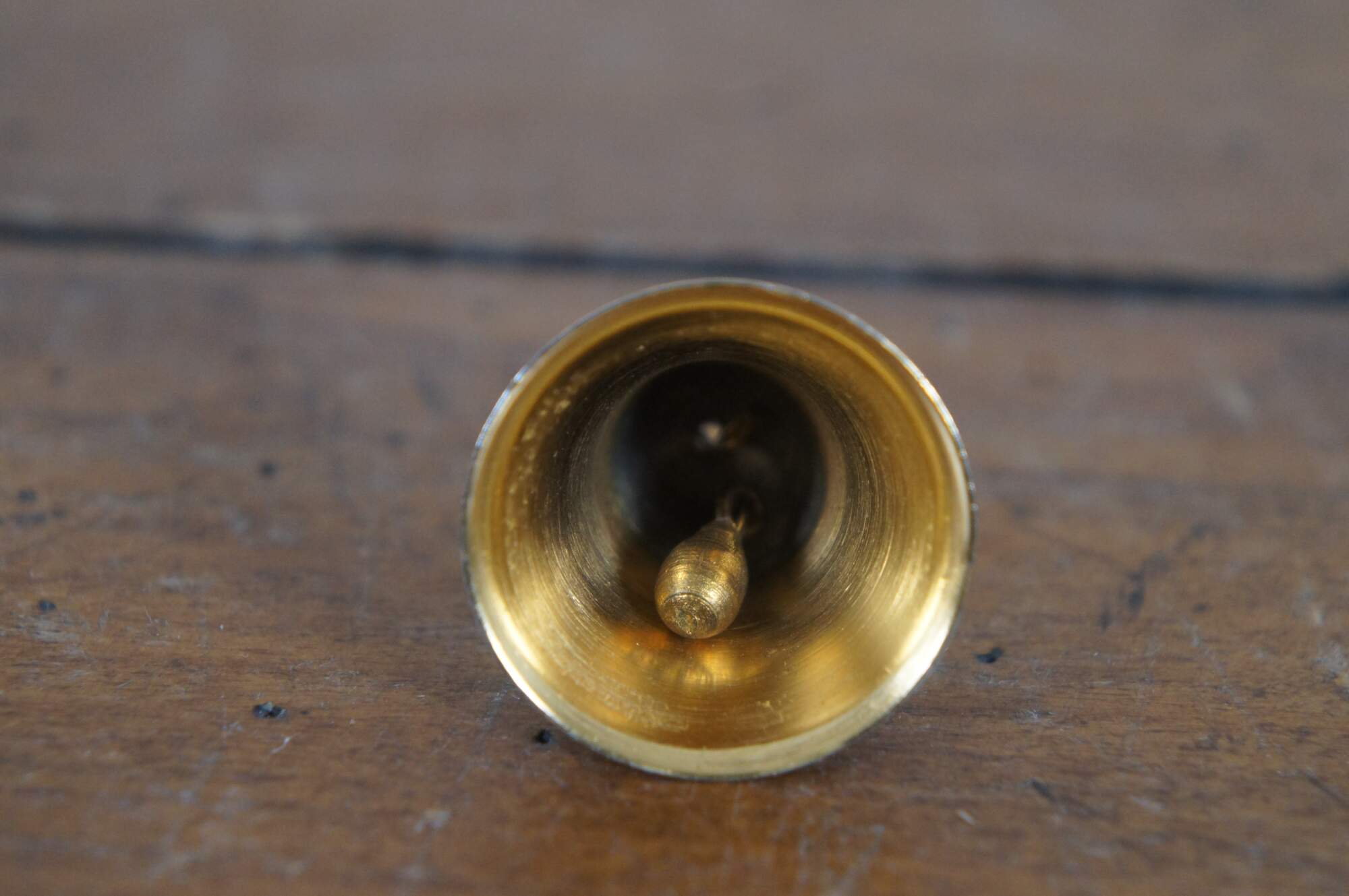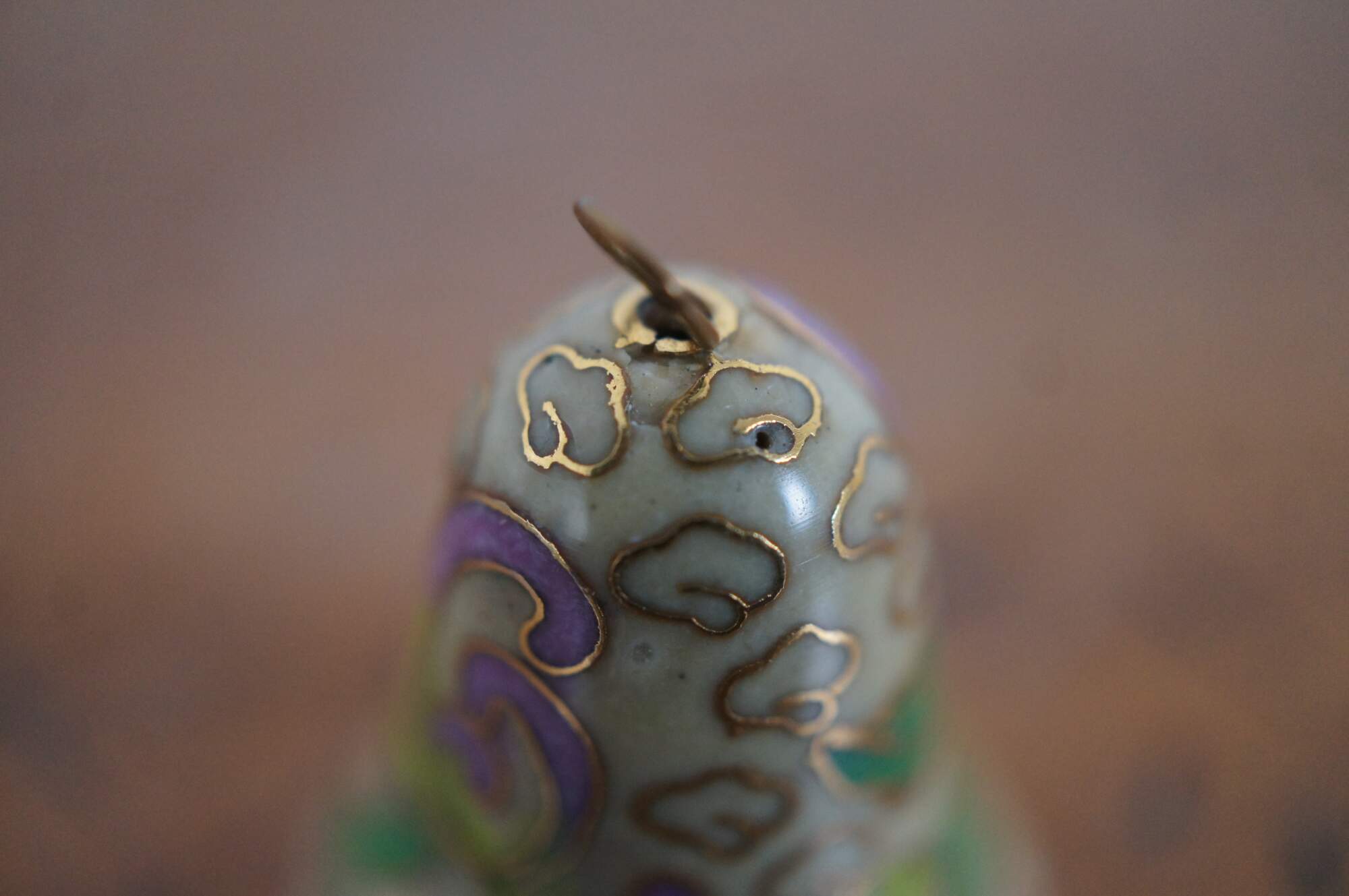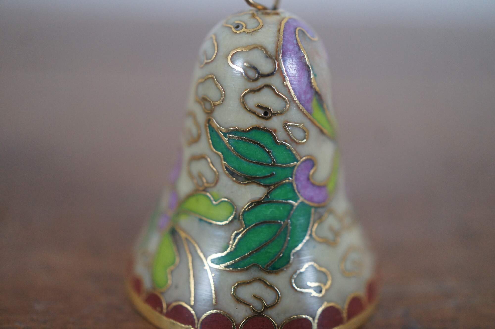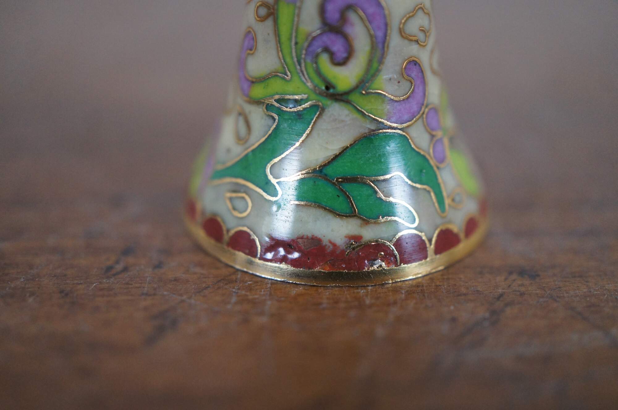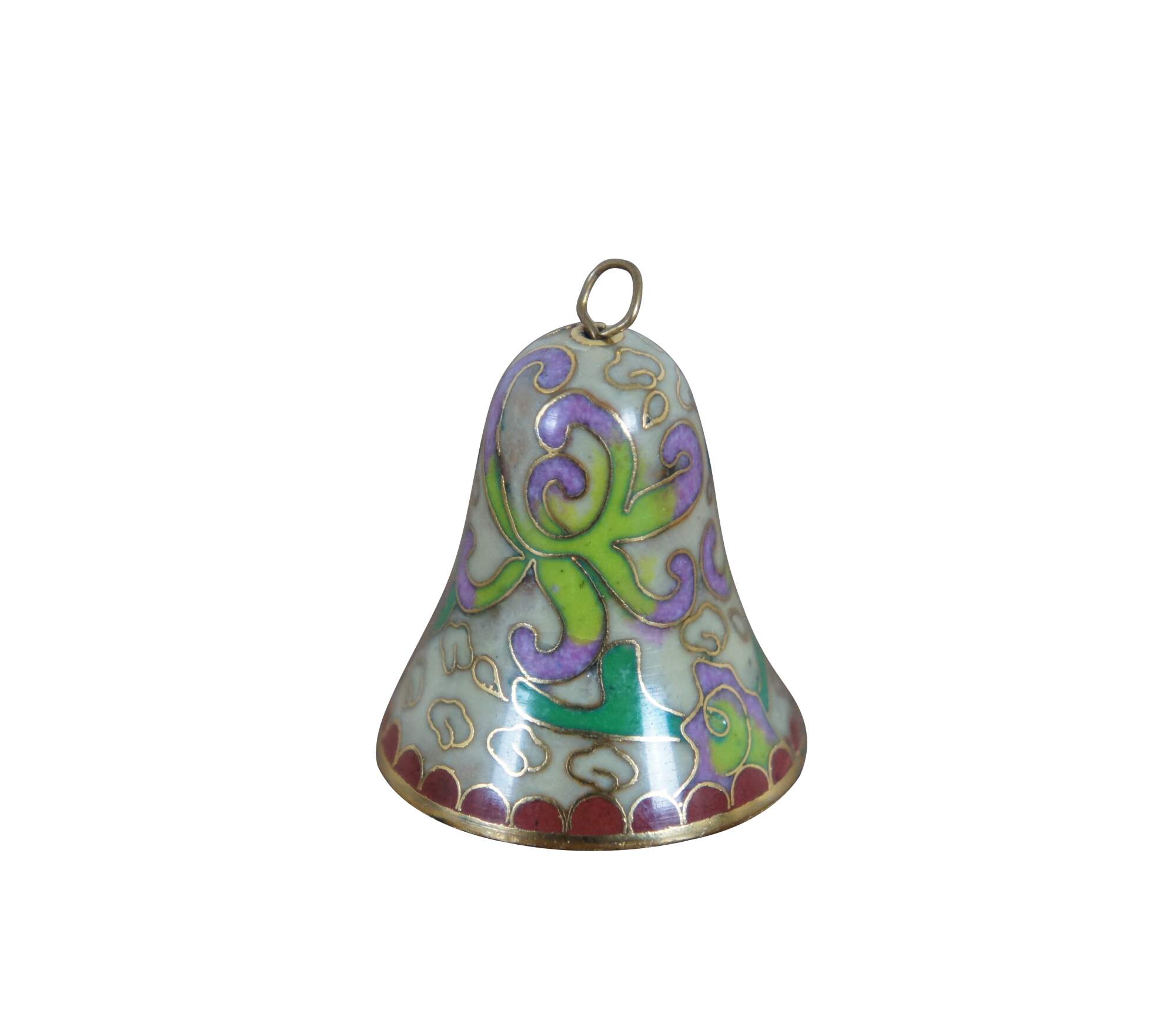 Vintage Chinese cloisonne enamel on brass bell featuring a design of swirling purple and green flowers on a beige backdrop of clouds and red scalloped trim.