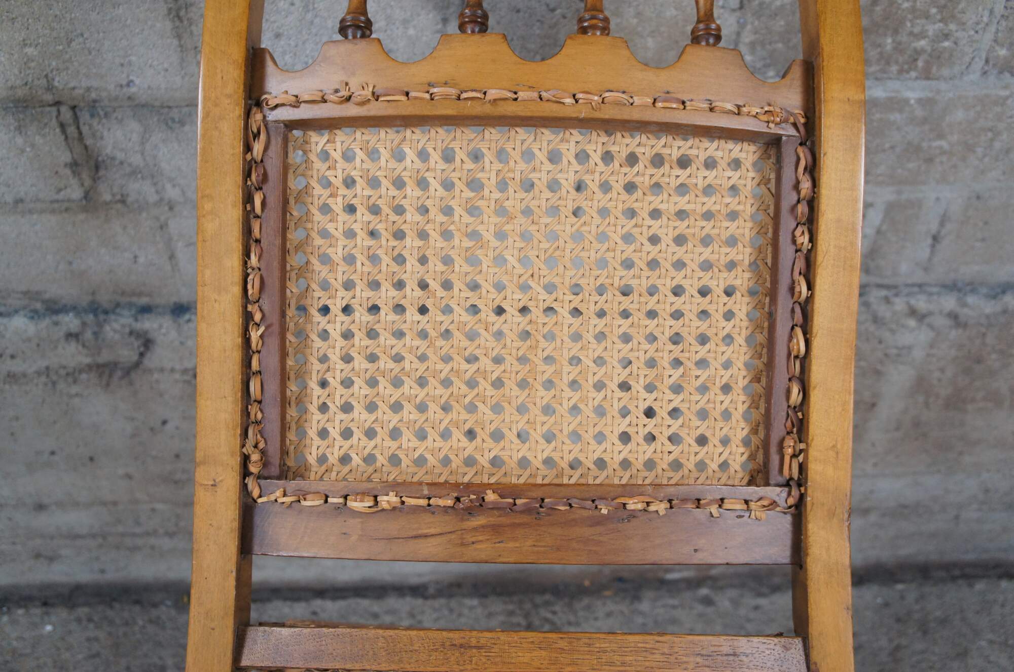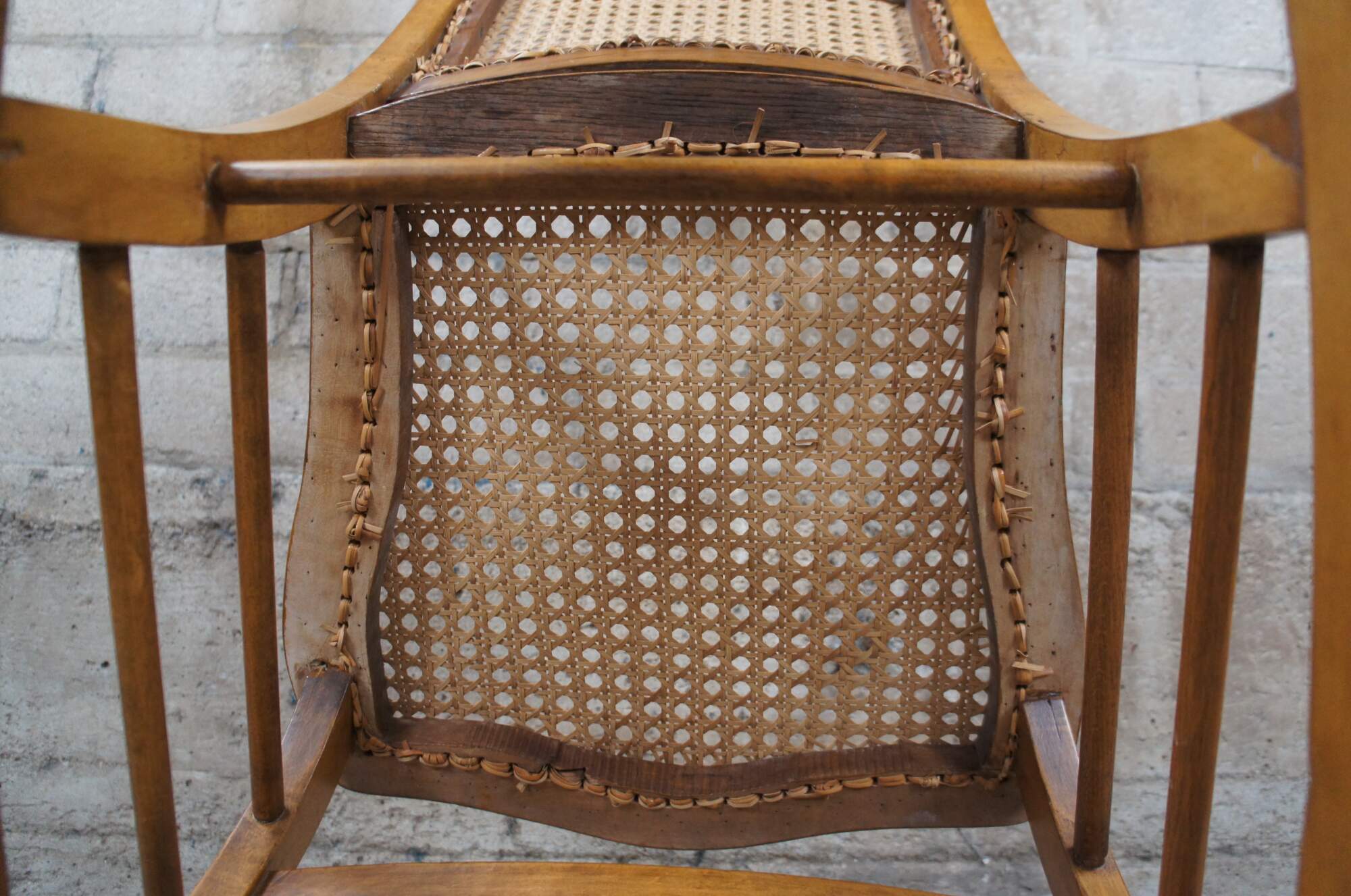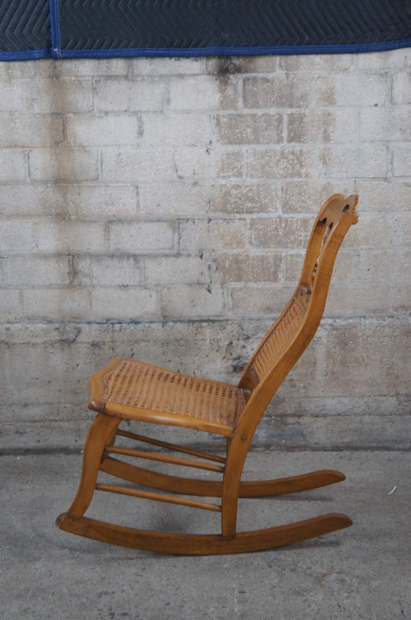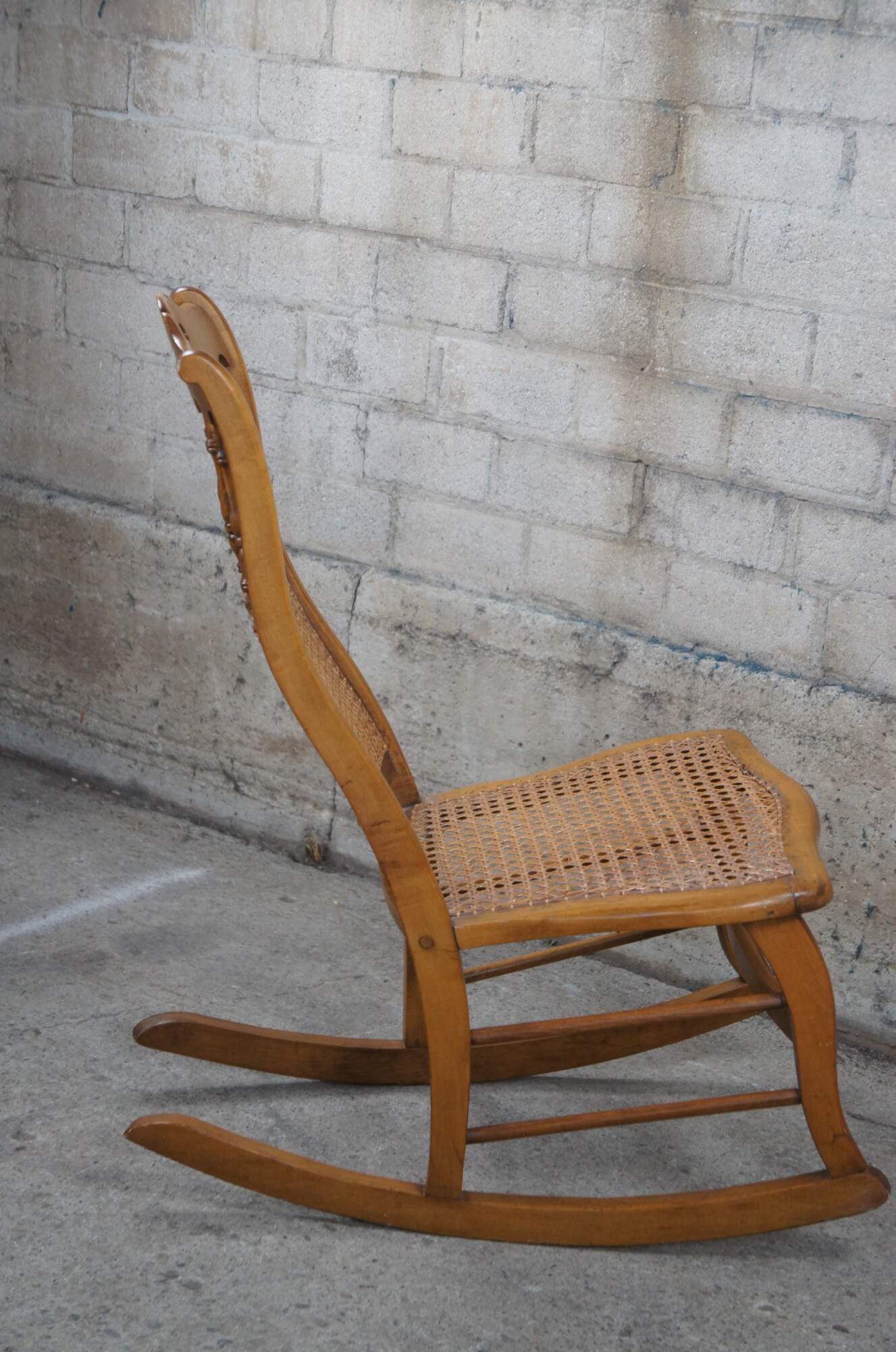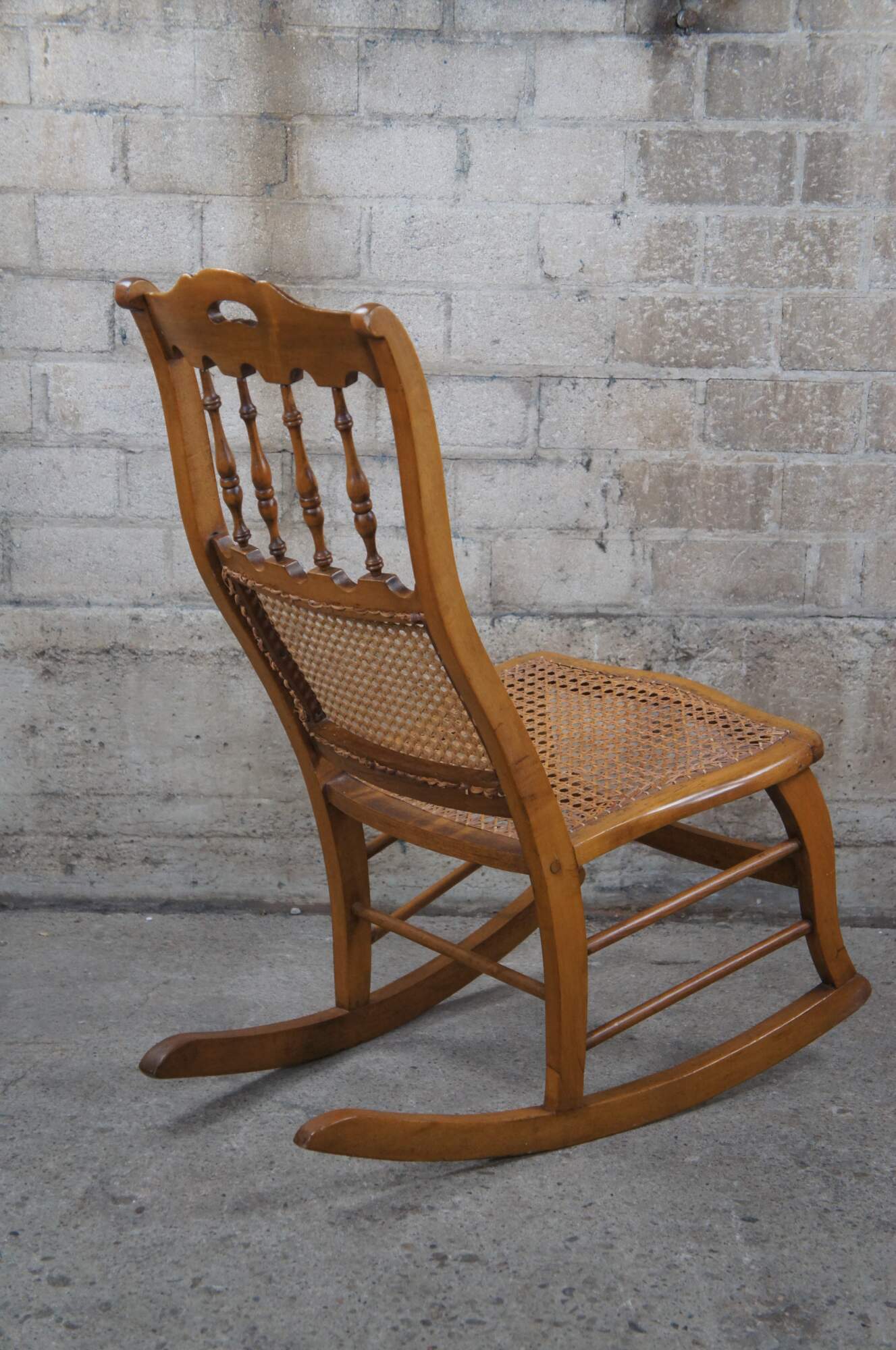 A quaint early American rocking chair, circa 1900s. Made from maple with a spindle back centered between arcade like trim. The chair features a cane seat and back.