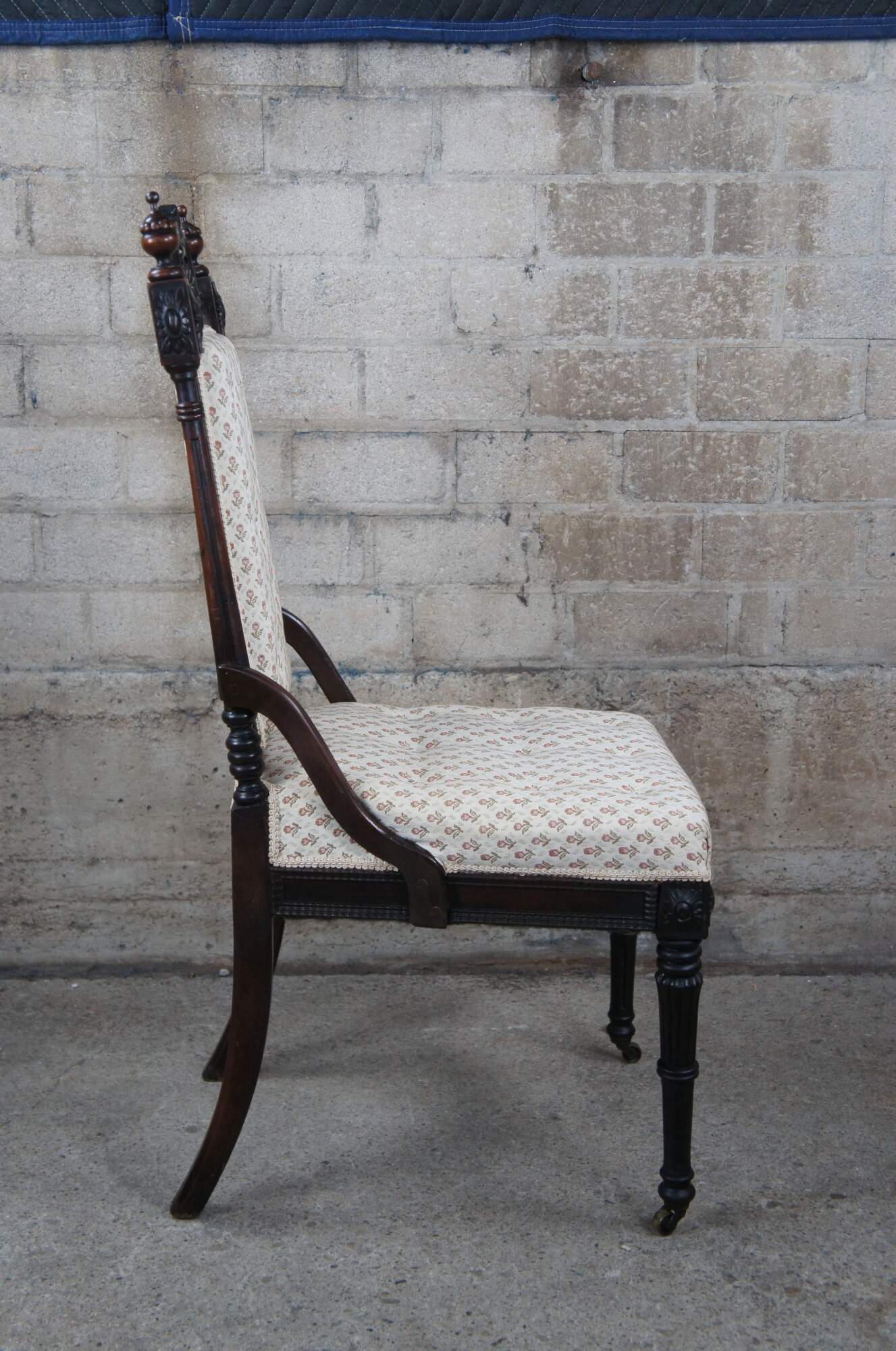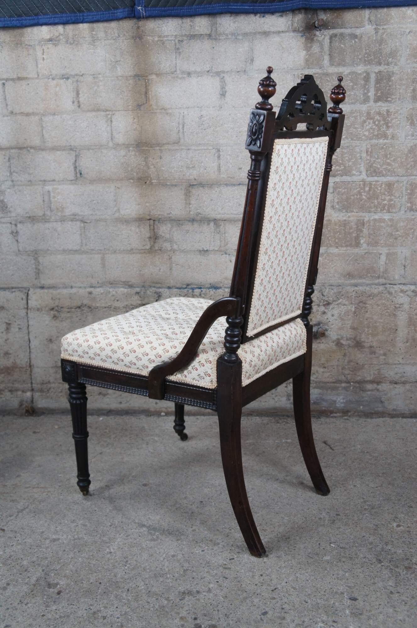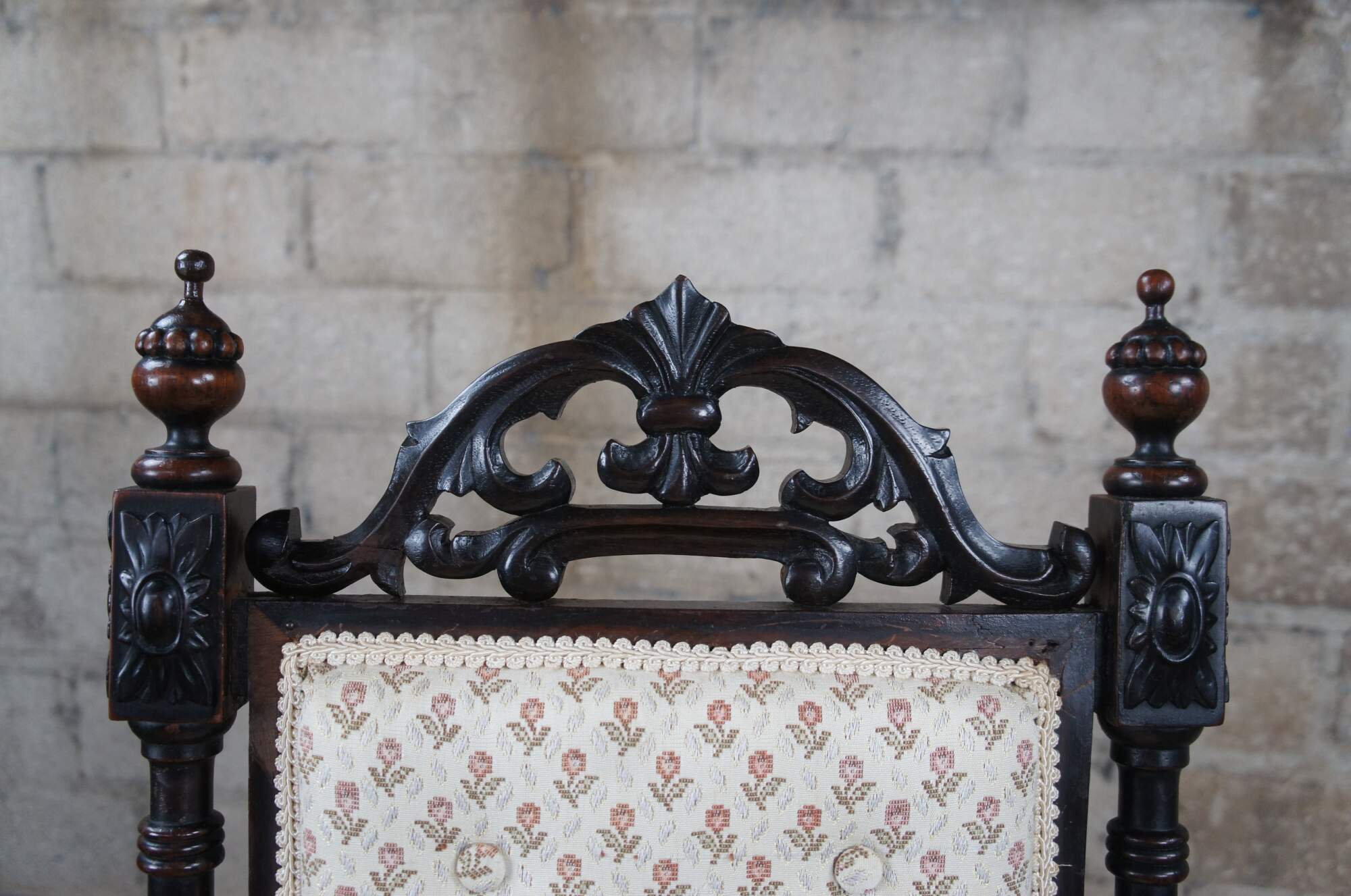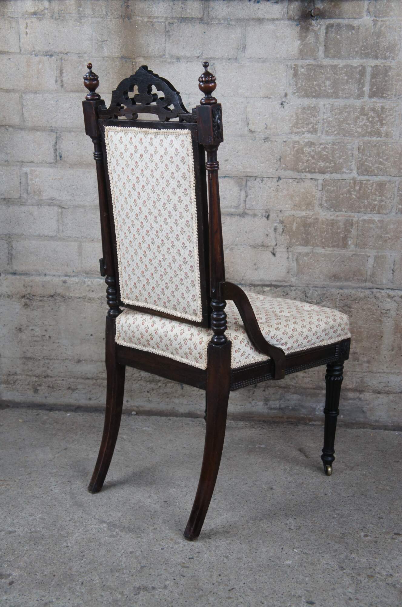 Victorian era Gothic side chair. Drawing inspiration from Charles II and French Renaissance Revival. Made from walnut with a pierced and carved Fleur crest set between carved block medallions and spire shaped finials. The chair features turned and fluted stiles leading to a floral tufted seat. Chair apron is beaded with a downward facing carved embellishment set between ribbed, reeded and fluted legs that taper to metal casters. The rear legs are in saber form.
