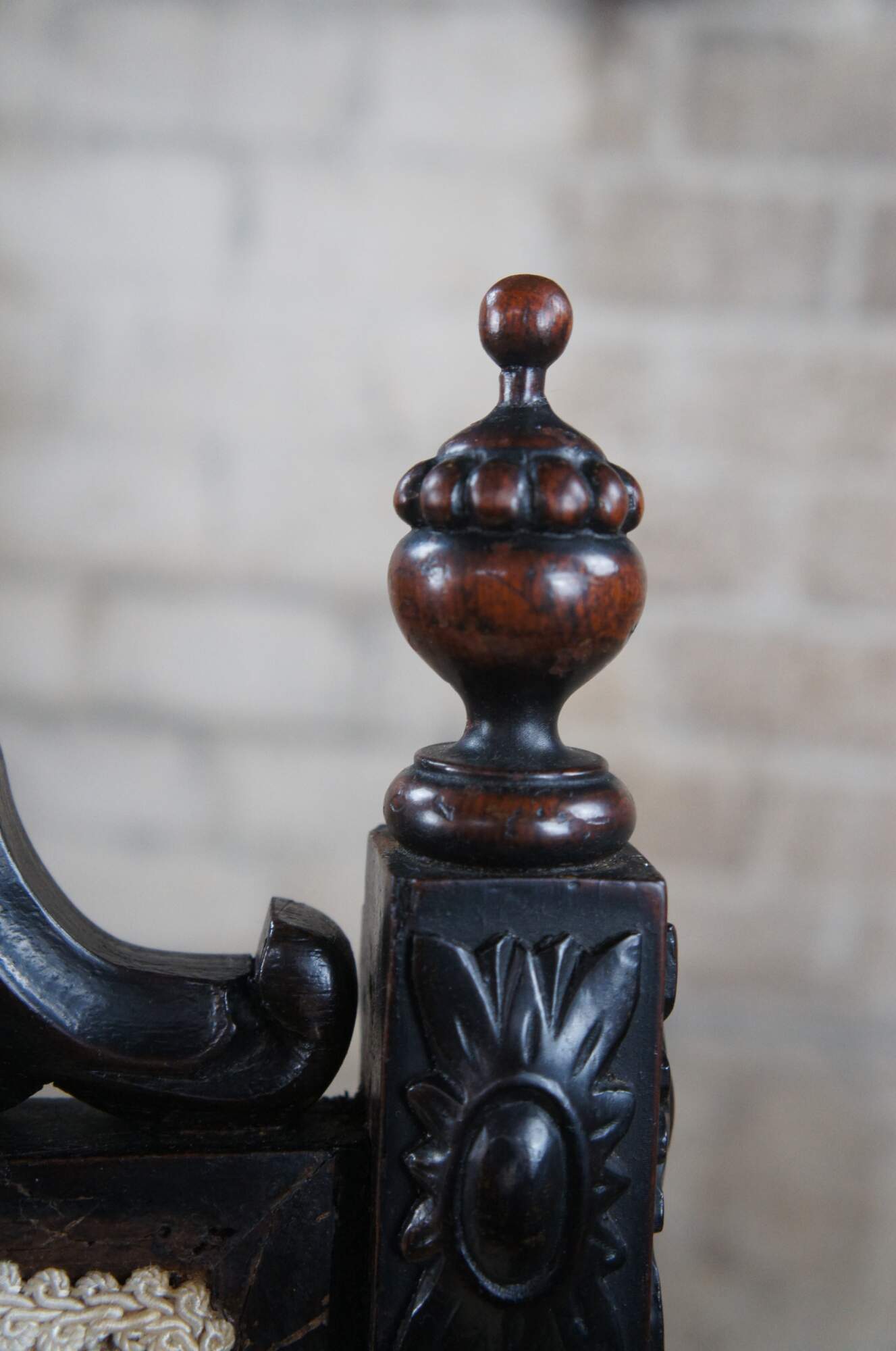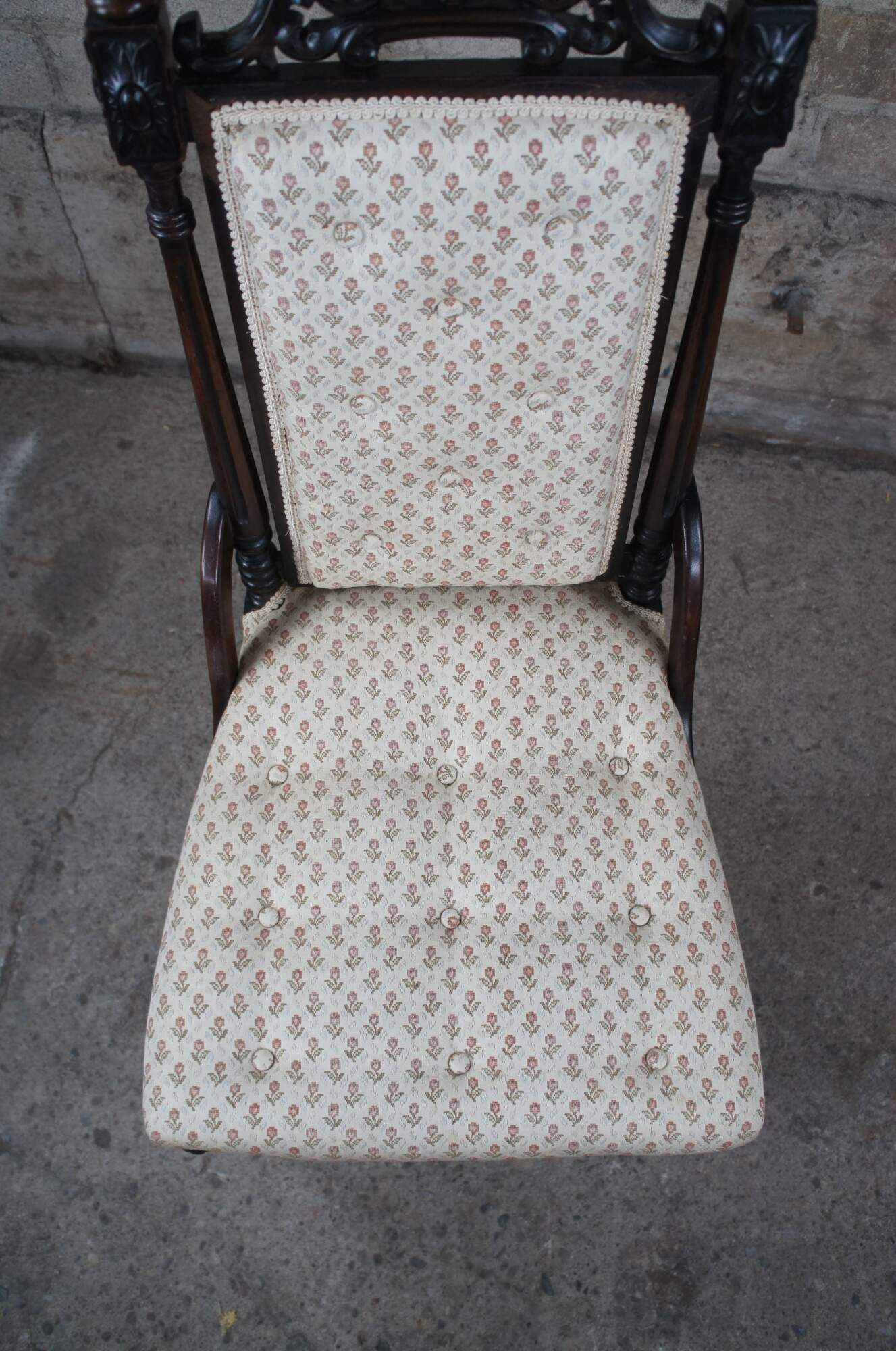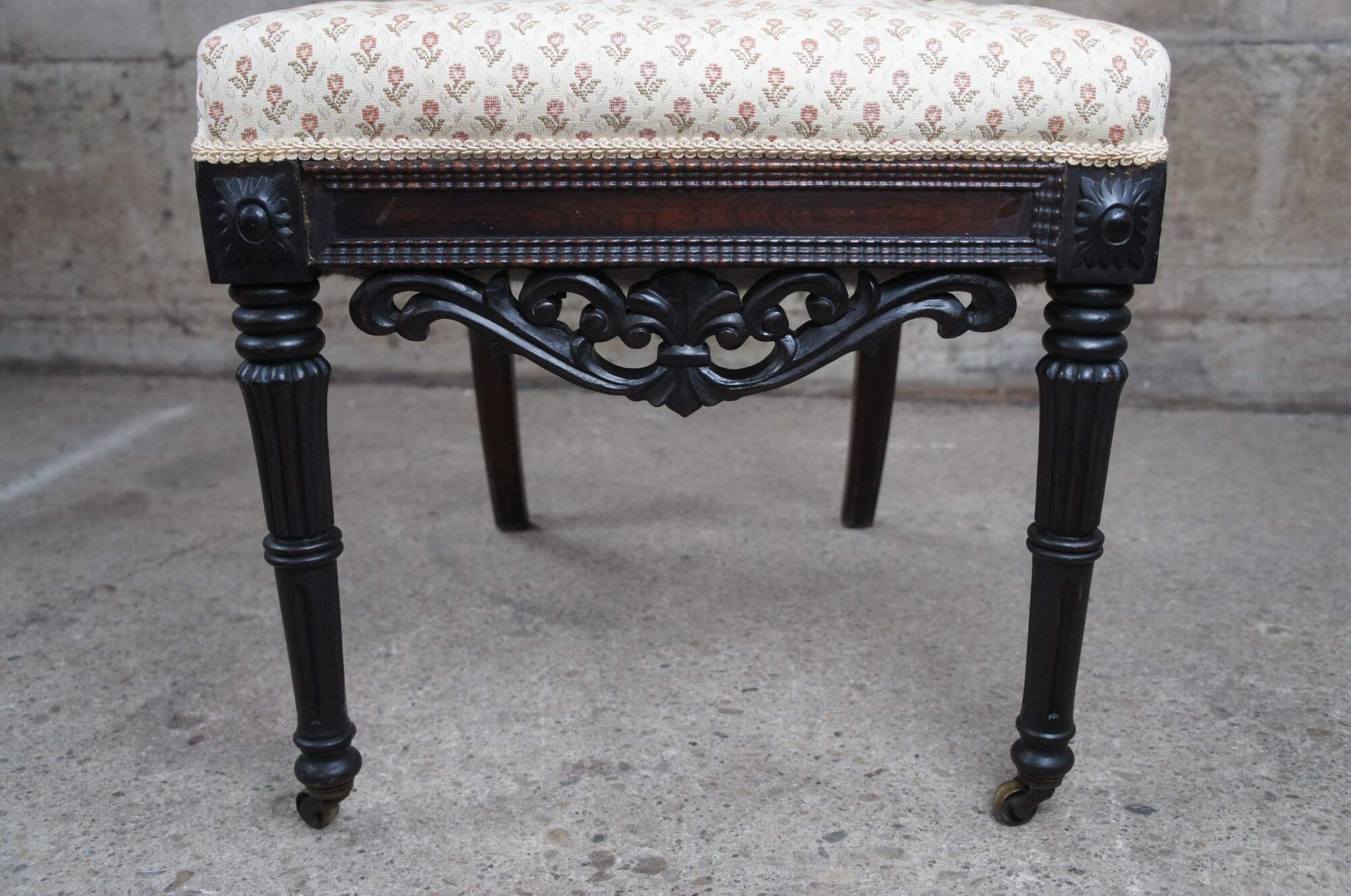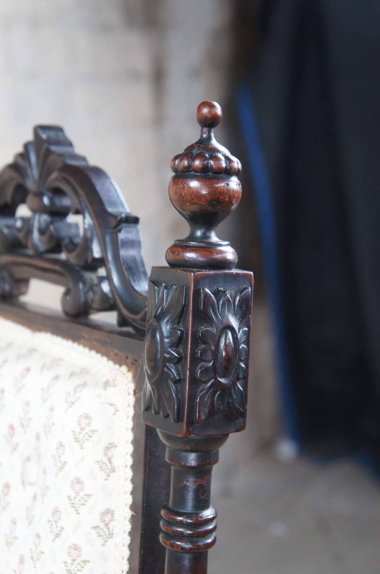 Victorian era Gothic side chair. Drawing inspiration from Charles II and French Renaissance Revival. Made from walnut with a pierced and carved Fleur crest set between carved block medallions and spire shaped finials. The chair features turned and fluted stiles leading to a floral tufted seat. Chair apron is beaded with a downward facing carved embellishment set between ribbed, reeded and fluted legs that taper to metal casters. The rear legs are in saber form.