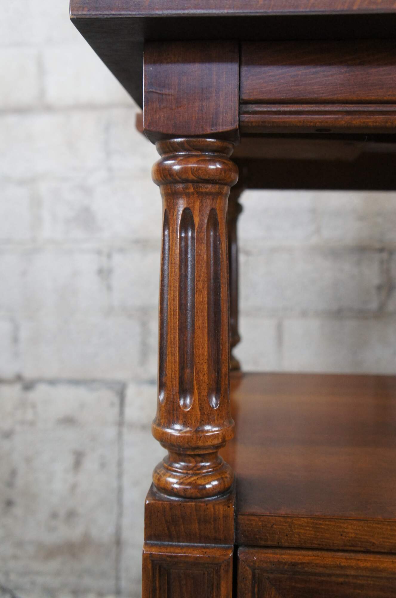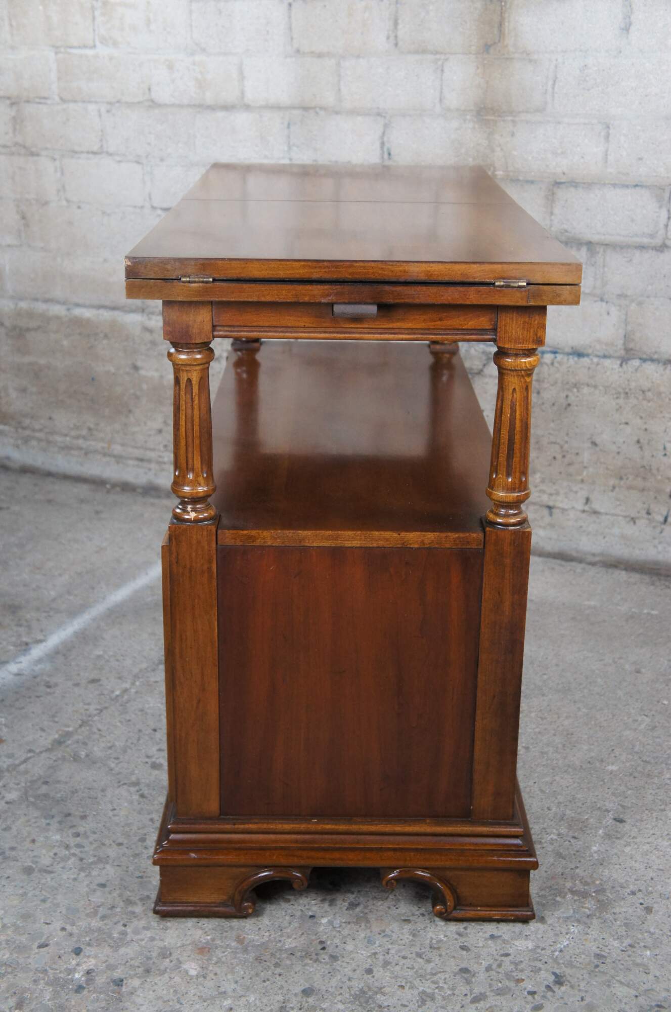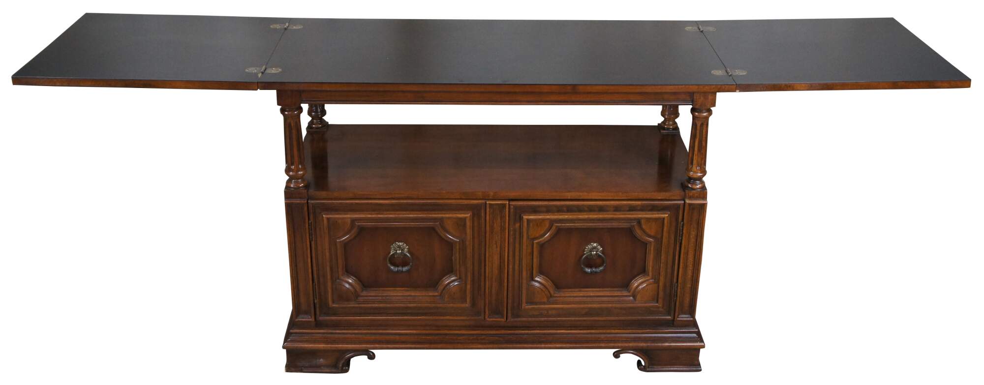 Thomasville traditional flip top server, circa 1980s. A rectangular form featuring an open center supported by turned and fluted columns. The lower cabinet is accented by inset molding and knocker pulls. When open, the top has a sleek black Formica top serving surface. Finished on all sides. 7422-510, Server-D-95