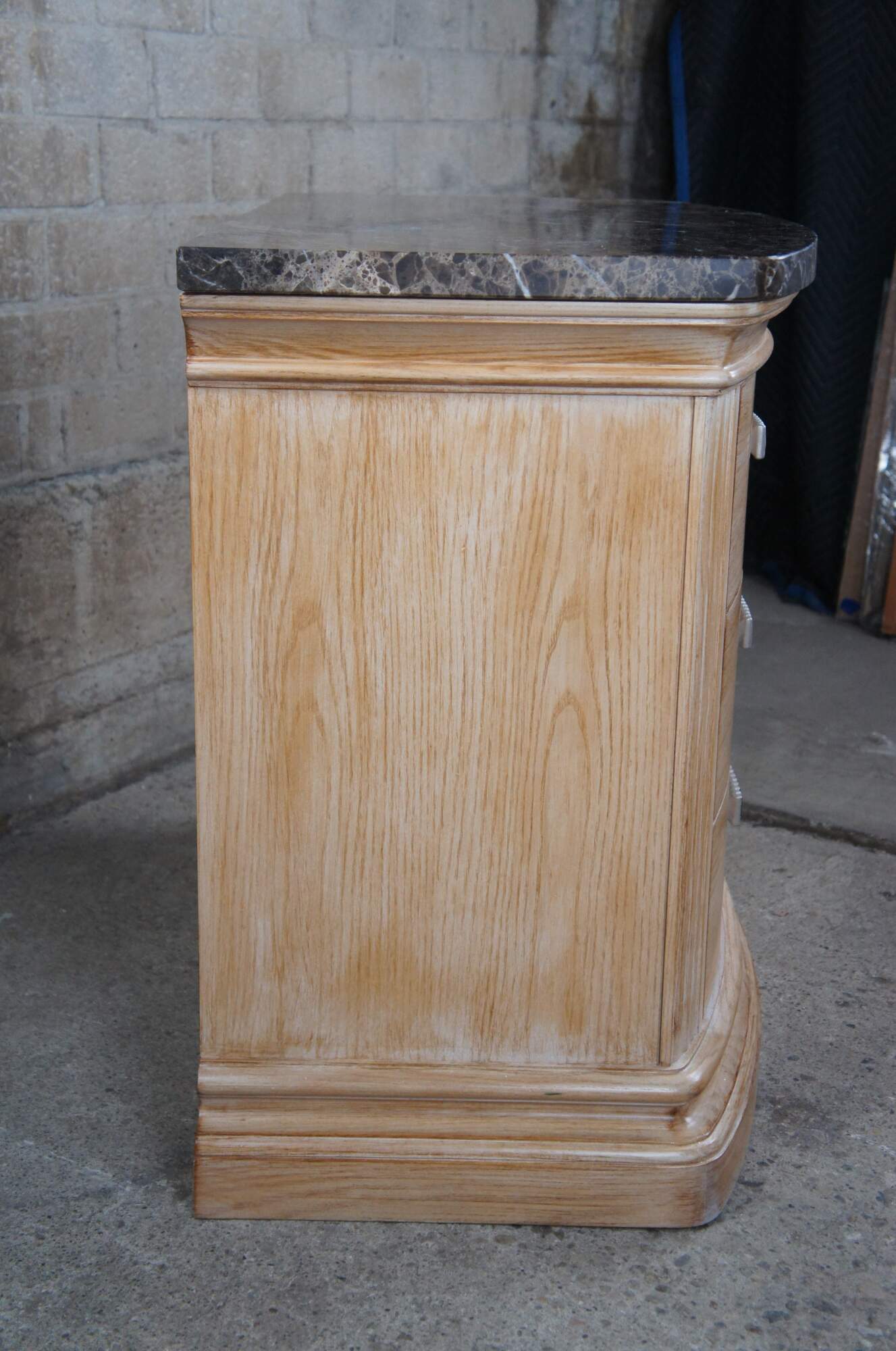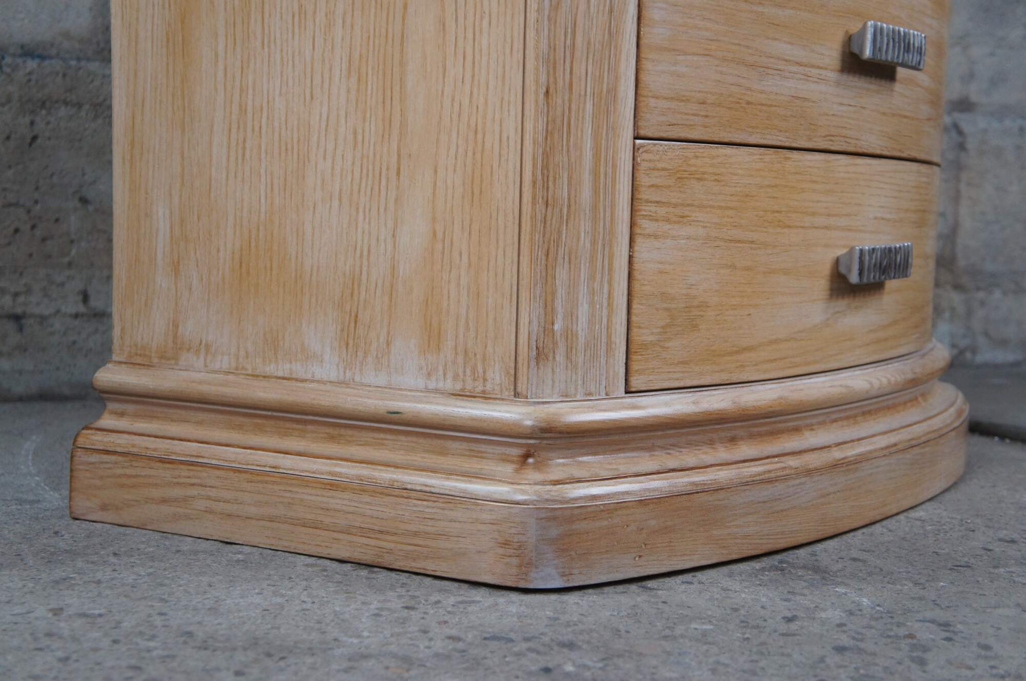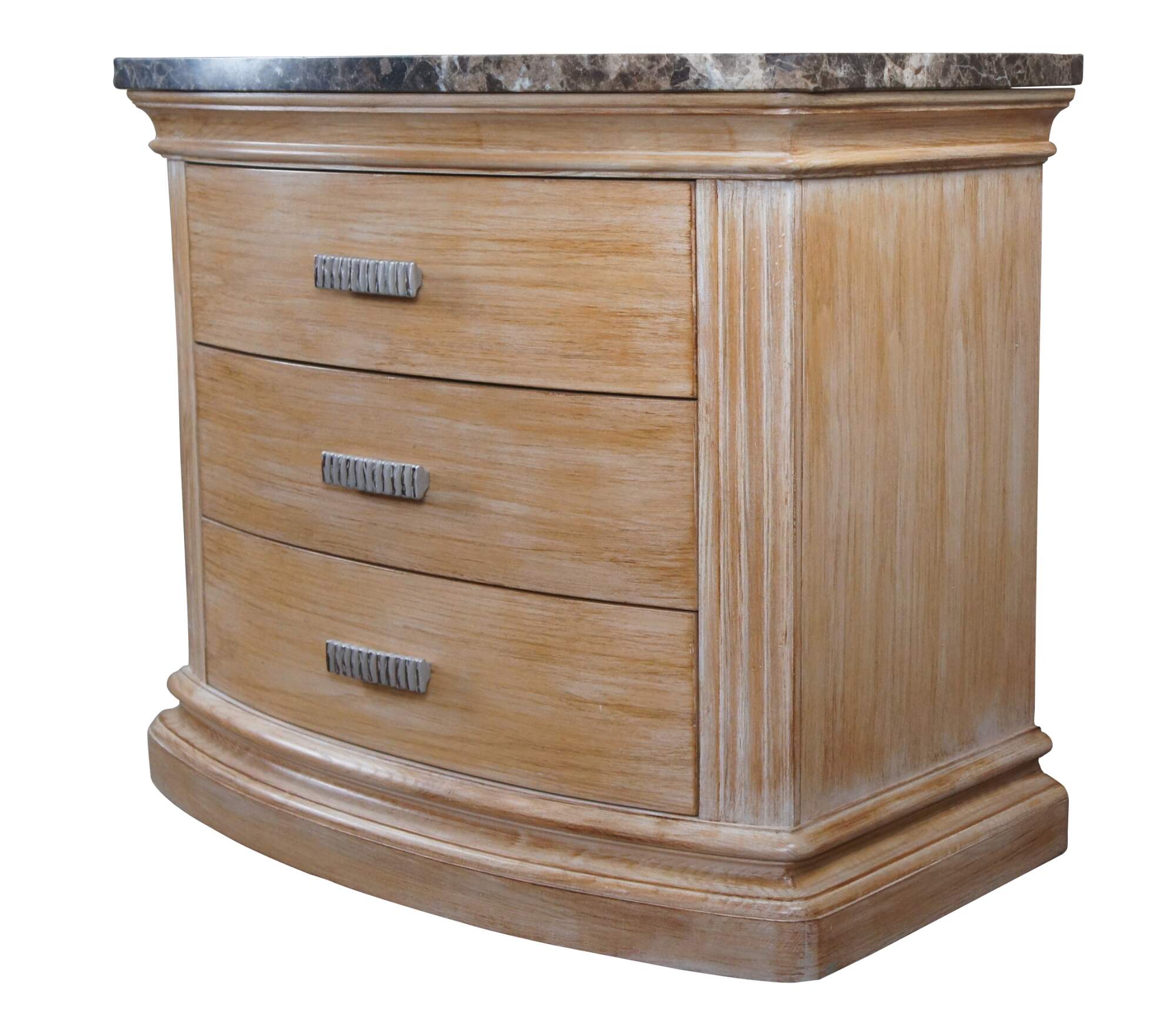 Hickory White Odyssey Collection Modern Bedside Table. A demilune form made from pickled oak with three dovetailed drawers and a granite top.